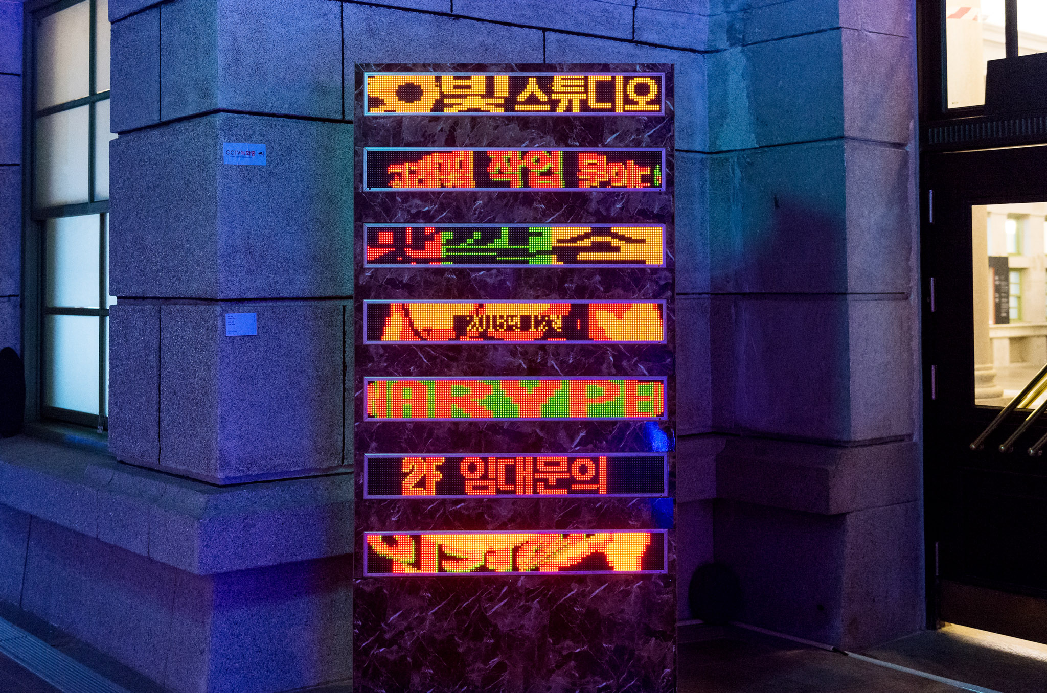 우리는 종로( )가에 가상의 빌딩을 세우기로 했습니다. 이 빌딩의 파사드는 층별 안내판의 형식을 따르며, 각 층은 LED 전광판으로 이뤄져 있습니다. 우리는 건물주가 되어 전시 기간 동안 실제로 각 층을 원하는 이에게 임대합니다. 임차인은 정해진 비용을 지불하고 계약 기간 동안 선택한 층을 사용할 권리를 가집니다. 이 건물의 주요 목적은 광고입니다. 임차인은 전시 기간 동안 찾아오는 다수의 관객들에게, 자신들이 원하는 특정 정보를 효과적으로 각인시키기 위해 이 빌딩의 한 층을 사용하게 됩니다. 우리는 임차인에게 필요한 정보를 받은 후 기존 LED 광고판이 가진 문법과 형식을 차용하여 광고문을 제작하고, 각 층에 설치된 LED를 통해 전시 기간 동안 반복 재생합니다.
