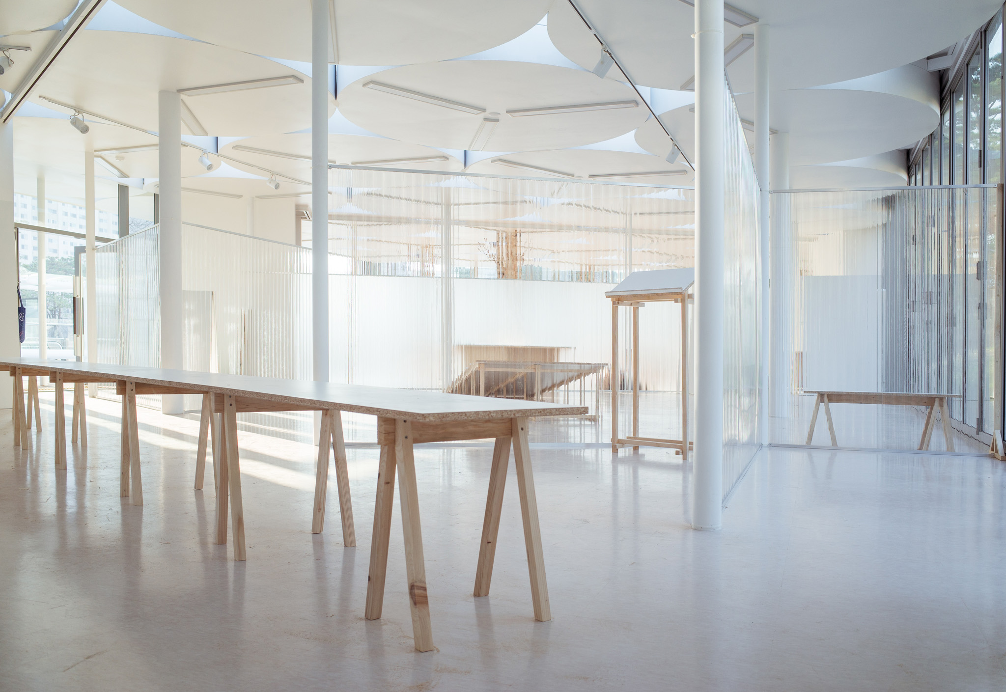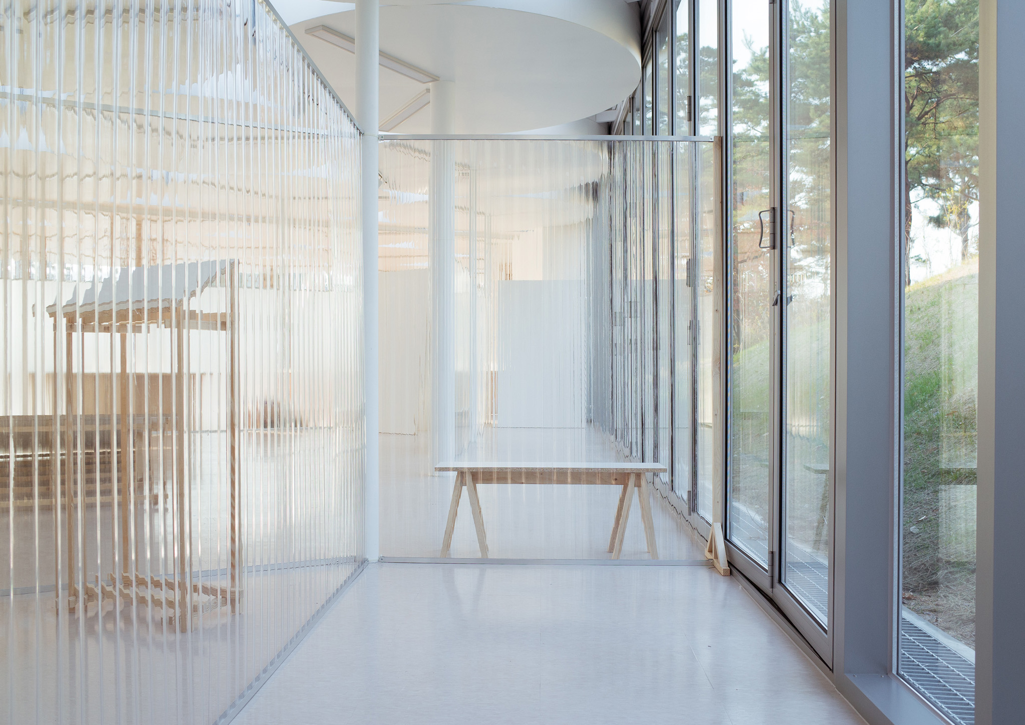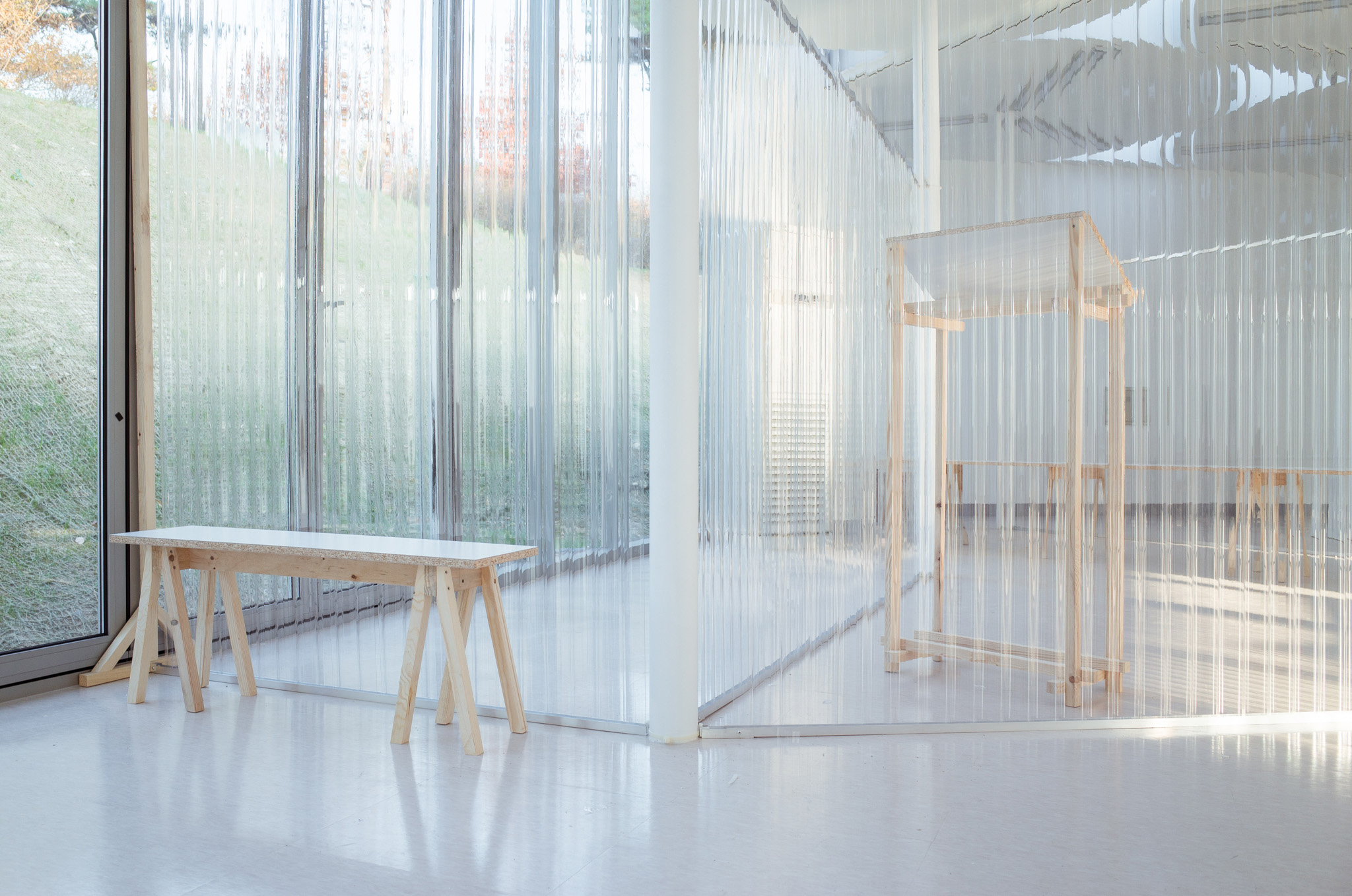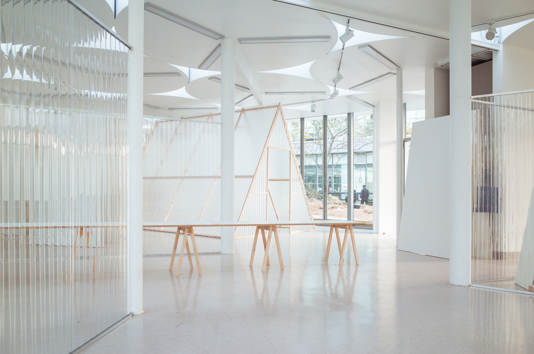 국립한글박물관 별관에서 진행된 전시. 기둥이 무척 많았고, 실내외 구분이 뚜렷하지 않은, 해가 잘 드는 공간이 전시실로 주어졌습니다. 기둥들을 피해 백색 가벽으로 작가들에게 개별 공간을 제공하는 것은 예산이나 공간 연출 면에서 비효율적이기에 ‘렉산’이라는 반투명 골판 플라스틱 활용하기로 했습니다. 렉산을 기둥과 기둥 사이 케이블 타이로 엮어 공간을 나눴더니 일광이 쏟아져 들어오는 전시실과 조화를 이루고, 뒤편으로 사람들이 지나갈 때 일렁이는 인상을 얻을 수 있었습니다.