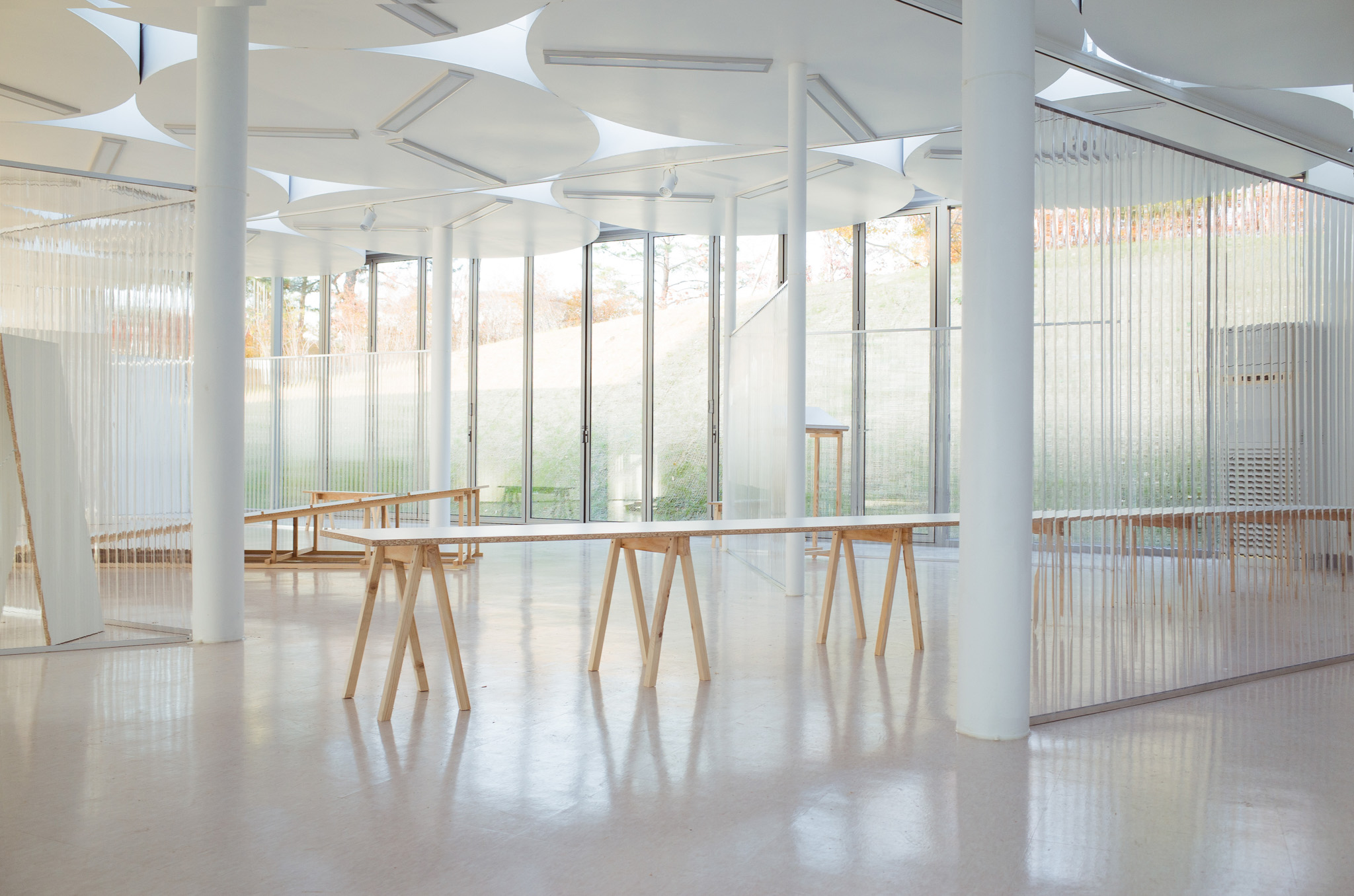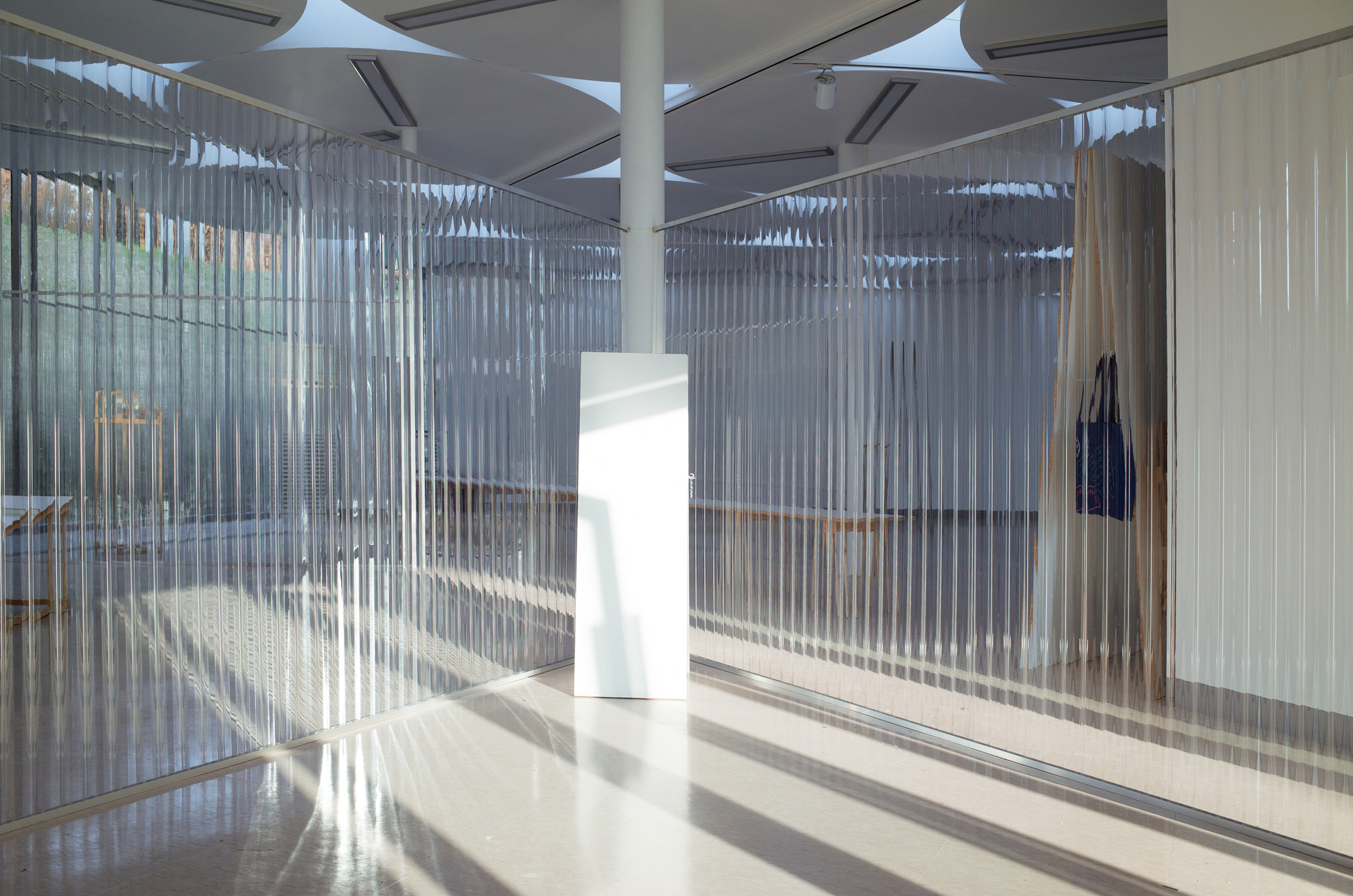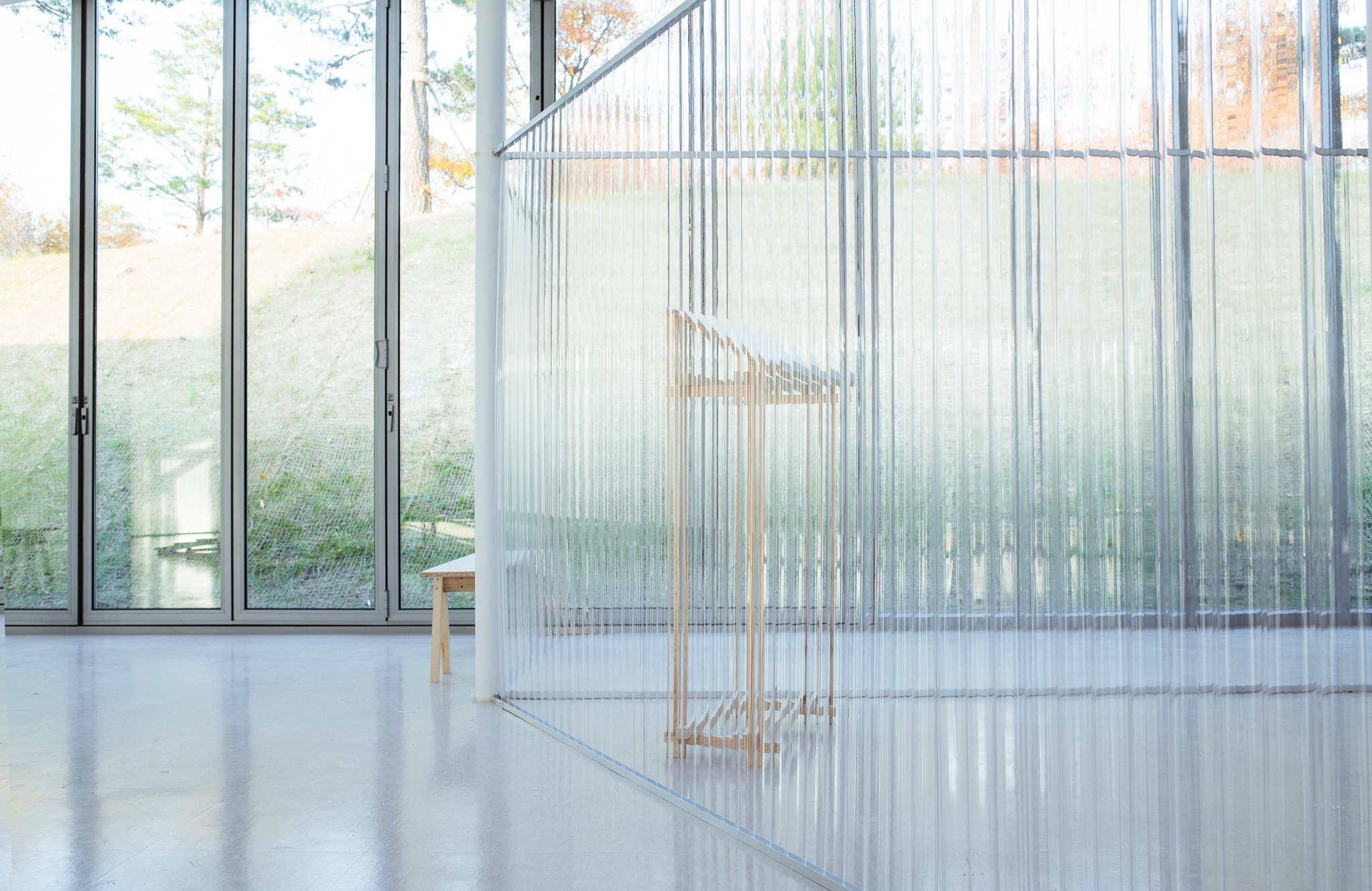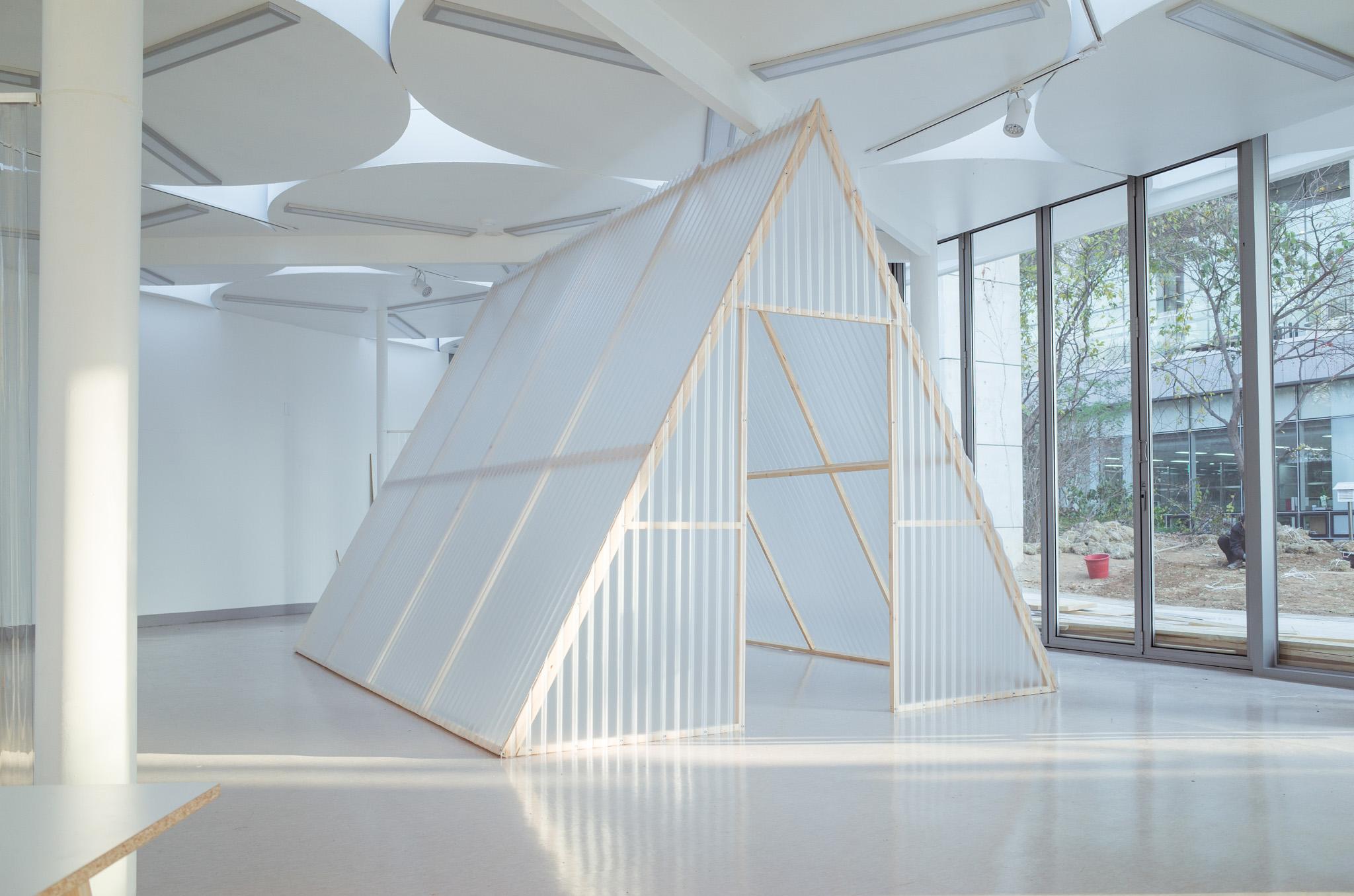 국립한글박물관 별관에서 진행된 전시. 기둥이 무척 많았고, 실내외 구분이 뚜렷하지 않은, 해가 잘 드는 공간이 전시실로 주어졌습니다. 기둥들을 피해 백색 가벽으로 작가들에게 개별 공간을 제공하는 것은 예산이나 공간 연출 면에서 비효율적이기에 ‘렉산’이라는 반투명 골판 플라스틱 활용하기로 했습니다. 렉산을 기둥과 기둥 사이 케이블 타이로 엮어 공간을 나눴더니 일광이 쏟아져 들어오는 전시실과 조화를 이루고, 뒤편으로 사람들이 지나갈 때 일렁이는 인상을 얻을 수 있었습니다.
