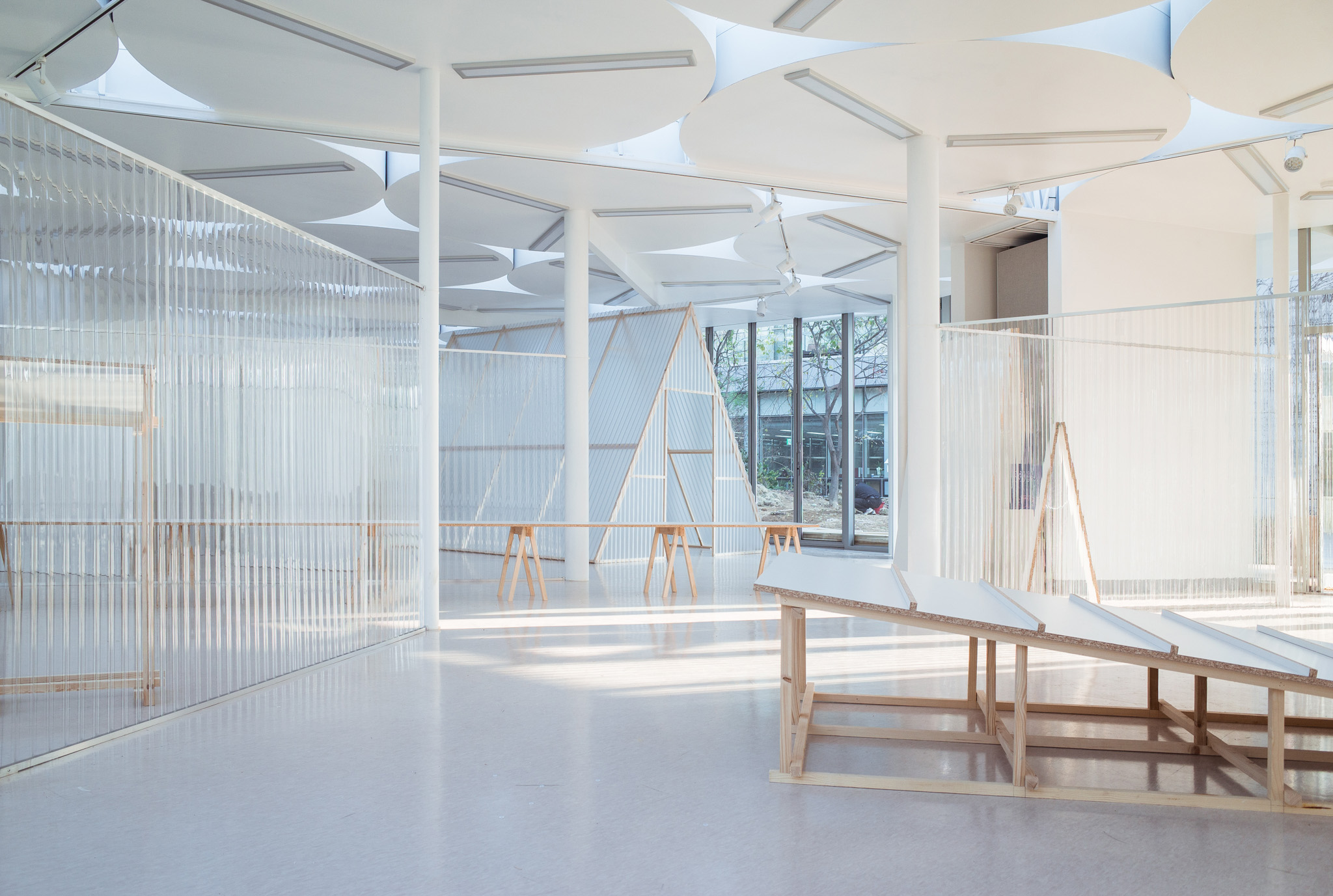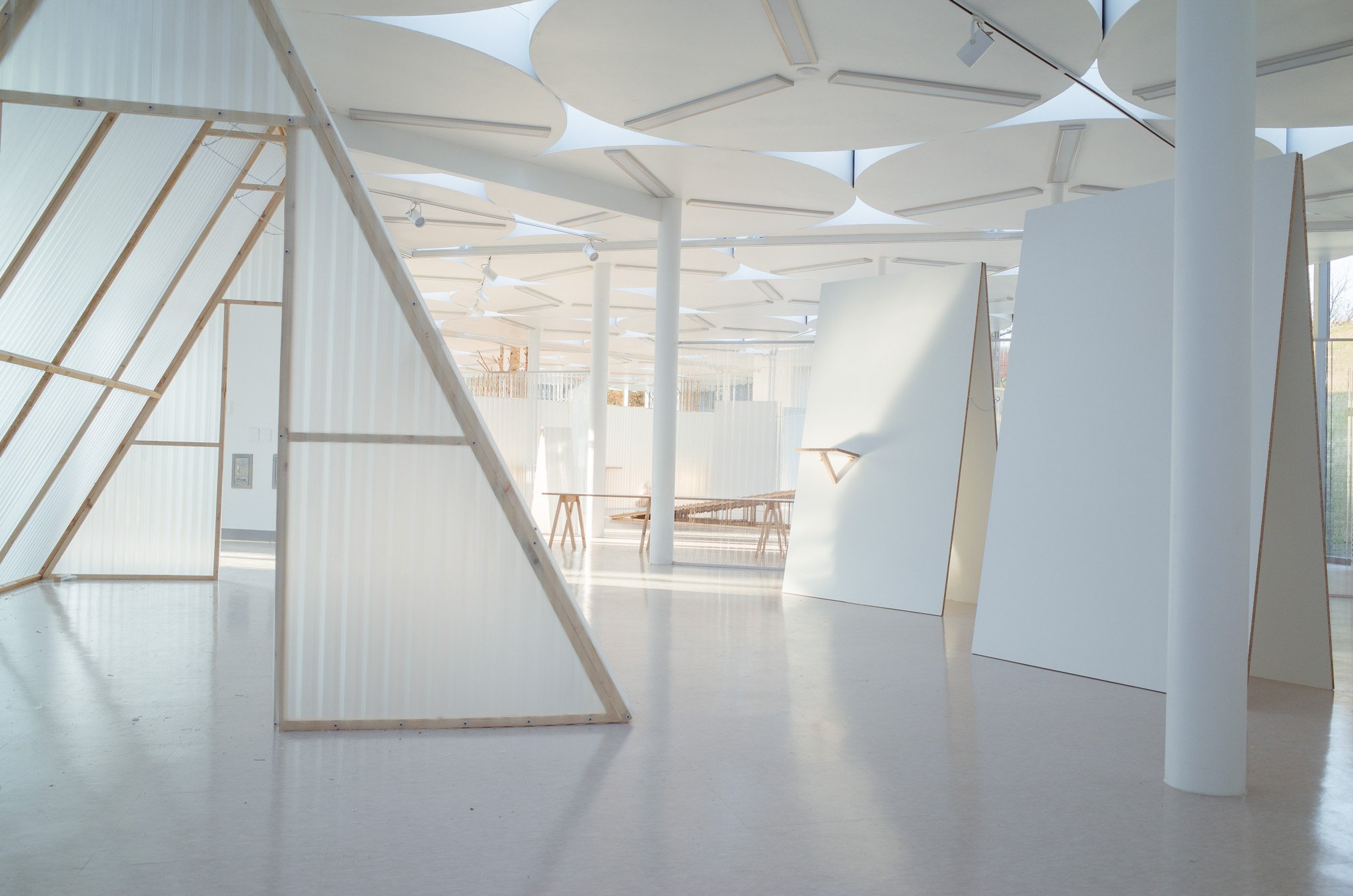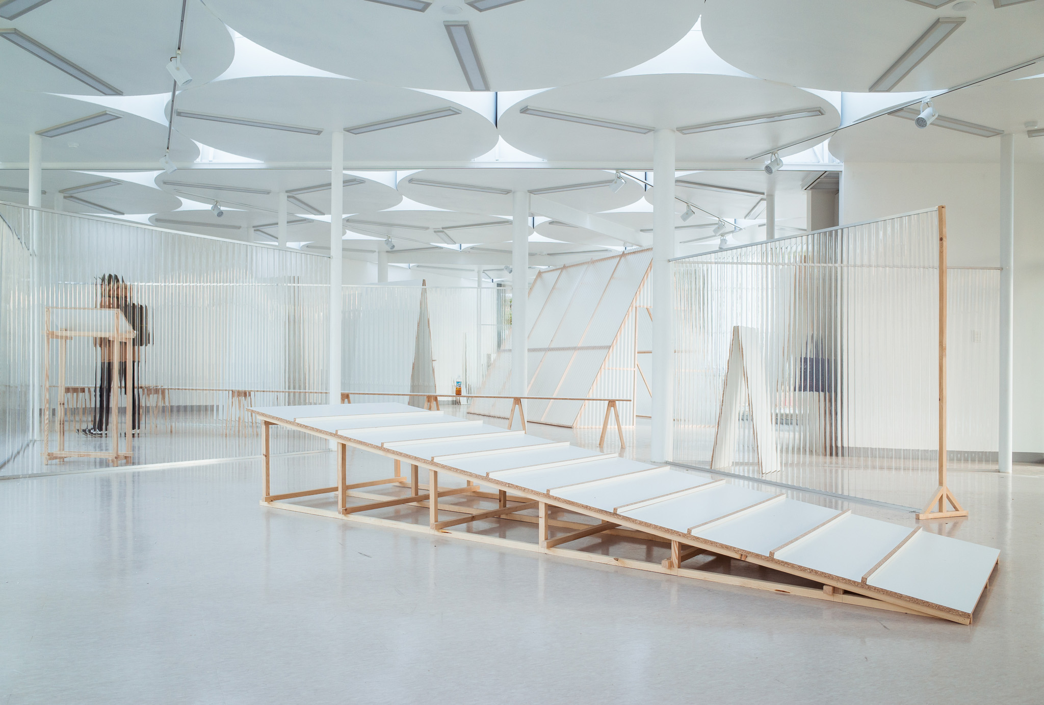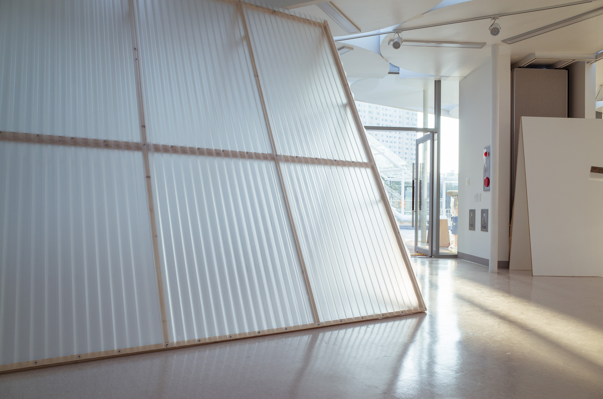 국립한글박물관 별관에서 진행된 전시. 기둥이 무척 많았고, 실내외 구분이 뚜렷하지 않은, 해가 잘 드는 공간이 전시실로 주어졌습니다. 기둥들을 피해 백색 가벽으로 작가들에게 개별 공간을 제공하는 것은 예산이나 공간 연출 면에서 비효율적이기에 ‘렉산’이라는 반투명 골판 플라스틱 활용하기로 했습니다. 렉산을 기둥과 기둥 사이 케이블 타이로 엮어 공간을 나눴더니 일광이 쏟아져 들어오는 전시실과 조화를 이루고, 뒤편으로 사람들이 지나갈 때 일렁이는 인상을 얻을 수 있었습니다.