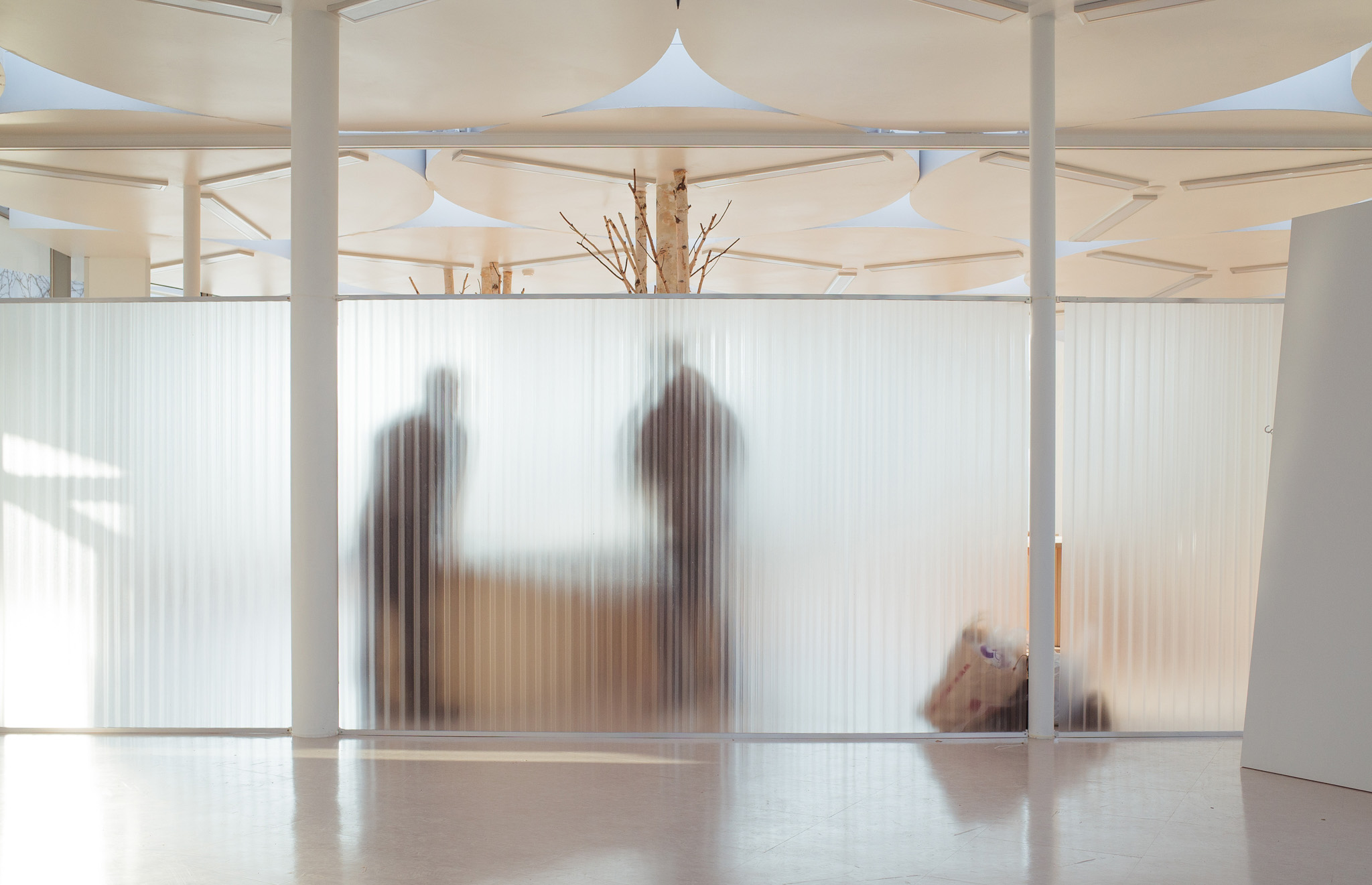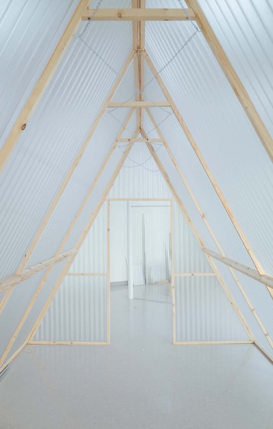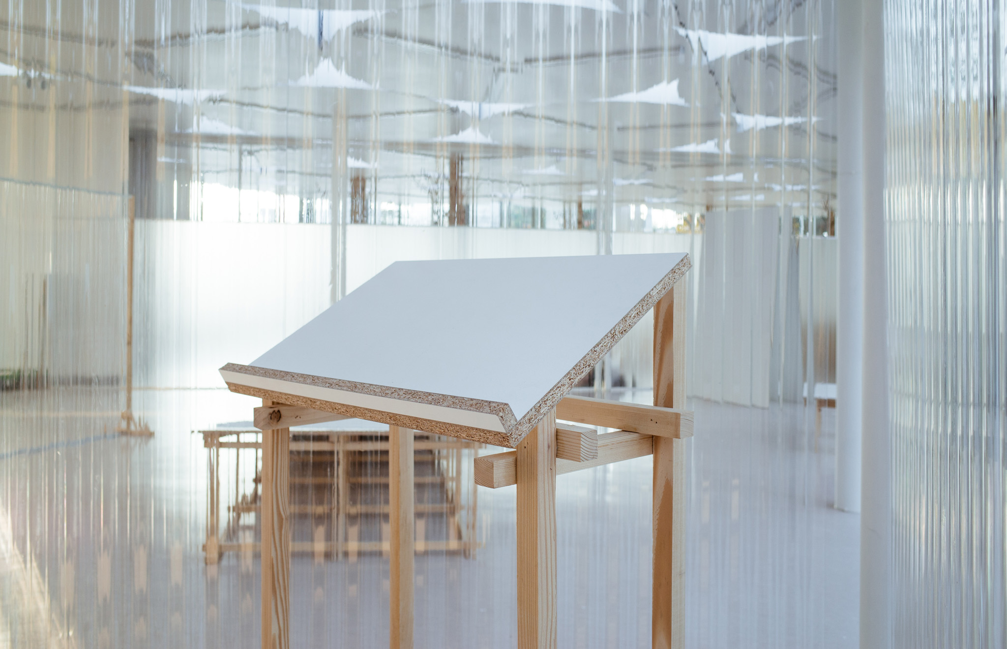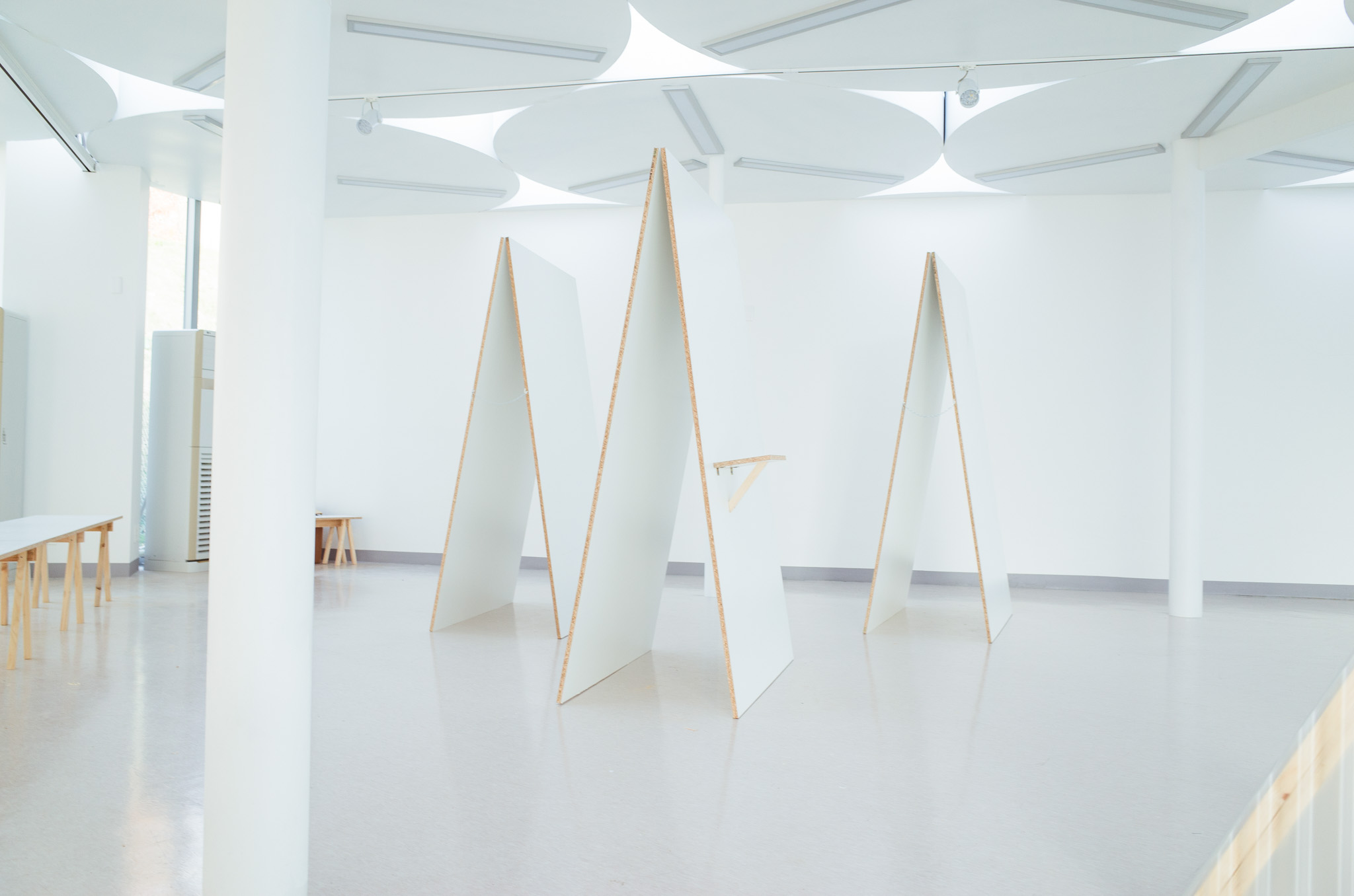 국립한글박물관 별관에서 진행된 전시. 기둥이 무척 많았고, 실내외 구분이 뚜렷하지 않은, 해가 잘 드는 공간이 전시실로 주어졌습니다. 기둥들을 피해 백색 가벽으로 작가들에게 개별 공간을 제공하는 것은 예산이나 공간 연출 면에서 비효율적이기에 ‘렉산’이라는 반투명 골판 플라스틱 활용하기로 했습니다. 렉산을 기둥과 기둥 사이 케이블 타이로 엮어 공간을 나눴더니 일광이 쏟아져 들어오는 전시실과 조화를 이루고, 뒤편으로 사람들이 지나갈 때 일렁이는 인상을 얻을 수 있었습니다.