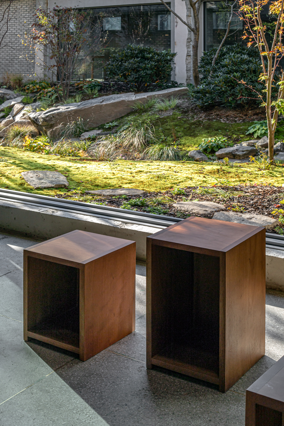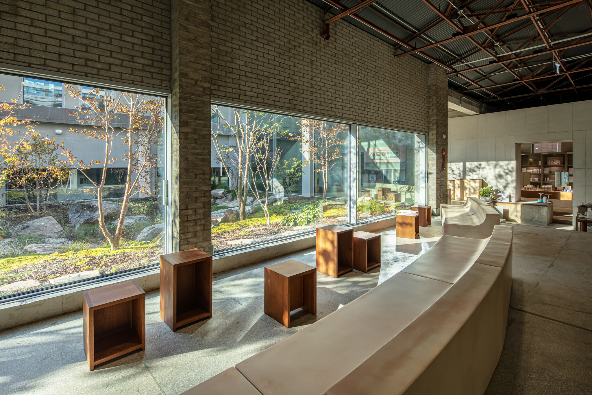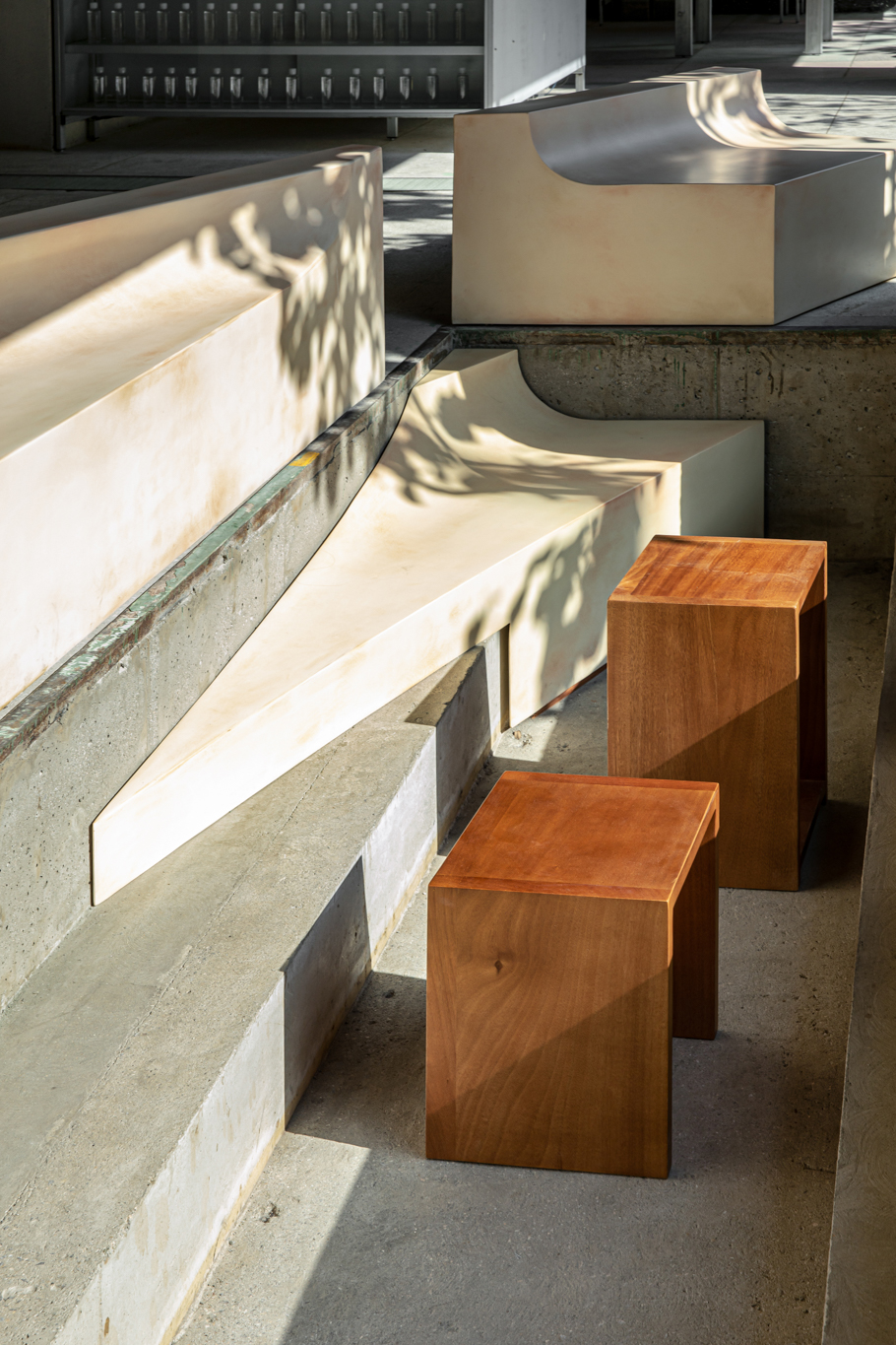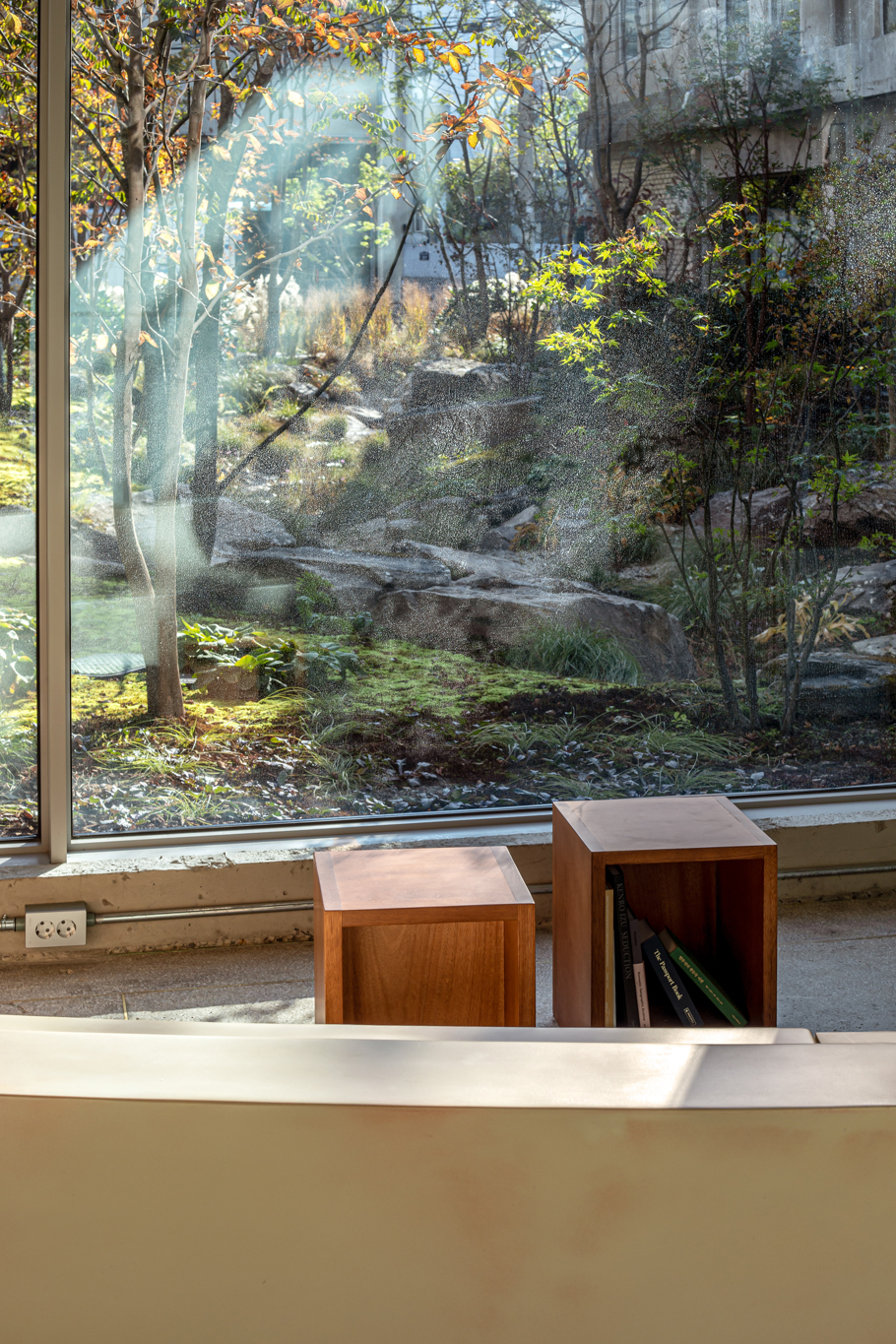 건축사사무소 ‘HAPSA(권경민,박천강)’에서 설계한 아모레 성수는 오랜 시간을 담을 수 있는 정원(더가든 김봉찬 설계)과 이를 둘러싼 건축물이 특징입니다. 가구를 디자인할 때도 하나로 이어져 있던 커다란 벤치가 시간이 흘러 분절되어 여기저기 흩어져 있는 모습을 연출했습니다.