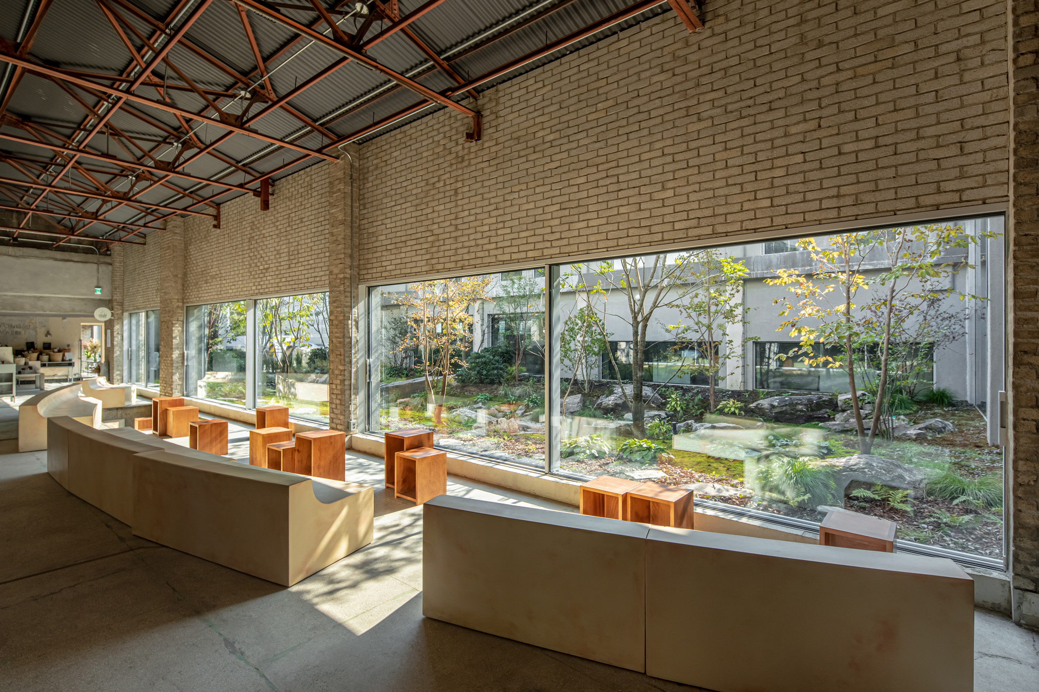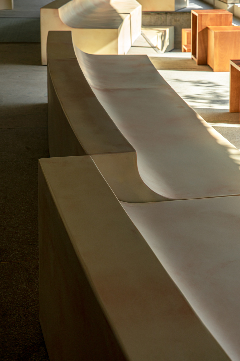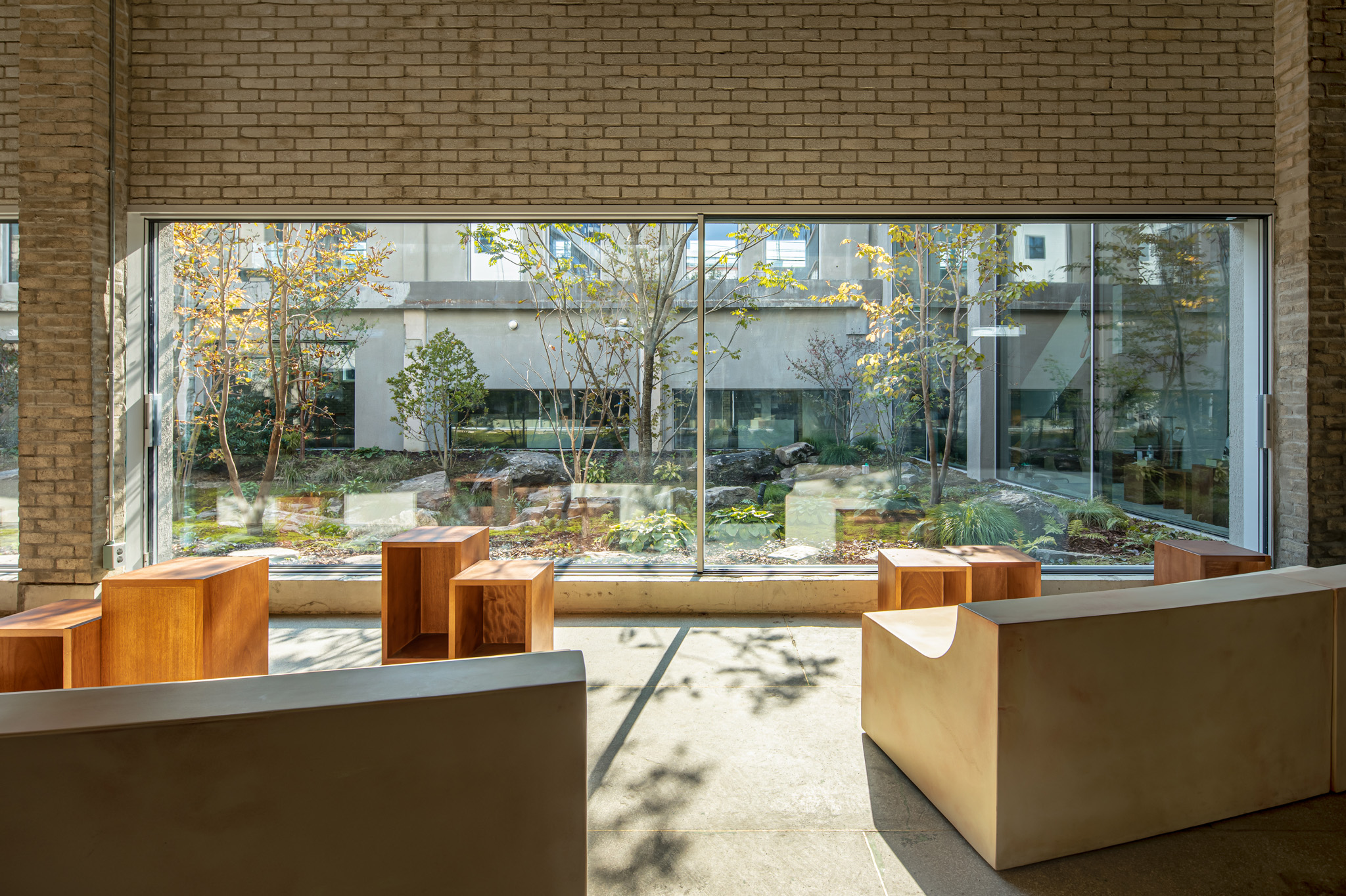 건축사사무소 ‘HAPSA(권경민,박천강)’에서 설계한 아모레 성수는 오랜 시간을 담을 수 있는 정원(더가든 김봉찬 설계)과 이를 둘러싼 건축물이 특징입니다. 가구를 디자인할 때도 하나로 이어져 있던 커다란 벤치가 시간이 흘러 분절되어 여기저기 흩어져 있는 모습을 연출했습니다.