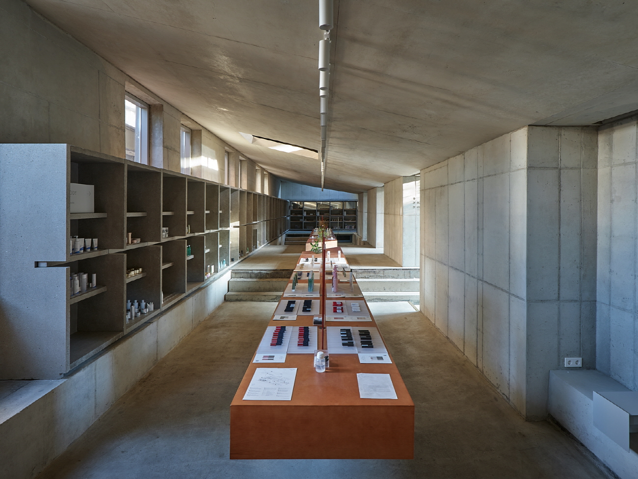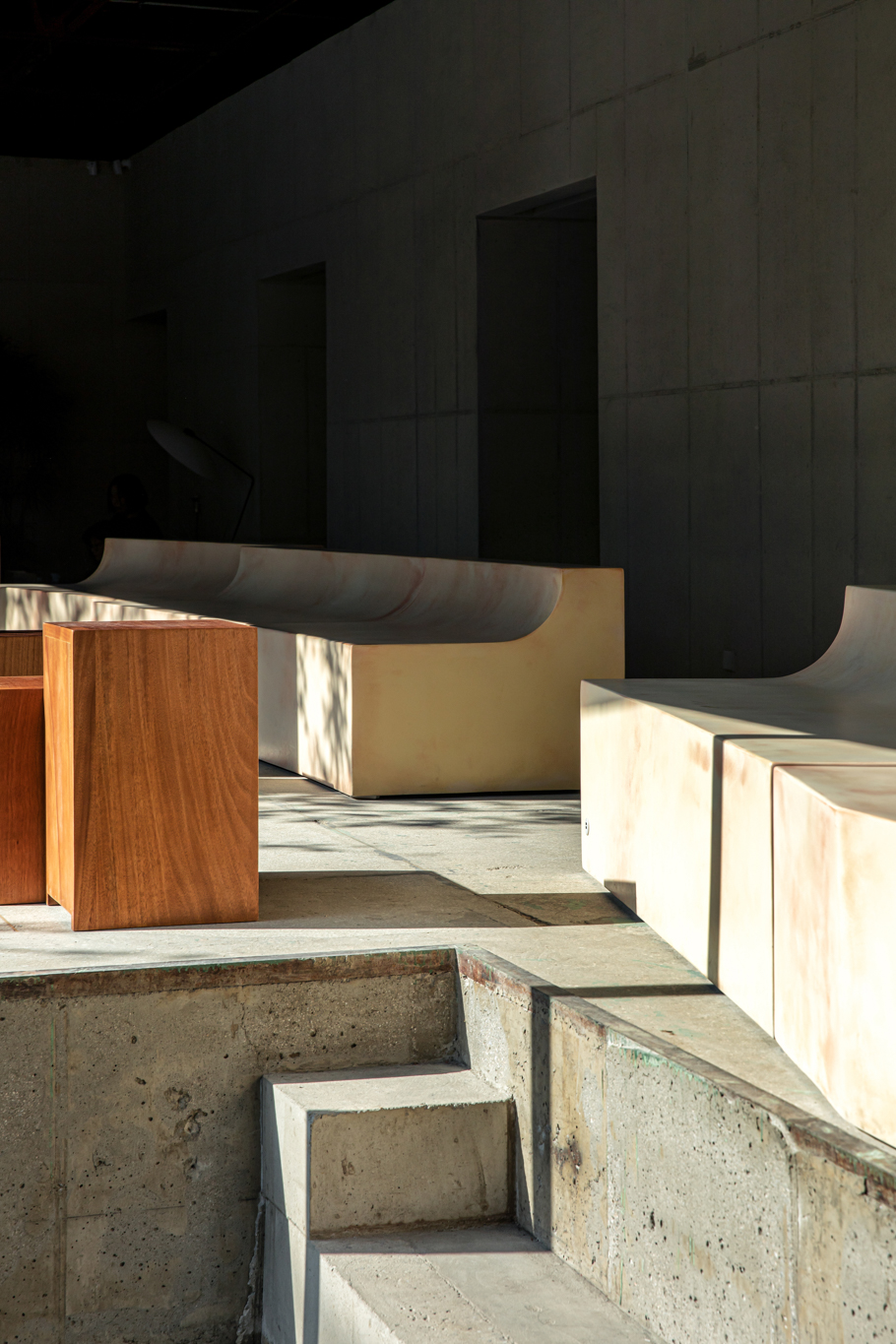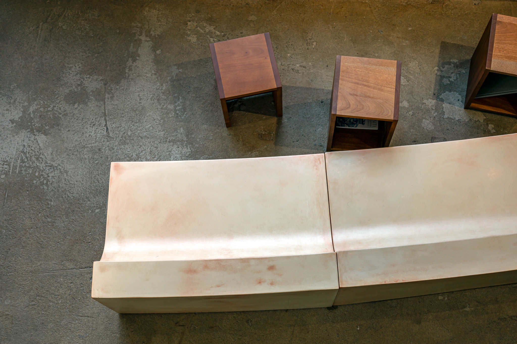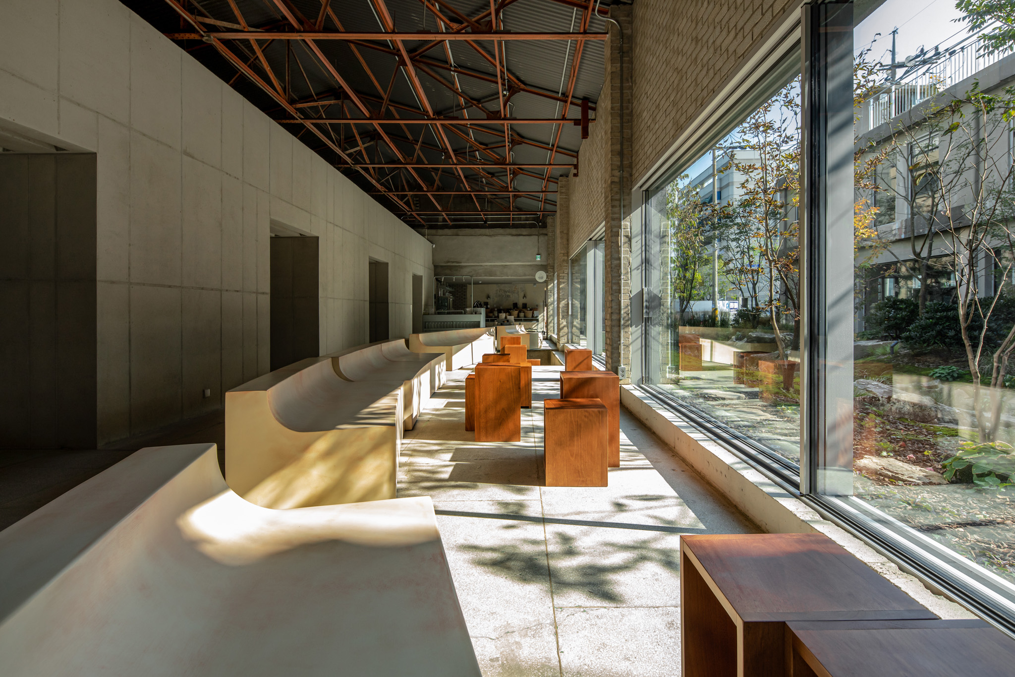 건축사사무소 ‘HAPSA(권경민,박천강)’에서 설계한 아모레 성수는 오랜 시간을 담을 수 있는 정원(더가든 김봉찬 설계)과 이를 둘러싼 건축물이 특징입니다. 가구를 디자인할 때도 하나로 이어져 있던 커다란 벤치가 시간이 흘러 분절되어 여기저기 흩어져 있는 모습을 연출했습니다.