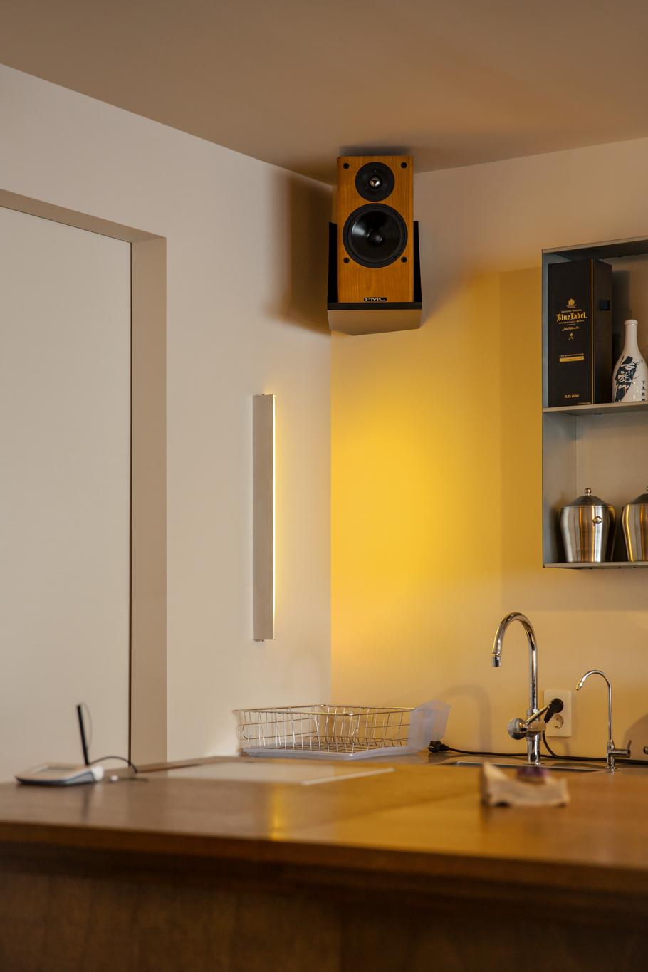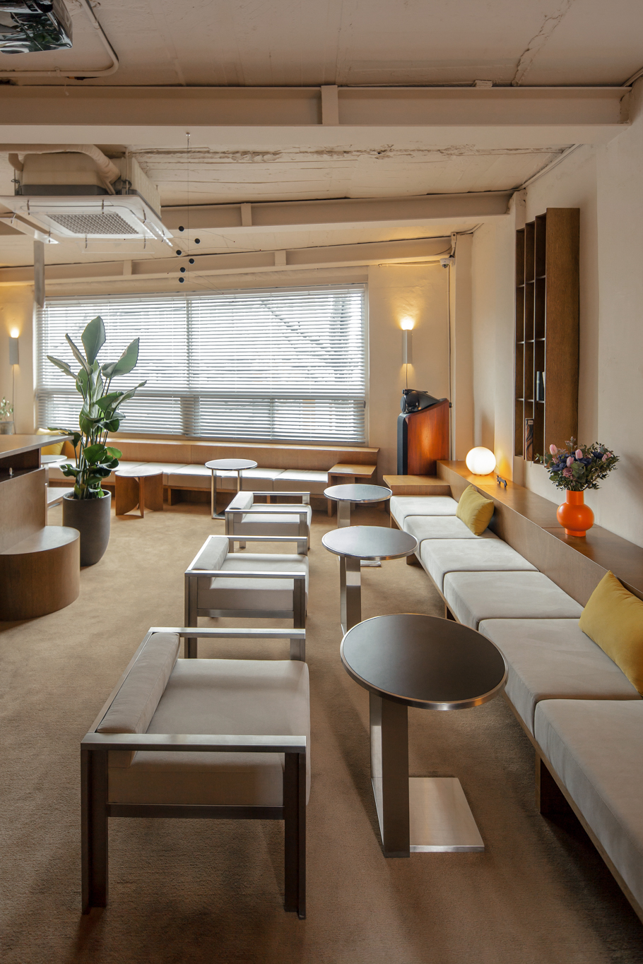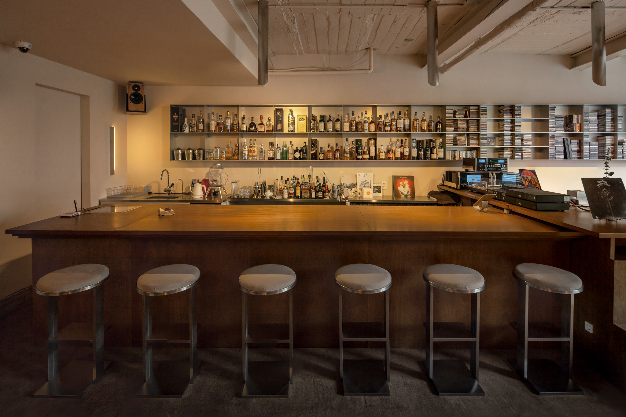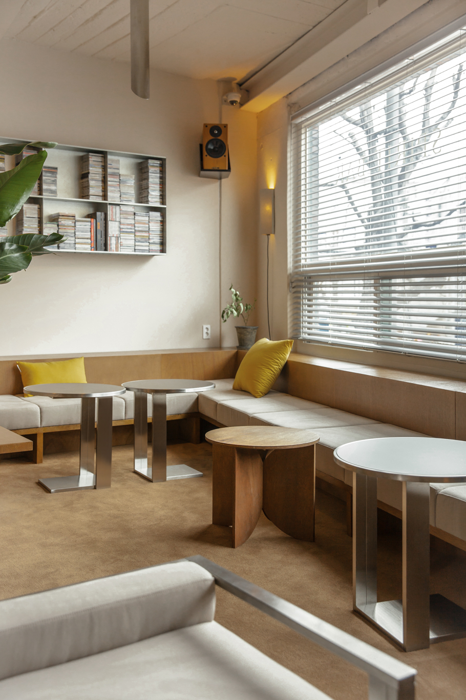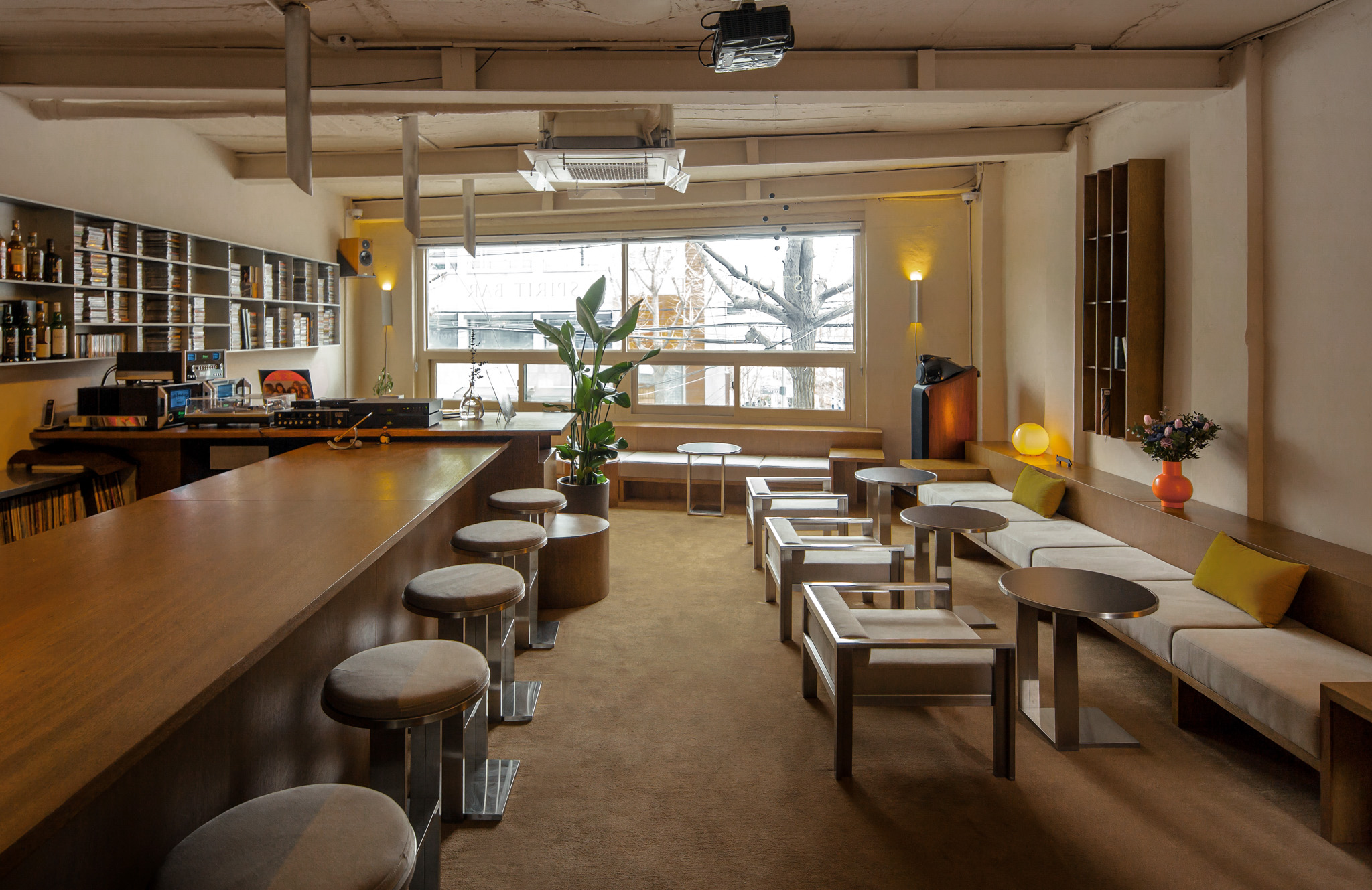 홍대에 위치한 위스키 바로 오랫동안 인디 음악 레이블을 운영했던 클라이언트가 의뢰한 공간입니다. ‘스톤에이지’라는 이름에서 영향을 받은 것인지, 아니면 2층이지만 고저차가 높은 입구에서 전체 공간을 내려다보며 진입해야만 하는 공간의 특성 때문이었는지, 처음 방문했을 때 무겁고 수평적인 가구들이 바닥에 차분히 펼쳐진 풍경이 상상됐습니다. 음악이 중요한 비중을 차지하는 공간인 만큼 단순히 긴 바로 이뤄진 공간보다는, 누군가의 겨울 별장이나 응접실에 앉아 음악을 감상하는 기분이 드는 공간을 만들고 싶었습니다. 소재에서도 라왕 합판의 소박하고 자연스러운 느낌은 가져오면서 면재 특유의 가벼운 느낌을 지우기 위해 손이 많이 가더라도 합판의 모든 단면을 45도 커팅하여 접합해 가구를 제작했고, 대조적으로 음료 선반은 거친 금속으로 투박하게 제작해 벽에 걸어뒀습니다. 술을 판매하는 공간임에도 바닥은 두터운 카펫으로 마감했습니다. 발걸음에서 느껴지는 소음을 줄이고 청각에 집중할 수 있도록.