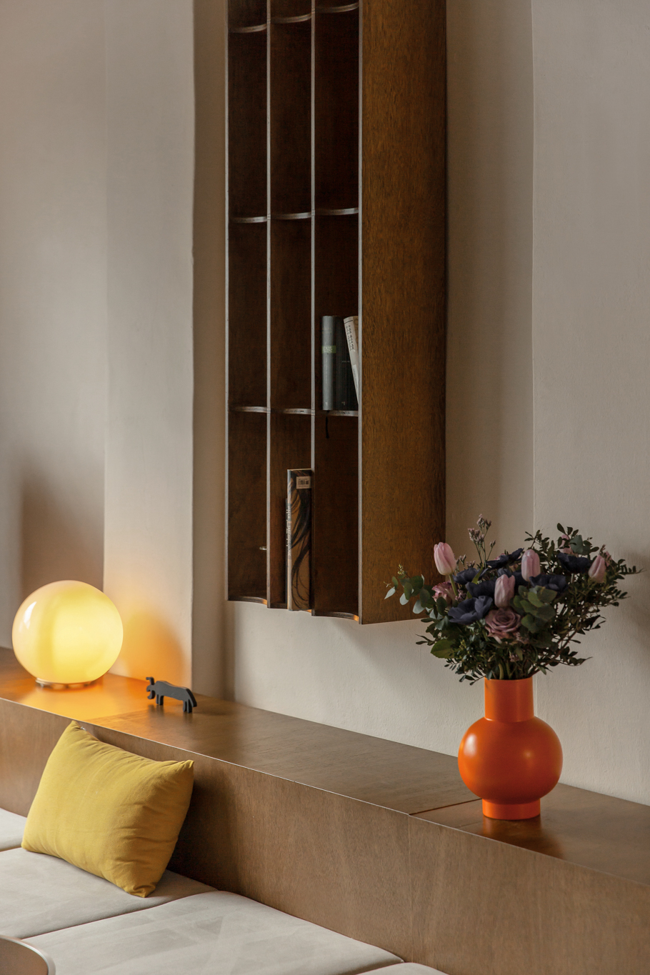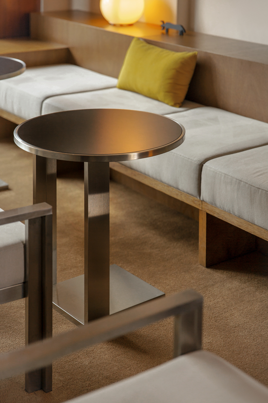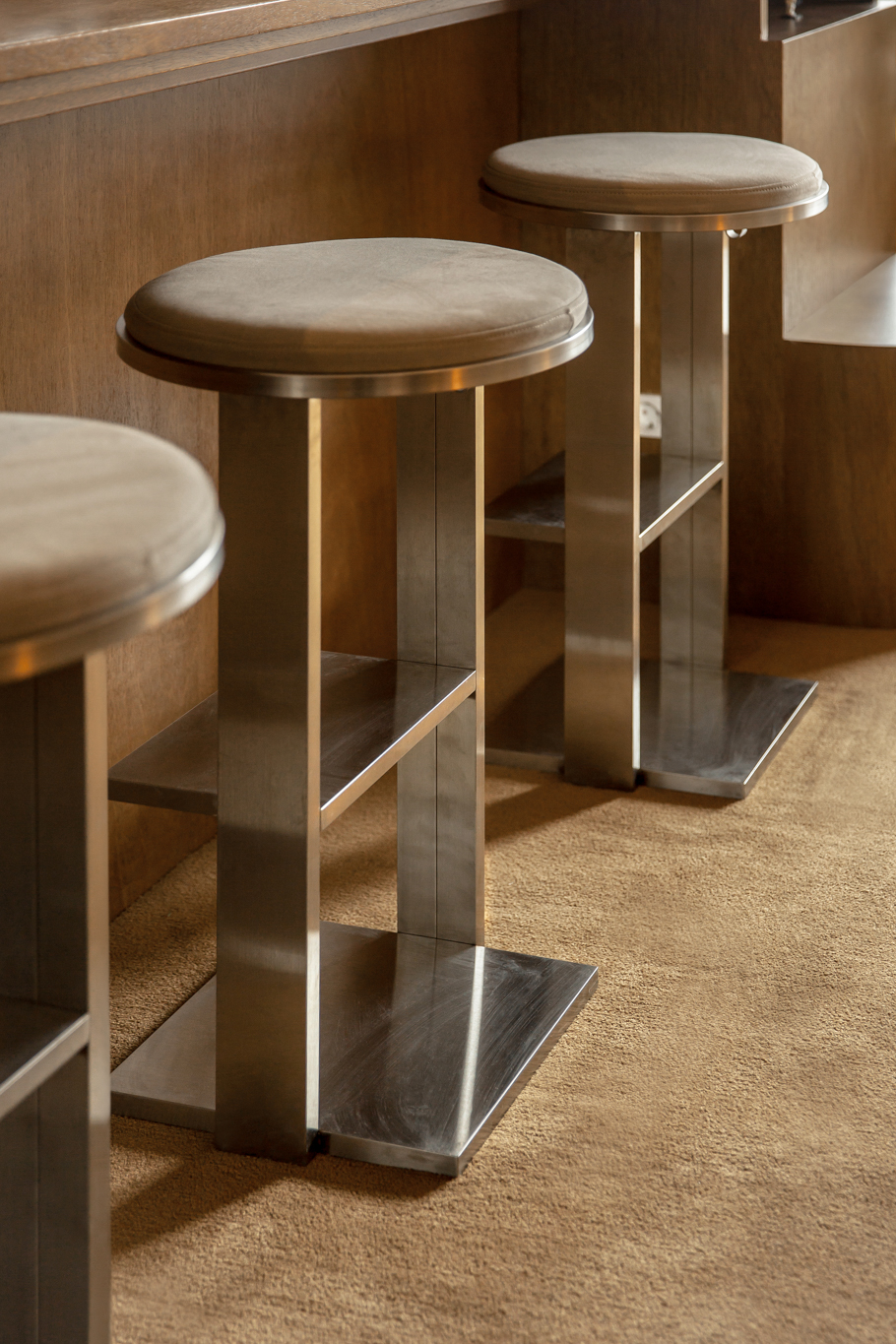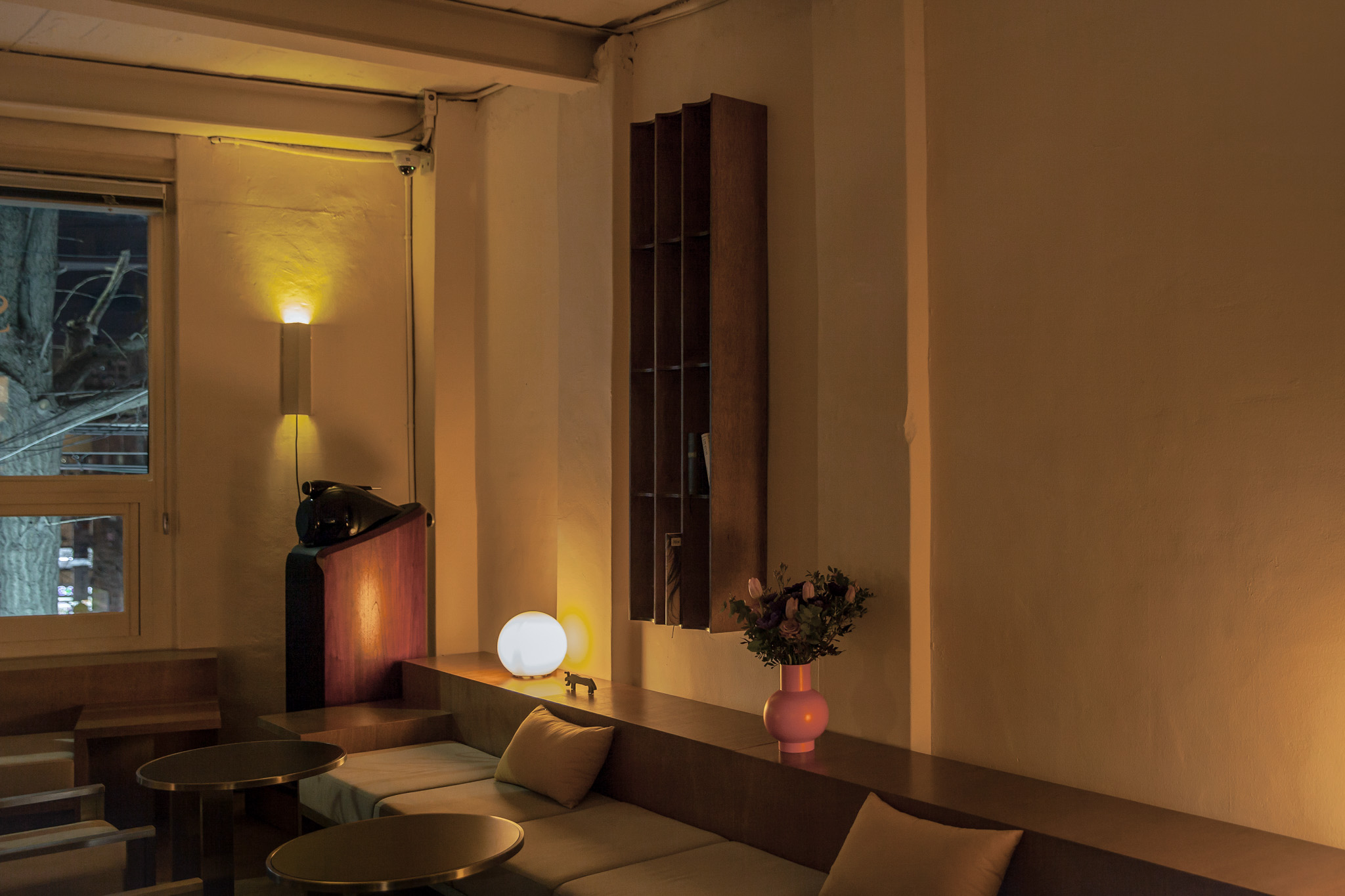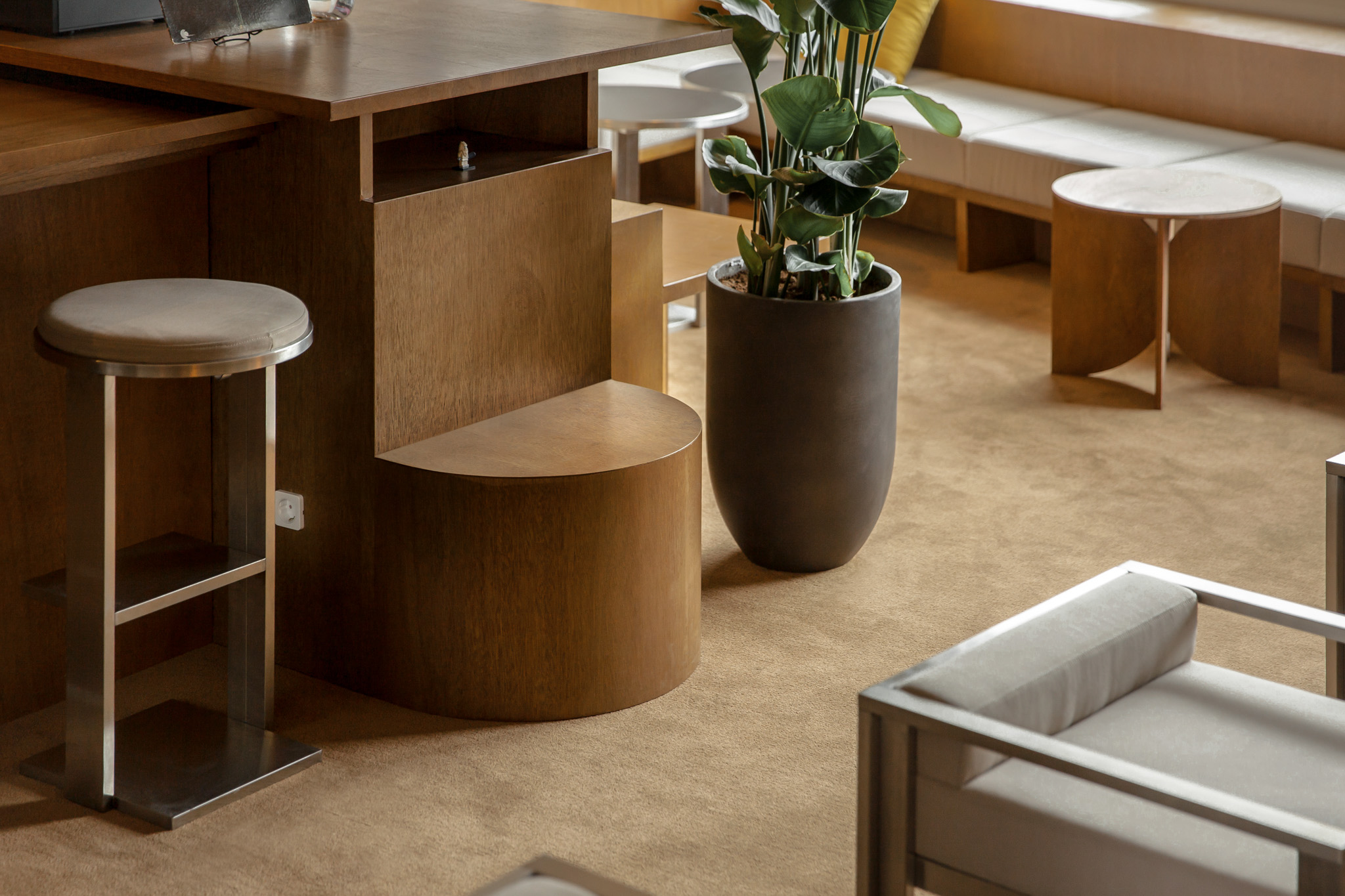 홍대에 위치한 위스키 바로 오랫동안 인디 음악 레이블을 운영했던 클라이언트가 의뢰한 공간입니다. ‘스톤에이지’라는 이름에서 영향을 받은 것인지, 아니면 2층이지만 고저차가 높은 입구에서 전체 공간을 내려다보며 진입해야만 하는 공간의 특성 때문이었는지, 처음 방문했을 때 무겁고 수평적인 가구들이 바닥에 차분히 펼쳐진 풍경이 상상됐습니다. 음악이 중요한 비중을 차지하는 공간인 만큼 단순히 긴 바로 이뤄진 공간보다는, 누군가의 겨울 별장이나 응접실에 앉아 음악을 감상하는 기분이 드는 공간을 만들고 싶었습니다. 소재에서도 라왕 합판의 소박하고 자연스러운 느낌은 가져오면서 면재 특유의 가벼운 느낌을 지우기 위해 손이 많이 가더라도 합판의 모든 단면을 45도 커팅하여 접합해 가구를 제작했고, 대조적으로 음료 선반은 거친 금속으로 투박하게 제작해 벽에 걸어뒀습니다. 술을 판매하는 공간임에도 바닥은 두터운 카펫으로 마감했습니다. 발걸음에서 느껴지는 소음을 줄이고 청각에 집중할 수 있도록.