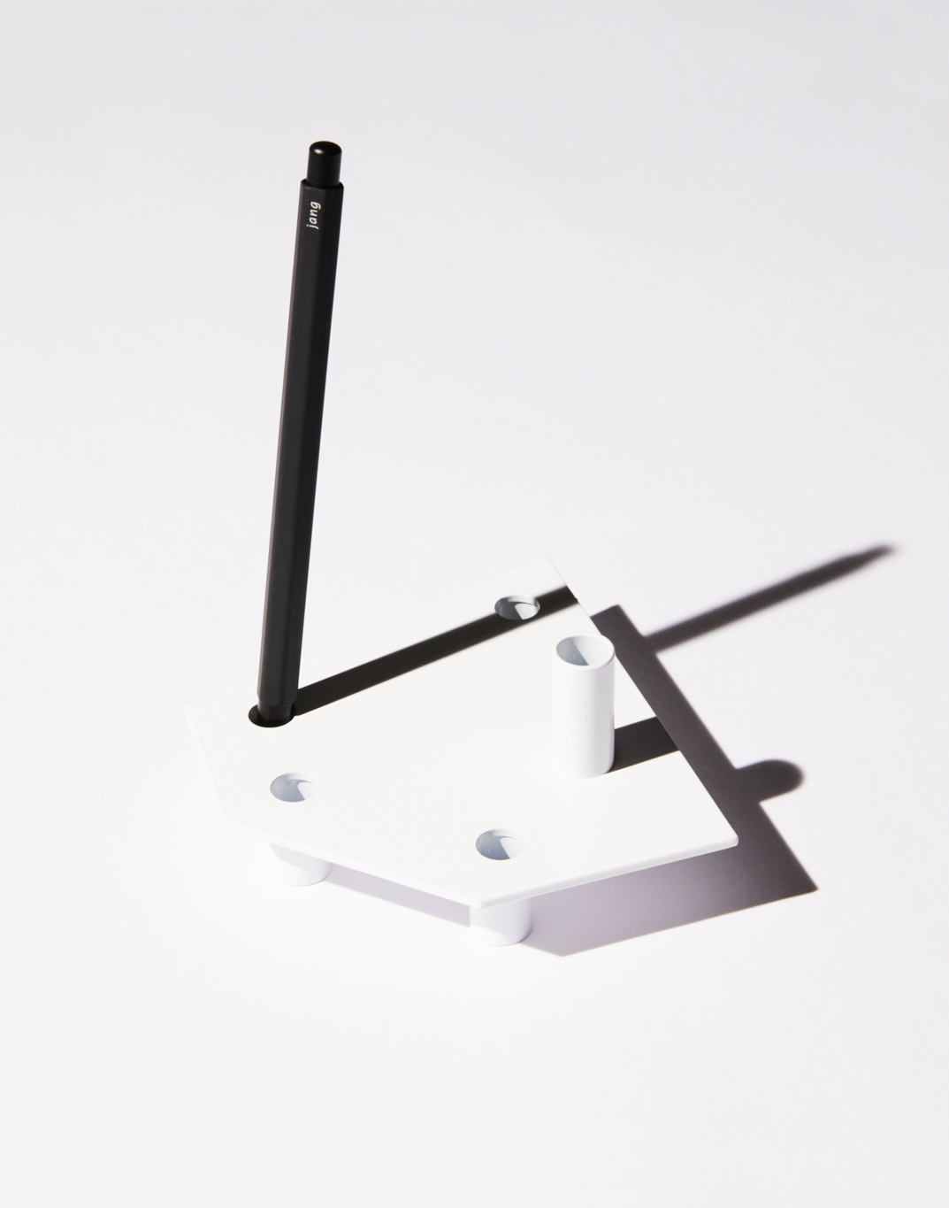 서체 디자인 스튜디오 ‘양장점’의 펜 시리즈 구매 리워드. ‘펜’ 글자를 이루는 자모의 끝단을 잇고 구멍을 내 펜을 꽂을 수 있는 물건을 만들었습니다.
