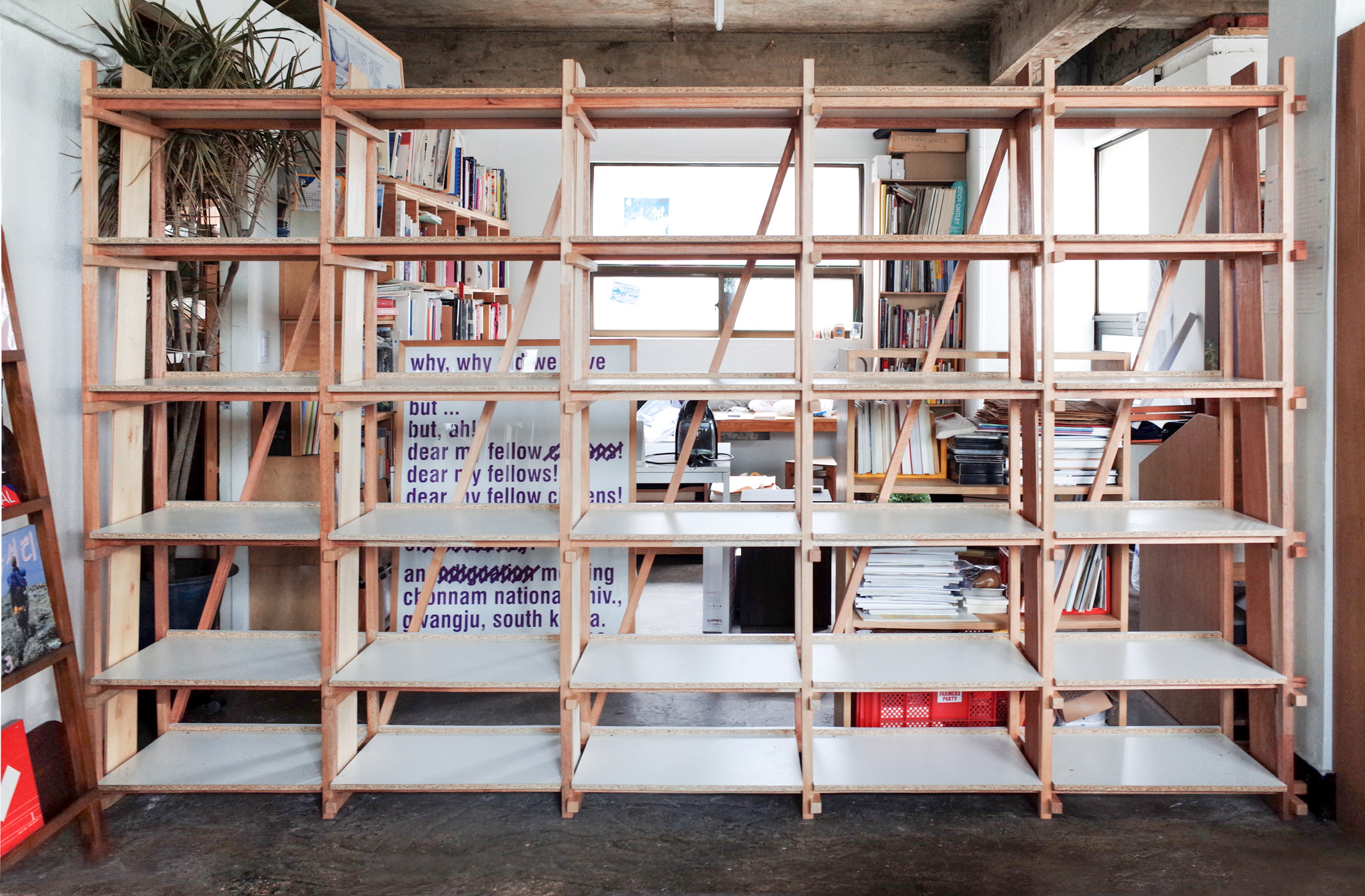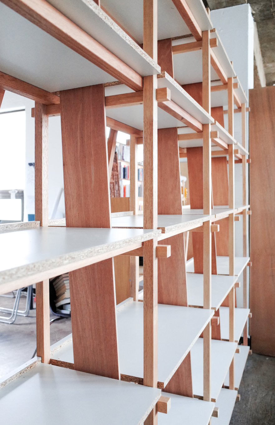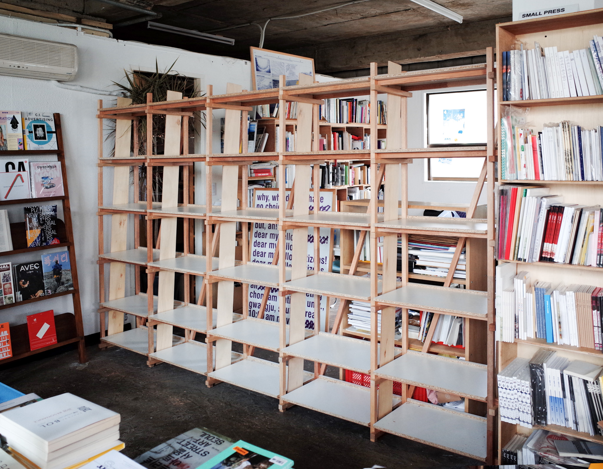 통의동의 예술 서점 더북소사이어티 행사에 참석했다가 서점 대표 임경용에게 현장에서 주문을 받은 책장. 첫 커미션 작업이었고, 당시에는 책장을 어떻게 만들어야 할지 당최 모르겠어서 하나하나 공부하며 설계했습니다. 그러던 중 목수 권구광(쿠목공소 @koo_wwshop)을 만나게 되어 강원도에 있는 그의 집 앞마당에서 책장을 만들었습니다. 이후 클라이언트가 여기저기에 전시·설치 디자이너로 소개해준 덕분에 꽤 재미있는 프로젝트들이 이후로도 이어지게 되었습니다. 간단한 의뢰였지만 좋은 사람들과 인연을 맺고 지금까지 작업할 수 있게 해준 의미 있는 책장입니다.