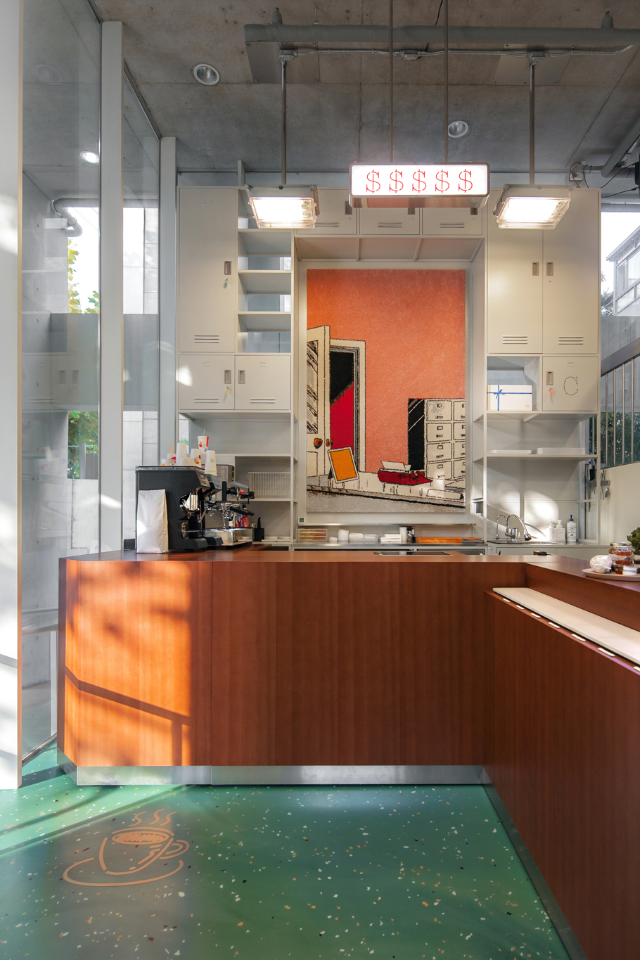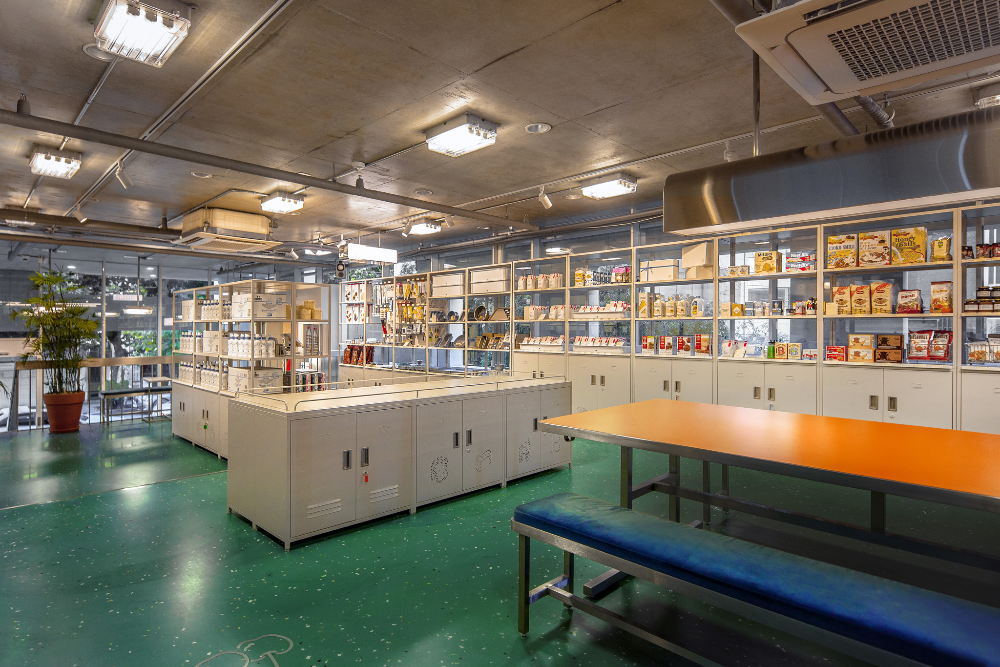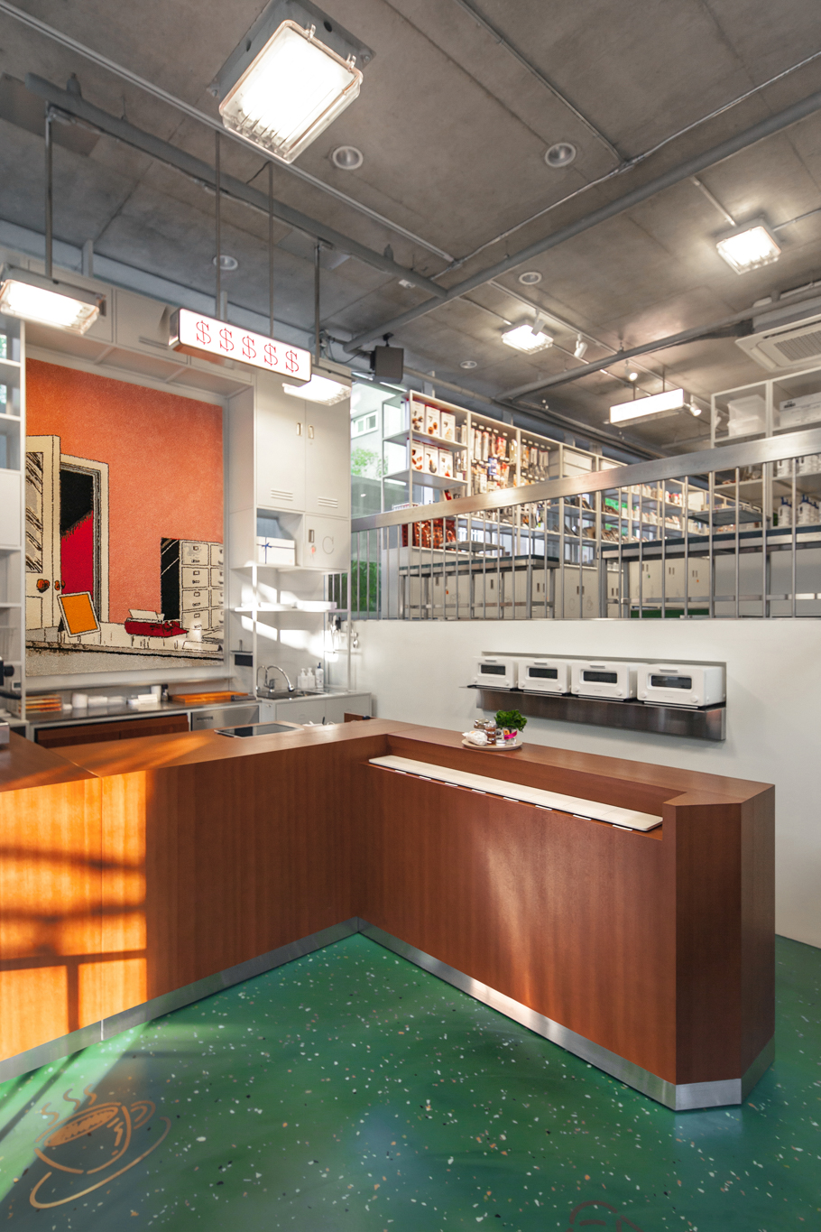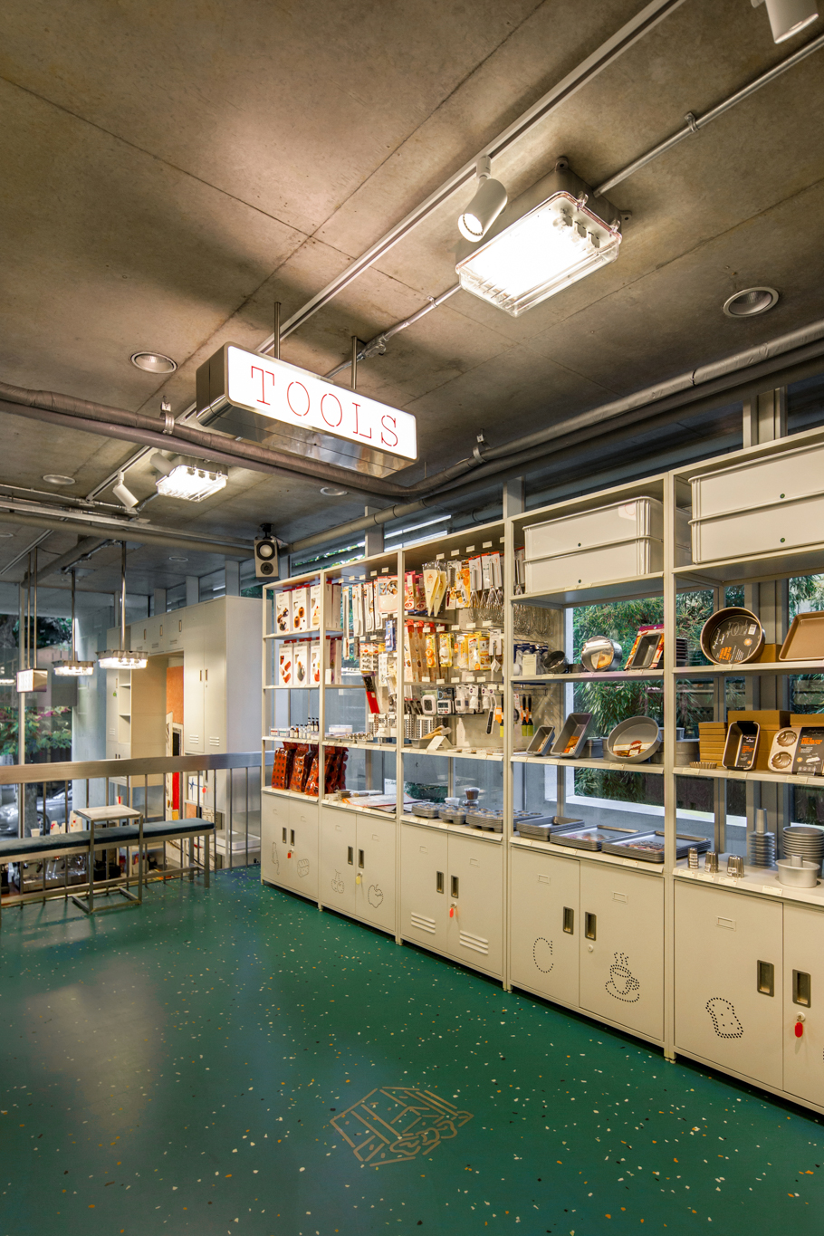 그래픽 디자이너 이광무가 베이킹 용품 판매와 카페, 베이커리를 겸하는 공간 디자인을 요청했습니다. 오래전부터 구상해온 터라 그래픽 디자이너 듀오 신신과 함께 매장에서 쓸 서체와 일러스트 개발을 이미 마친 상태였습니다. 클라이언트가 디자이너인 경우의 장점은 서로의 생각을 풍성하게 만들 수 있다는 점입니다. 매장 바닥을 테라초(대리석 파편을 시멘트와 함께 굳힌 것, 일명 도끼다시)로 하면 좋겠다는 요청이 있었는데, 우리는 그 소재가 맘엔 들지만 유행을 탈 것 같아 수평 몰탈 위에 우레탄 컬러칩으로 마감해 좀 더 캐주얼하게 연출하는 안을 제안했습니다. 반대로 클라이언트는 우리가 디자인한 캐비넷이 평범해 보이므로 일러스트로 숨구멍을 더하자는 의견을 보탰습니다. 벽을 칠할 때도 해가 잘 드는 부분과 그렇지 않은 부분을 구분해, 그에 따라 명도를 조절할 정도로 예민하게 진행됐습니다. 매장 카운터에는 프로젝트의 시작점으로 삼았던 윤향로의 그림이 걸려 있습니다.
