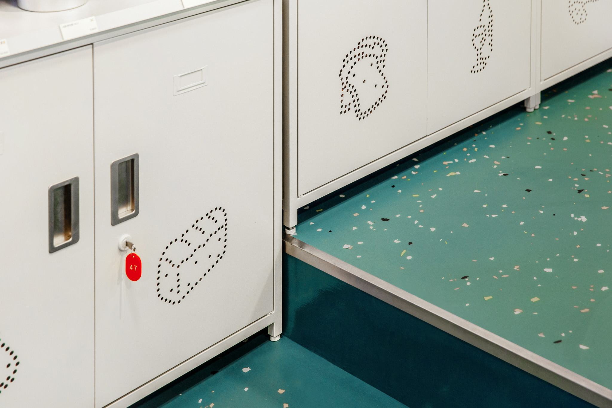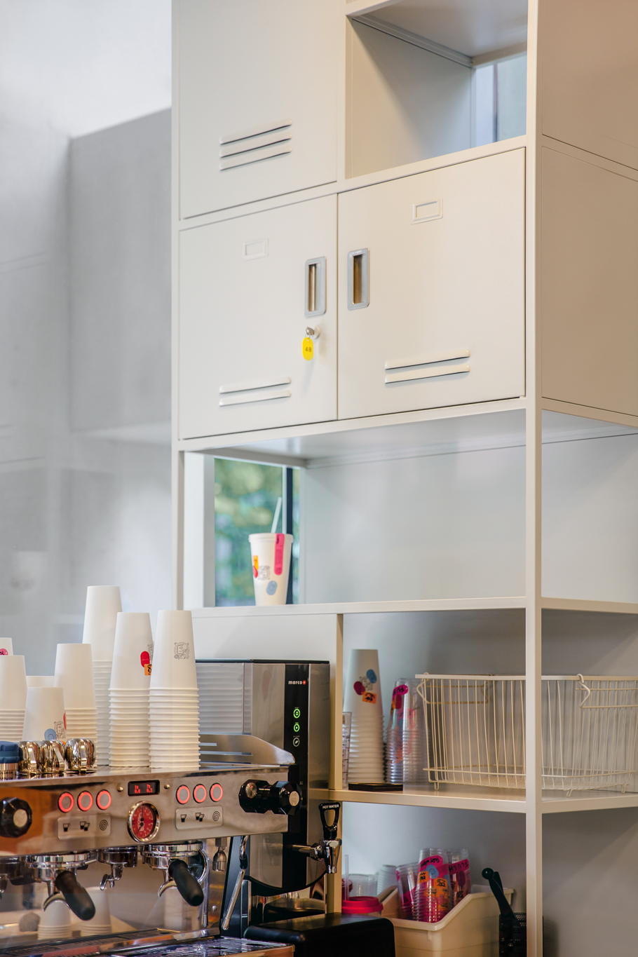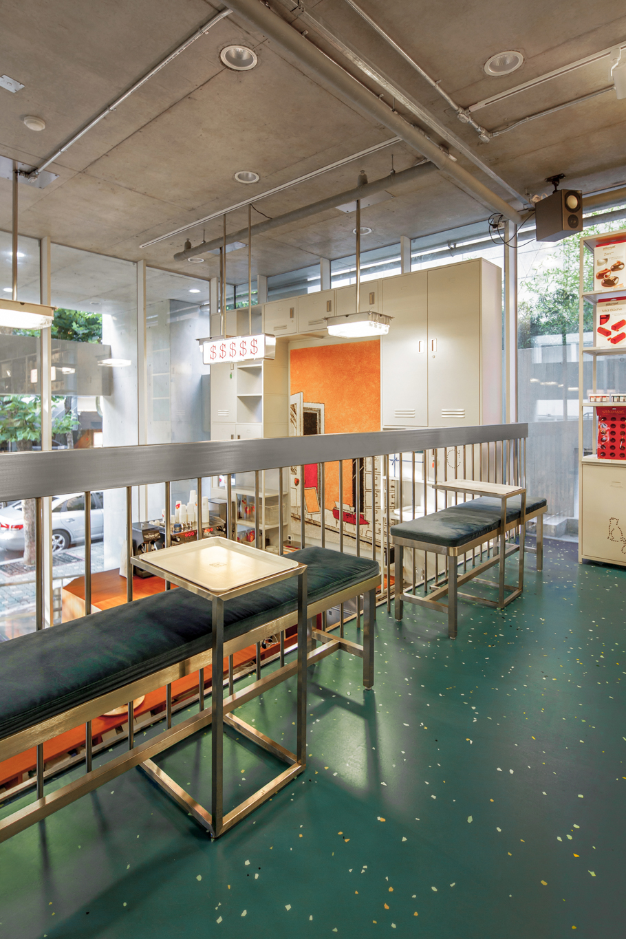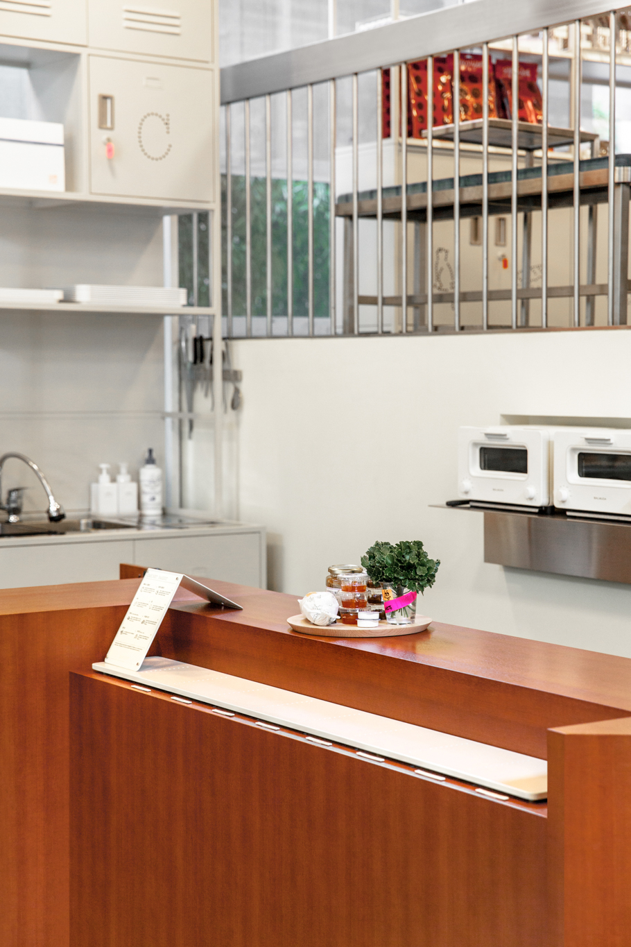 그래픽 디자이너 이광무가 베이킹 용품 판매와 카페, 베이커리를 겸하는 공간 디자인을 요청했습니다. 오래전부터 구상해온 터라 그래픽 디자이너 듀오 신신과 함께 매장에서 쓸 서체와 일러스트 개발을 이미 마친 상태였습니다. 클라이언트가 디자이너인 경우의 장점은 서로의 생각을 풍성하게 만들 수 있다는 점입니다. 매장 바닥을 테라초(대리석 파편을 시멘트와 함께 굳힌 것, 일명 도끼다시)로 하면 좋겠다는 요청이 있었는데, 우리는 그 소재가 맘엔 들지만 유행을 탈 것 같아 수평 몰탈 위에 우레탄 컬러칩으로 마감해 좀 더 캐주얼하게 연출하는 안을 제안했습니다. 반대로 클라이언트는 우리가 디자인한 캐비넷이 평범해 보이므로 일러스트로 숨구멍을 더하자는 의견을 보탰습니다. 벽을 칠할 때도 해가 잘 드는 부분과 그렇지 않은 부분을 구분해, 그에 따라 명도를 조절할 정도로 예민하게 진행됐습니다. 매장 카운터에는 프로젝트의 시작점으로 삼았던 윤향로의 그림이 걸려 있습니다.