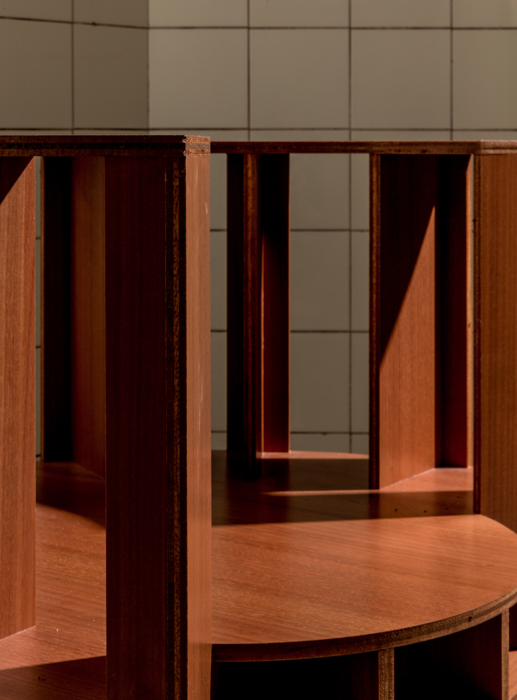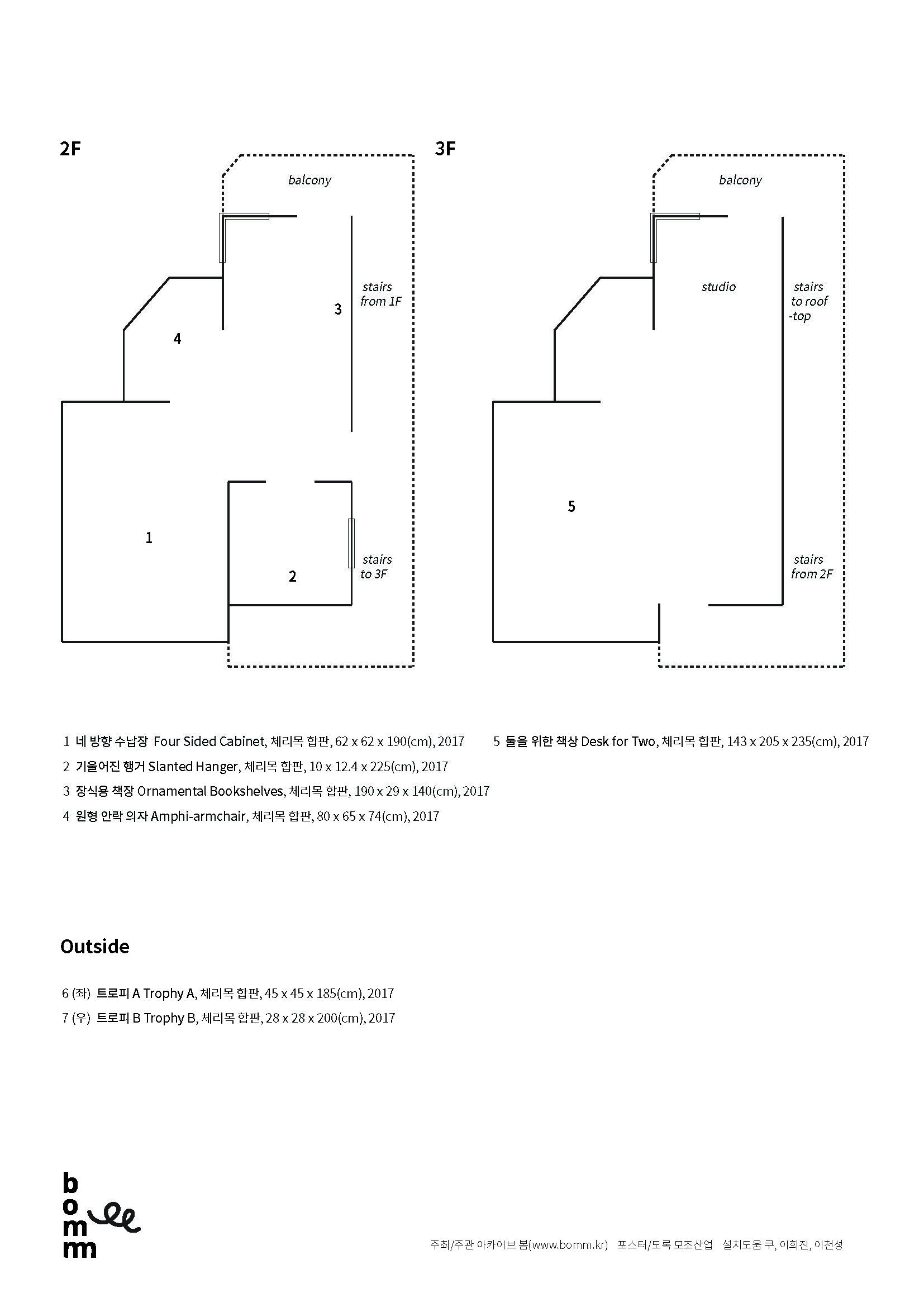 다른 이의 전시 공간을 만들어주거나 상업 공간 커미션 작업을 하던 우리의 첫 단독 전시. 총괄을 맡은 큐레이터 윤율리와 논의 끝에 그동안의 조형 언어와 변칙적인 제작 방식을 극단적으로 과장시켜 적용하기로 하고, 클라이언트의 부재(不在)를 이용해 인체적 척도나 실용상의 제약 없이 심미적 비례감에만 초점을 맞춘 가구를 제작하기로 하였습니다. 특히 ‘코르타니아’라는 가상의 도시를 설정해 어떤 장소나 형식에 관한 근거를 마련하고 이를 최대한 활용했습니다. 사실상 가구의 기능을 잃고 형식만 빌린 이 전시작들의 실제 용도는 각각의 작품명에서만 또렷이 확인될 것 같았지만, 전시가 끝난 후 여기저기 팔려 나가 실제 가구로 활용되고 있습니다.