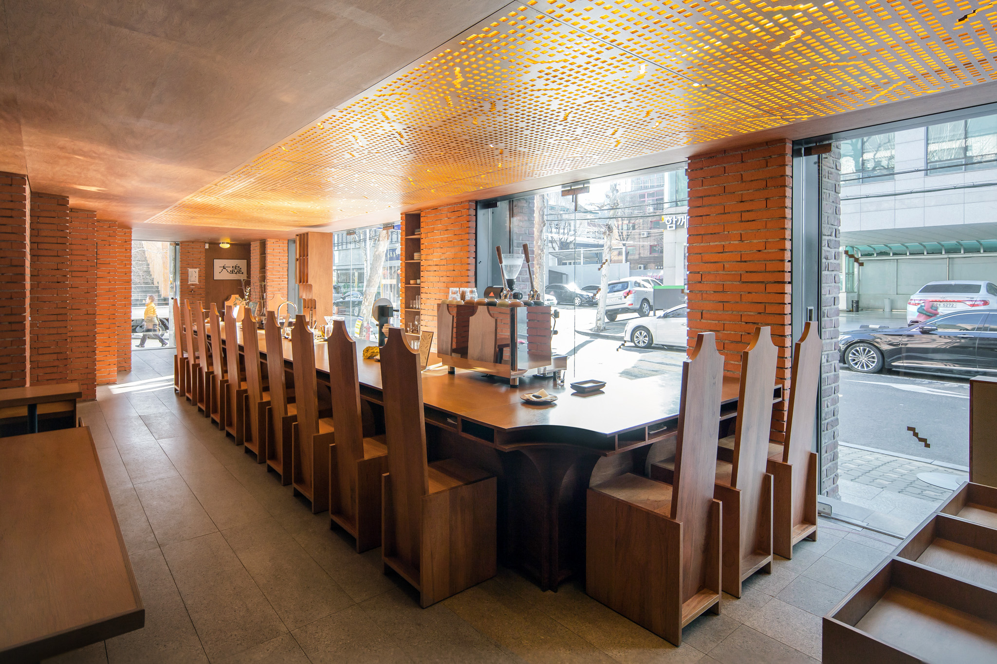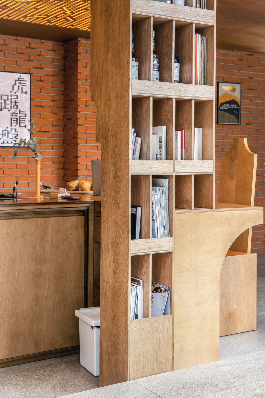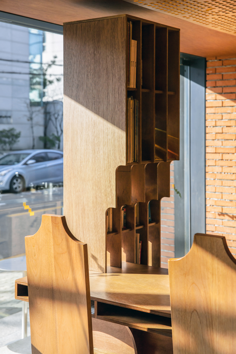 건축사 사무소 푸하하하프렌즈가 자신들이 내부 공간을 맡을 테니 스튜디오 fnt에는 그래픽을, 우리에게는 가구를 만들어달라는 요청을 보내왔습니다. 미팅 때 만난 클라이언트는 말이 거의 없을 정도로 과묵했고, 찔러보는 마음으로 몇 차례 들고 간 안들은 사실 우리 맘에도 안 들고, 푸하하하프렌즈(굉장히 솔직한 성격)도 ‘이건 왠지 아닌데 뭐가 아닌지 모르겠고…’ 하는 것이었습니다. fnt가 그래픽 작업을 먼저 진행했기 때문에 거기서 디자인에 대한 힌트를 얻고 싶었지만, fnt 역시 가구 디자인이 먼저 나오길 기다리고 있었습니다. 절박한 마음이 되어 뭐라도 쓸 게 없을까 생각하던 중 클라이언트가 미팅 때마다 쓰고 나오던 페도라가 떠올랐습니다. 페도라 하면 서부극에 자주 등장하던 길다란 바도 생각나고, 모자를 벗을 때 손자국이 남긴 곡선도 독특해 그런 형태를 기초로 디자인했습니다. 곡선이 들어간 가구와 푸하하하가 설계한 계단형 벽면을 토대로 fnt에서 천장에 들어갈 조명과 그래픽을 작업했고, 결국 이 모든 것이 한자리에 모인 날, 왠지 대충 한 게 없는 대충유원지가 완성됐습니다.