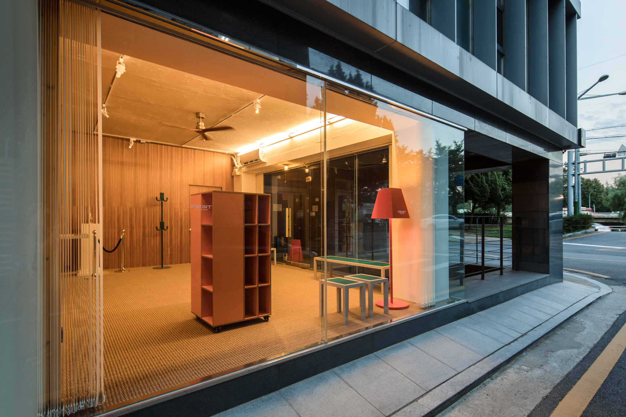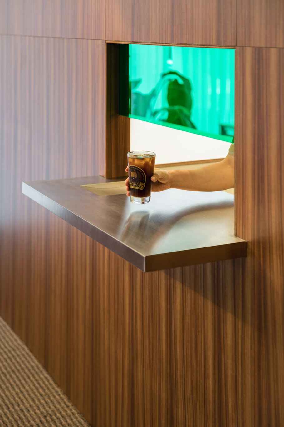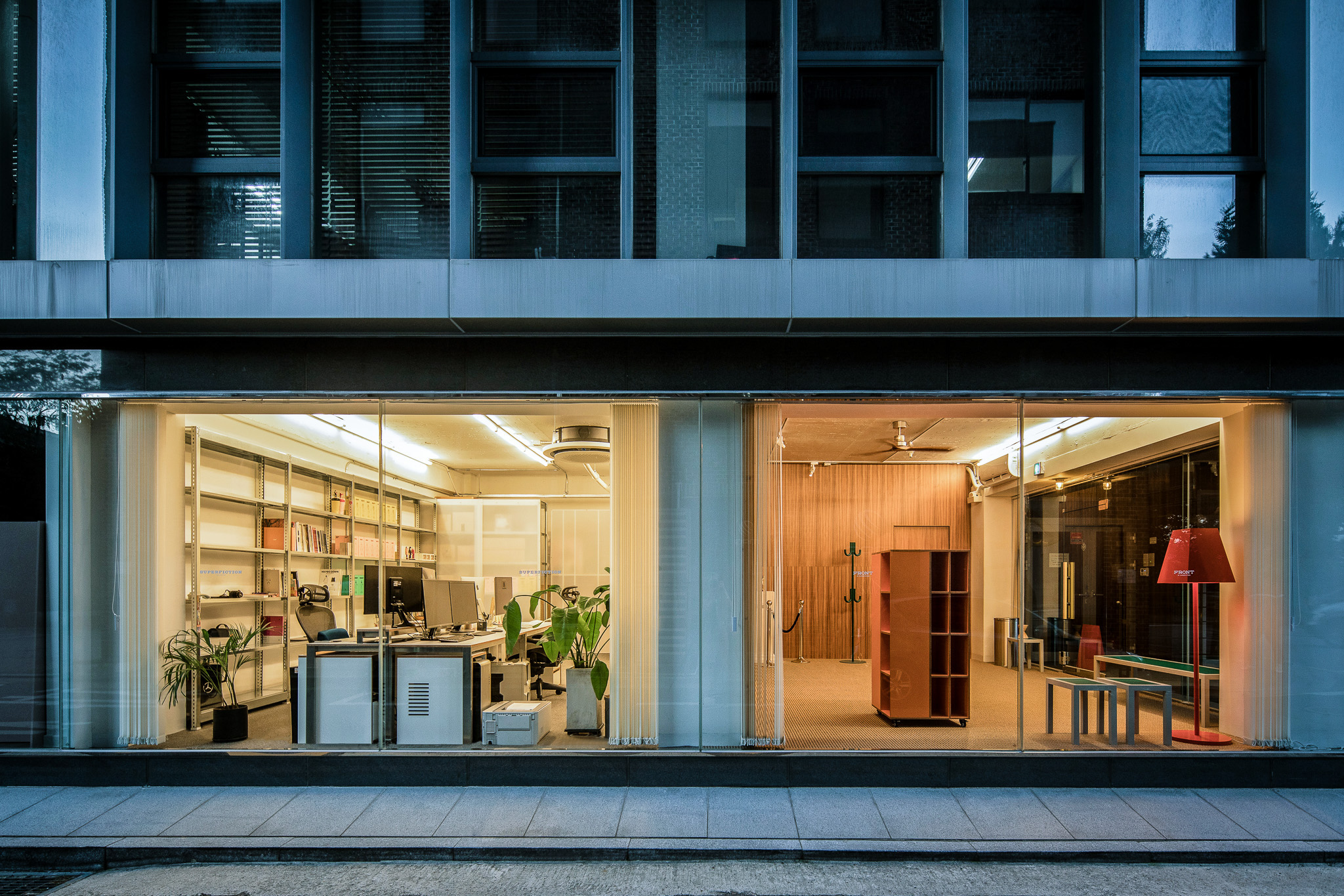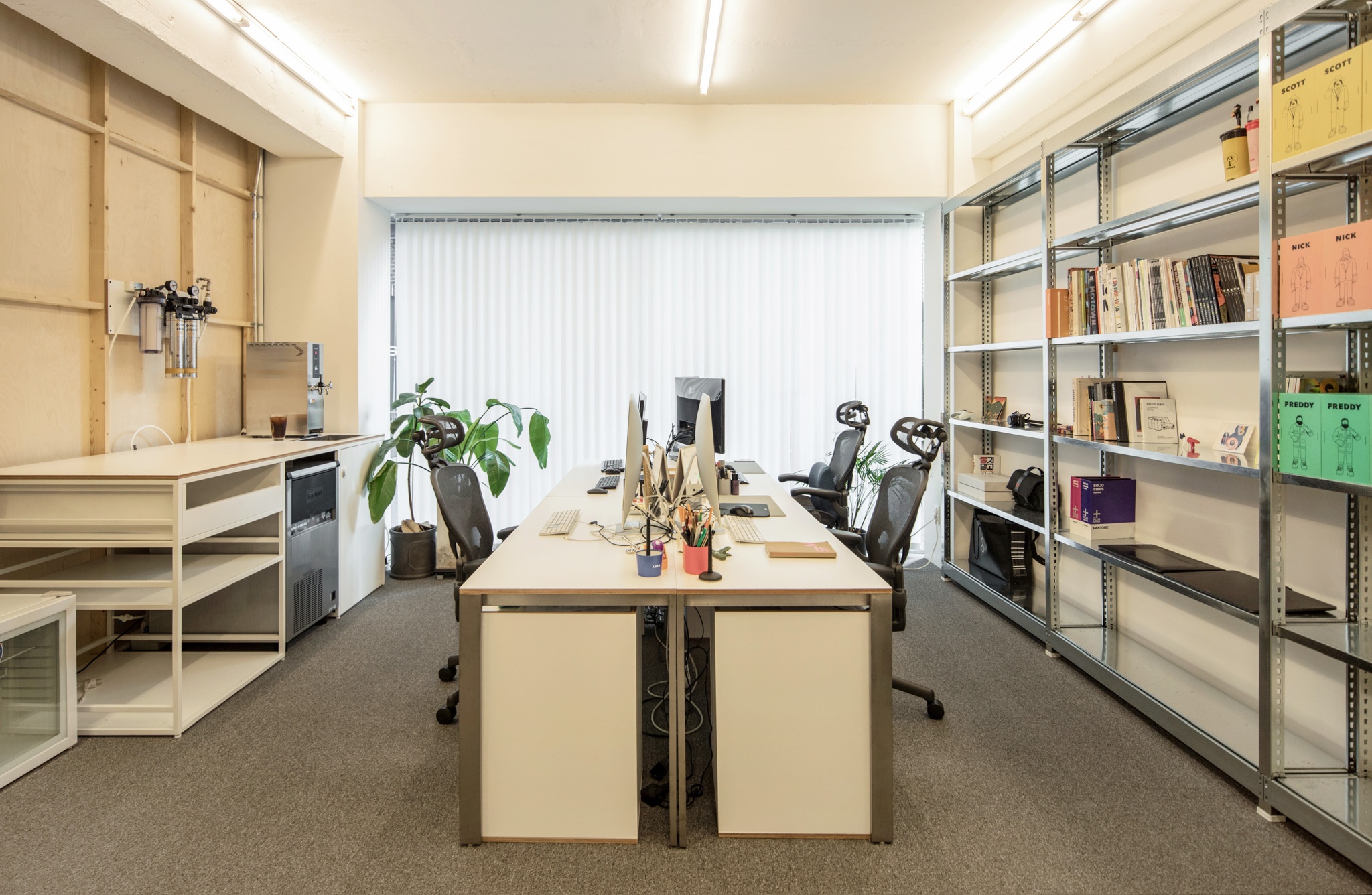 사무실과 카페, 두 가지 용도로 동시에 사용하기엔 작은 공간이 주어졌습니다. 두 영역 사이에 가벽을 세우고, 카페에 방문한 손님에게 오피스에서 제조한 음료를 전달하는 일종의 개찰구를 만들었습니다. 건물 측면에서 보면 용도에 따라 반으로 나뉜 공간을 확인할 수 있는 점이 흥미롭습니다. 세트장 같기도 하고요.