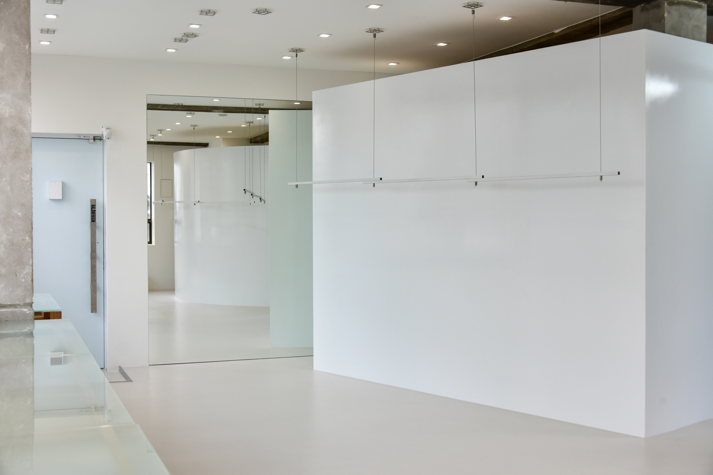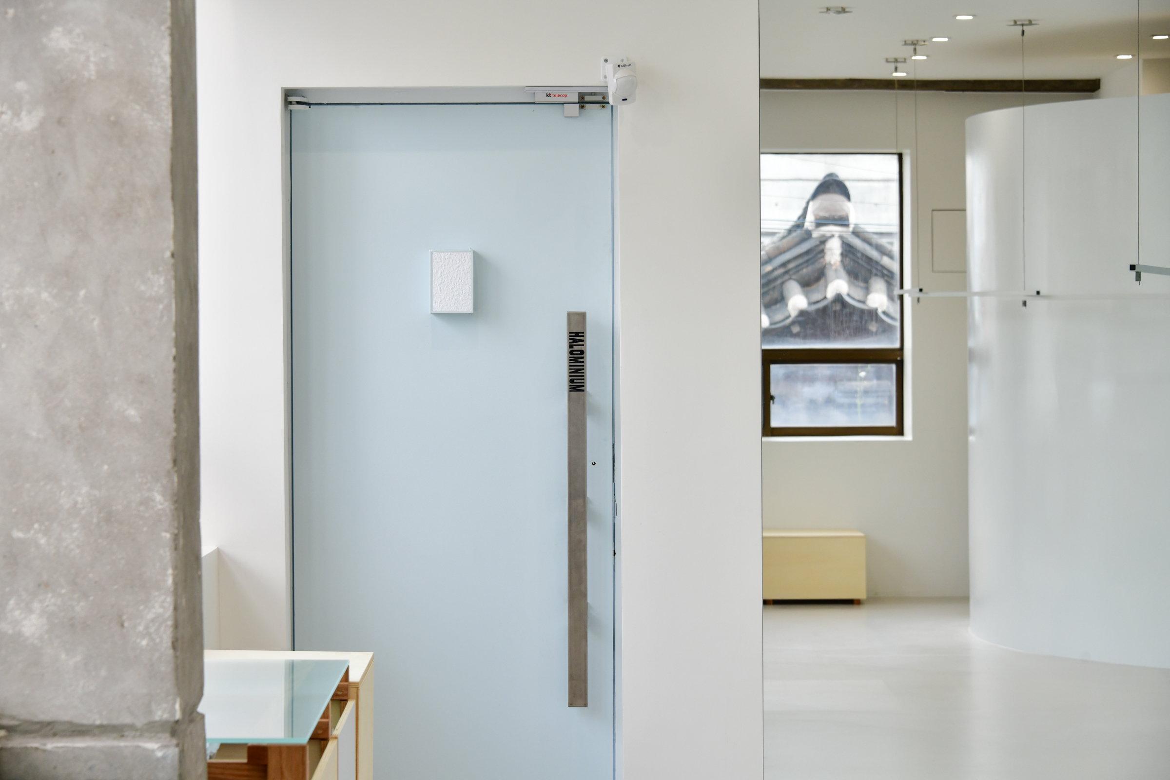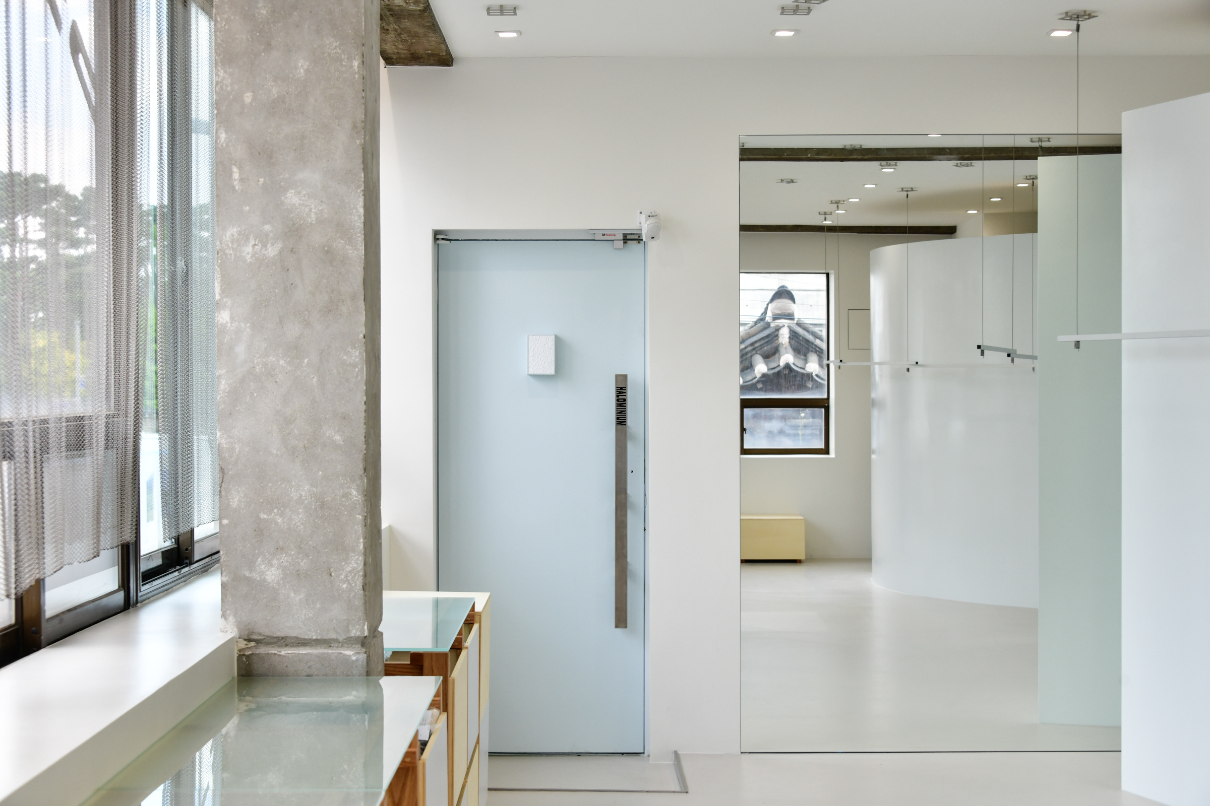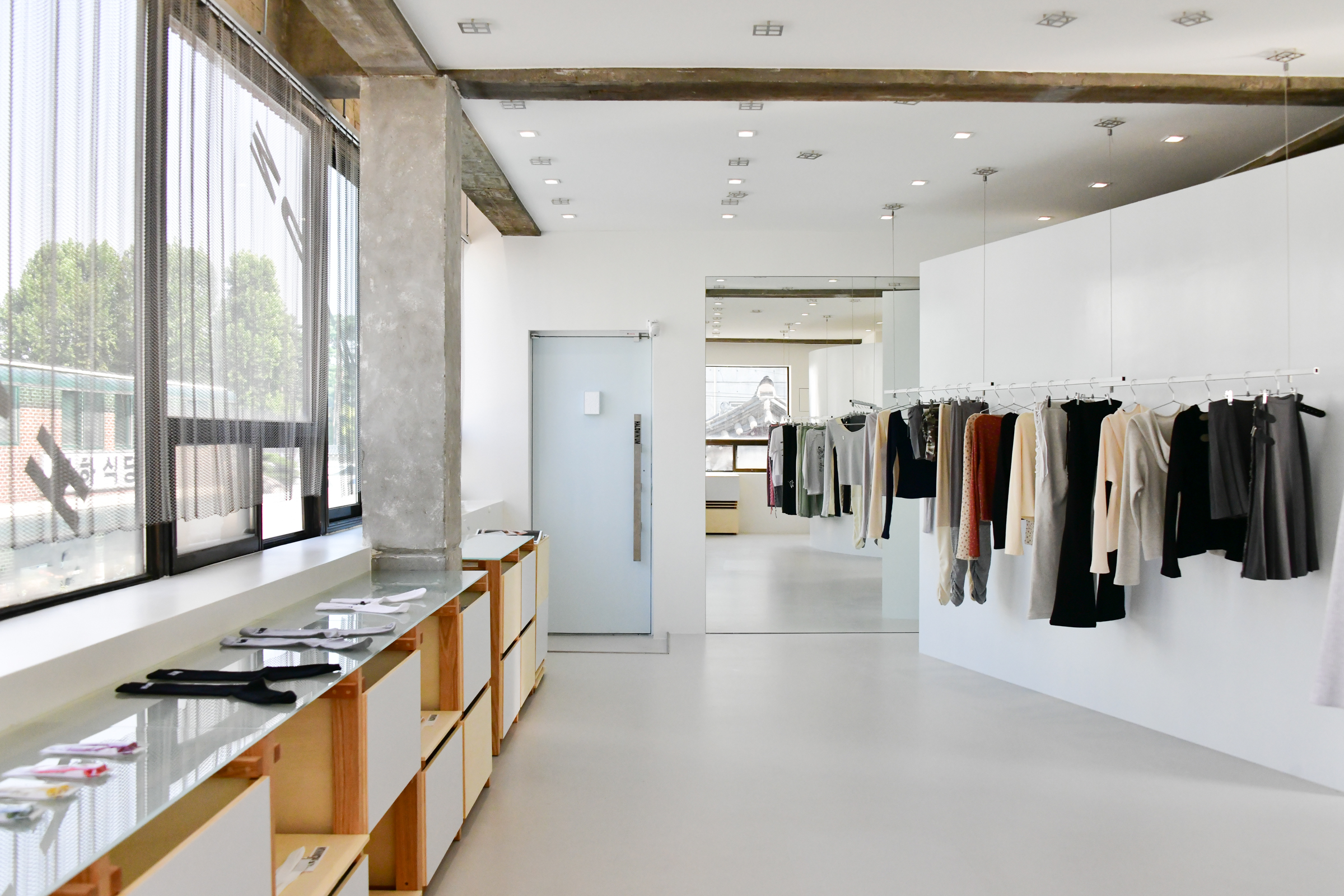 서울시 종로구 통의동 건물 2층에 위치한 패션 브랜드 할로미늄(HALOMINIUM)의 쇼룸. 브랜드 대표인 유미 씨의 바람과 씨오엠이 생각하는 할로미늄의 인상이 반영된 공간입니다. 할로미늄 옷에서 두드러지는 구조적 특징은 면과 면을 느슨하게 여미는 끈과 쇠붙이, 그리고 그것이 만들어내는 틈이라고 생각했습니다. 이를 공간에 적용해 동그라미와 네모 두 개의 볼륨으로 공간을 구획하고, 그 사이로 빛과 시선이 지나다닐 틈을 만들었습니다. 특히 이 두 벽체의 평면이 대표 이름인 ‘유미’의 초성 ㅇ, ㅁ과 닮았다는 점도 만족스러운 부분 중 하나입니다. 가구나 소집기에는 할로미늄에서 자주 사용하는 패턴들을 활용했습니다. 한편, 이 장소 자체도 저희에게 의미가 있는데, 원래 여기는 ‘더북소사이어티’라는 서점이 사용했던 곳입니다. 저희가 디자인한 책장이 오랜 시간 서 있었죠. COM의 첫 가구 납품이었습니다. 그때 만든 책장의 구조적 특징을 이번 할로미늄 쇼룸의 선반에도 슬쩍 적용해봤습니다.
