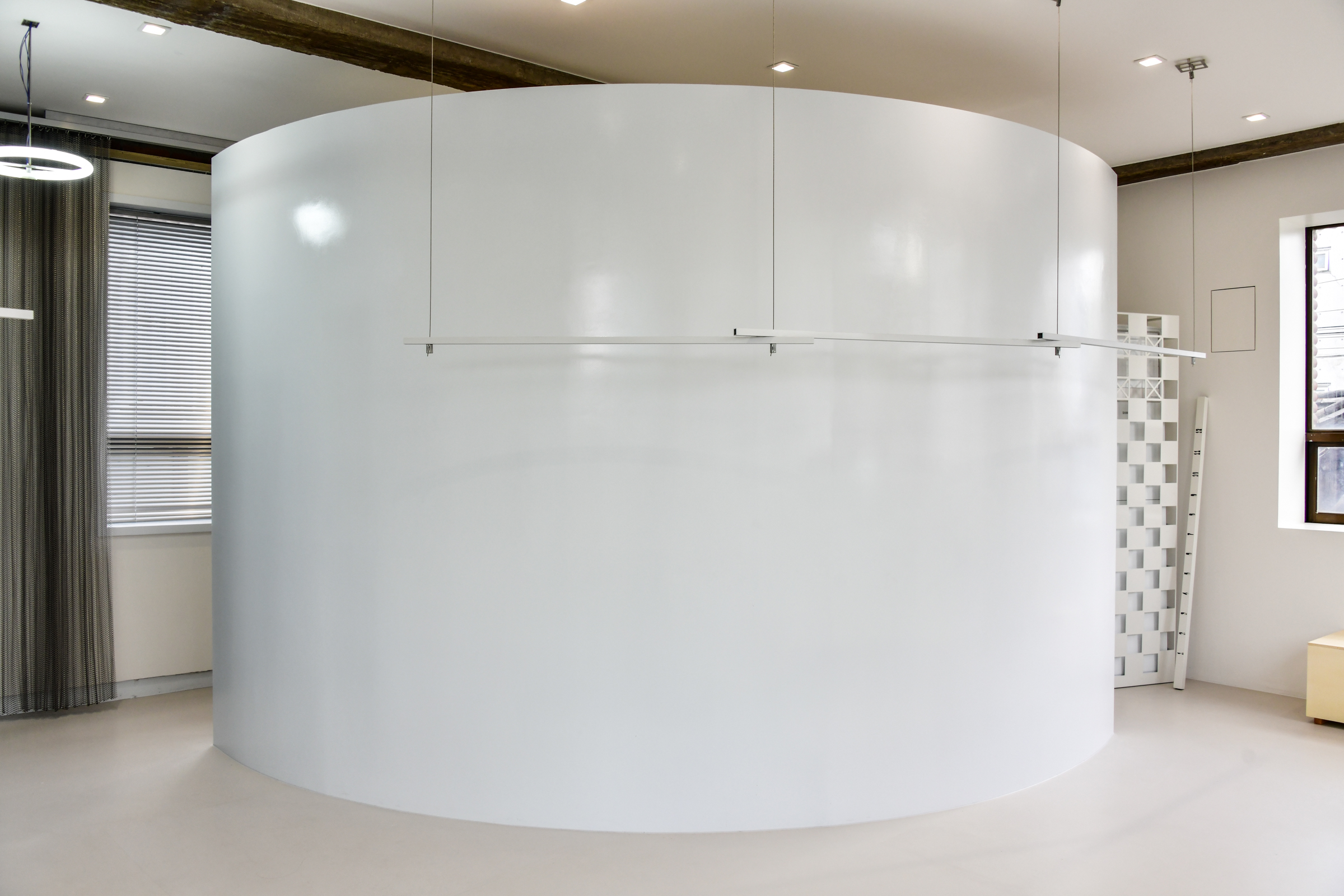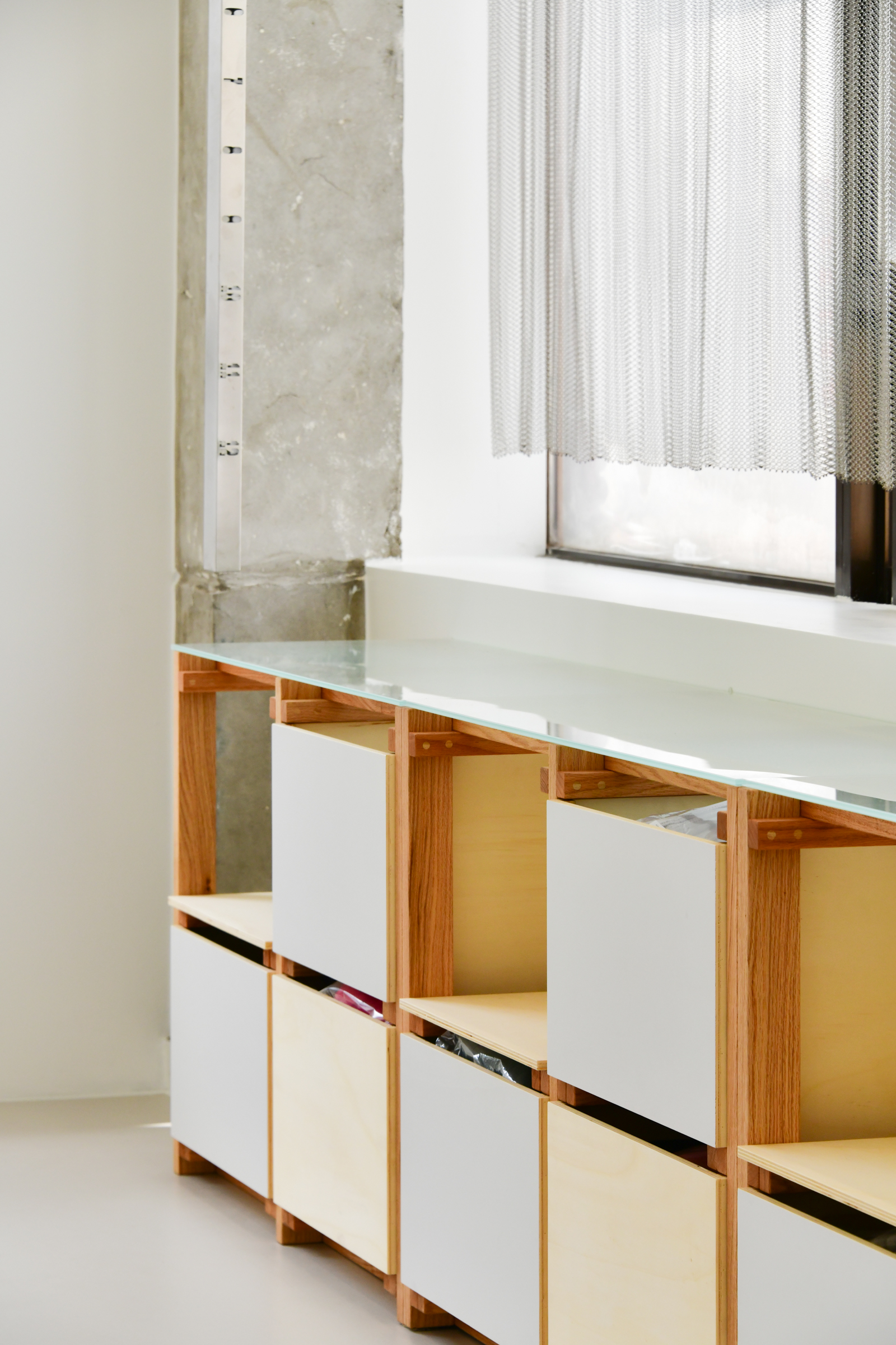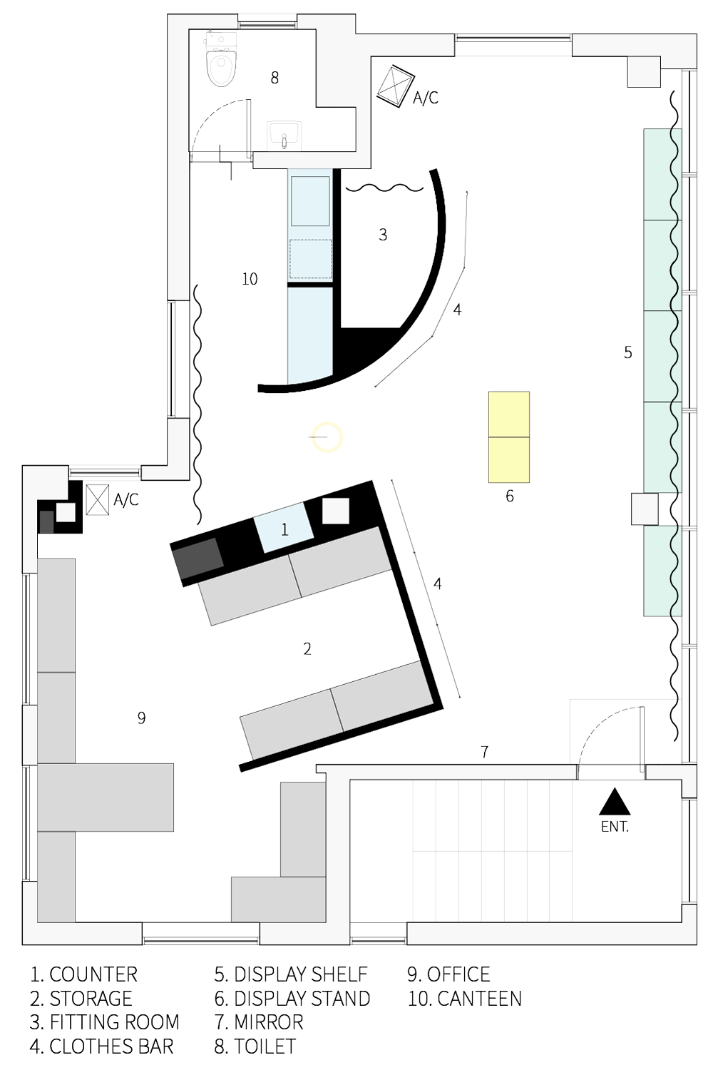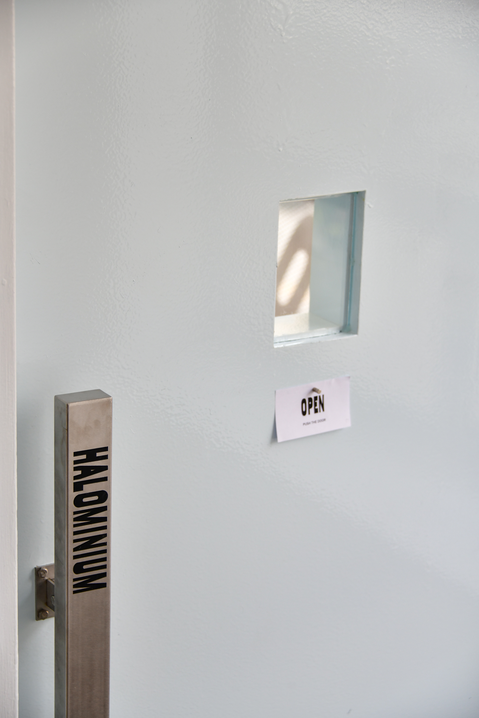 서울시 종로구 통의동 건물 2층에 위치한 패션 브랜드 할로미늄(HALOMINIUM)의 쇼룸. 브랜드 대표인 유미 씨의 바람과 씨오엠이 생각하는 할로미늄의 인상이 반영된 공간입니다. 할로미늄 옷에서 두드러지는 구조적 특징은 면과 면을 느슨하게 여미는 끈과 쇠붙이, 그리고 그것이 만들어내는 틈이라고 생각했습니다. 이를 공간에 적용해 동그라미와 네모 두 개의 볼륨으로 공간을 구획하고, 그 사이로 빛과 시선이 지나다닐 틈을 만들었습니다. 특히 이 두 벽체의 평면이 대표 이름인 ‘유미’의 초성 ㅇ, ㅁ과 닮았다는 점도 만족스러운 부분 중 하나입니다. 가구나 소집기에는 할로미늄에서 자주 사용하는 패턴들을 활용했습니다. 한편, 이 장소 자체도 저희에게 의미가 있는데, 원래 여기는 ‘더북소사이어티’라는 서점이 사용했던 곳입니다. 저희가 디자인한 책장이 오랜 시간 서 있었죠. COM의 첫 가구 납품이었습니다. 그때 만든 책장의 구조적 특징을 이번 할로미늄 쇼룸의 선반에도 슬쩍 적용해봤습니다.