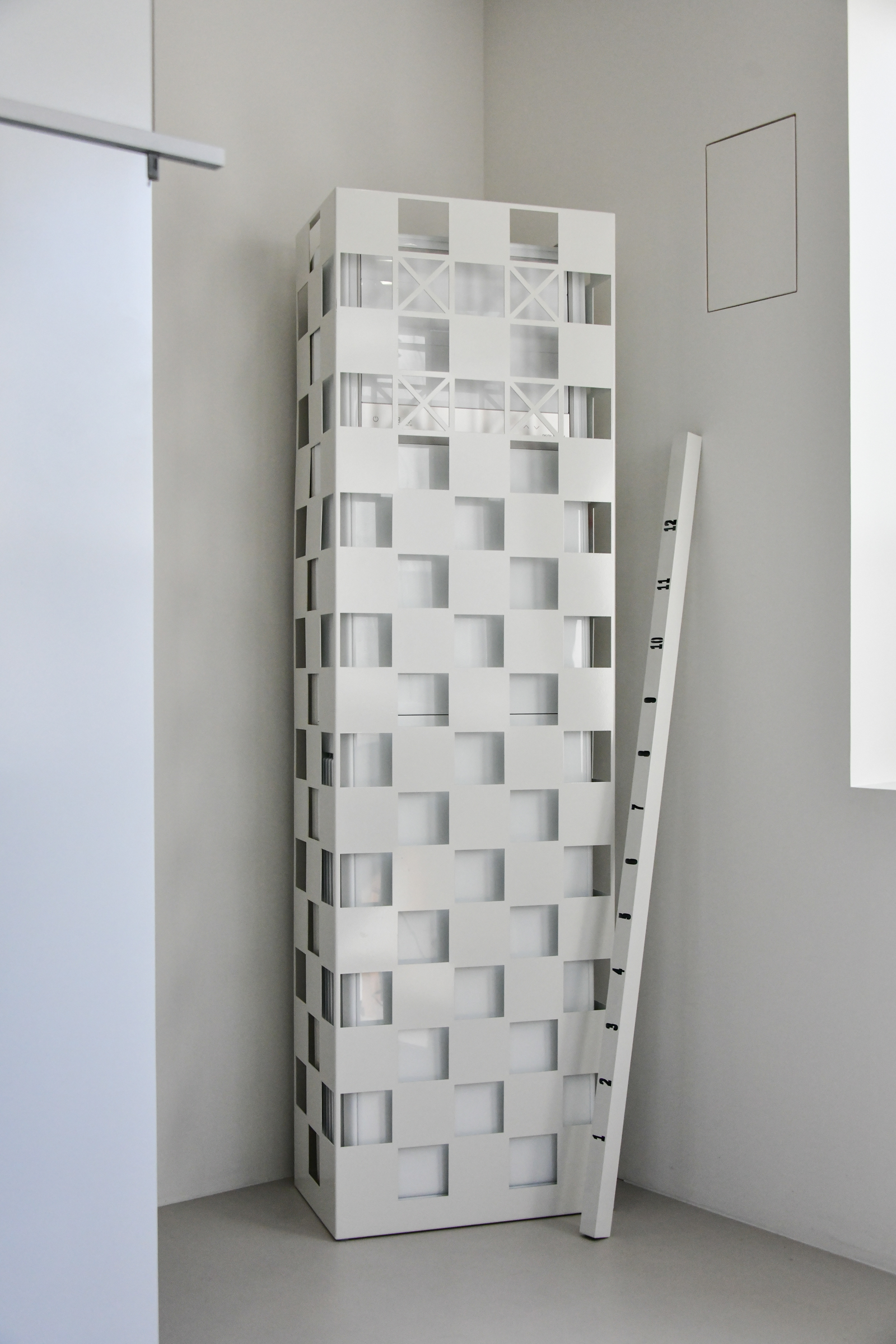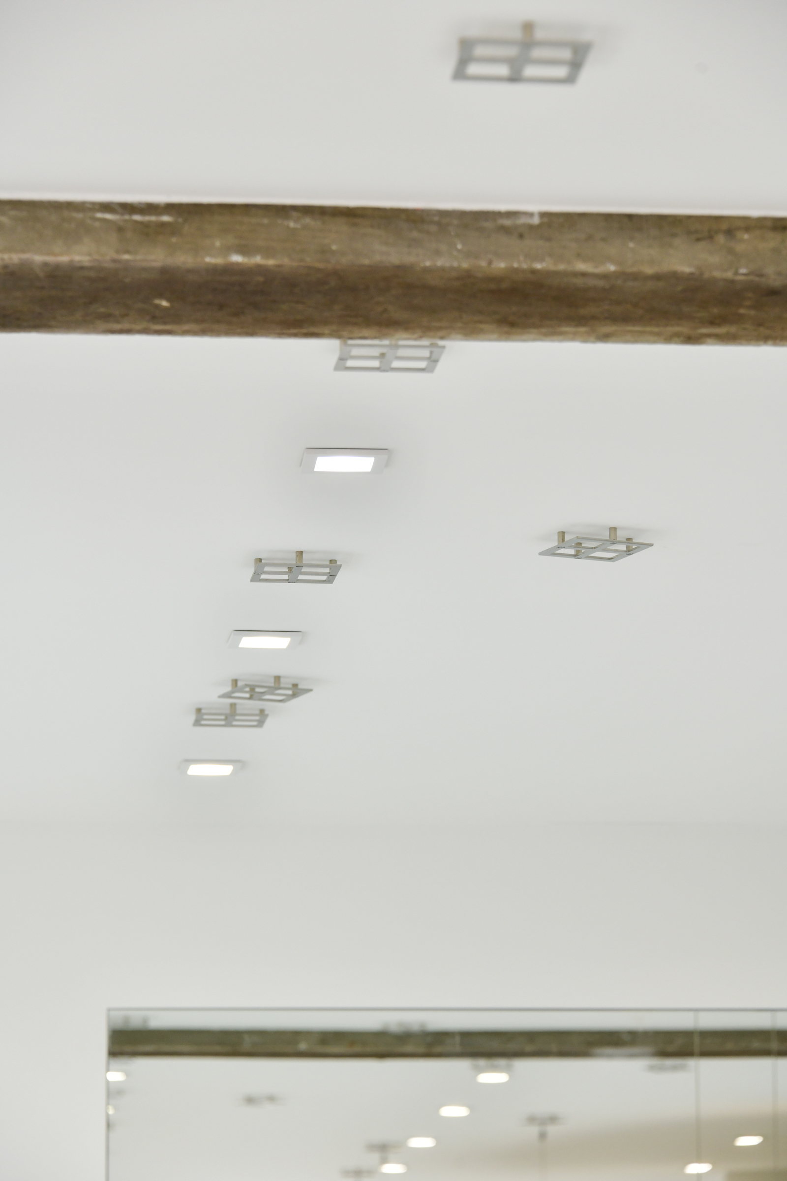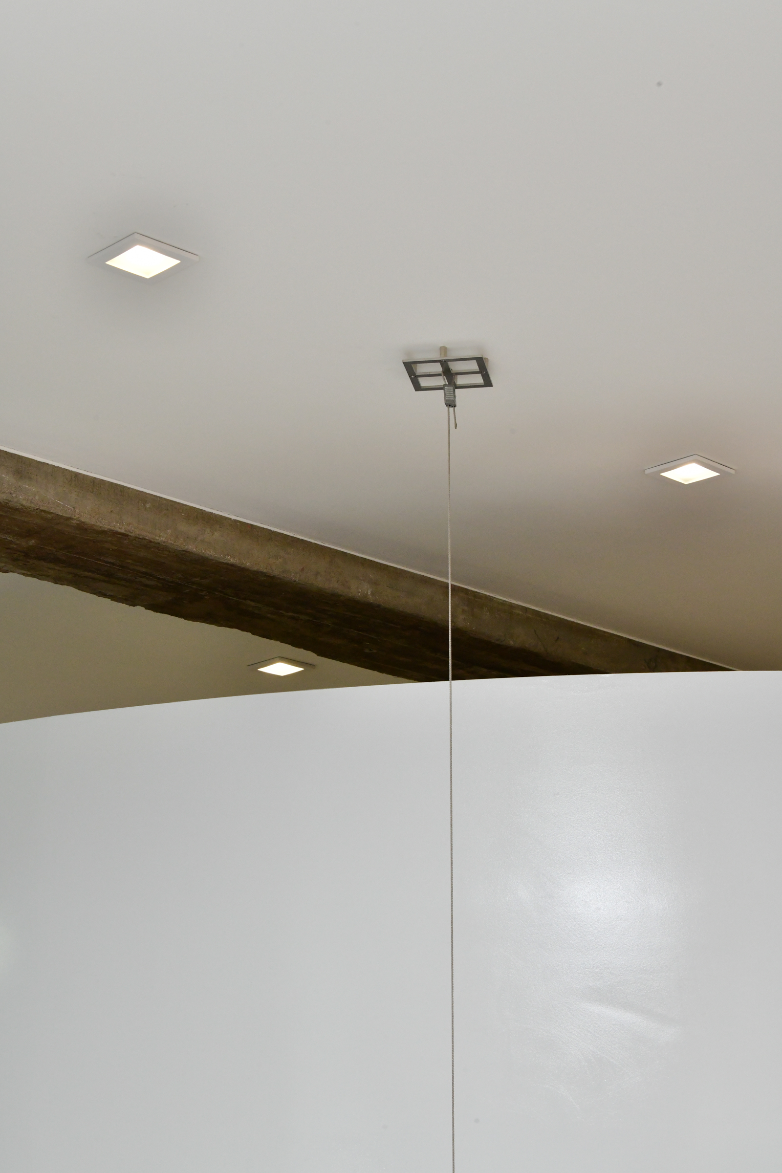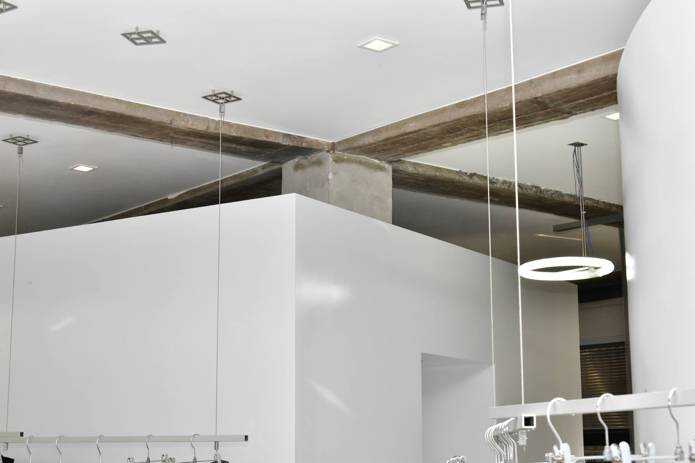 서울시 종로구 통의동 건물 2층에 위치한 패션 브랜드 할로미늄(HALOMINIUM)의 쇼룸. 브랜드 대표인 유미 씨의 바람과 씨오엠이 생각하는 할로미늄의 인상이 반영된 공간입니다. 할로미늄 옷에서 두드러지는 구조적 특징은 면과 면을 느슨하게 여미는 끈과 쇠붙이, 그리고 그것이 만들어내는 틈이라고 생각했습니다. 이를 공간에 적용해 동그라미와 네모 두 개의 볼륨으로 공간을 구획하고, 그 사이로 빛과 시선이 지나다닐 틈을 만들었습니다. 특히 이 두 벽체의 평면이 대표 이름인 ‘유미’의 초성 ㅇ, ㅁ과 닮았다는 점도 만족스러운 부분 중 하나입니다. 가구나 소집기에는 할로미늄에서 자주 사용하는 패턴들을 활용했습니다. 한편, 이 장소 자체도 저희에게 의미가 있는데, 원래 여기는 ‘더북소사이어티’라는 서점이 사용했던 곳입니다. 저희가 디자인한 책장이 오랜 시간 서 있었죠. COM의 첫 가구 납품이었습니다. 그때 만든 책장의 구조적 특징을 이번 할로미늄 쇼룸의 선반에도 슬쩍 적용해봤습니다.