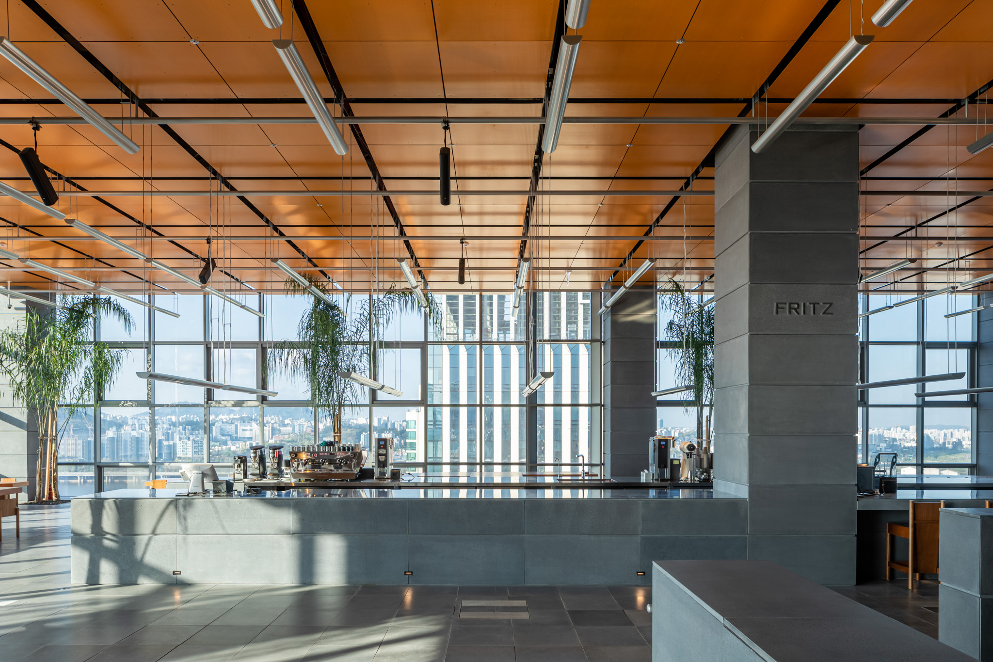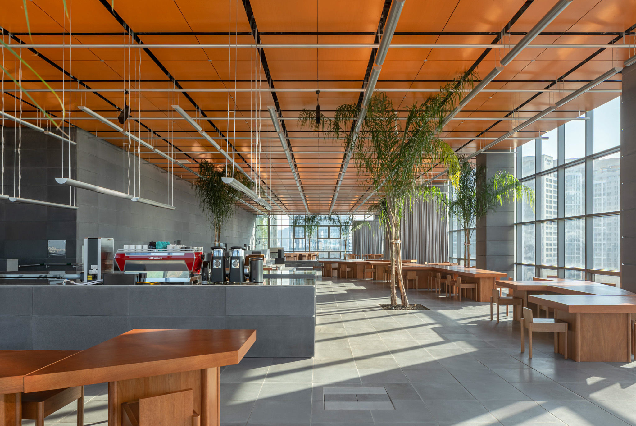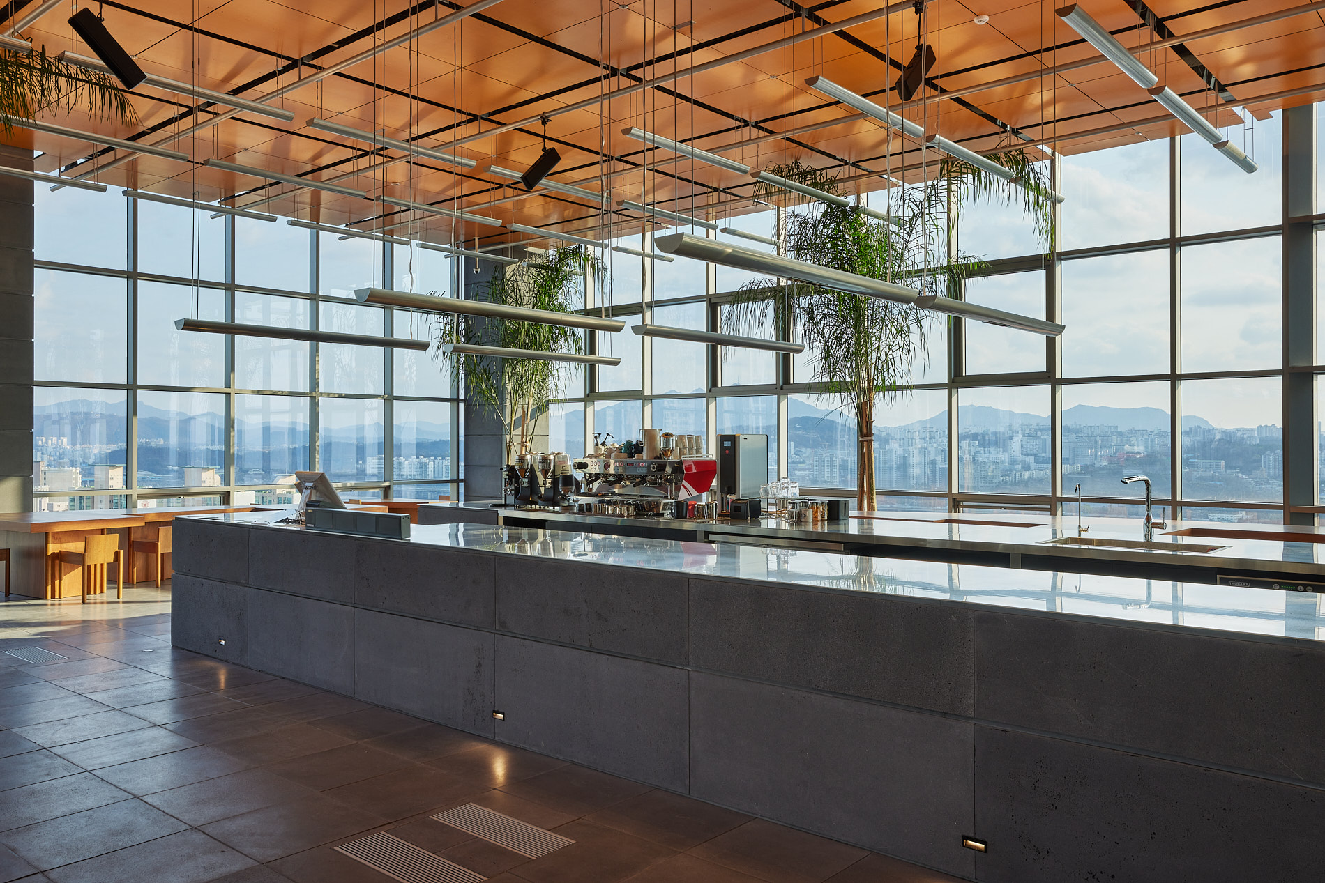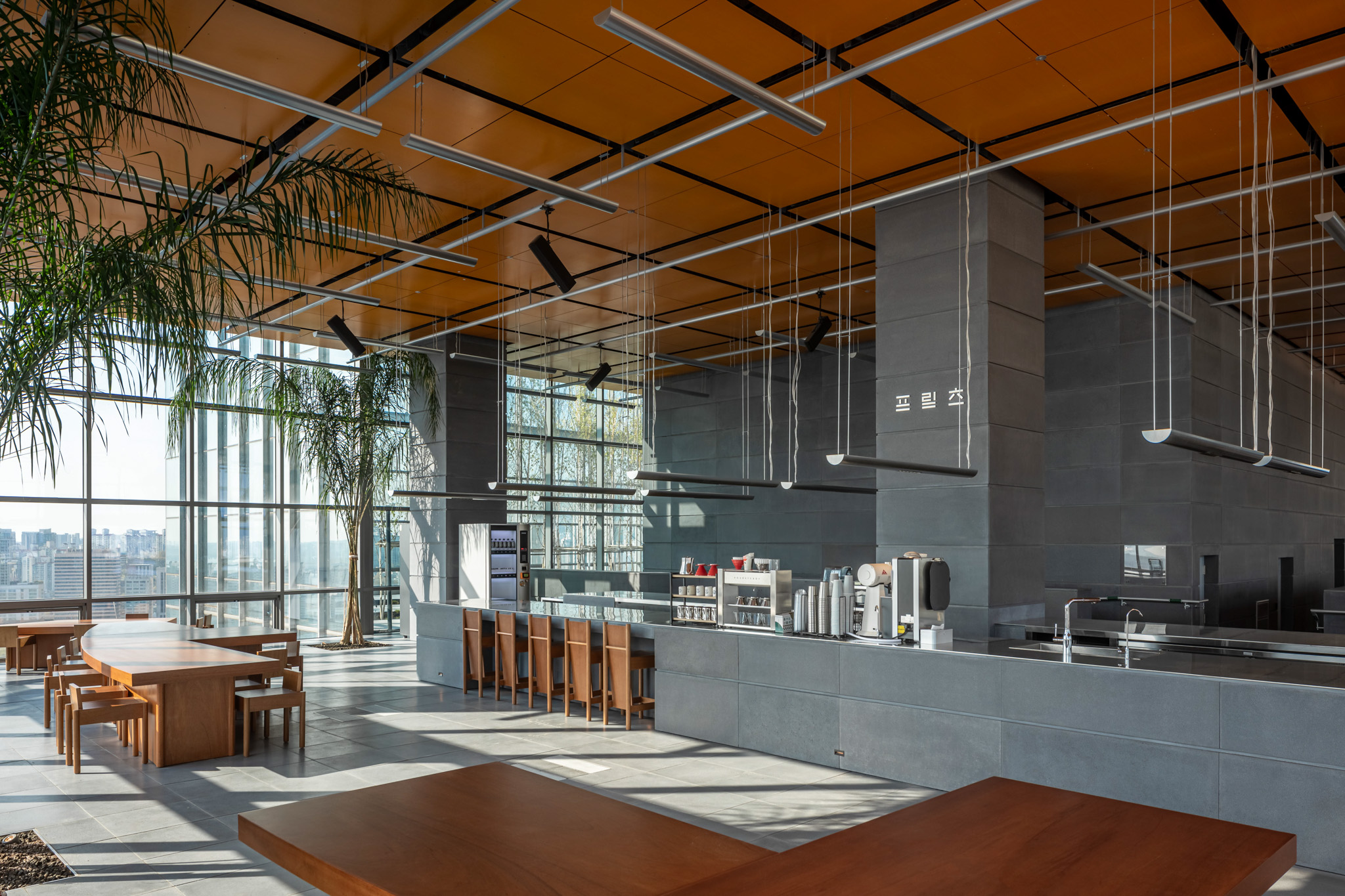 기존 건물이 뜬바닥 구조였고, 대부분의 설비가 하부에 몰려 있었던 탓에 자연스럽게 천장에 집중했습니다. 오피스에 필요한 기본적인 인프라들을 천장에서부터 끌고 내려오는 방식을 적용해 자유로운 평면이 가능하도록 했습니다. 고정된 파티션 대신 가변적인 모빌랙이 들어선 오피스 공간은 그리드 시스템 위에서 미리 계획된 시나리오를 바탕으로 구역화됩니다. 천장에 설치된 구조물에 문과 벽을 달아 간이 회의실을 갖출 수도 있습니다. 그리드 체계를 따른 각각의 블록에 위요감이 생기도록, 용도가 명확한 업무 공간에는 양 측면으로 간접등을 설치한 아치형 천장을 구성했고, 통로 공간에는 이동 소음을 줄여주는 흡음재를 사용해 천장을 구성했습니다. 마감재의 연결 구조, 조명 트레이, 소방 시설 등이 서로 엮이는 하나의 구조체를 만든 셈입니다.