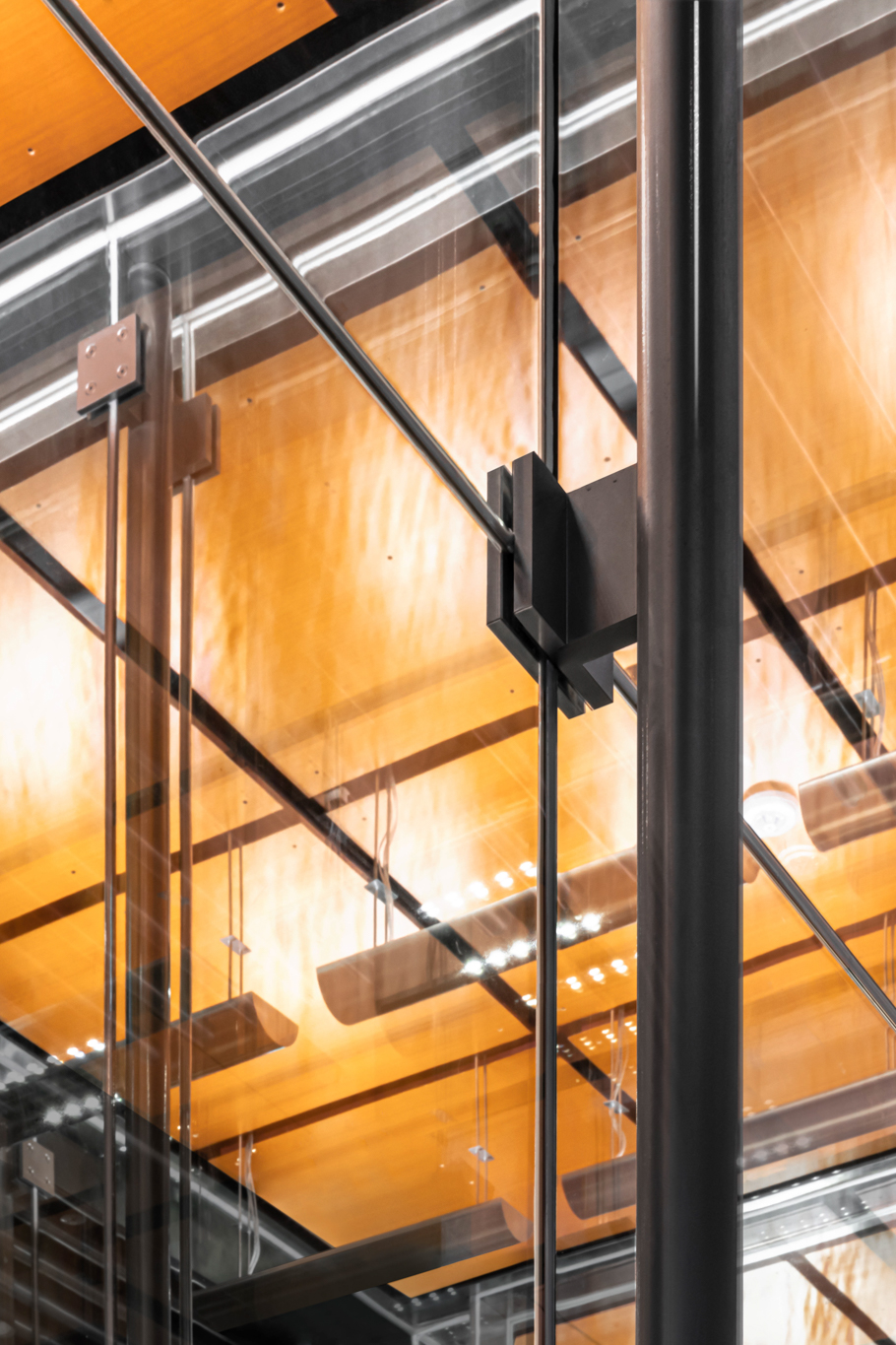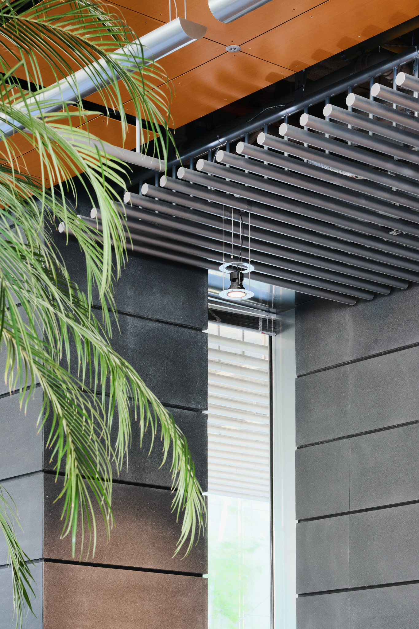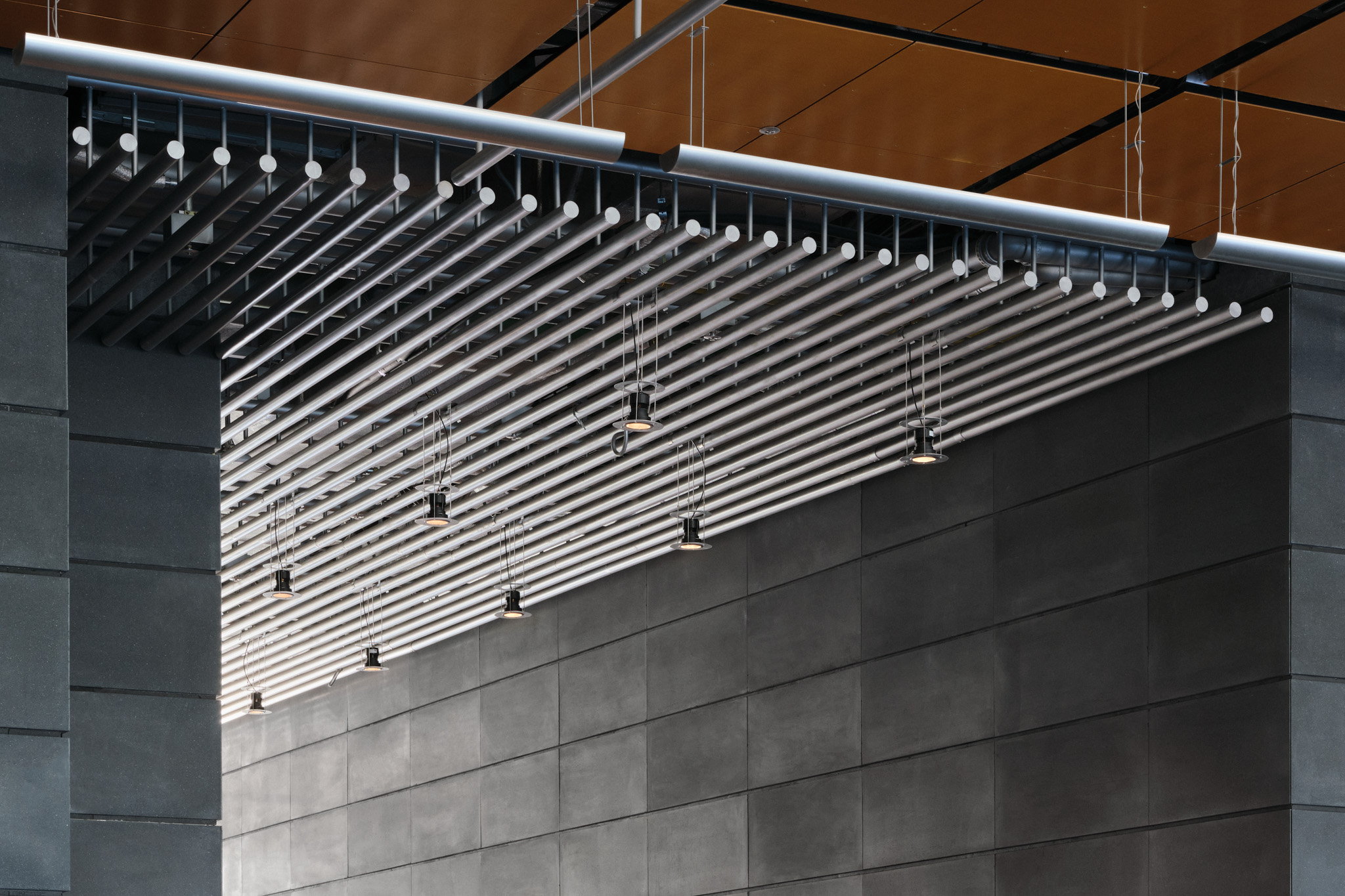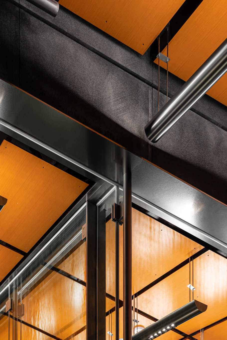기존 건물이 뜬바닥 구조였고, 대부분의 설비가 하부에 몰려 있었던 탓에 자연스럽게 천장에 집중했습니다. 오피스에 필요한 기본적인 인프라들을 천장에서부터 끌고 내려오는 방식을 적용해 자유로운 평면이 가능하도록 했습니다. 고정된 파티션 대신 가변적인 모빌랙이 들어선 오피스 공간은 그리드 시스템 위에서 미리 계획된 시나리오를 바탕으로 구역화됩니다. 천장에 설치된 구조물에 문과 벽을 달아 간이 회의실을 갖출 수도 있습니다. 그리드 체계를 따른 각각의 블록에 위요감이 생기도록, 용도가 명확한 업무 공간에는 양 측면으로 간접등을 설치한 아치형 천장을 구성했고, 통로 공간에는 이동 소음을 줄여주는 흡음재를 사용해 천장을 구성했습니다. 마감재의 연결 구조, 조명 트레이, 소방 시설 등이 서로 엮이는 하나의 구조체를 만든 셈입니다.