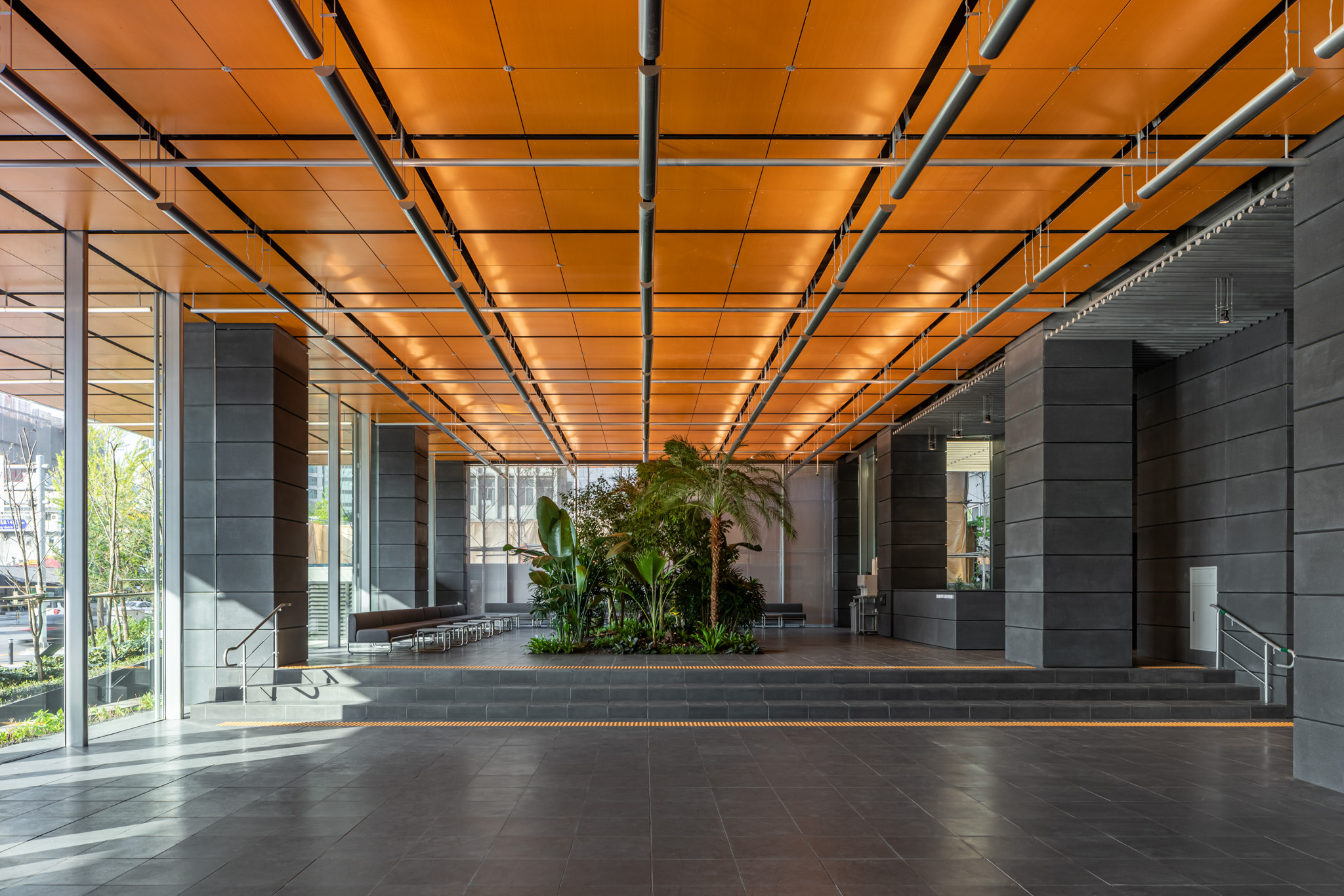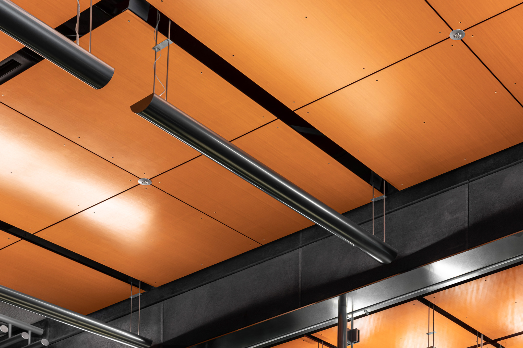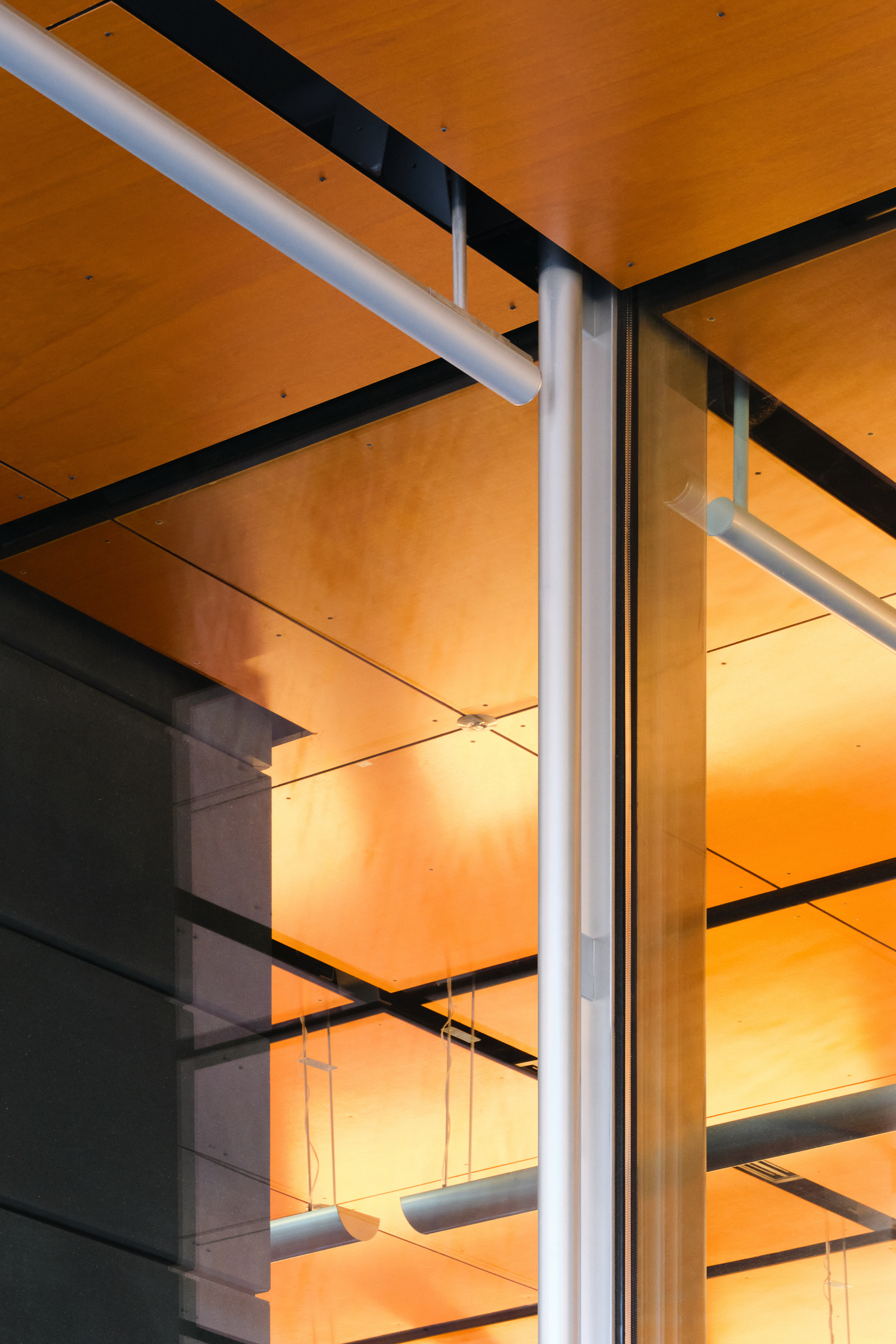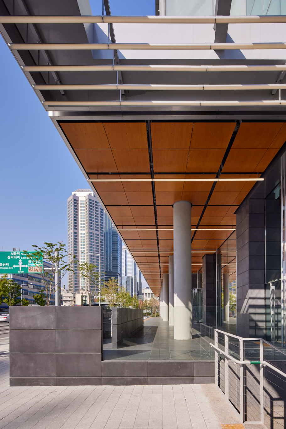 기존 건물이 뜬바닥 구조였고, 대부분의 설비가 하부에 몰려 있었던 탓에 자연스럽게 천장에 집중했습니다. 오피스에 필요한 기본적인 인프라들을 천장에서부터 끌고 내려오는 방식을 적용해 자유로운 평면이 가능하도록 했습니다. 고정된 파티션 대신 가변적인 모빌랙이 들어선 오피스 공간은 그리드 시스템 위에서 미리 계획된 시나리오를 바탕으로 구역화됩니다. 천장에 설치된 구조물에 문과 벽을 달아 간이 회의실을 갖출 수도 있습니다. 그리드 체계를 따른 각각의 블록에 위요감이 생기도록, 용도가 명확한 업무 공간에는 양 측면으로 간접등을 설치한 아치형 천장을 구성했고, 통로 공간에는 이동 소음을 줄여주는 흡음재를 사용해 천장을 구성했습니다. 마감재의 연결 구조, 조명 트레이, 소방 시설 등이 서로 엮이는 하나의 구조체를 만든 셈입니다.