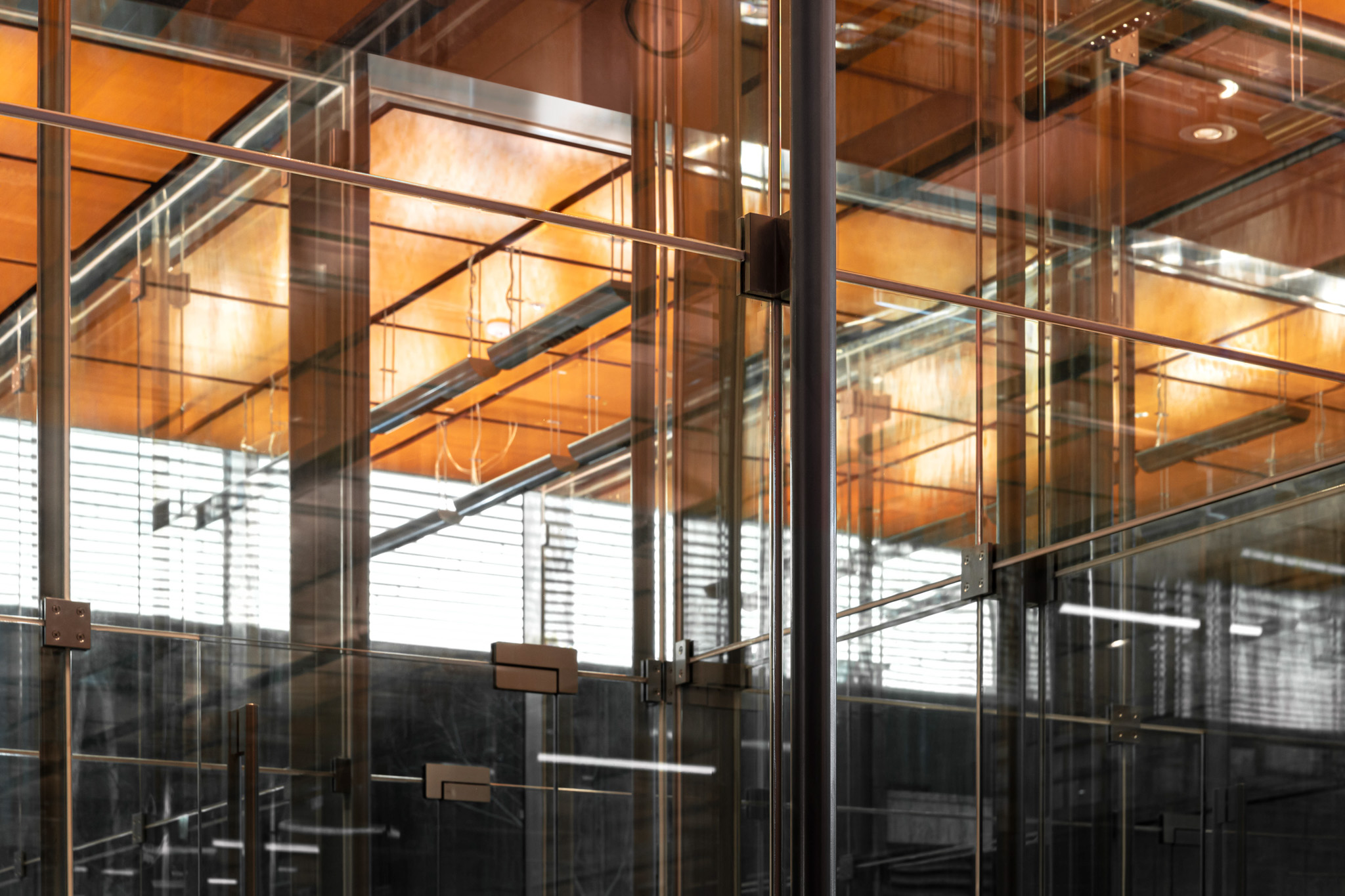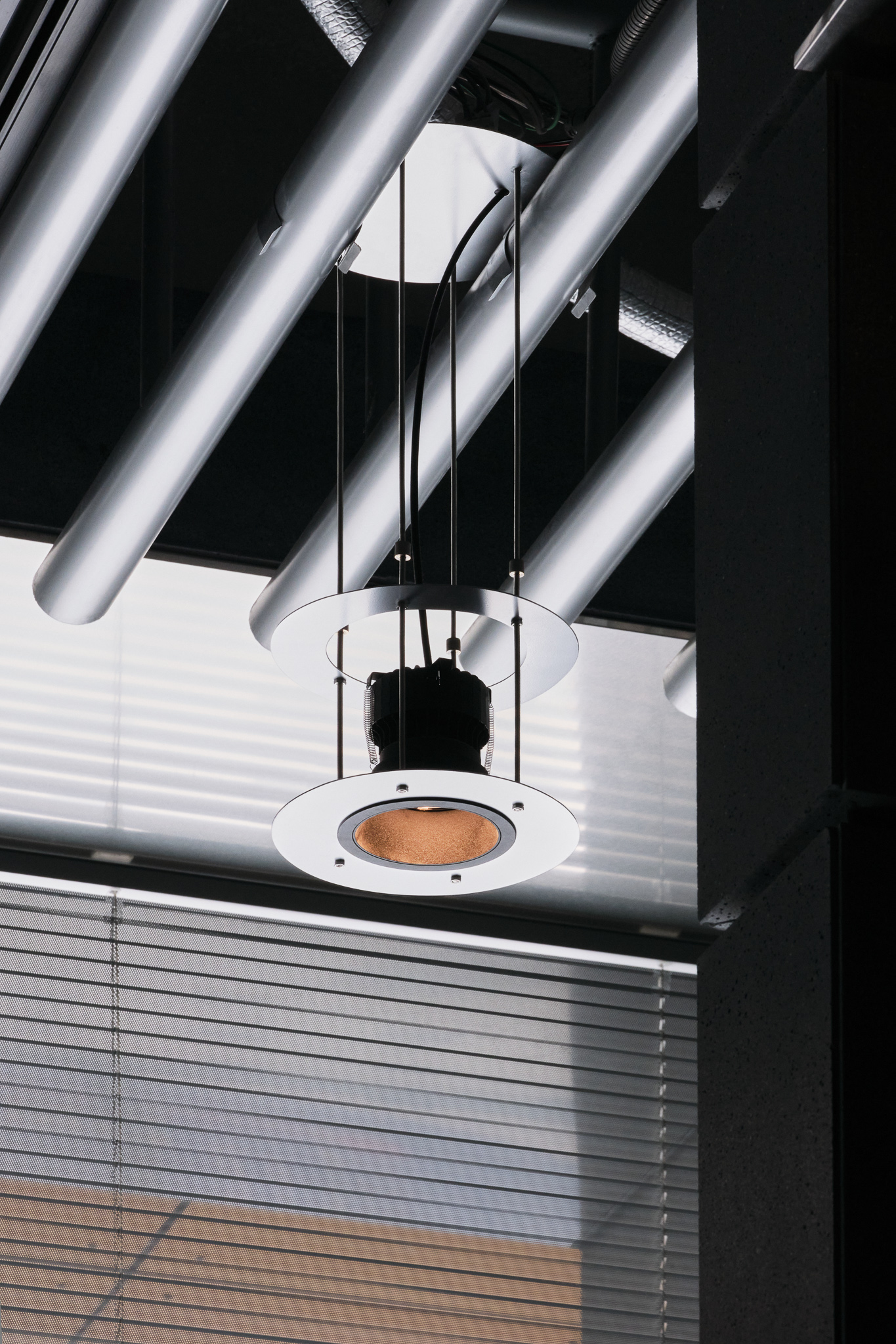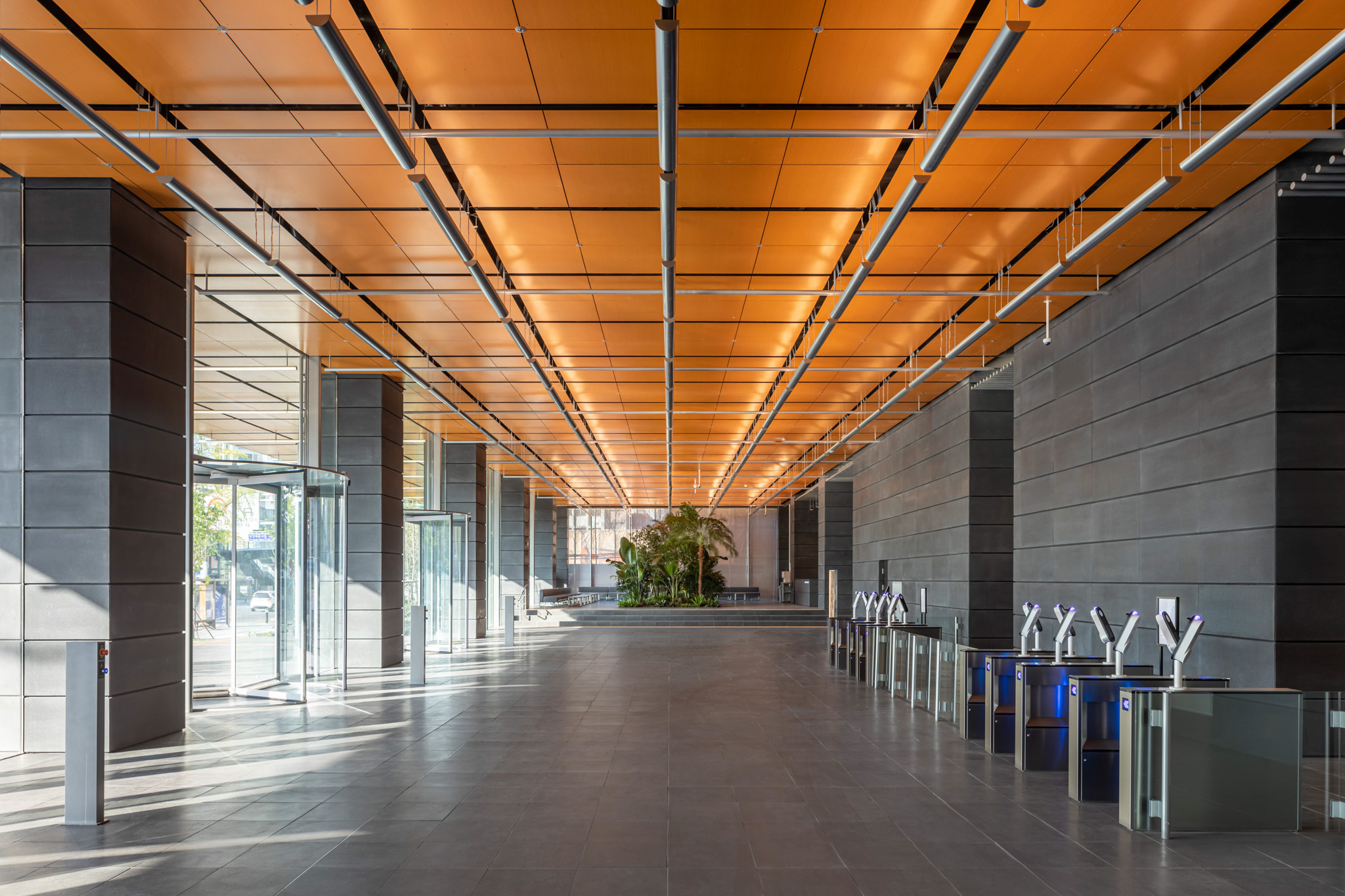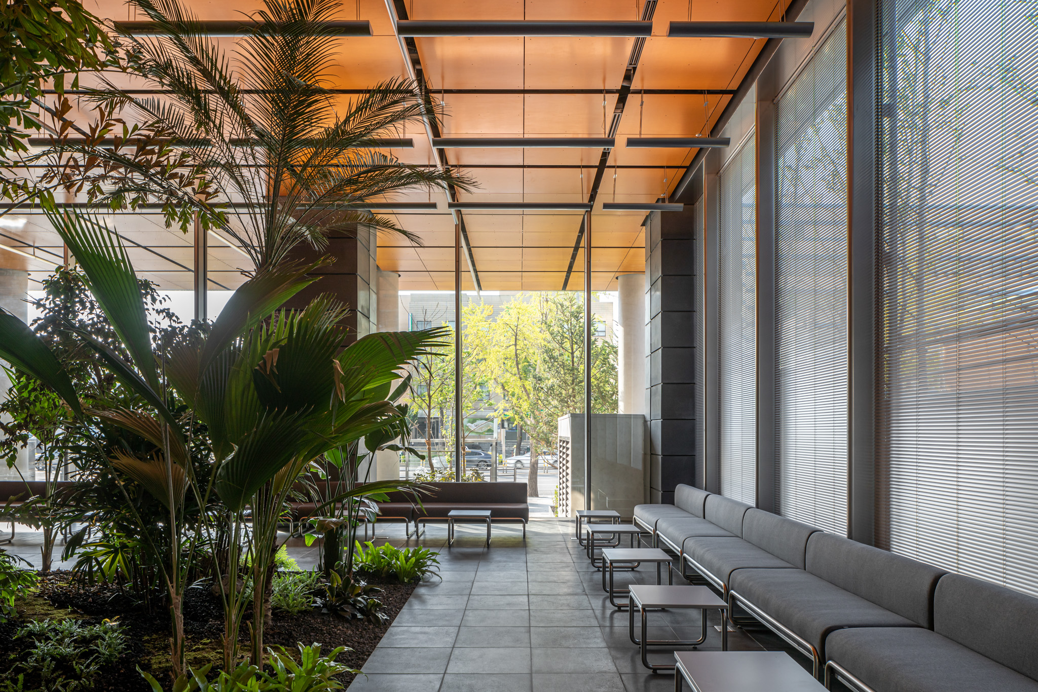 기존 건물이 뜬바닥 구조였고, 대부분의 설비가 하부에 몰려 있었던 탓에 자연스럽게 천장에 집중했습니다. 오피스에 필요한 기본적인 인프라들을 천장에서부터 끌고 내려오는 방식을 적용해 자유로운 평면이 가능하도록 했습니다. 고정된 파티션 대신 가변적인 모빌랙이 들어선 오피스 공간은 그리드 시스템 위에서 미리 계획된 시나리오를 바탕으로 구역화됩니다. 천장에 설치된 구조물에 문과 벽을 달아 간이 회의실을 갖출 수도 있습니다. 그리드 체계를 따른 각각의 블록에 위요감이 생기도록, 용도가 명확한 업무 공간에는 양 측면으로 간접등을 설치한 아치형 천장을 구성했고, 통로 공간에는 이동 소음을 줄여주는 흡음재를 사용해 천장을 구성했습니다. 마감재의 연결 구조, 조명 트레이, 소방 시설 등이 서로 엮이는 하나의 구조체를 만든 셈입니다.