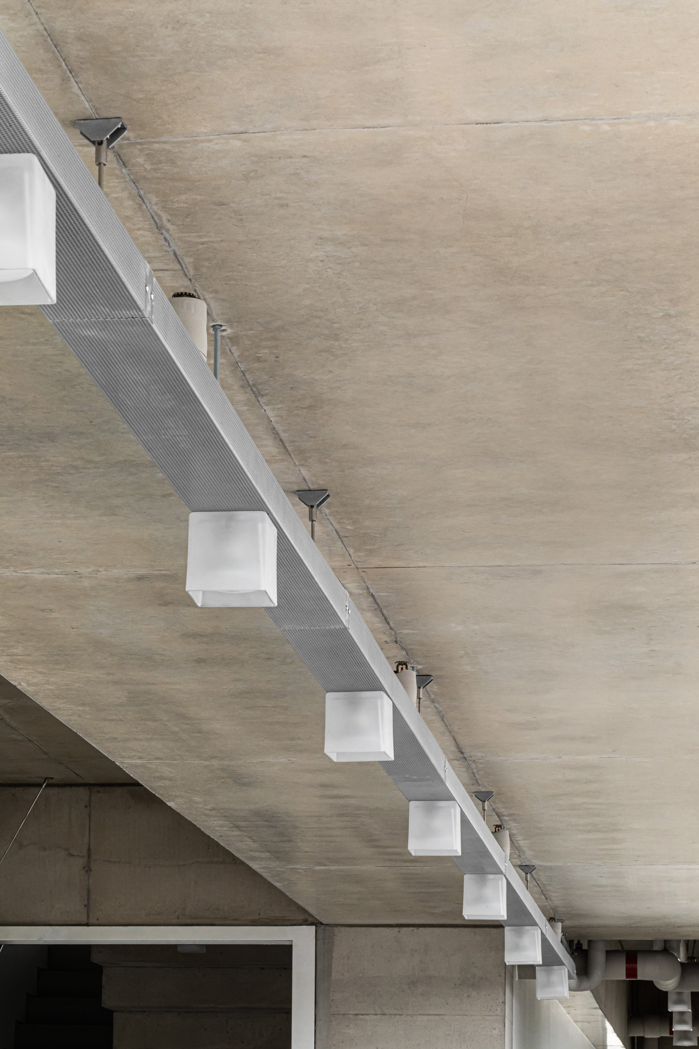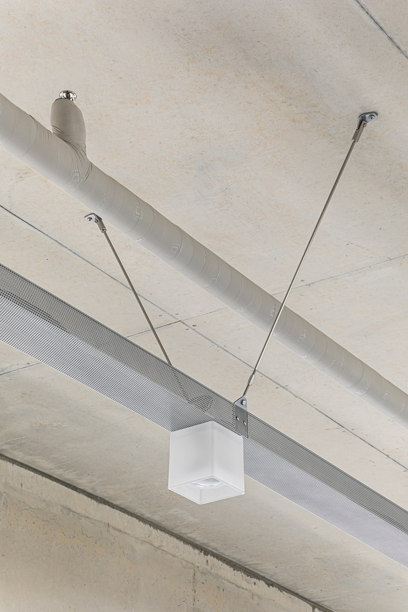 위치별로 조명이 모두 다른 모습을 하기보다는 각 구역을 하나로 묶어주는 통일된 형태였으면 했기에, 광원부의 형태는 유지한 채 설치 구조 부분에만 변화를 줬습니다. 또한, 직접적으로 광원이 드러나 업무 중 눈부심을 유발하지 않도록 반투명 유리갓을 제작해 일괄적으로 씌웠습니다. 유리갓은 금형을 떠서 주물 방식으로 제작했습니다.