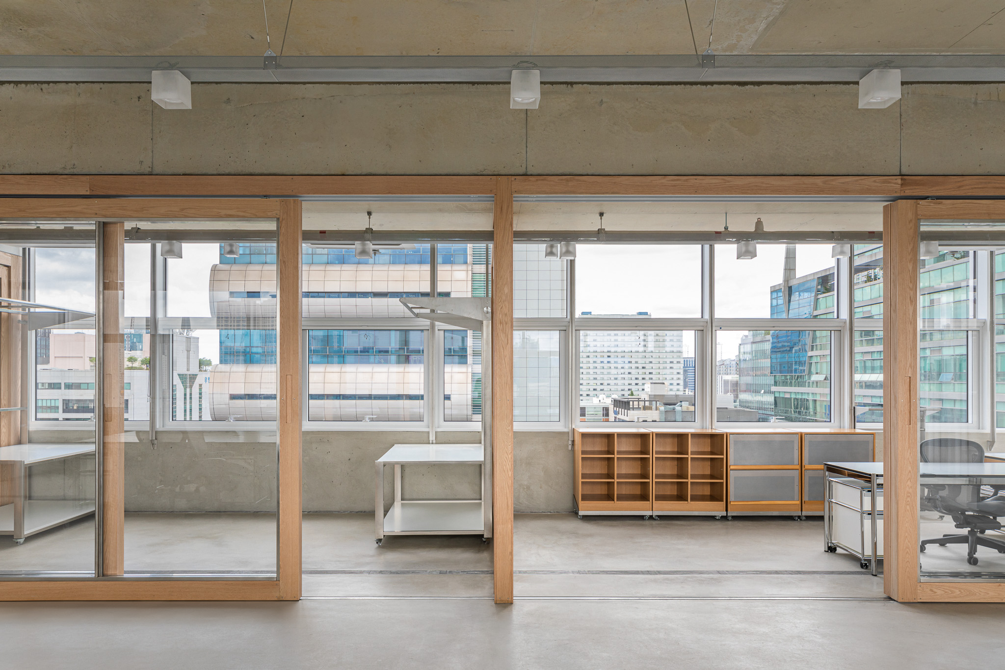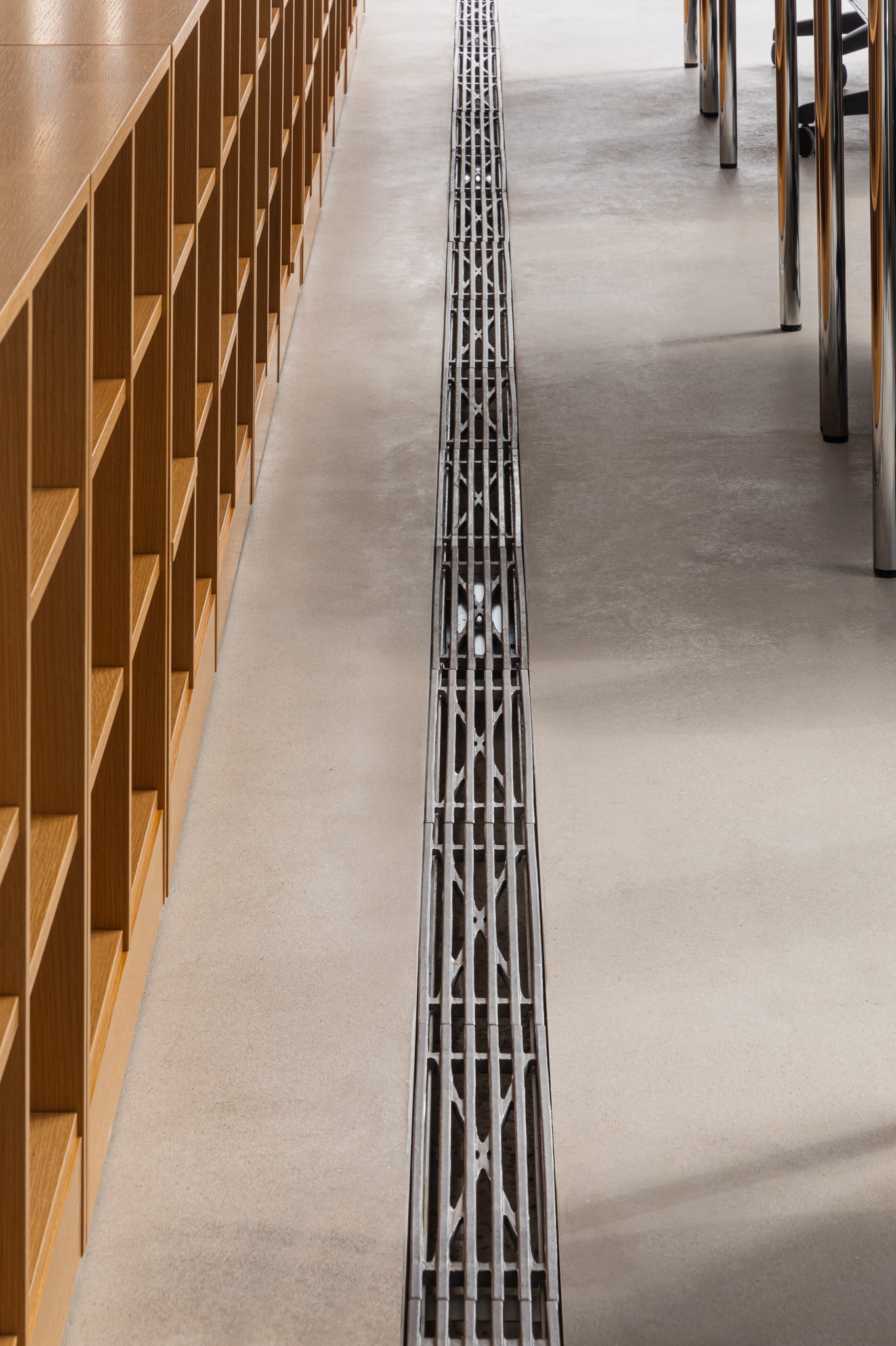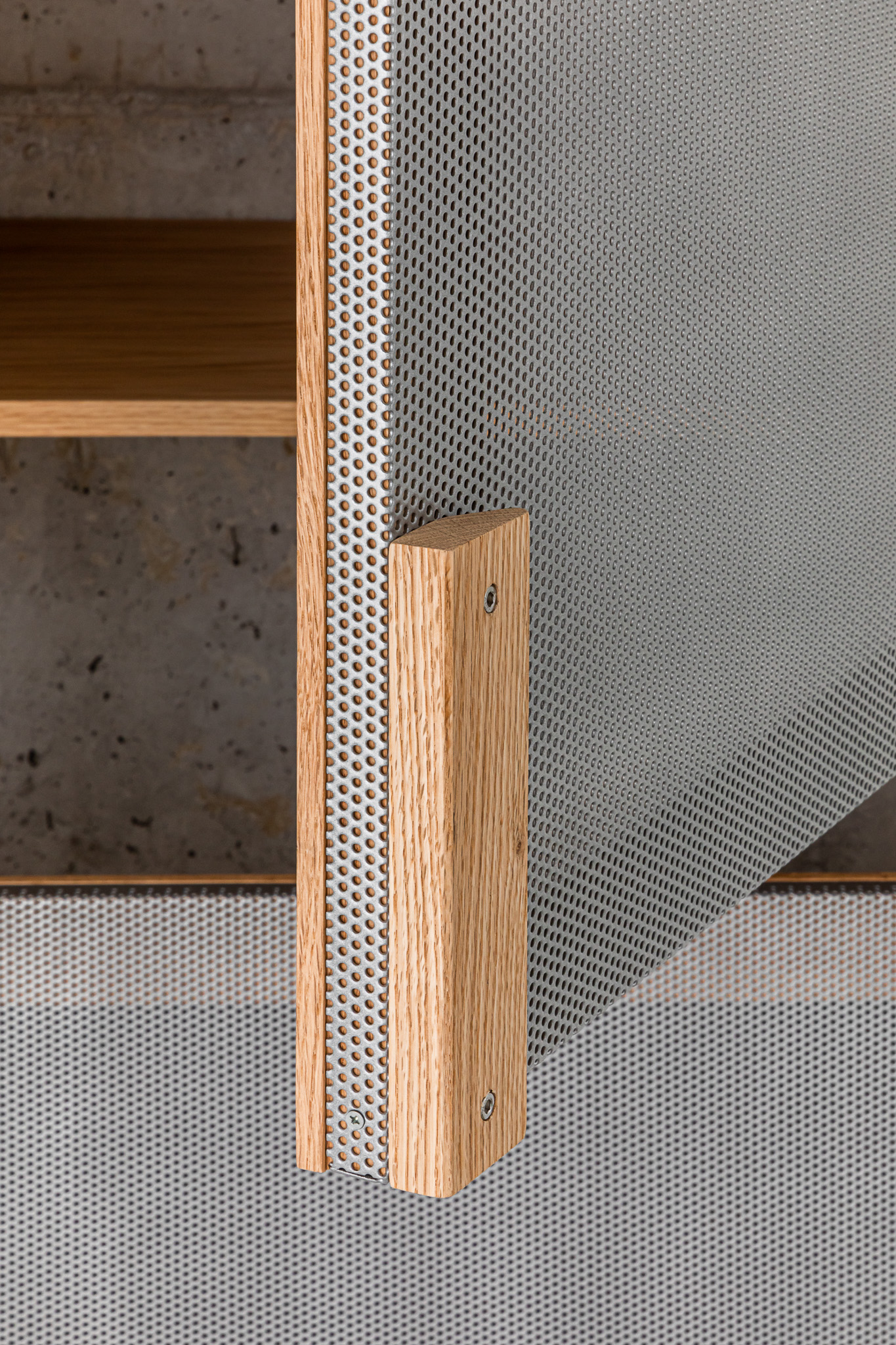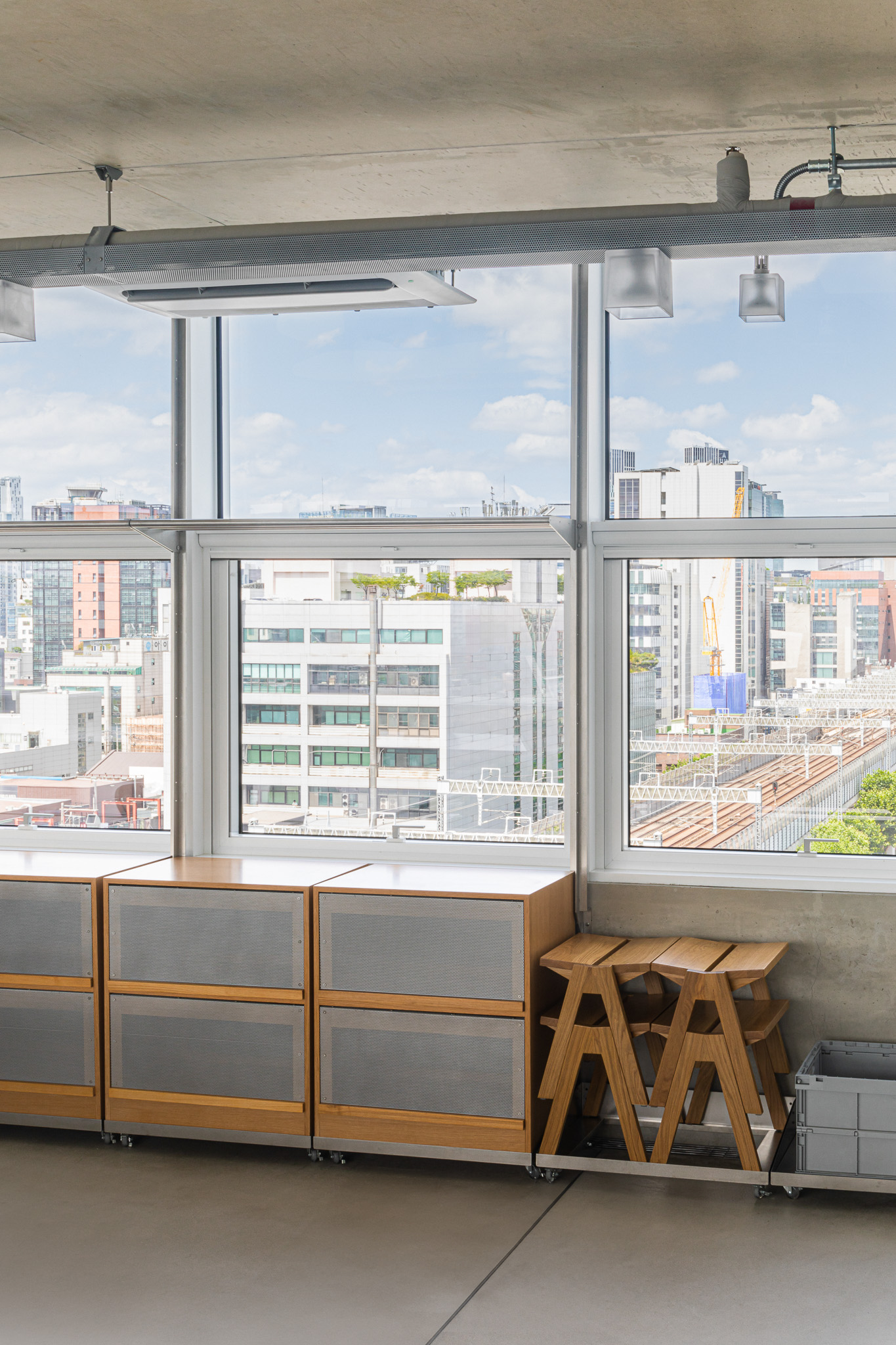 하나의 옷이 만들어지기까지 층별 다양한 부서의 협업이 이뤄집니다. 무엇보다 효율적이며 원활한 이동을 위해 가구 시스템의 모든 집기는 낮은 높이로 설계하고 캐스터를 부착했습니다. 수직 구조 최상단에는 구조와 창호 사이에 알루미늄 수평 블라인드를 설치했습니다. 1,500mm 간격의 블라인드와 블라인드 사이의 유격, 블라인드 조절용 손잡이를 수직 구조가 가려주어 정돈된 인상을 만듭니다.