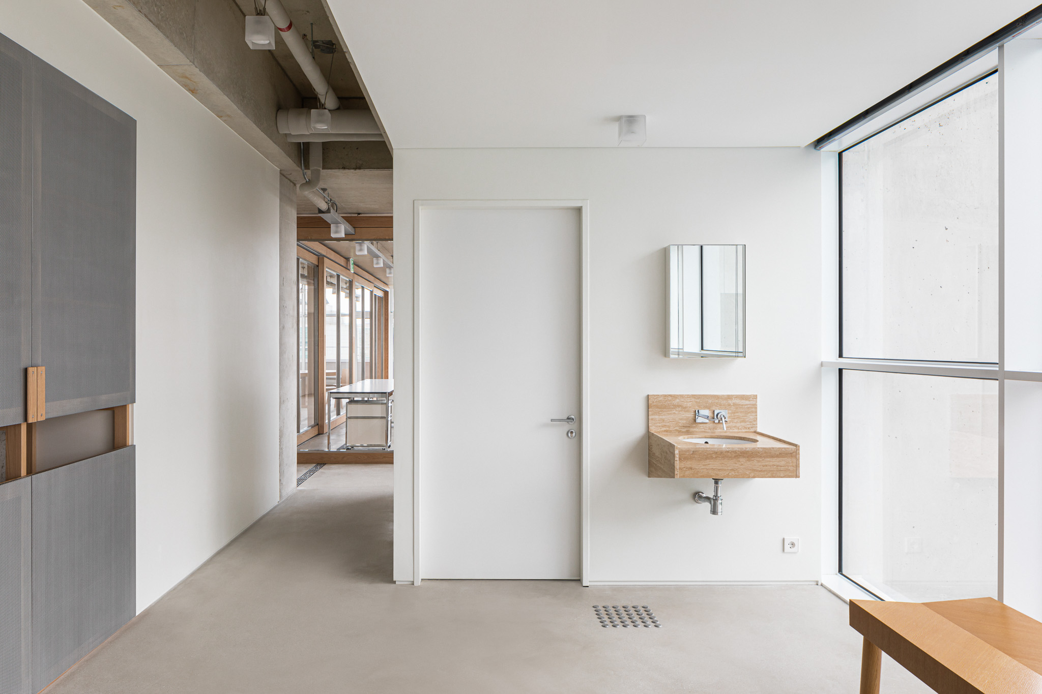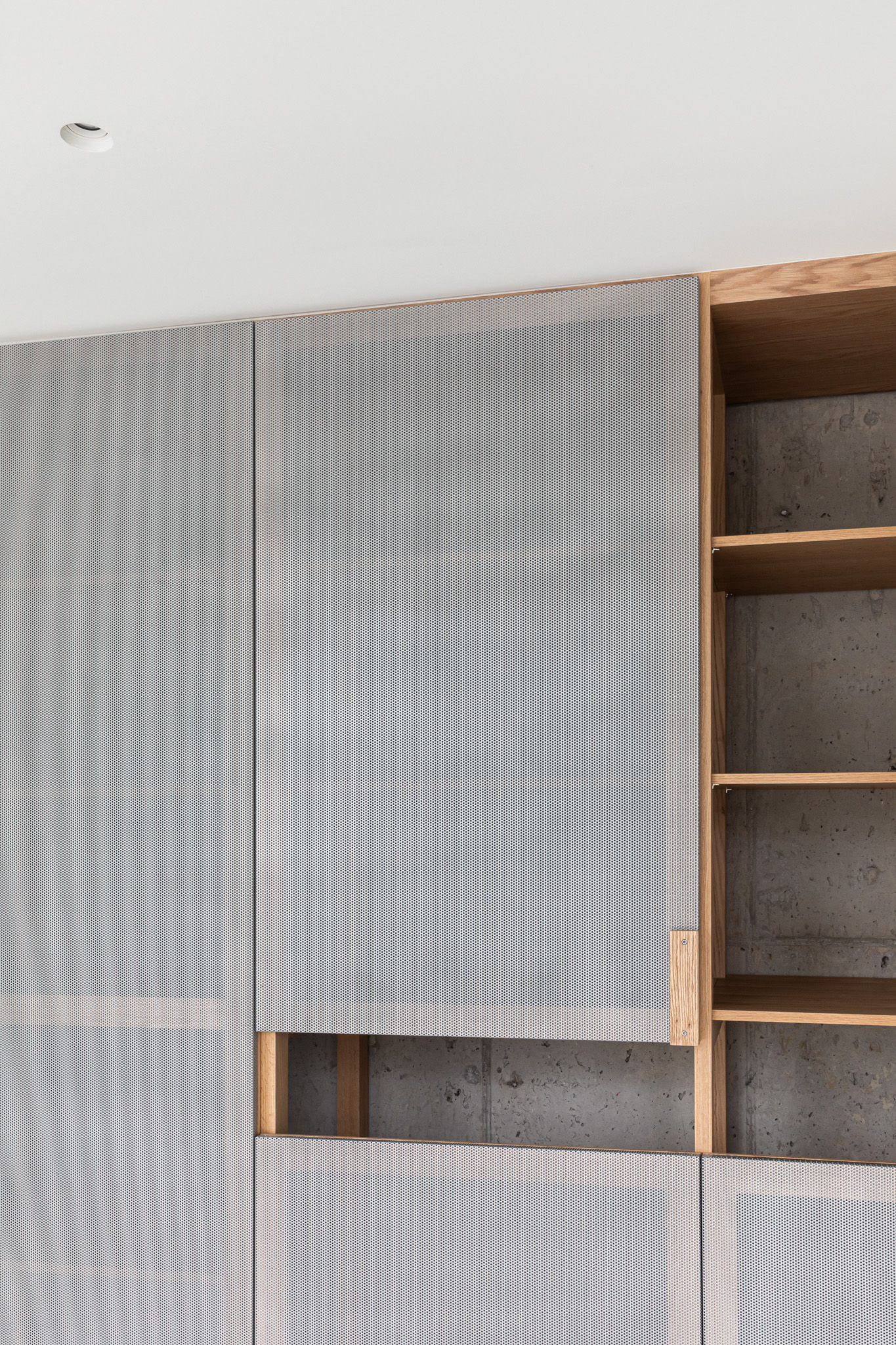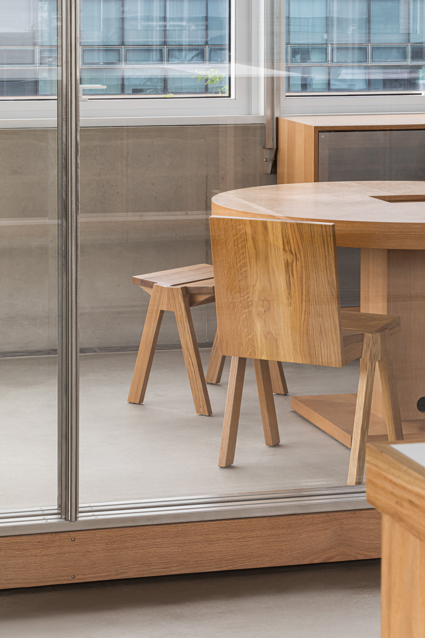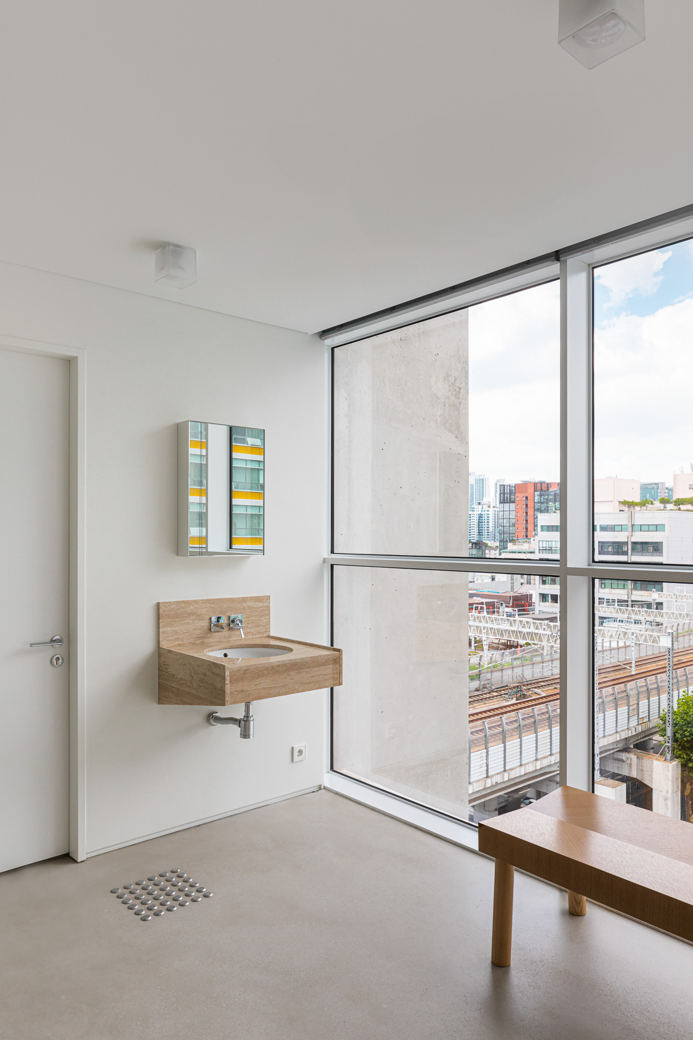 하나의 옷이 만들어지기까지 층별 다양한 부서의 협업이 이뤄집니다. 무엇보다 효율적이며 원활한 이동을 위해 가구 시스템의 모든 집기는 낮은 높이로 설계하고 캐스터를 부착했습니다. 수직 구조 최상단에는 구조와 창호 사이에 알루미늄 수평 블라인드를 설치했습니다. 1,500mm 간격의 블라인드와 블라인드 사이의 유격, 블라인드 조절용 손잡이를 수직 구조가 가려주어 정돈된 인상을 만듭니다.