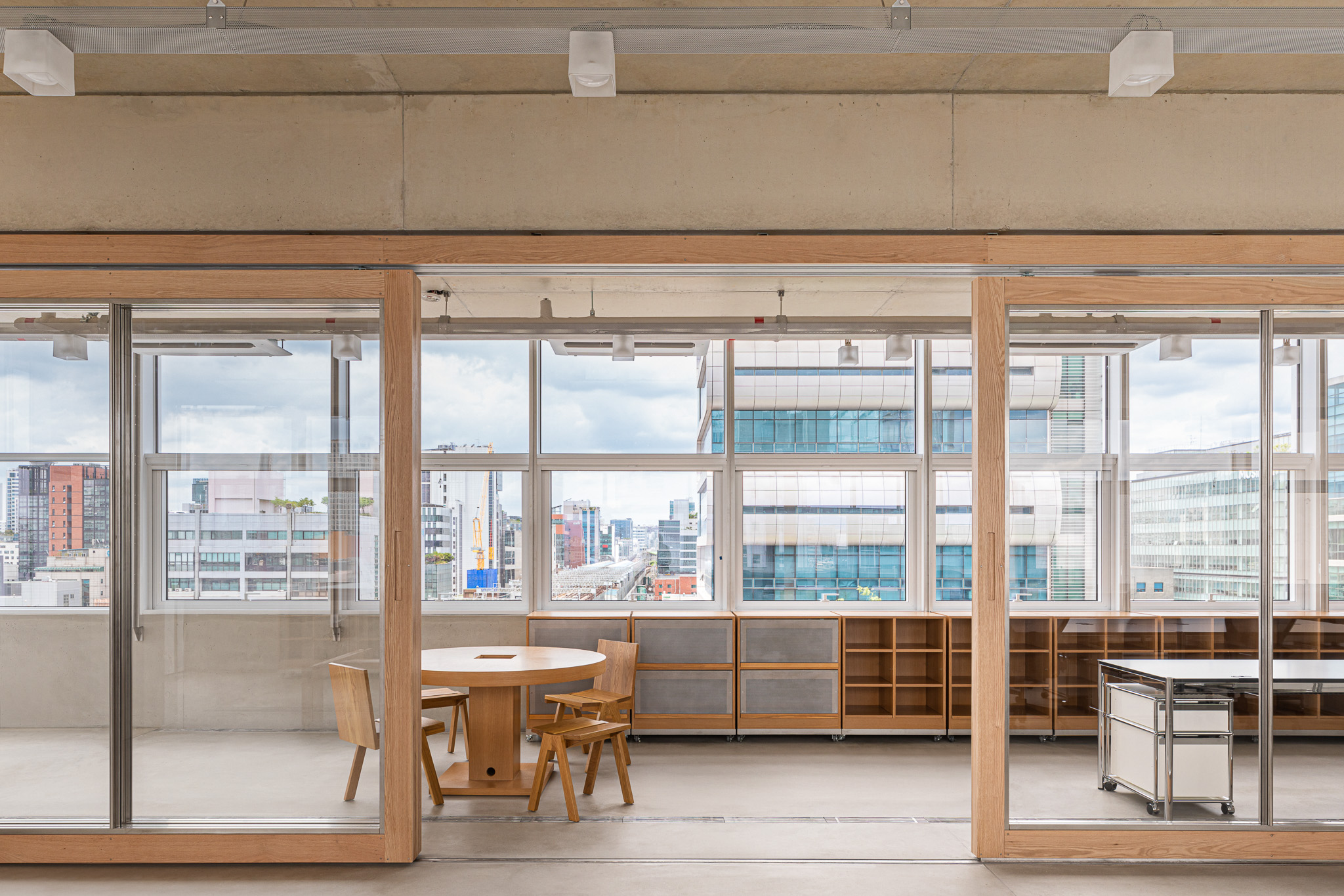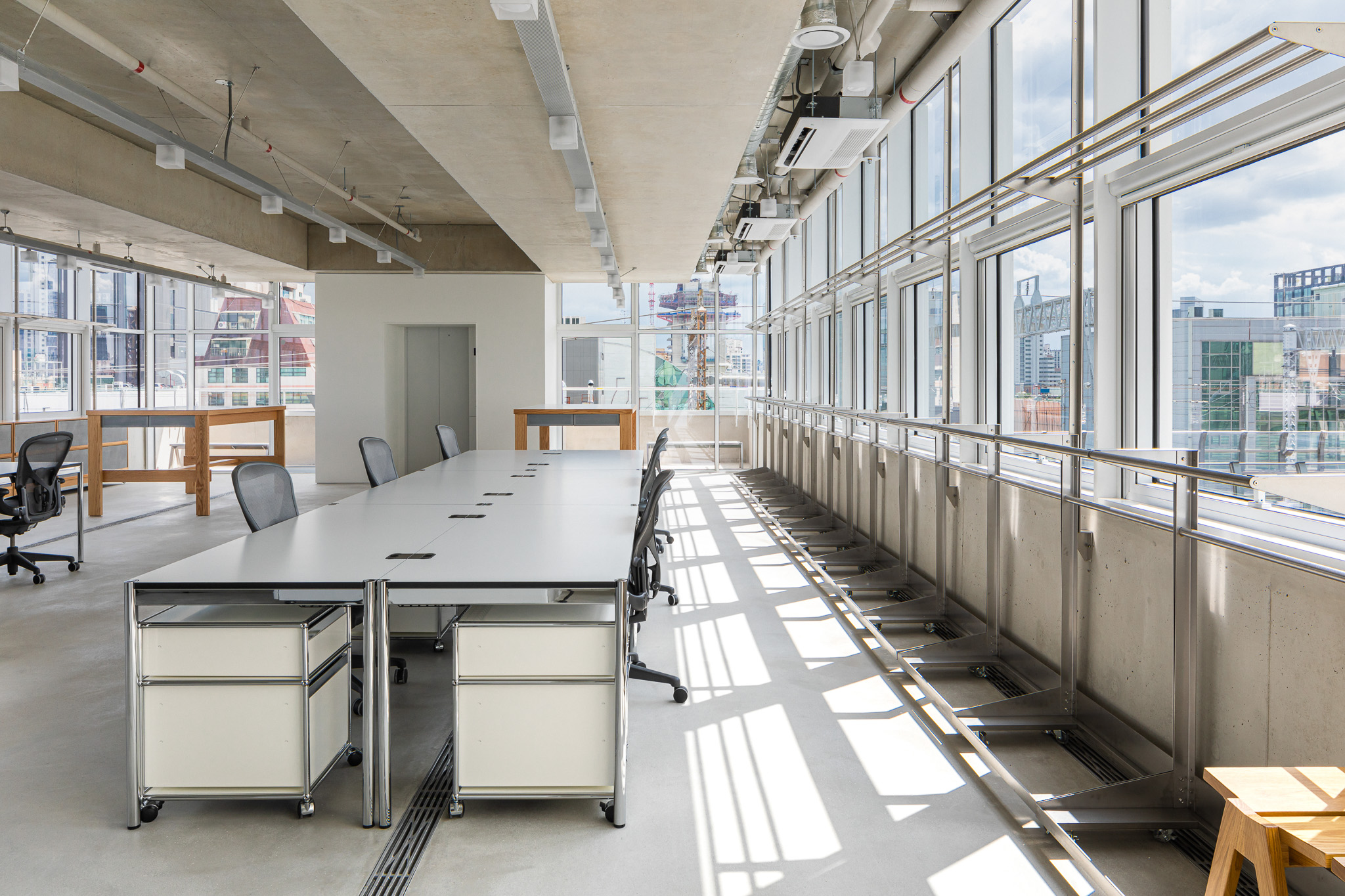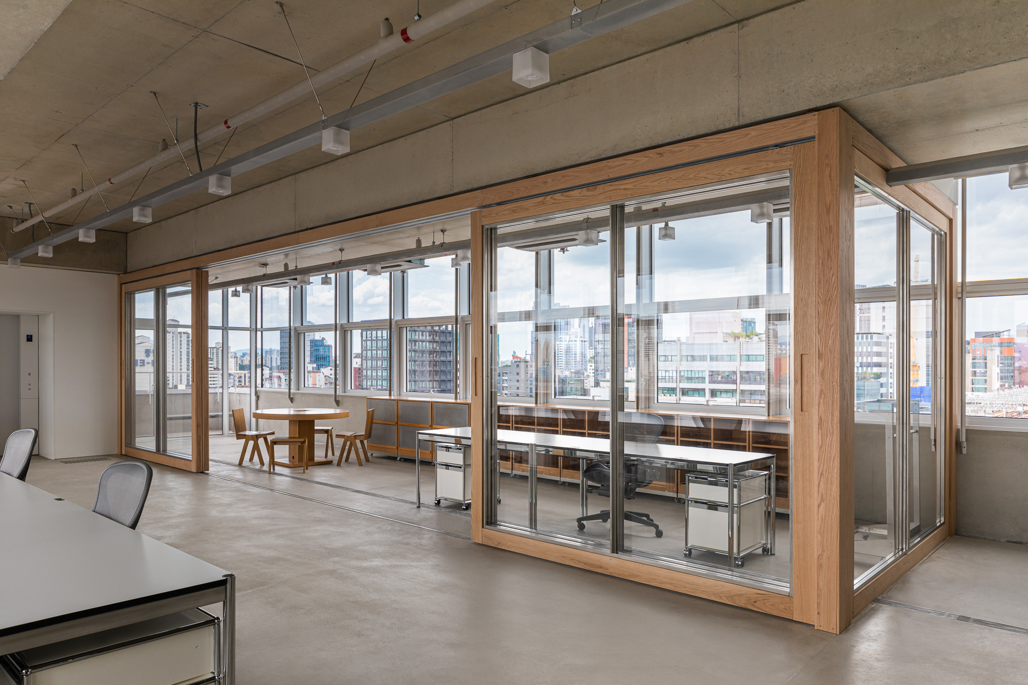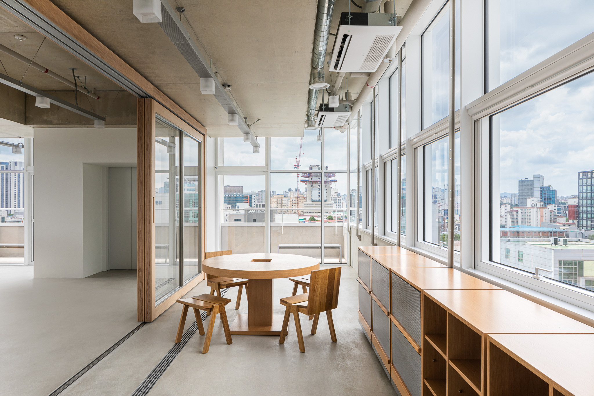 창립 이래 가파른 성장을 보이며 직원 수도 매년 늘고 있는 JKND의 오피스 레이아웃은 폐쇄적이고 경직적인 기존 오피스 구성과는 달라야 합니다. 인원의 충원과 이동이 원활하게 이뤄지려면 가구 배치를 자유롭게 바꿀 수 있는 공간이어야 한다는 판단으로, 어느 위치에서든 전열과 통신을 끌어 쓸 수 있는 플로어 트렌치를 고안했습니다. 또한, 공간을 구획하는 벽체를 배치하지 않음으로써 건축적 특징인 사방으로 넓게 트인 창호의 개방감을 유지했습니다.