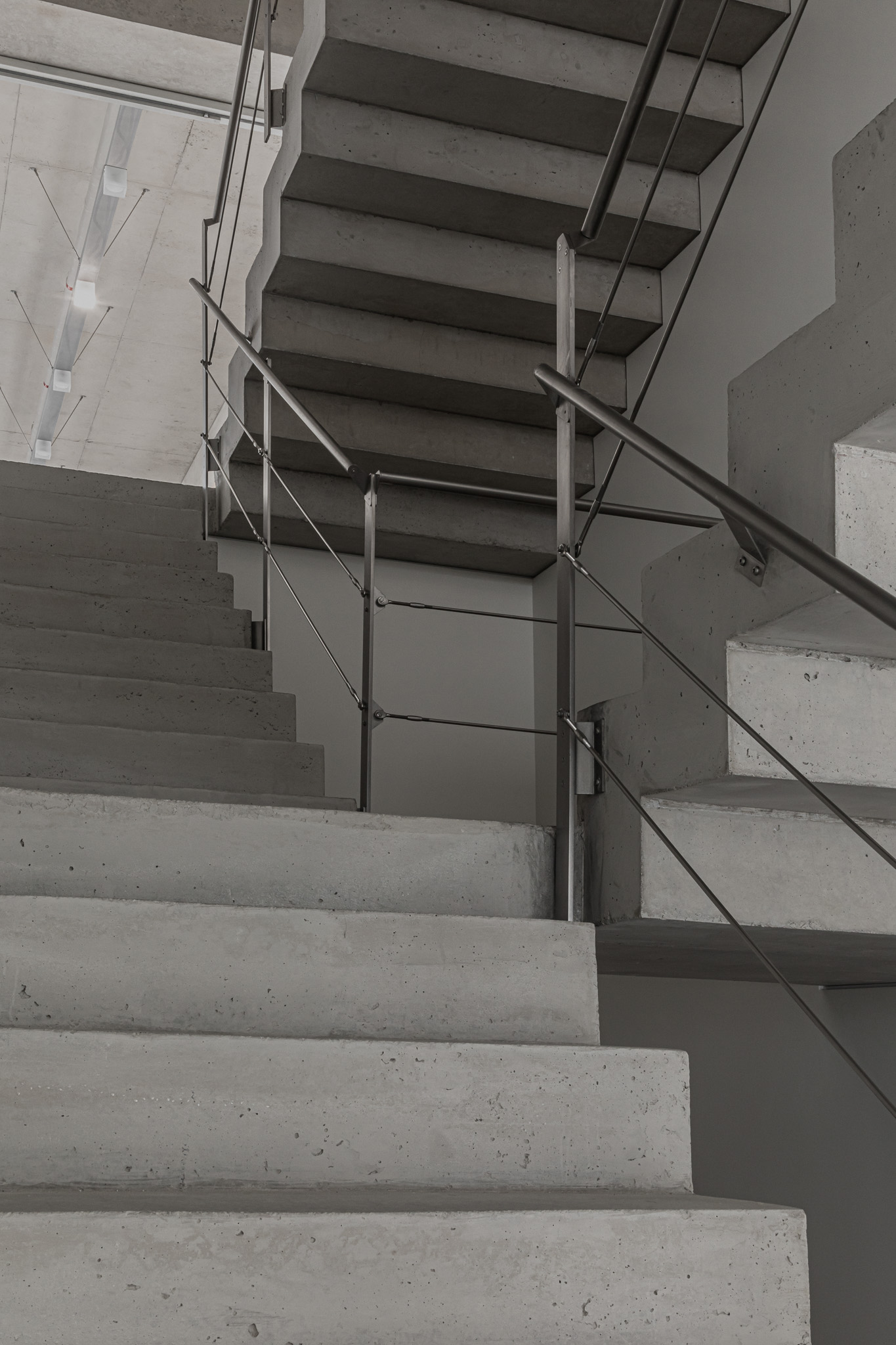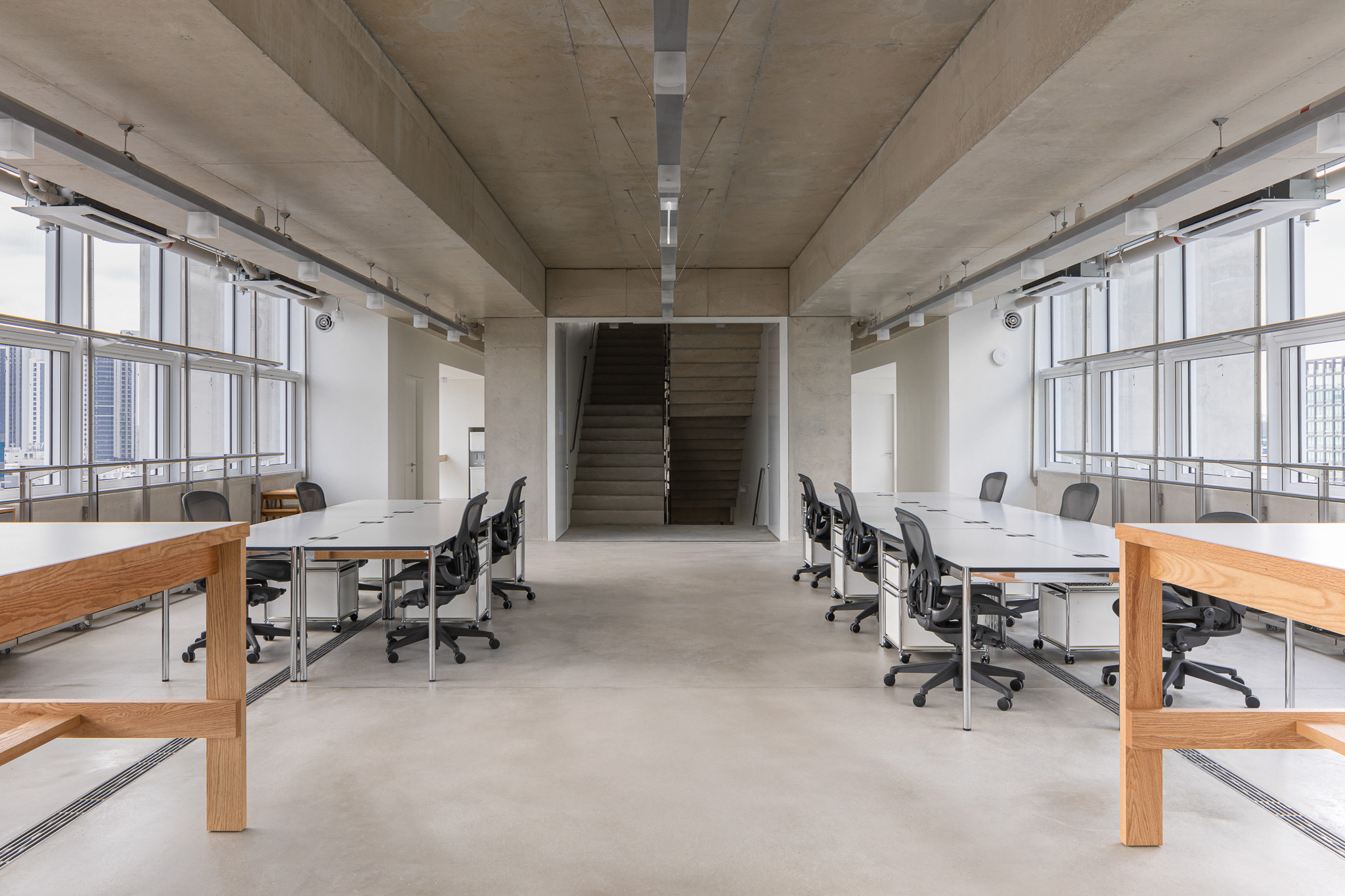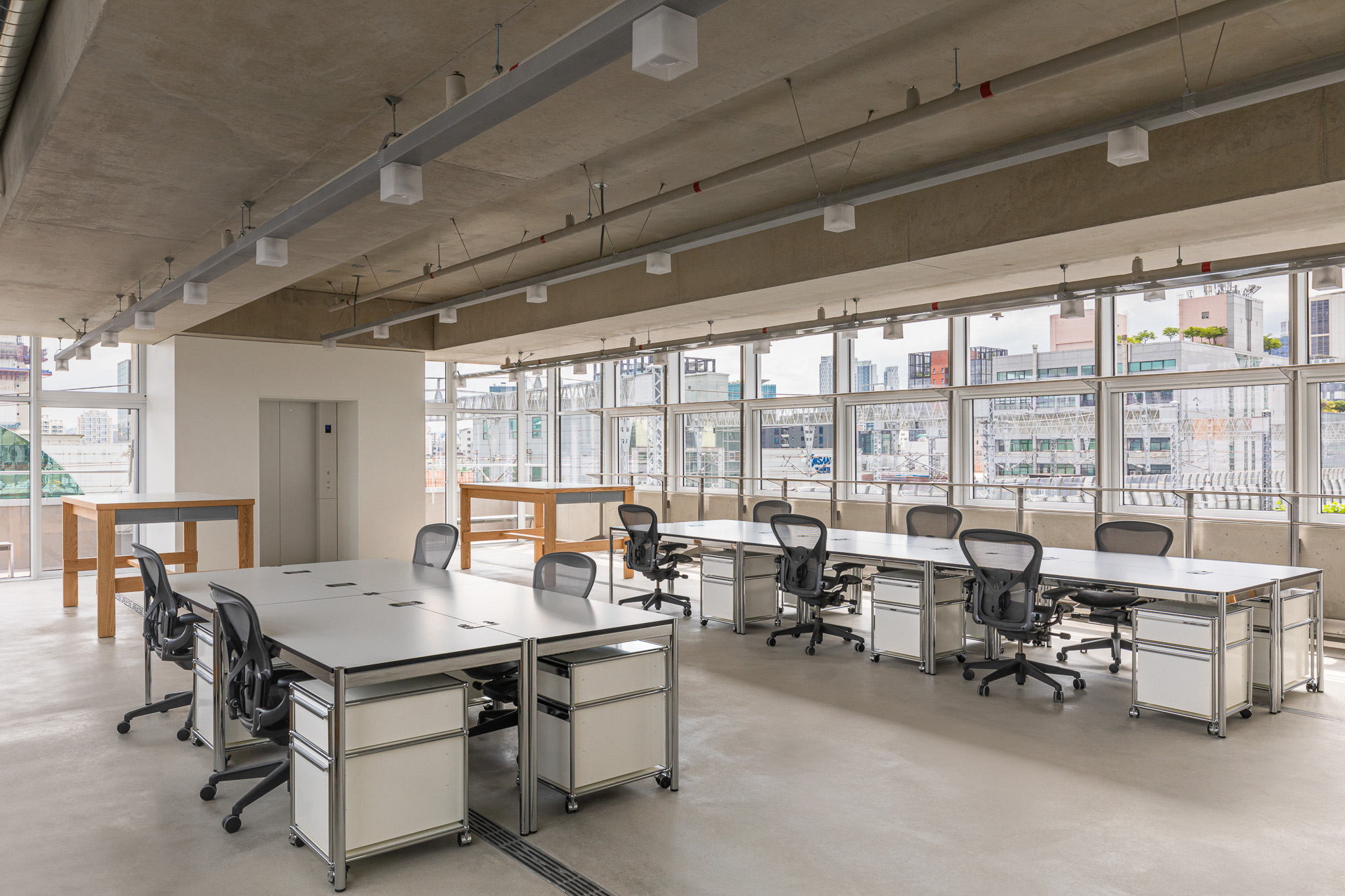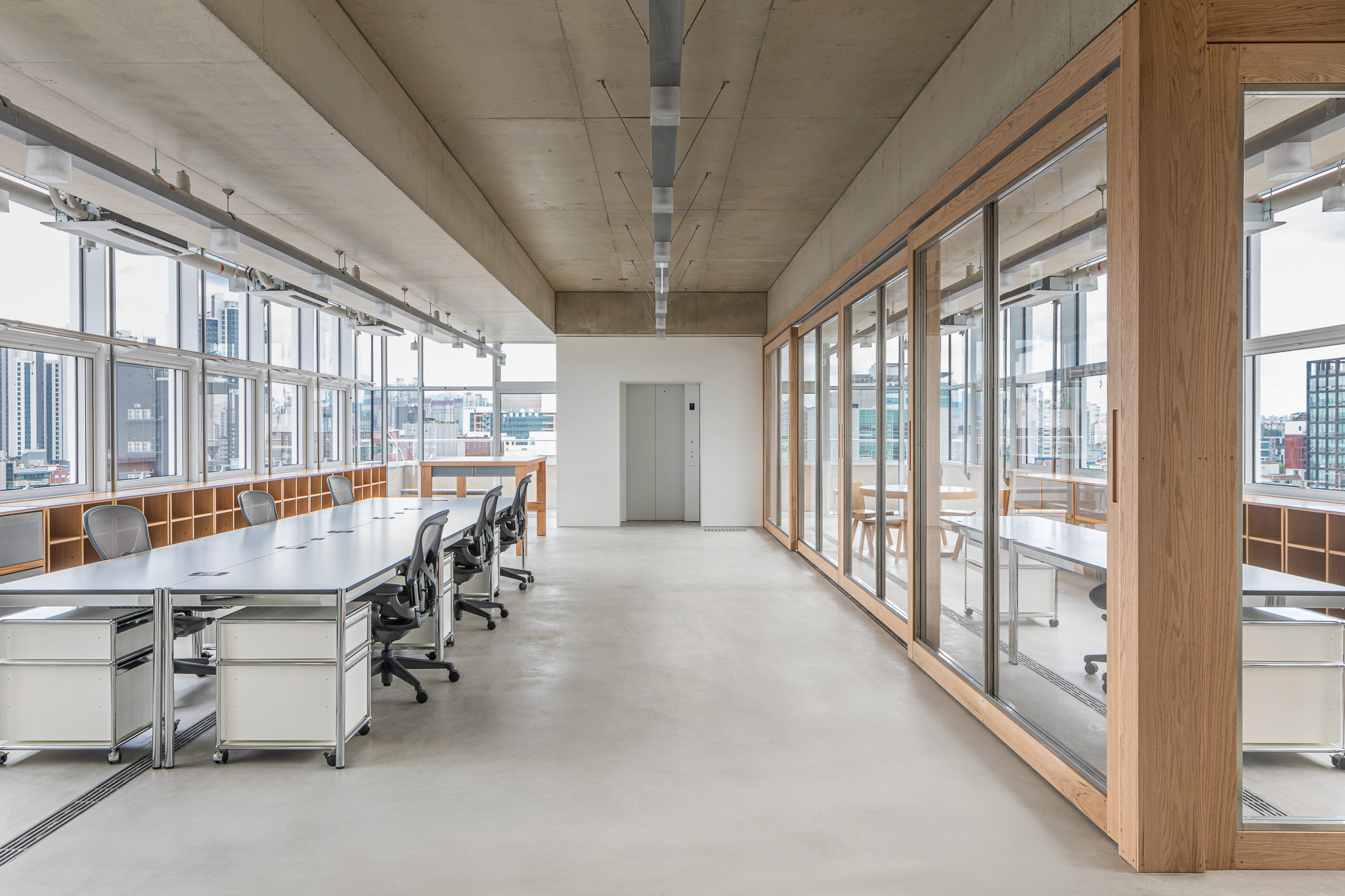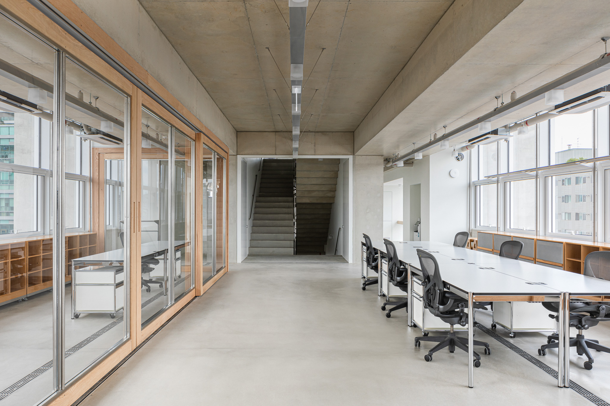 사옥은 층별로 지하 2층 전시 및 팝업 공간, 지하 1층 F&B, 1층 로비, 2~3층 매장, 4~9층 오피스, 10층 포토 스튜디오와 라운지로 구성됩니다. 이 건물의 주요 특징 중 하나는 5~10층에 구현된 효율적인 층간 연결 시스템입니다. 건물 한가운데를 관통하며 양측 공간을 가르는 중앙 계단은 X자 형태로 구성되어 어느 방향에서든 수직 이동이 자유로운, 업무 공간의 핵심 동선입니다. 건물 양 끝단에 배치된 엘리베이터는 멀리 떨어진 층 간의 수직 동선을 추가 제공함으로써 업무 환경의 효율성을 극대화합니다. 한편, 이와 같은 중앙 계단과 엘리베이터 실을 이루는 구조는 건축물 전체를 지지하는 수직 구조로 설계되었으며, 이를 연결하는 육중한 넓이의 보가 건물 내부에 기둥이 없는 열린 업무 환경을 조성하고 있습니다. 이러한 건축의 주요한 특징들이 인테리어 설계의 중요한 출발점이 되었습니다.