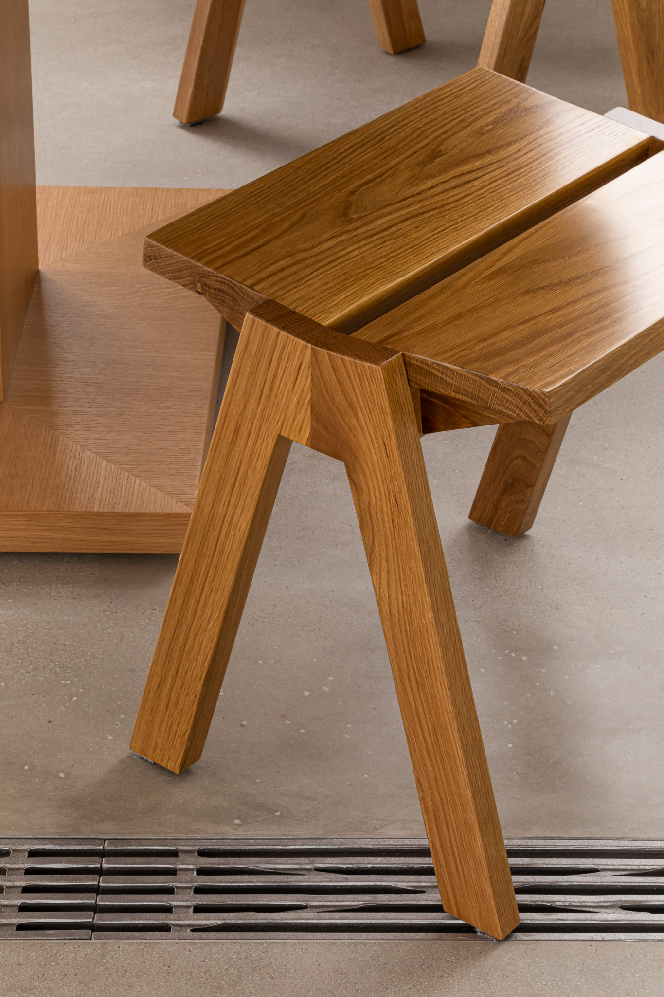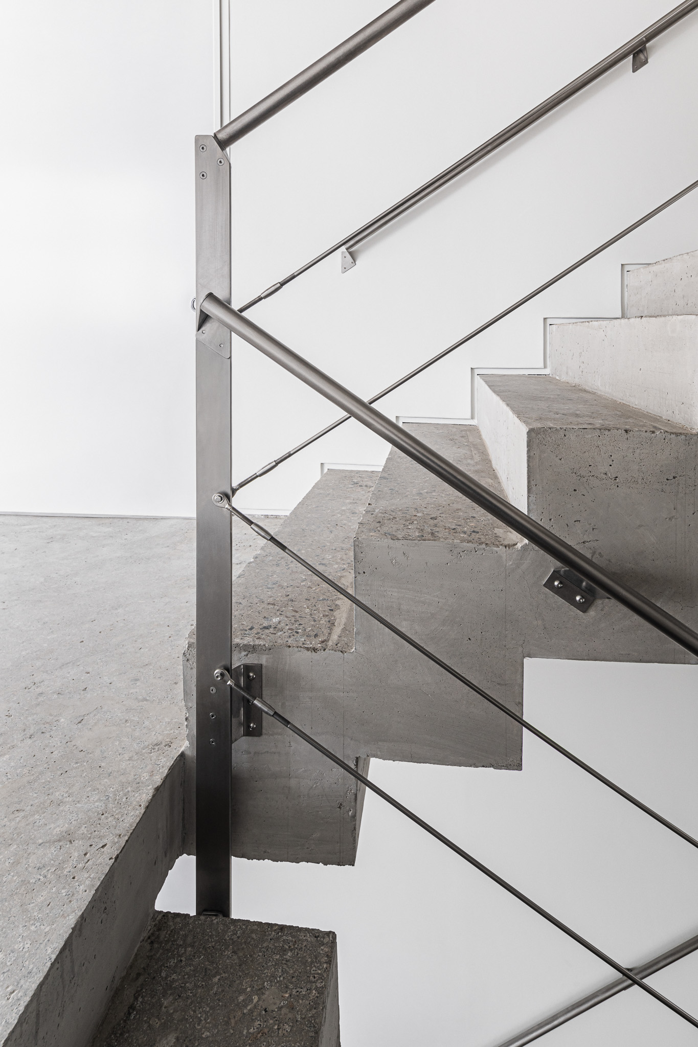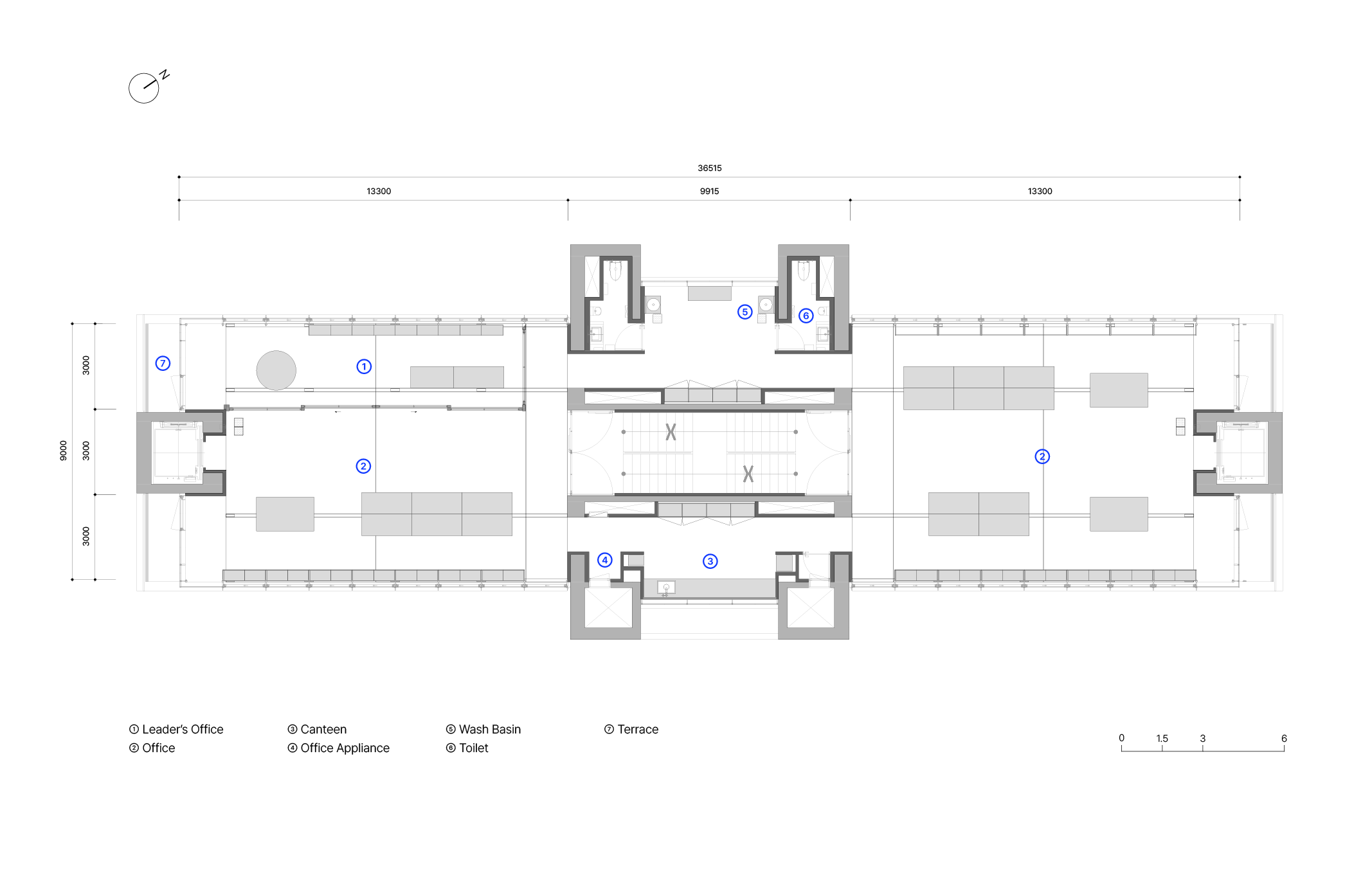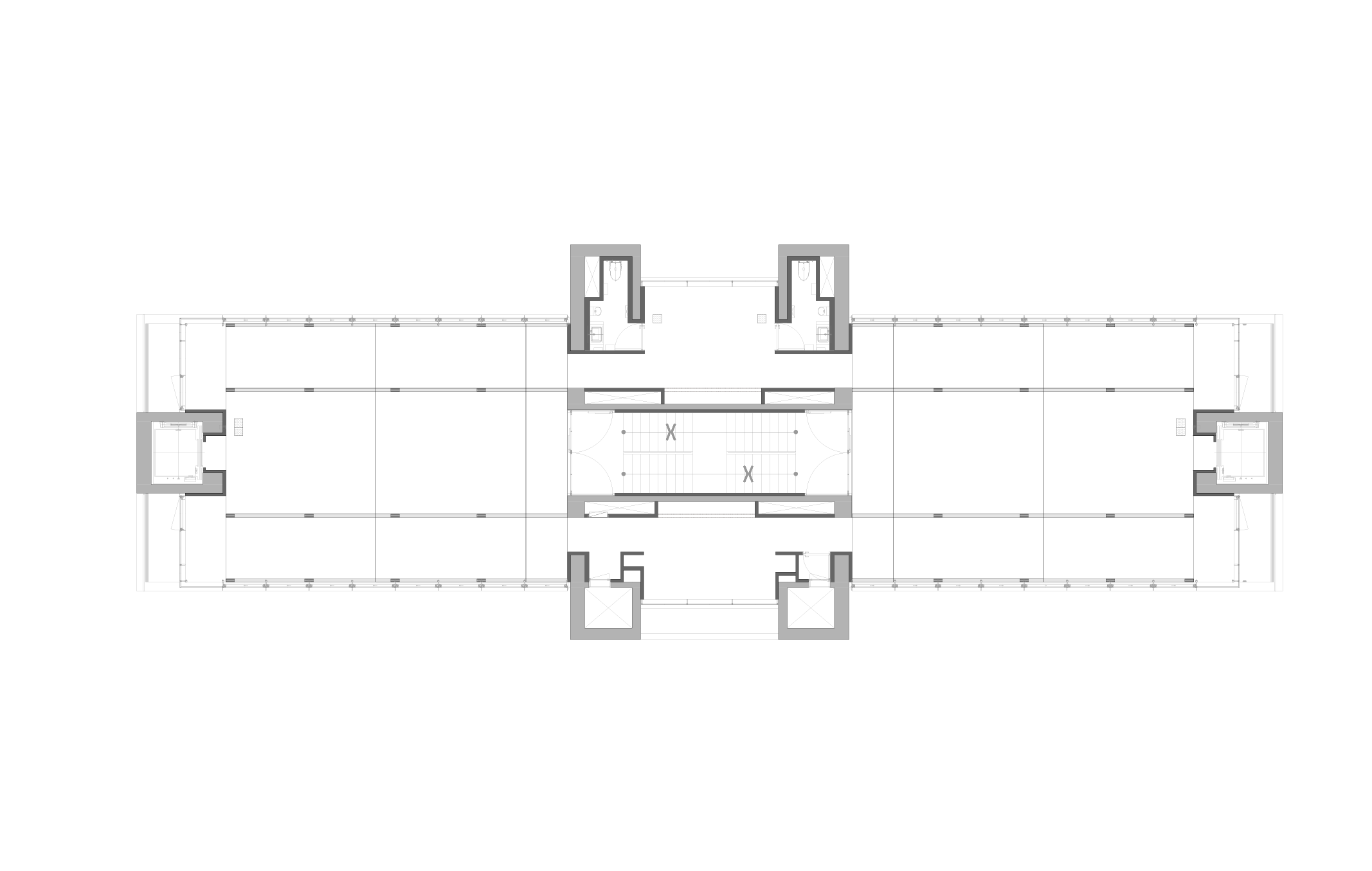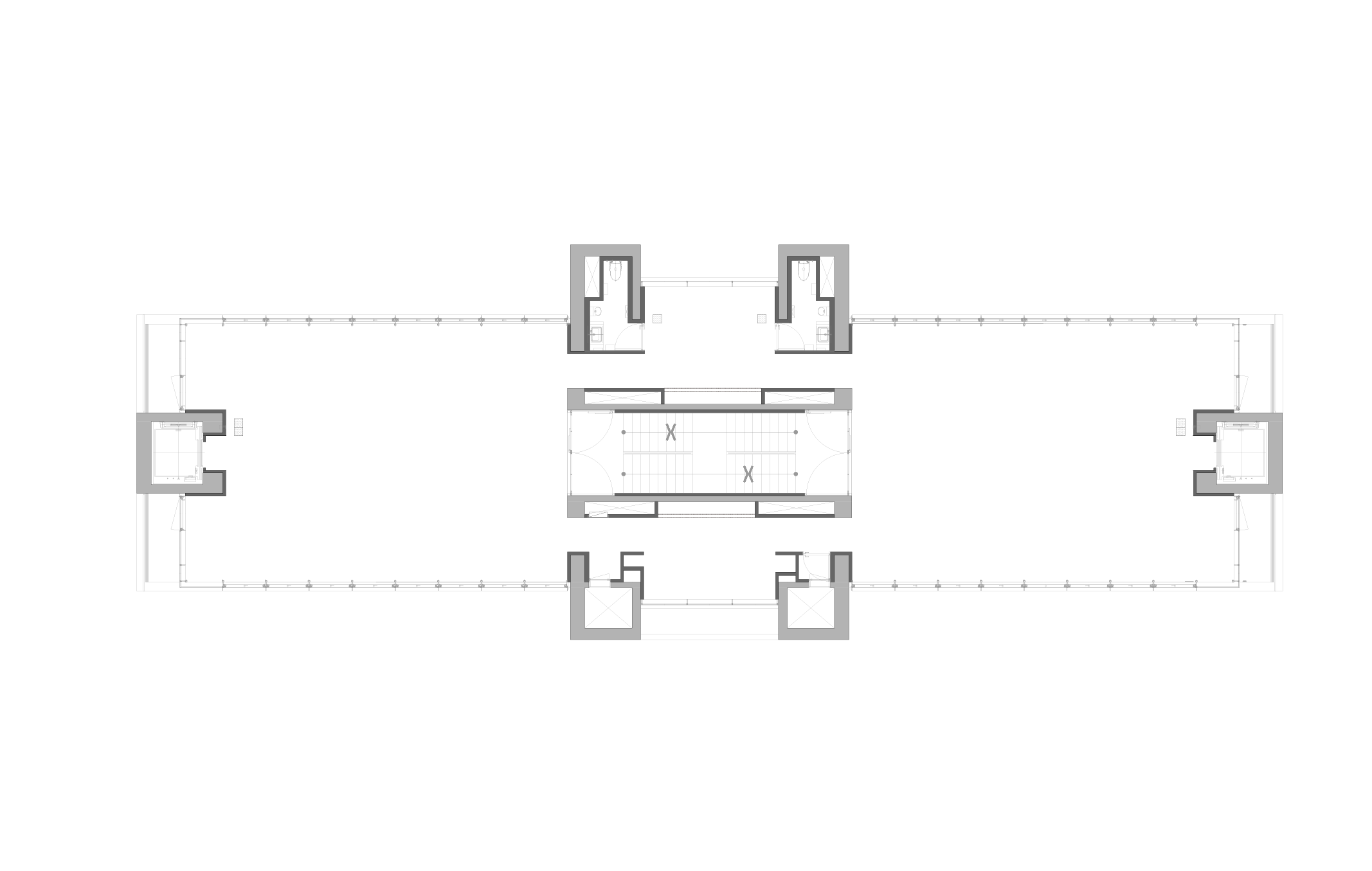 사옥은 층별로 지하 2층 전시 및 팝업 공간, 지하 1층 F&B, 1층 로비, 2~3층 매장, 4~9층 오피스, 10층 포토 스튜디오와 라운지로 구성됩니다. 이 건물의 주요 특징 중 하나는 5~10층에 구현된 효율적인 층간 연결 시스템입니다. 건물 한가운데를 관통하며 양측 공간을 가르는 중앙 계단은 X자 형태로 구성되어 어느 방향에서든 수직 이동이 자유로운, 업무 공간의 핵심 동선입니다. 건물 양 끝단에 배치된 엘리베이터는 멀리 떨어진 층 간의 수직 동선을 추가 제공함으로써 업무 환경의 효율성을 극대화합니다. 한편, 이와 같은 중앙 계단과 엘리베이터 실을 이루는 구조는 건축물 전체를 지지하는 수직 구조로 설계되었으며, 이를 연결하는 육중한 넓이의 보가 건물 내부에 기둥이 없는 열린 업무 환경을 조성하고 있습니다. 이러한 건축의 주요한 특징들이 인테리어 설계의 중요한 출발점이 되었습니다.