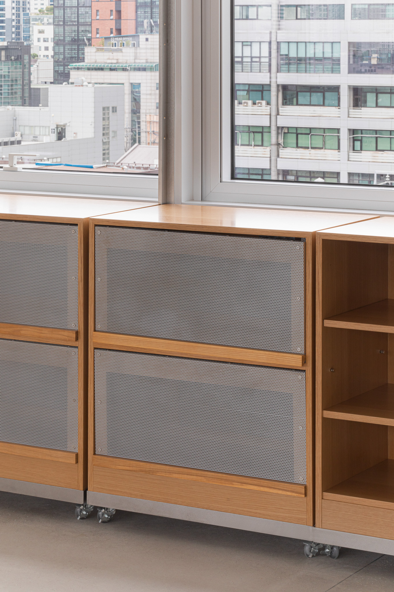 그리하여, 창호 라인을 따라 일률적으로 설치된 수직 구조물을 기준으로 창호 한 폭 1,500mm 길이에 맞춰 상단은 행거 겸 선반 모듈로, 하단부에는 (부서별 선호 보관 방식에 따라) 이동식 행거 혹은 수납장 혹은 책장이 들어가는 시스템을 고안했습니다.