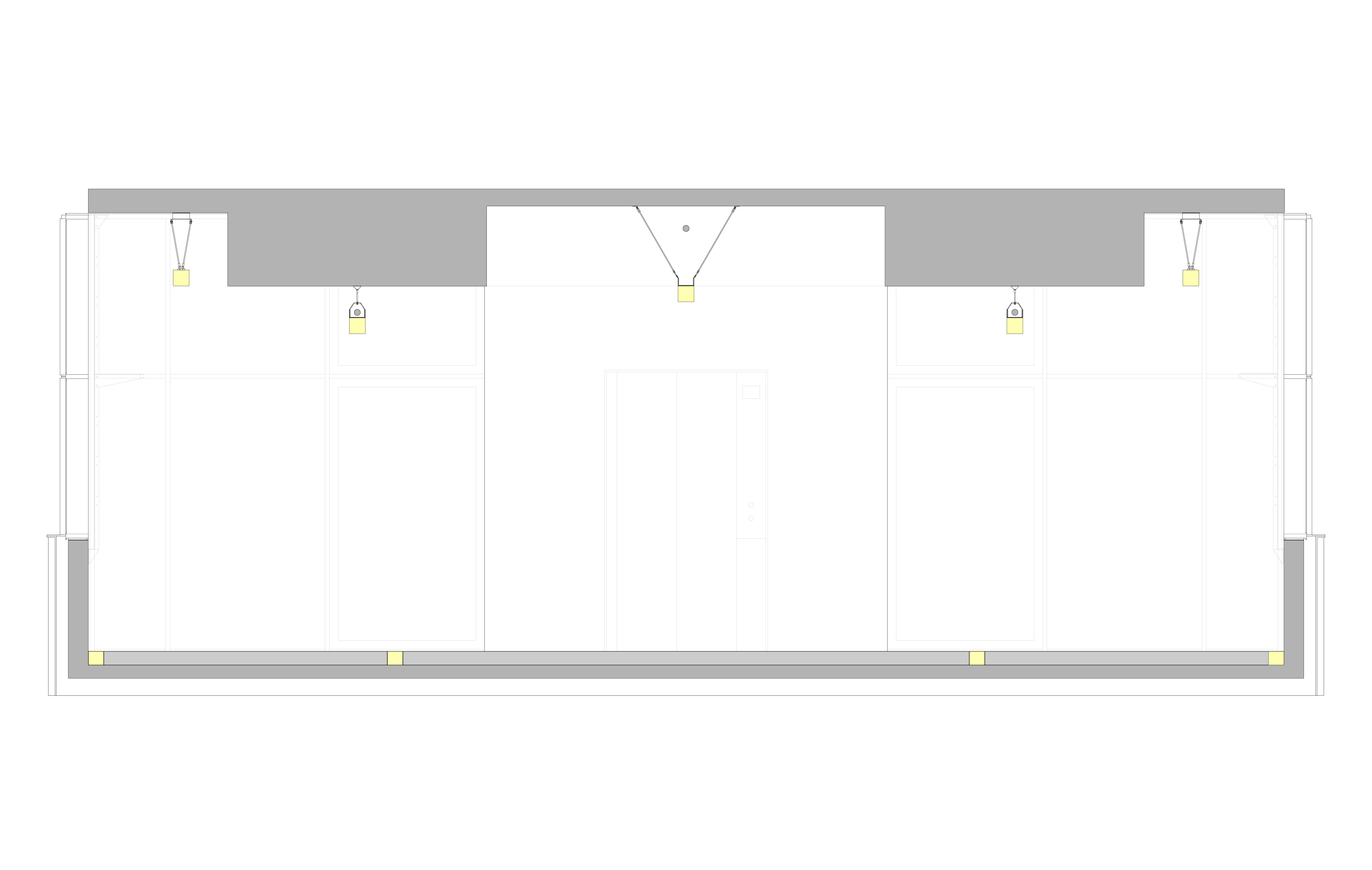 사옥의 눈에 띄는 건축적 특징은 샤프트의 수직 구조와 넓은 보로만 건물을 지지하는, 기둥이 없는 구조라는 점입니다. 보편적이지 않은 형태의 육중하고 넓은 보를 석고 천장으로 막기엔 아쉬웠기에 천장의 건축 마감을 그대로 이용하면서 기능을 위한 최소한의 구조물을 설치하고자 했습니다. 보 하단의 스프링클러를 따라 전기 배선과 소방용 배관을 정리하고 조명을 매달 수 있는 트레이를 제작했습니다.
