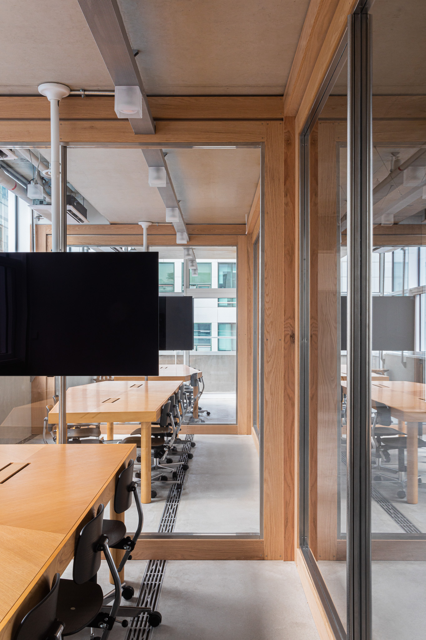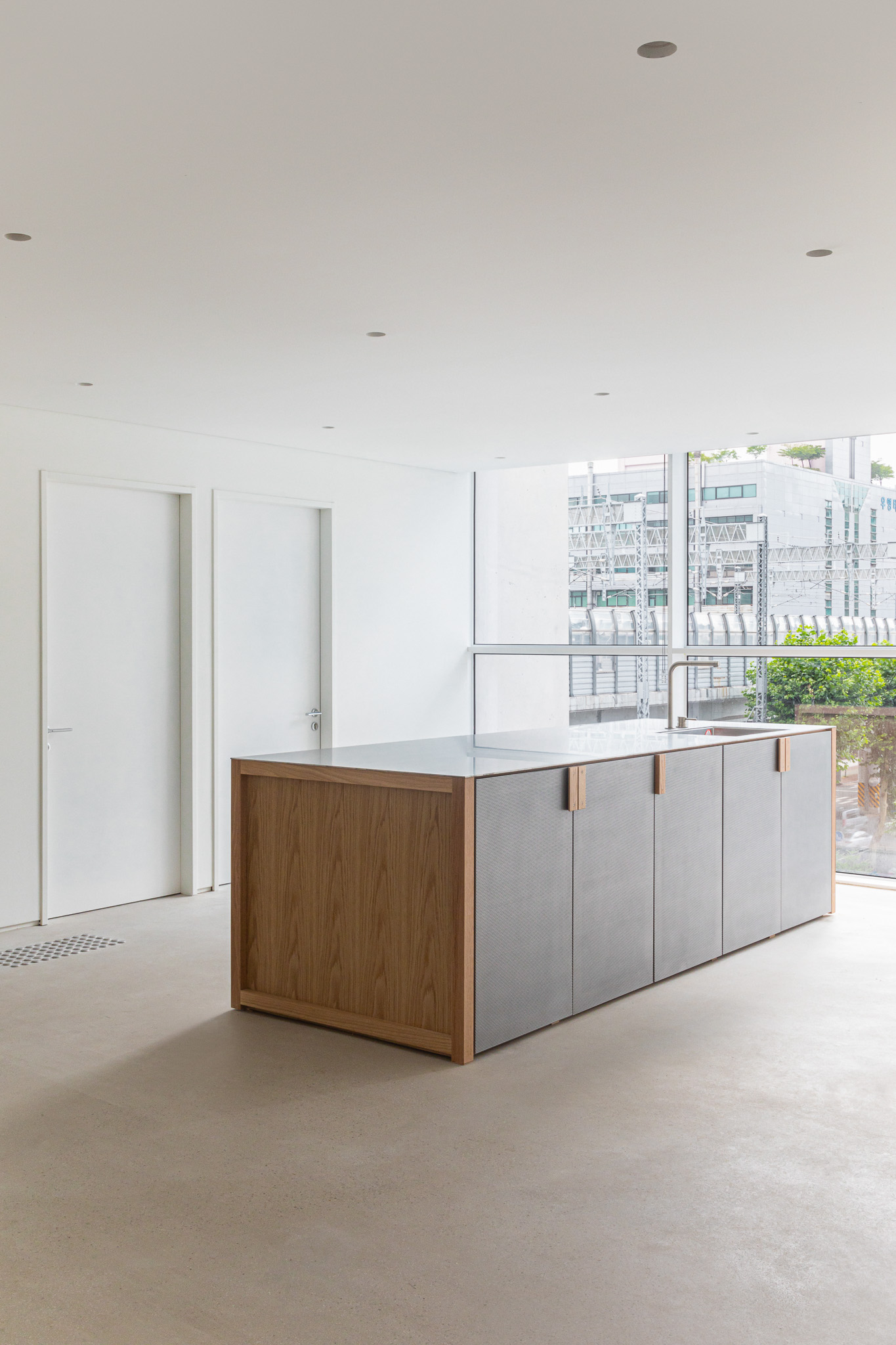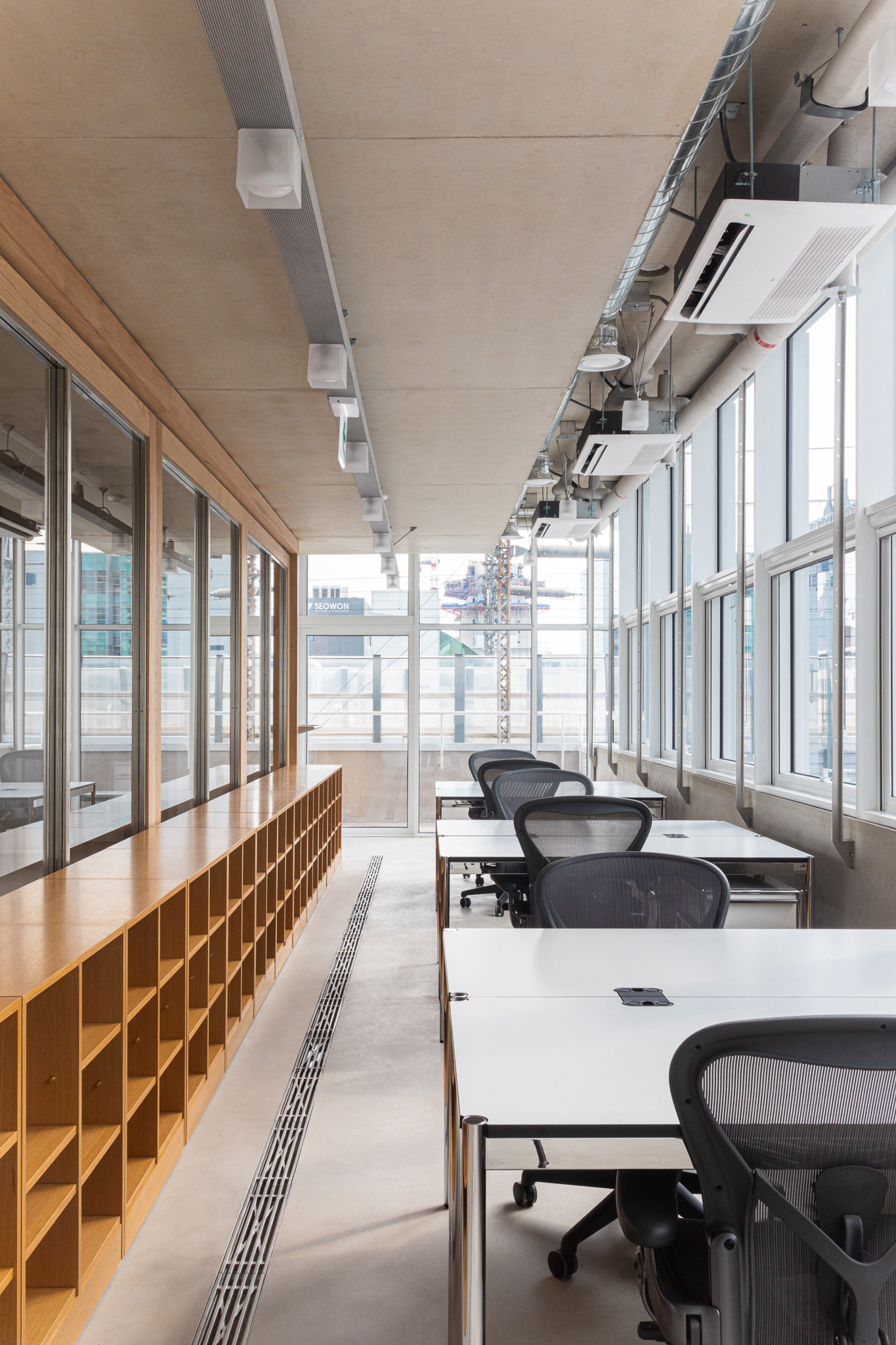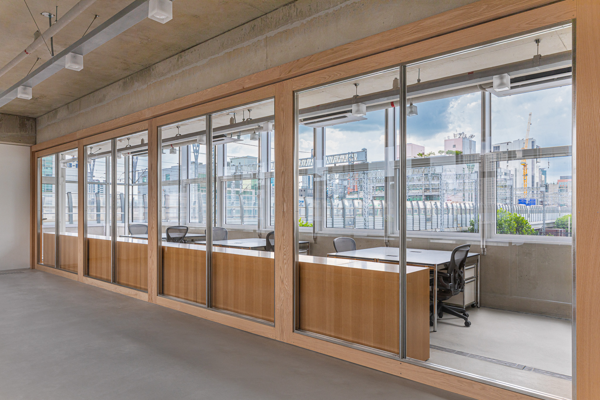 자연스럽게 보안이 필요한 부서와 미팅룸의 영역을 구분 짓는 벽체가 필요했기 때문에 양 끝 엘리베이터 사이의 넓은 복도와 나머지 영역을 구획하는 ‘파티션’을 계획했습니다. 파티션은 벽체와 창호 중간 역할을 하는 요소이며, 닫혀 있으면서 열려 있는 인상을 줍니다. 이를 통해 건축적 구조체를 가리지 않아 공간의 전체적인 양감을 살리며, 개별 실로 구획되지 않고 열린 공간으로 보이게 합니다.