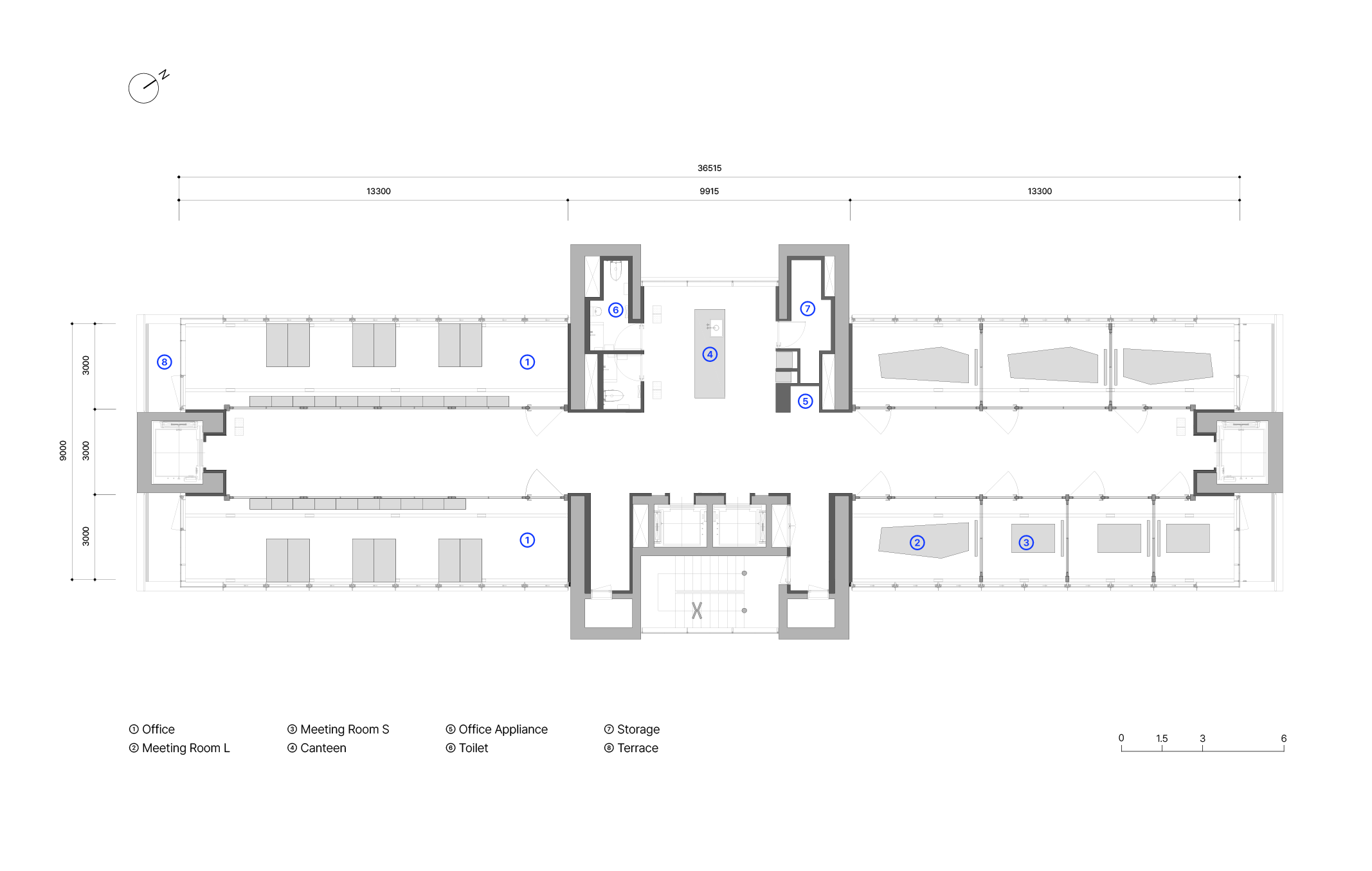 4층에는 위아래 층을 잇는 X자 형태의 중앙 계단이 없습니다. 단절된 층 구획으로 외부인의 상층부 오피스 영역 출입을 통제하는 것입니다. 따라서 평면상 중앙부 공용 공간을 기준으로 좌측에는 보안이 필수적인 오피스가 배치됐고, 우측엔 7개의 크고 작은 미팅룸이 배치되었습니다.