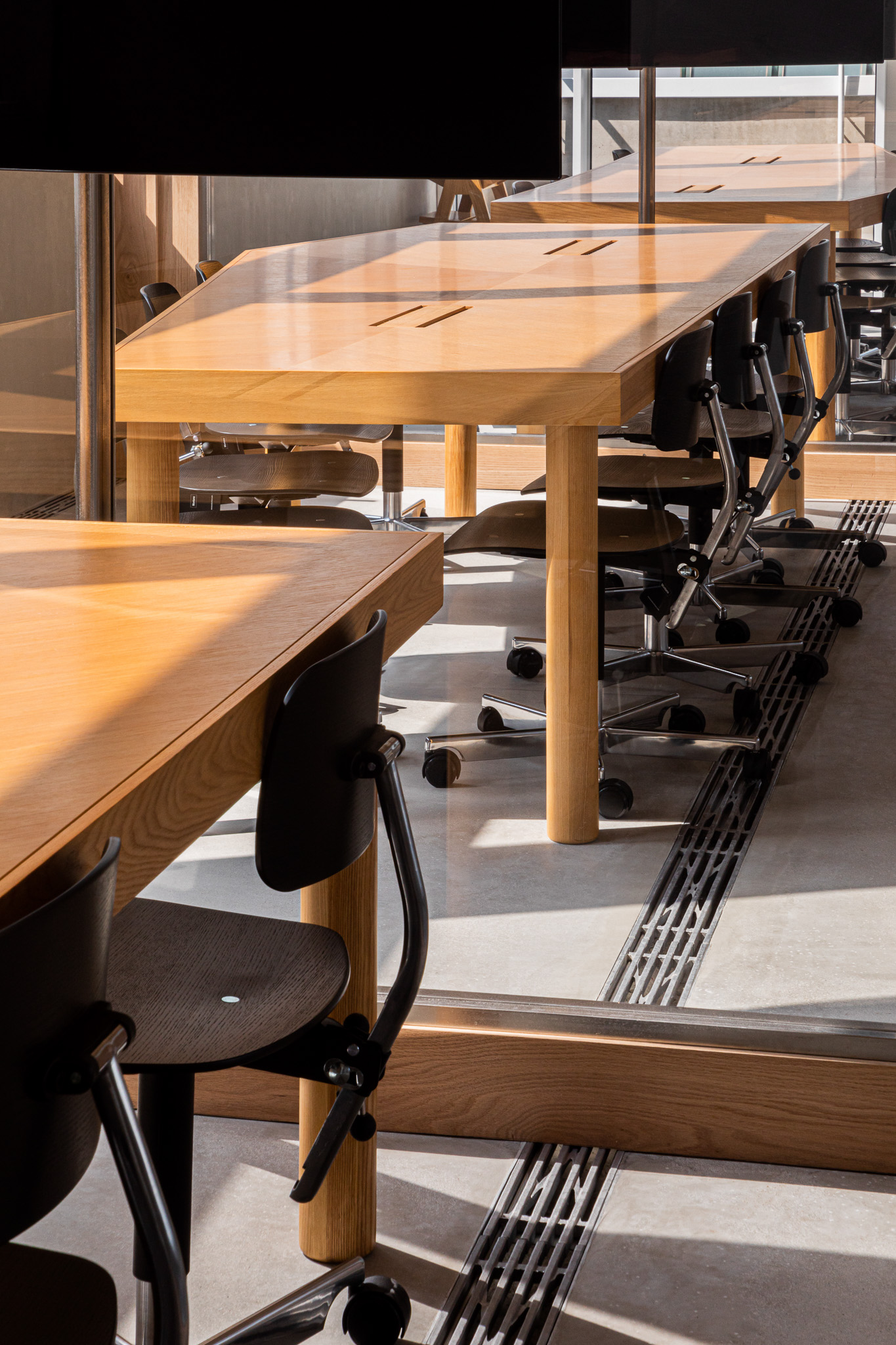 JKND는 새로운 옷을 출시하기까지 끊임없이 소통합니다. 부서 내부적으로도 부서 사이에서도 수많은 회의가 이뤄집니다. 개인 업무 공간에서 근무하는 시간만큼이나 4층 미팅룸에서 보내는 시간도 적지 않다고 판단, 기존 미팅실보다 더 나은 환경을 조성하고자 했습니다. 이를 위해 테이블의 형태에 특히 주목했습니다.