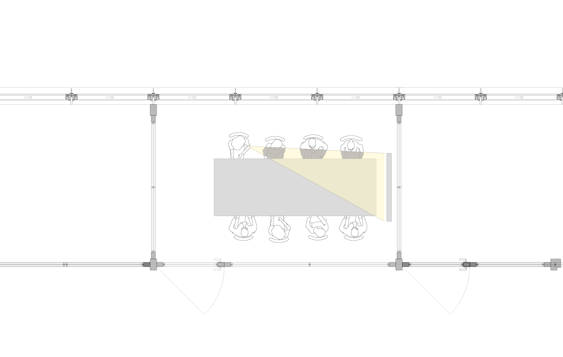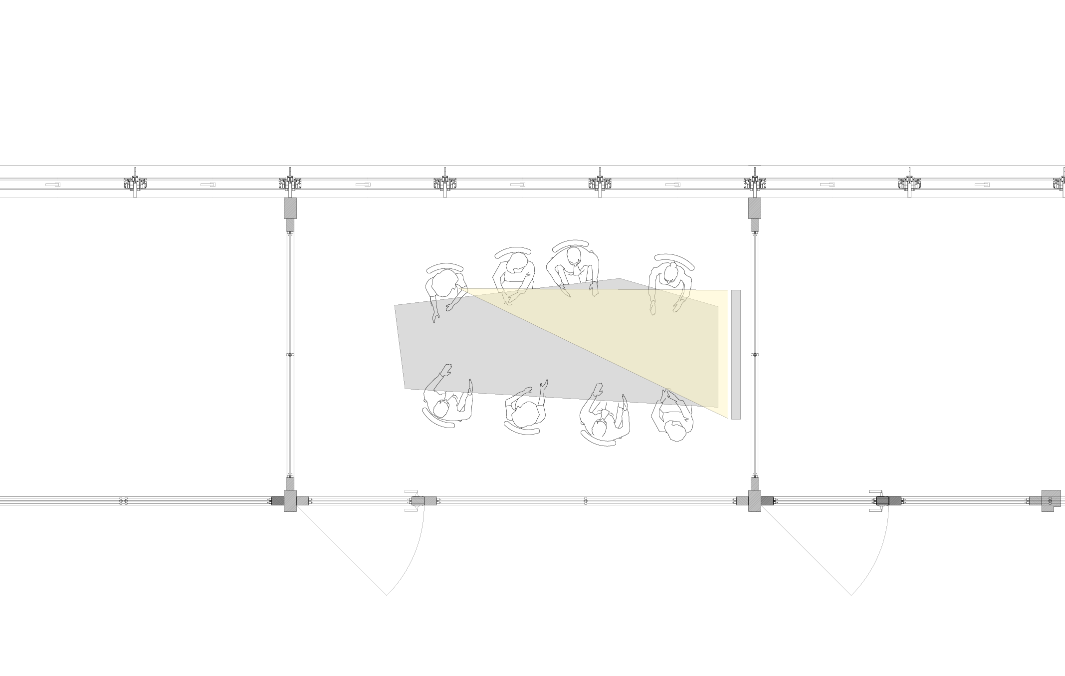 미팅룸의 8인석 테이블은 비정형적인 모양입니다. 테이블 외곽의 다양한 각도는 좁게 느낄 수 있는 미팅룸에 가능한 한 여유로운 동선을 만들어줍니다. 또한, 발표자와 참석자의 자리를 구분하고, 앞사람에 의해 시각 자료가 가려지지 않도록 시야를 확보하는 역할을 합니다.