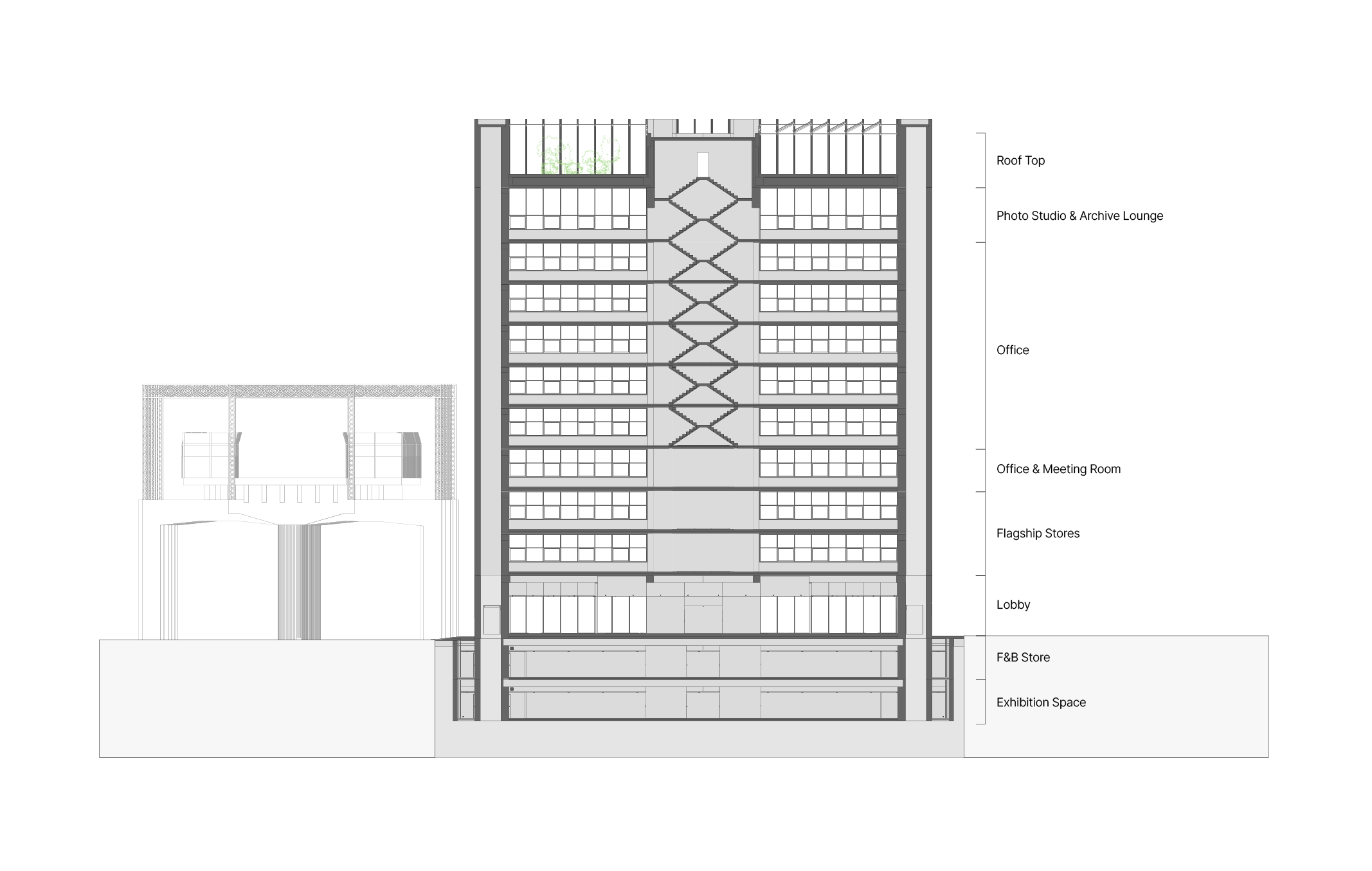 사옥은 층별로 지하 2층 전시 및 팝업 공간, 지하 1층 F&B, 1층 로비, 2~3층 매장, 4~9층 오피스, 10층 포토 스튜디오와 라운지로 구성됩니다. 이 건물의 주요 특징 중 하나는 5~10층에 구현된 효율적인 층간 연결 시스템입니다. 건물 한가운데를 관통하며 양측 공간을 가르는 중앙 계단은 X자 형태로 구성되어 어느 방향에서든 수직 이동이 자유로운, 업무 공간의 핵심 동선입니다. 건물 양 끝단에 배치된 엘리베이터는 멀리 떨어진 층 간의 수직 동선을 추가 제공함으로써 업무 환경의 효율성을 극대화합니다. 한편, 이와 같은 중앙 계단과 엘리베이터 실을 이루는 구조는 건축물 전체를 지지하는 수직 구조로 설계되었으며, 이를 연결하는 육중한 넓이의 보가 건물 내부에 기둥이 없는 열린 업무 환경을 조성하고 있습니다. 이러한 건축의 주요한 특징들이 인테리어 설계의 중요한 출발점이 되었습니다.