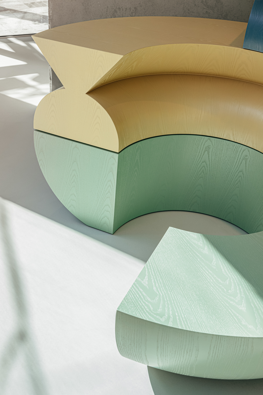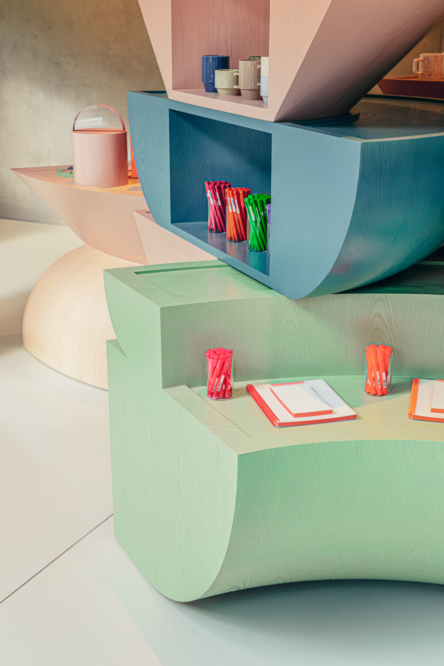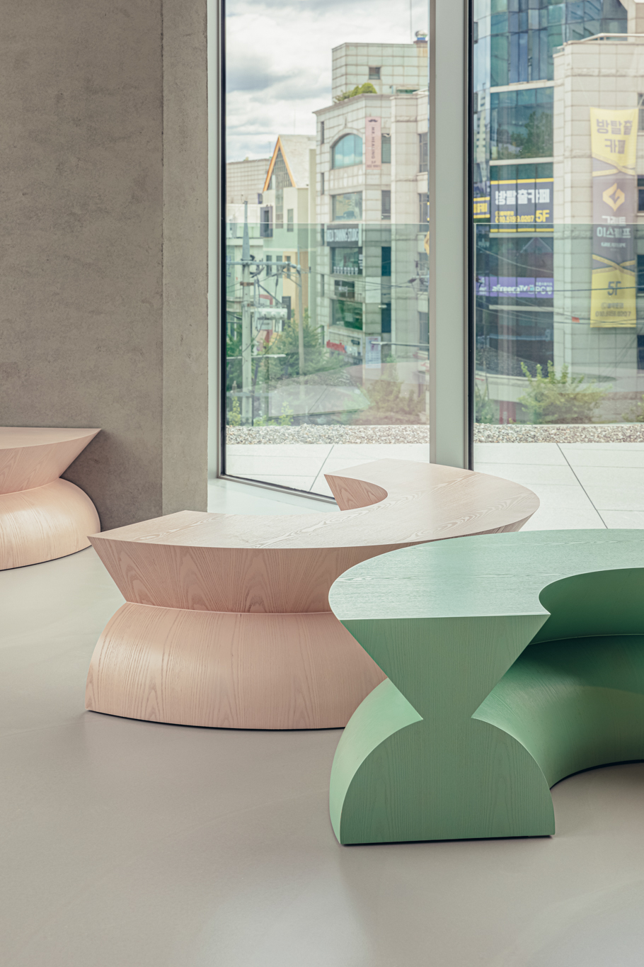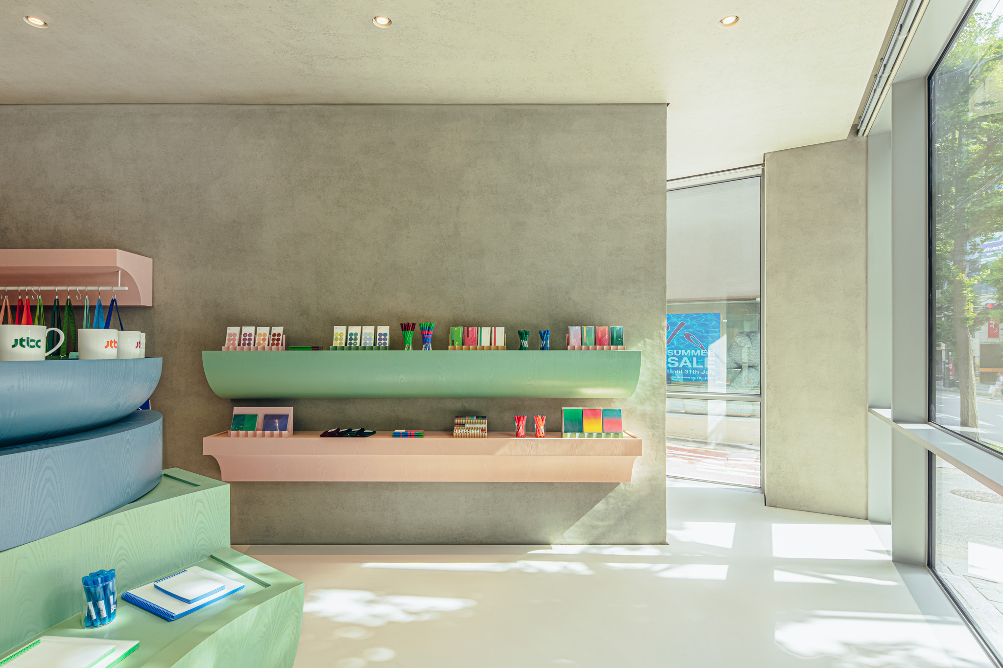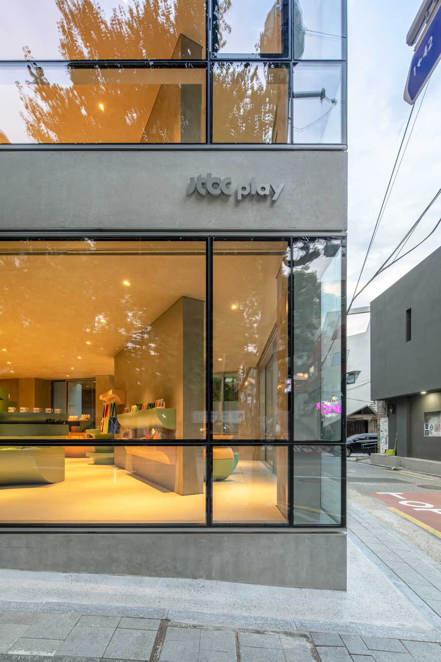 가구 디자인을 맡았던 JTBC 플레이. JTBC 로고 단면을 기능에 맞도록 압출 성형한(extrude) 다소 특이한 가구의 형태를 띄고 있습니다. JTBC 브랜드 컬러는 프로그램별로 지정된 4가지 색(드라마/예능/문화/뉴스)에서 출발해 그라데이션으로 변화하는 형식을 취하고 있는데, 가구의 색상 역시 그라데이션의 일부를 차용해 4가지 색으로 제작했습니다.