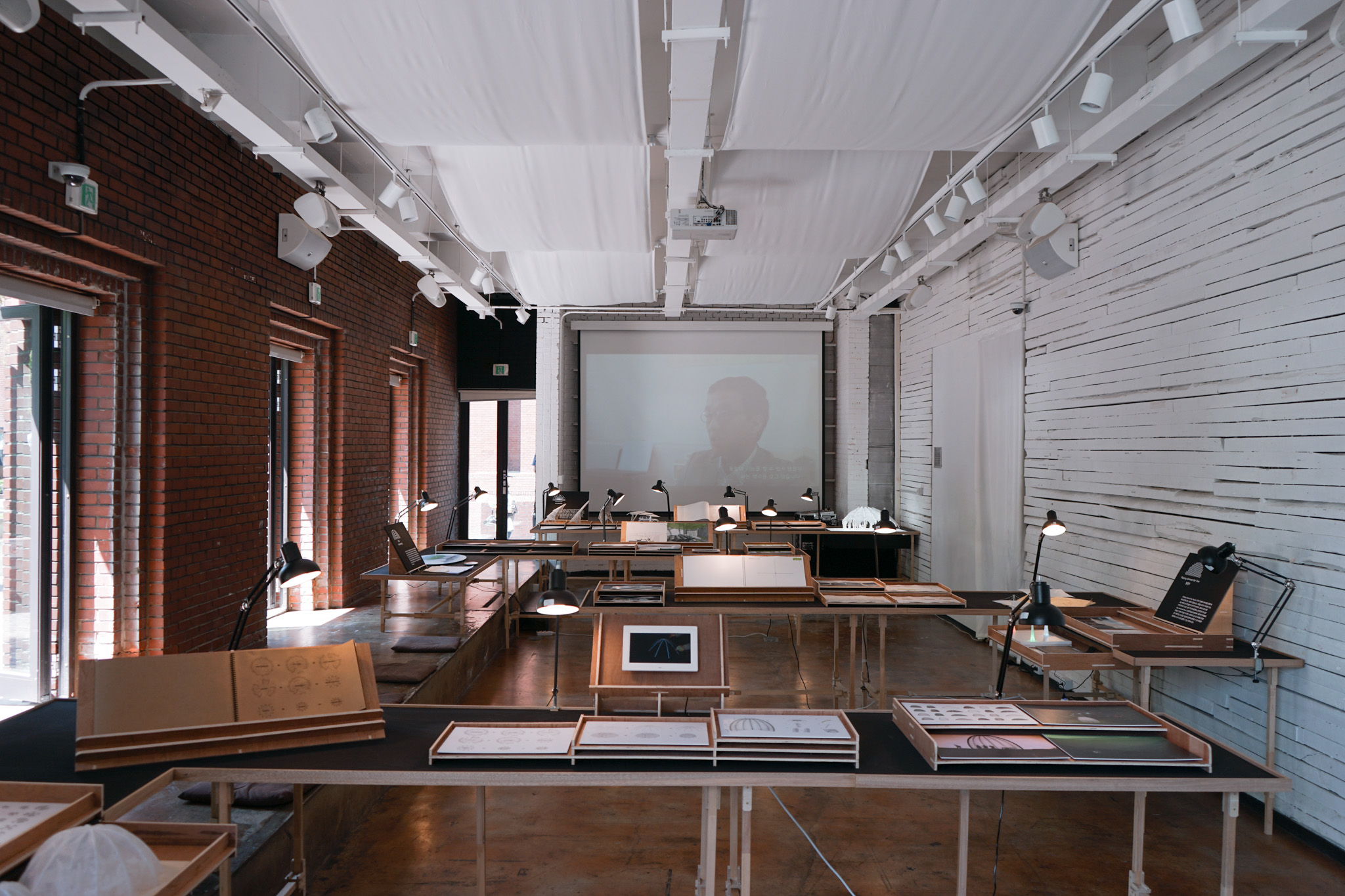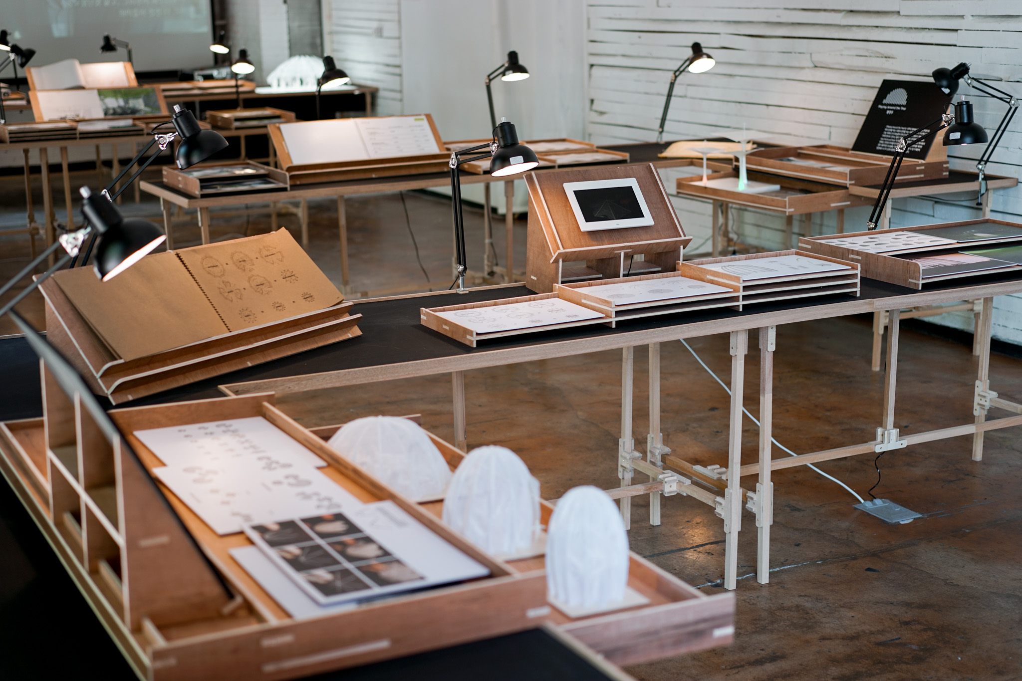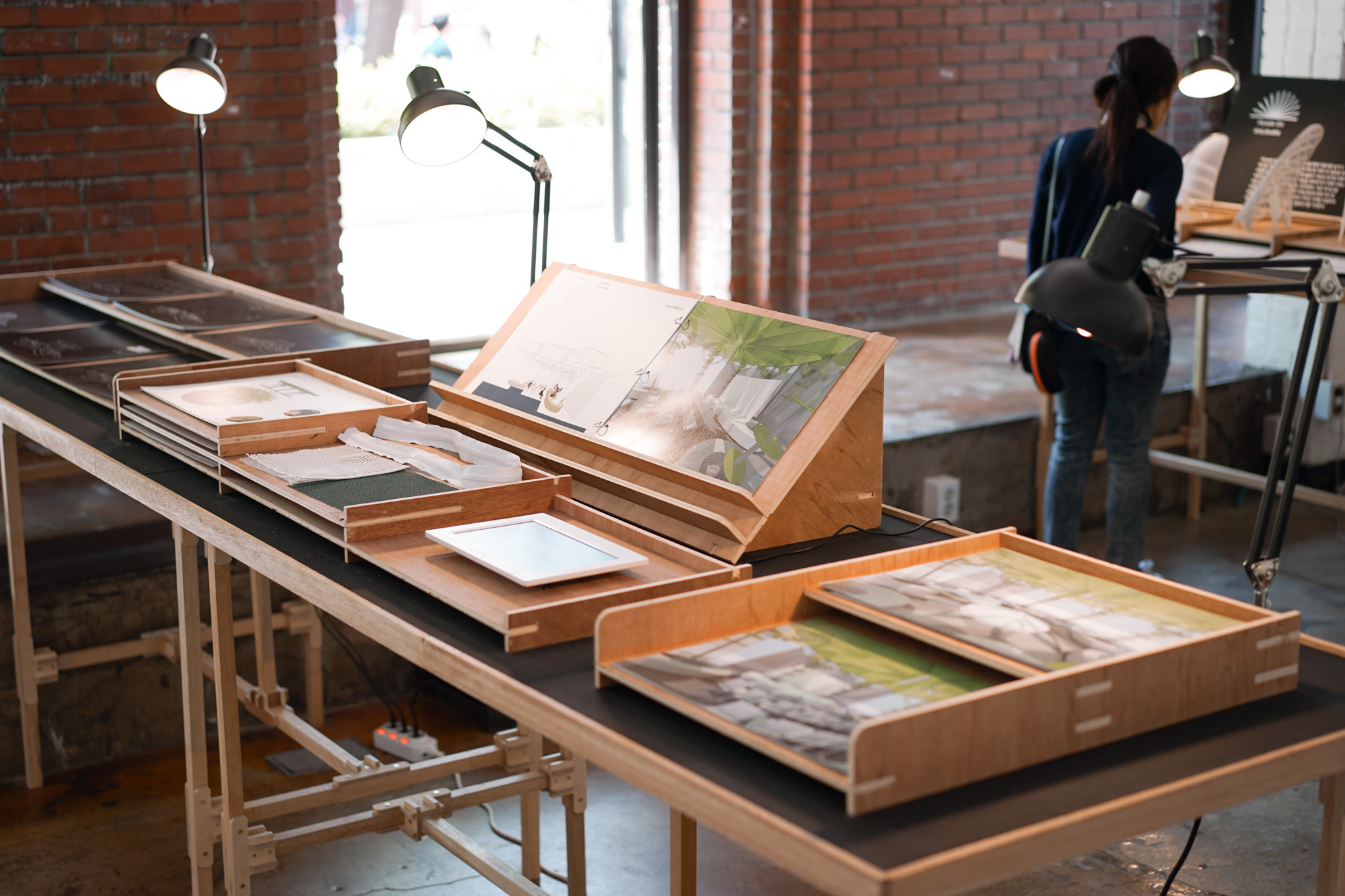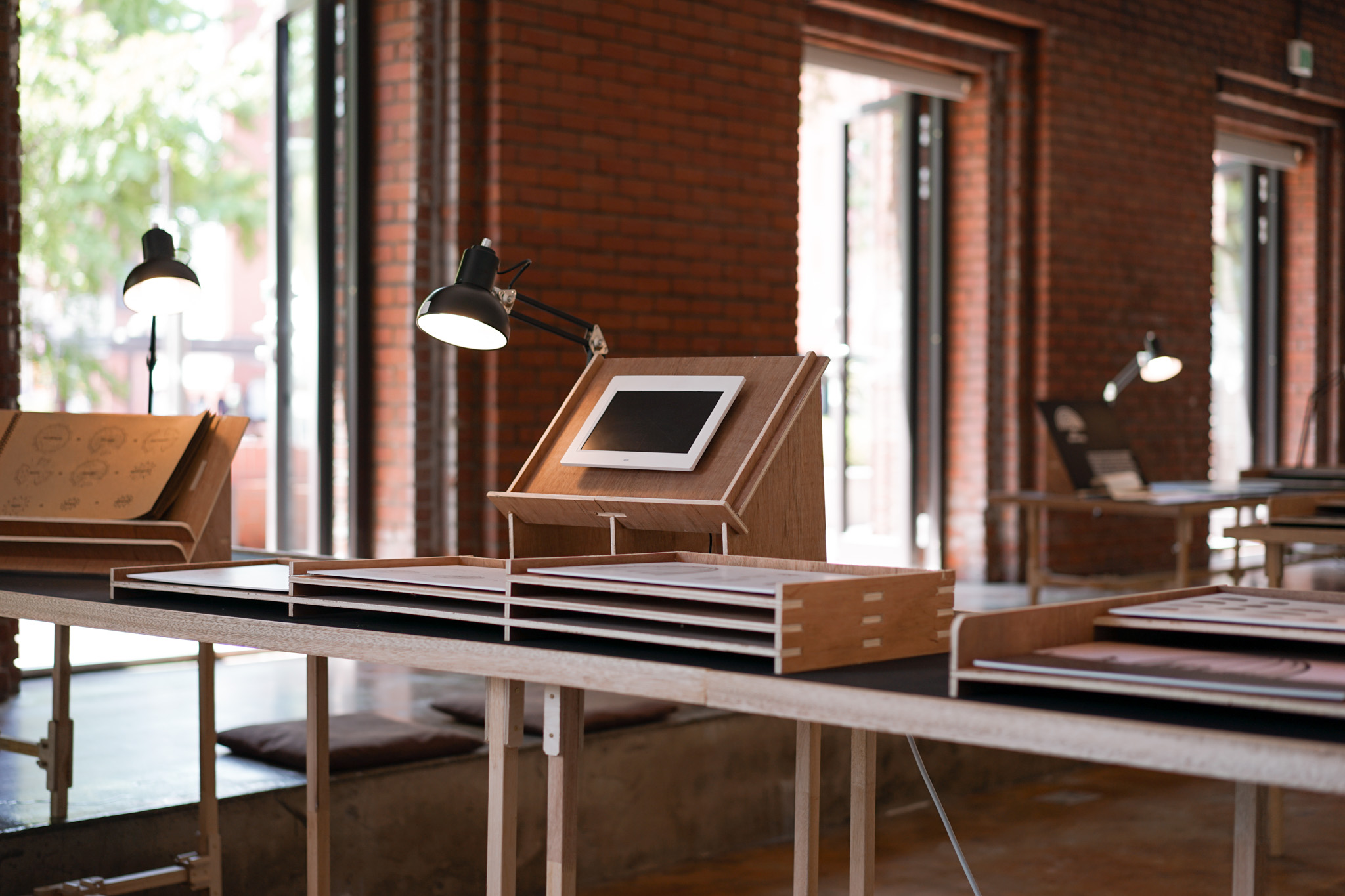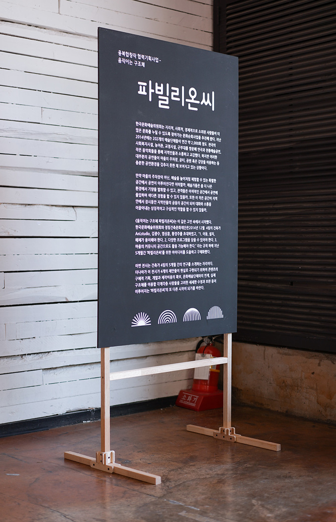 건축가 4팀이 지역 공동체를 위해 이동 가능한 형태의 파빌리온을 제안한 전시. 건축 전시라면 언제나 등장하는 보드 소재를 배제하고, 건축가들이 실제 사용했을 법한 테이블을 만들어 동선에 맞게 배치한 뒤, 관객들이 테이블을 따라 움직이며 작업 과정을 순차적으로 살펴볼 수 있도록 했습니다. 예산이 부족한 문제도 있었지만, 씨오엠을 결성한 이후 첫 프로젝트나 다름없어 작업실을 찾지 못한 채 여기저기 ‘움직이며’ 일하고 있는 상태였기에, 모든 집기를 현장에서 조립 가능한 형태로 만들었습니다. 그 과정에서 생겨나는 구조적인 군더더기를 숨기지 않고 적극적으로 노출시켰는데, 이런 부분에서도 전시 주제가 간접적으로 드러납니다.