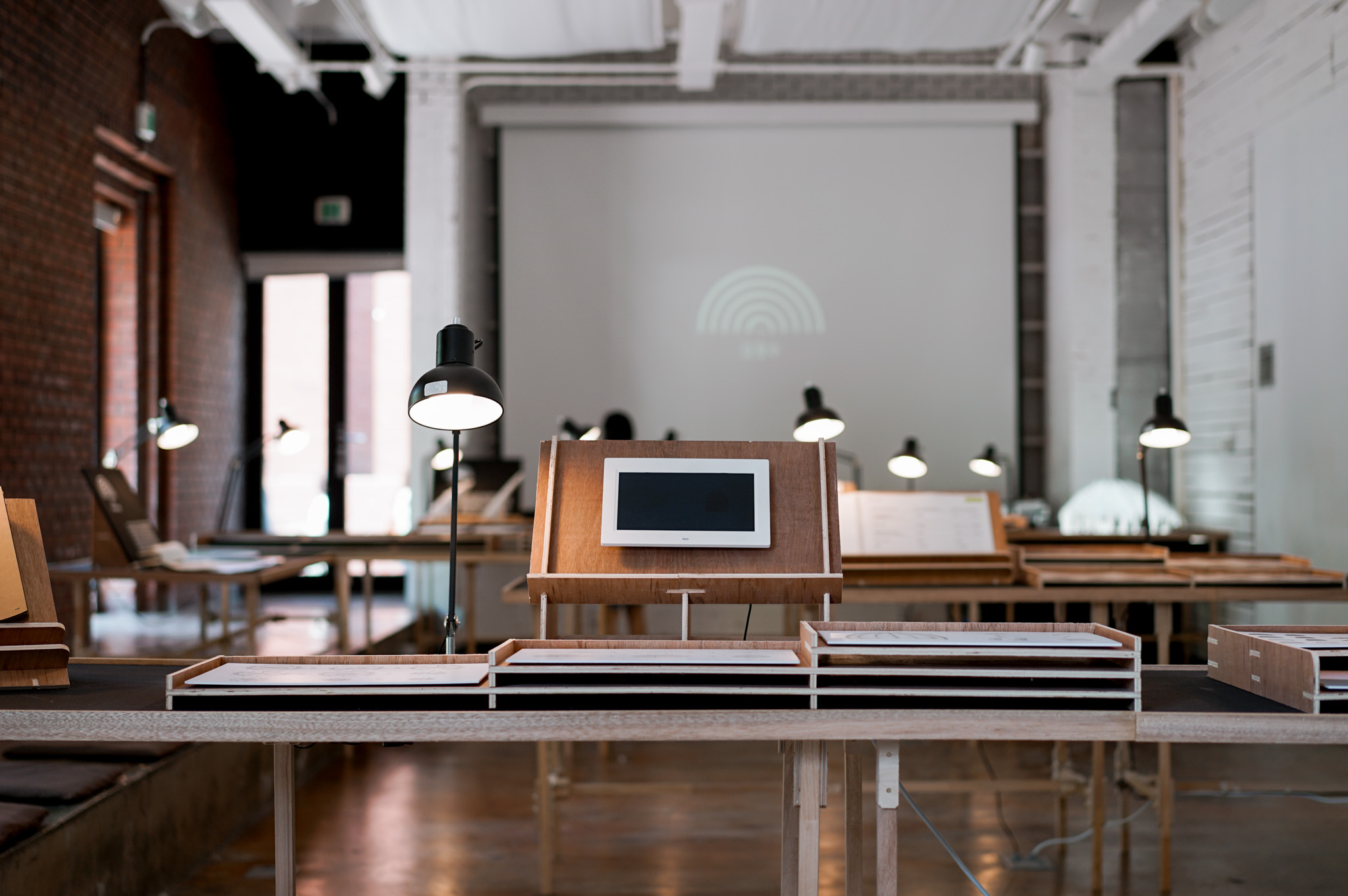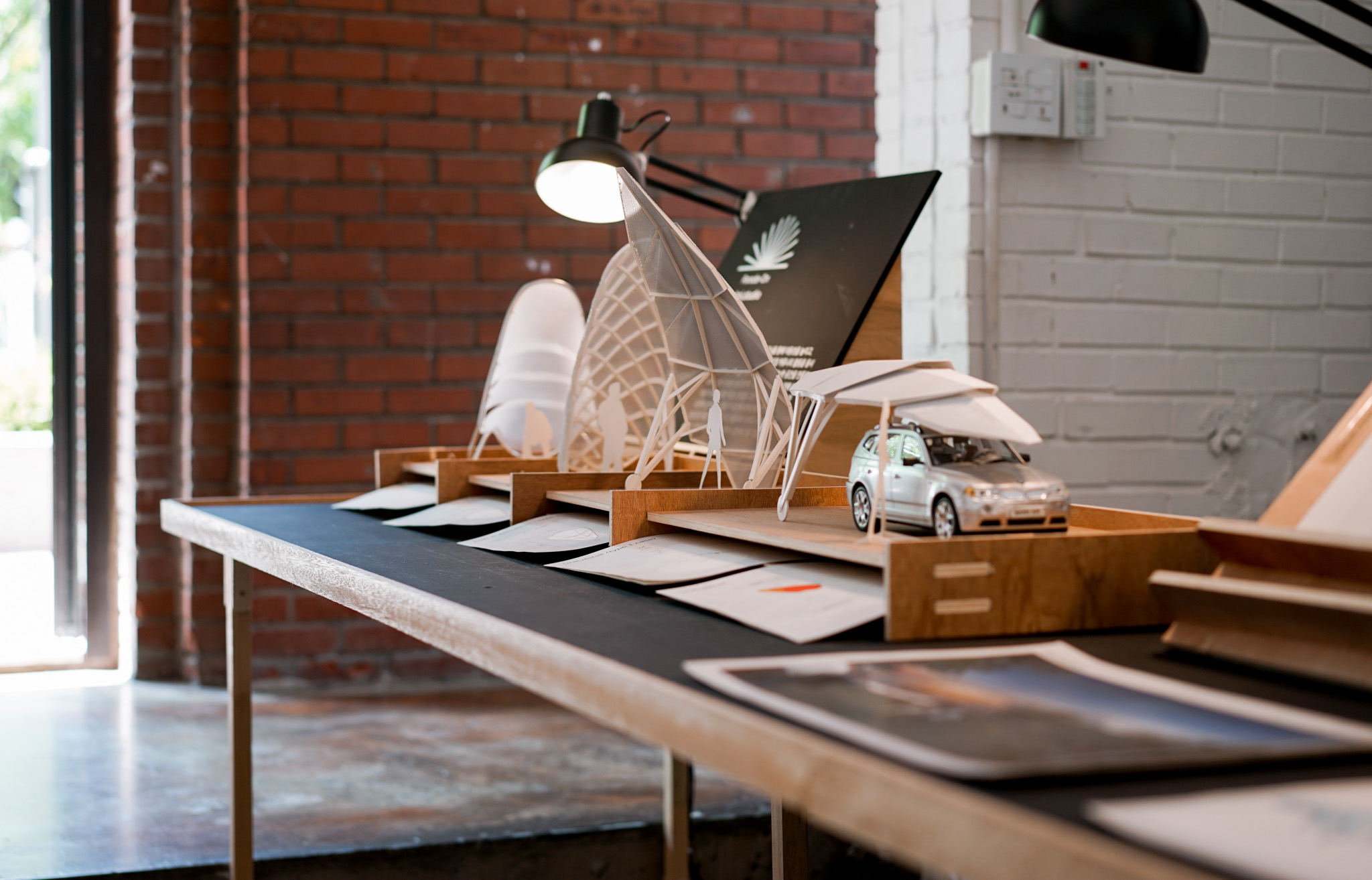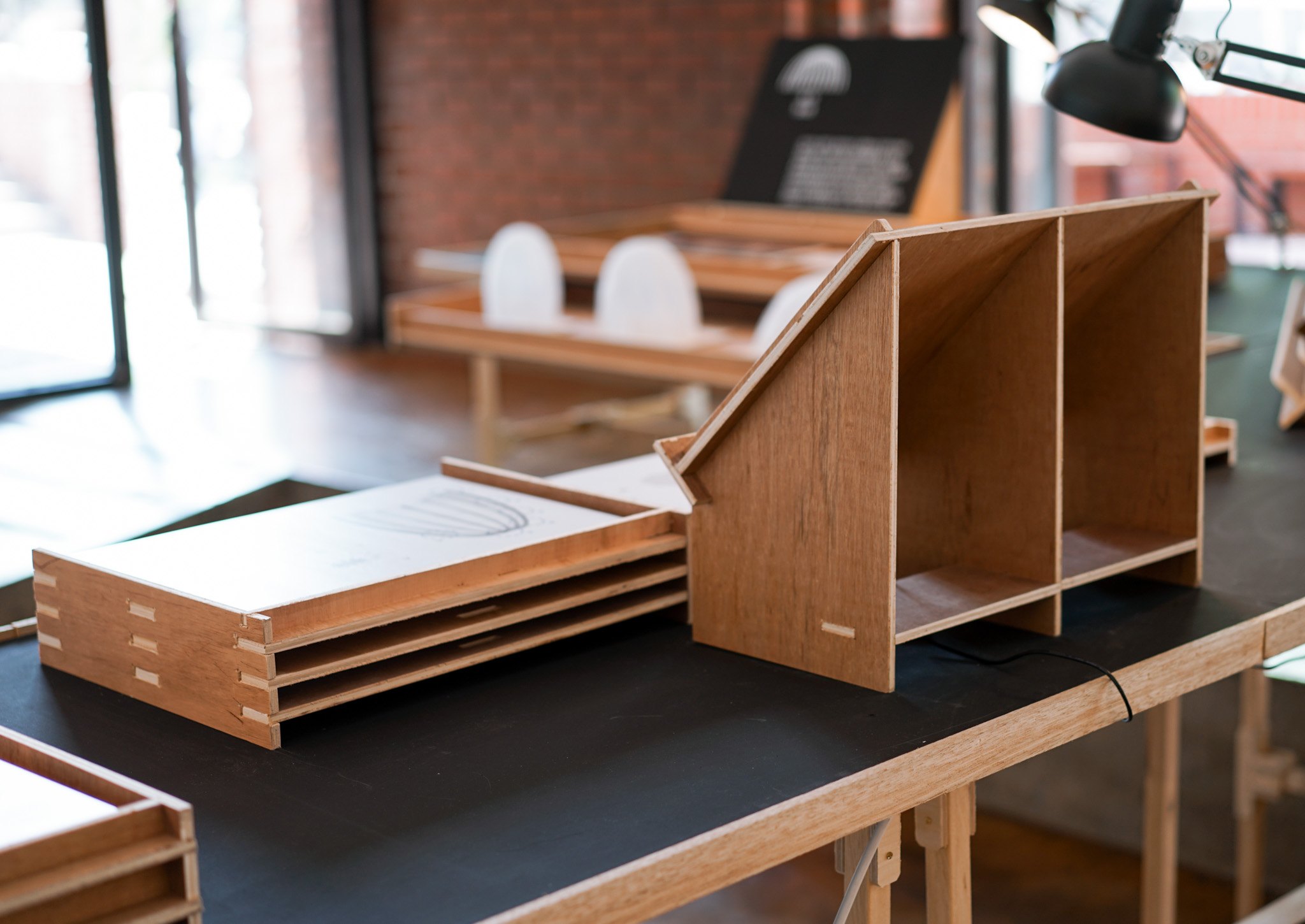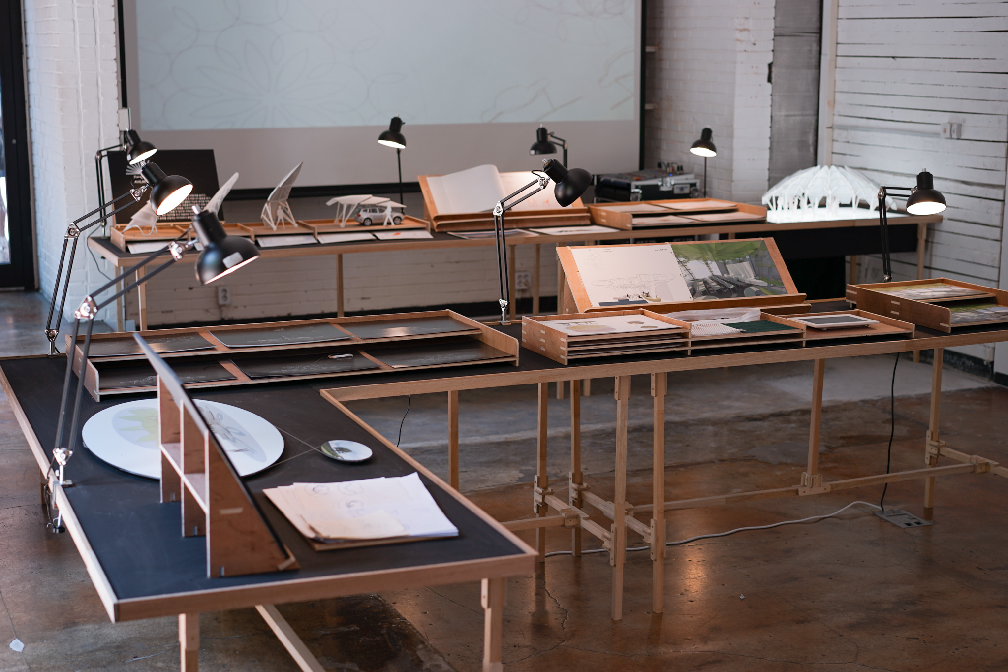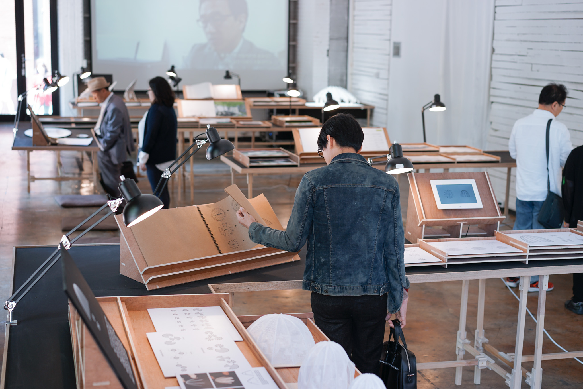 건축가 4팀이 지역 공동체를 위해 이동 가능한 형태의 파빌리온을 제안한 전시. 건축 전시라면 언제나 등장하는 보드 소재를 배제하고, 건축가들이 실제 사용했을 법한 테이블을 만들어 동선에 맞게 배치한 뒤, 관객들이 테이블을 따라 움직이며 작업 과정을 순차적으로 살펴볼 수 있도록 했습니다. 예산이 부족한 문제도 있었지만, 씨오엠을 결성한 이후 첫 프로젝트나 다름없어 작업실을 찾지 못한 채 여기저기 ‘움직이며’ 일하고 있는 상태였기에, 모든 집기를 현장에서 조립 가능한 형태로 만들었습니다. 그 과정에서 생겨나는 구조적인 군더더기를 숨기지 않고 적극적으로 노출시켰는데, 이런 부분에서도 전시 주제가 간접적으로 드러납니다.