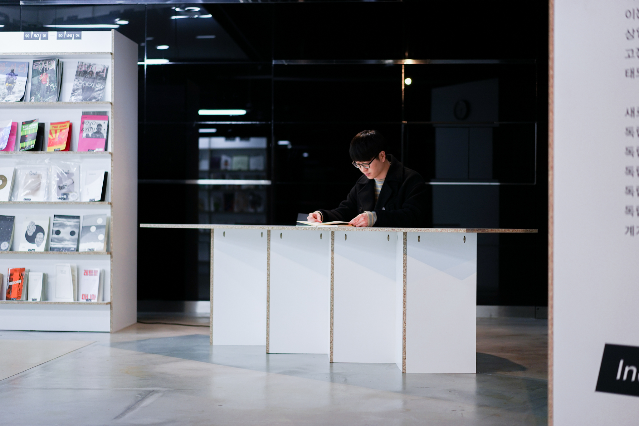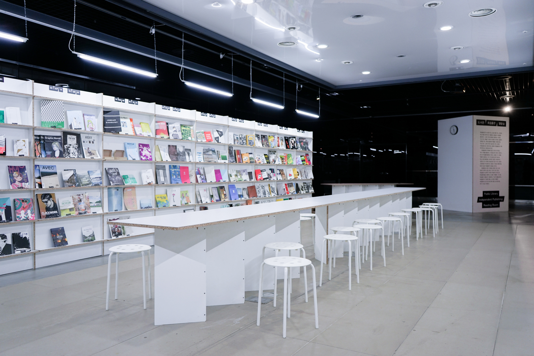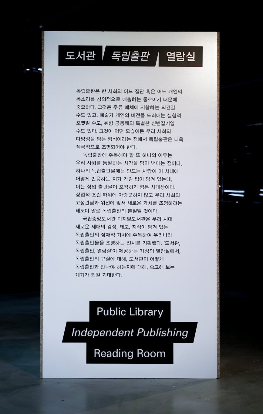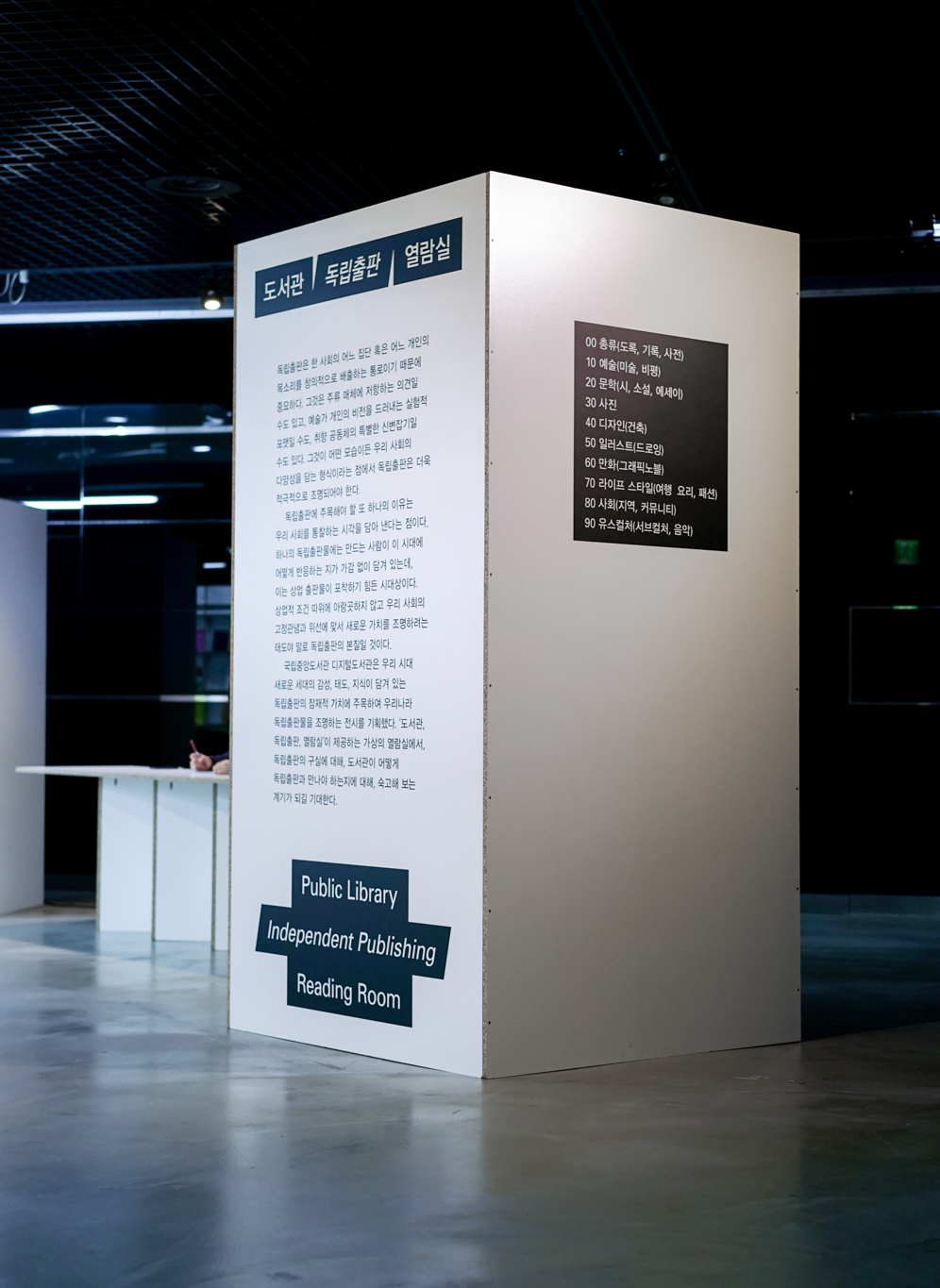 공공 도서관에 수집·보존되지 못했던 독립출판물을 모은 아카이브 전이 국립중앙도서관에서 개최된다는 점이 흥미로웠던 전시입니다. 아이덴티티 디자인을 맡은 디자이너 신덕호와 논의하면서 국립중앙도서관 안에 또 다른 열람실을 구축하는 게 상징적으로 보일 것 같다는 확신을 공유했습니다. 잘 보면, 600여 권의 도서를 진열한 책장 외에 사서의 자리와 테이블, 시계, 책장 위에 부착되어 있는 도서 분류 기호 따위가 있는데, 이곳이 열람실이라는 것을 보여주는 기호들입니다.