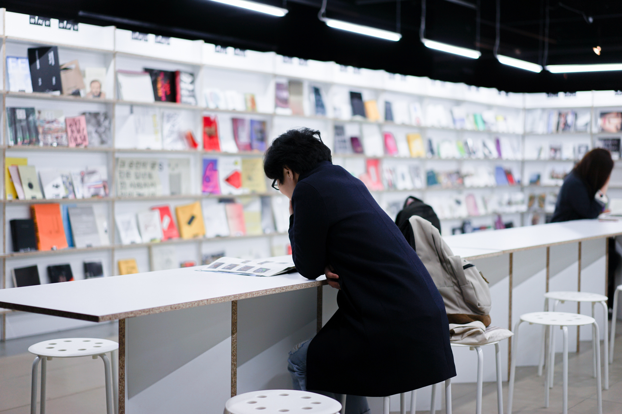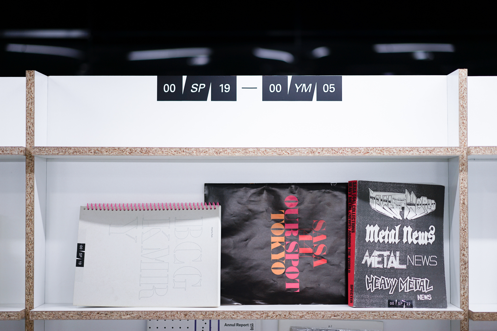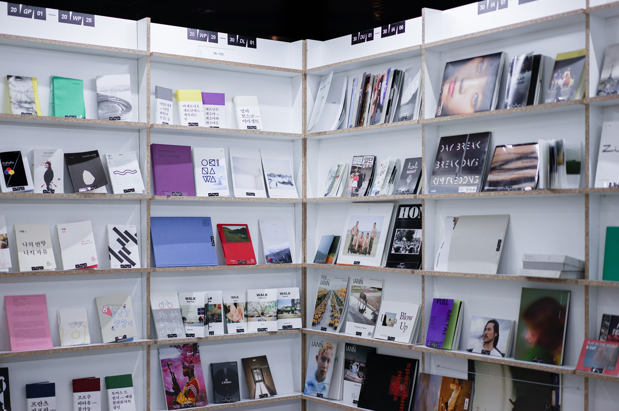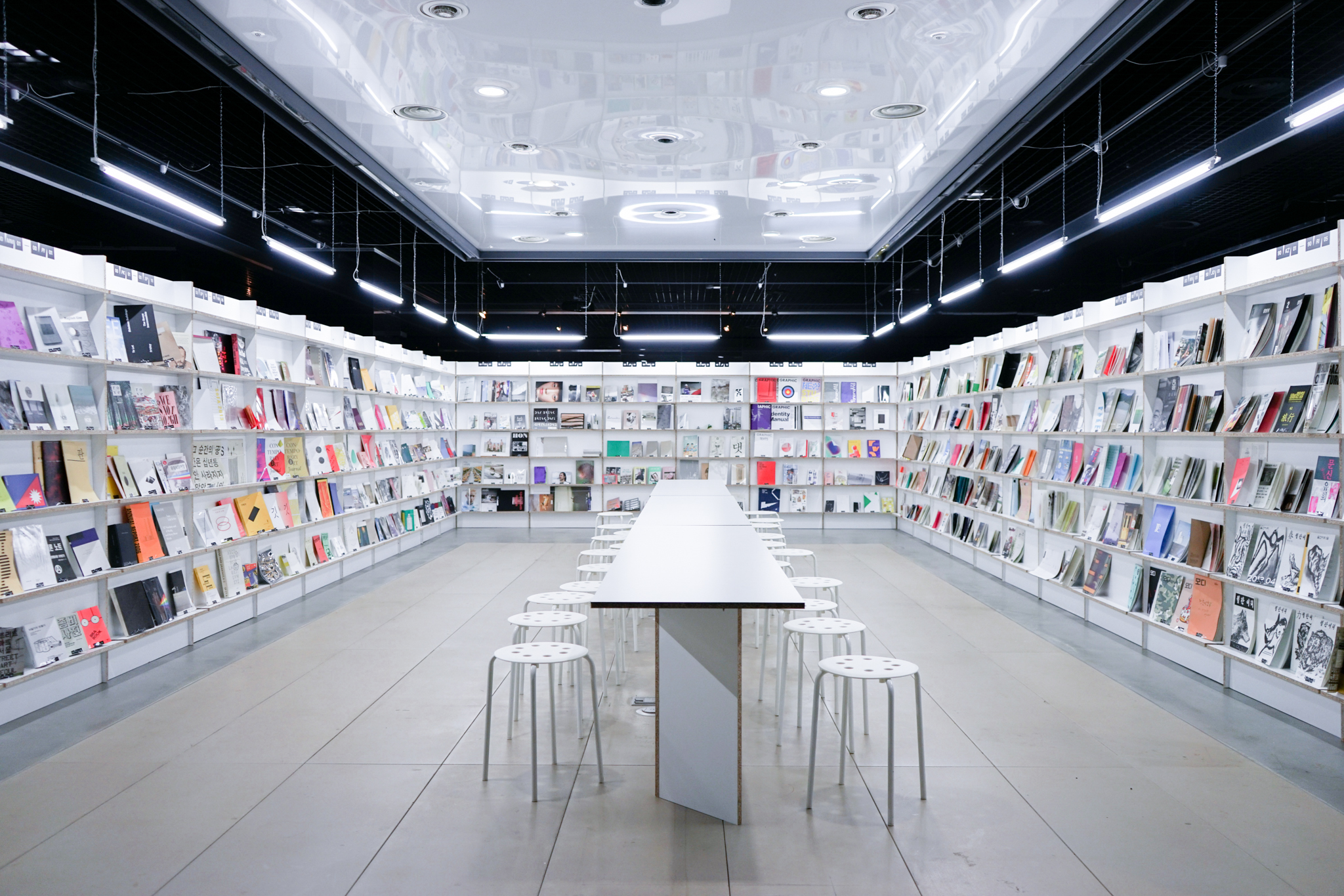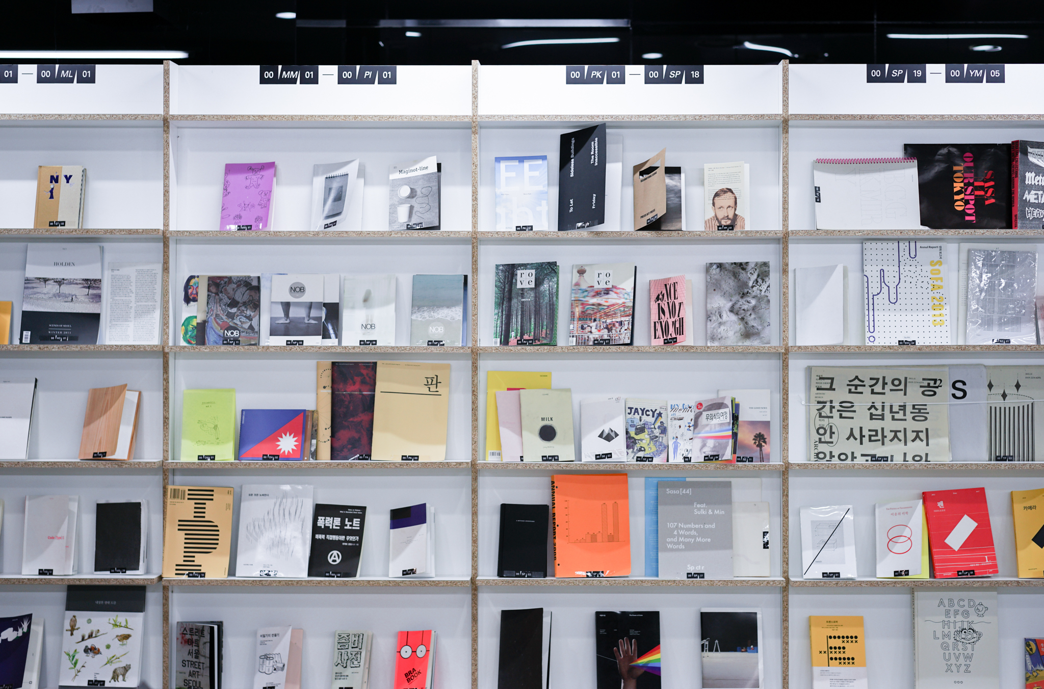 공공 도서관에 수집·보존되지 못했던 독립출판물을 모은 아카이브 전이 국립중앙도서관에서 개최된다는 점이 흥미로웠던 전시입니다. 아이덴티티 디자인을 맡은 디자이너 신덕호와 논의하면서 국립중앙도서관 안에 또 다른 열람실을 구축하는 게 상징적으로 보일 것 같다는 확신을 공유했습니다. 잘 보면, 600여 권의 도서를 진열한 책장 외에 사서의 자리와 테이블, 시계, 책장 위에 부착되어 있는 도서 분류 기호 따위가 있는데, 이곳이 열람실이라는 것을 보여주는 기호들입니다.