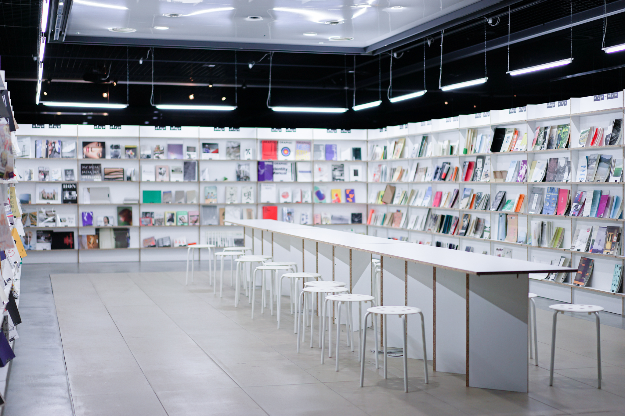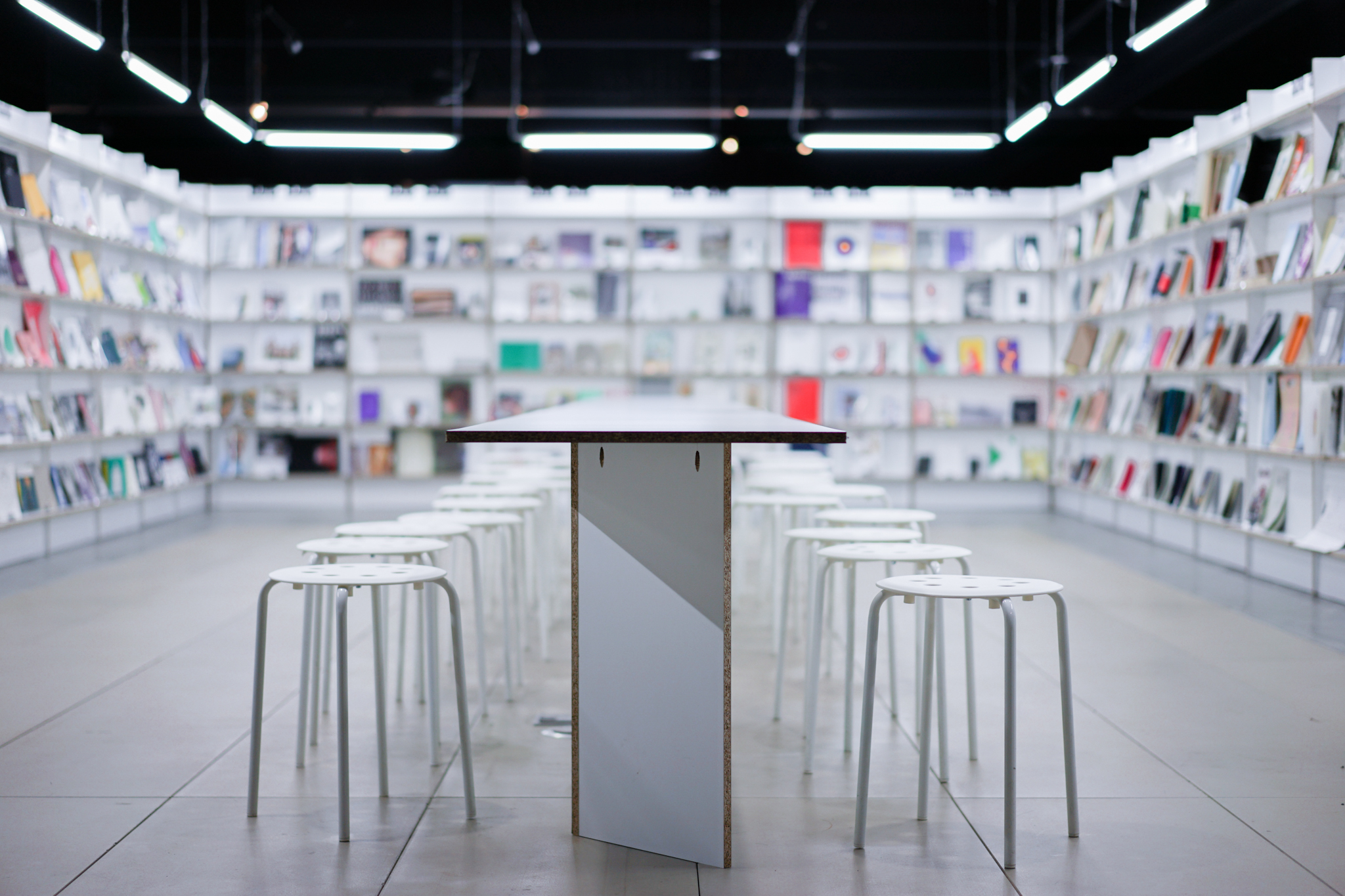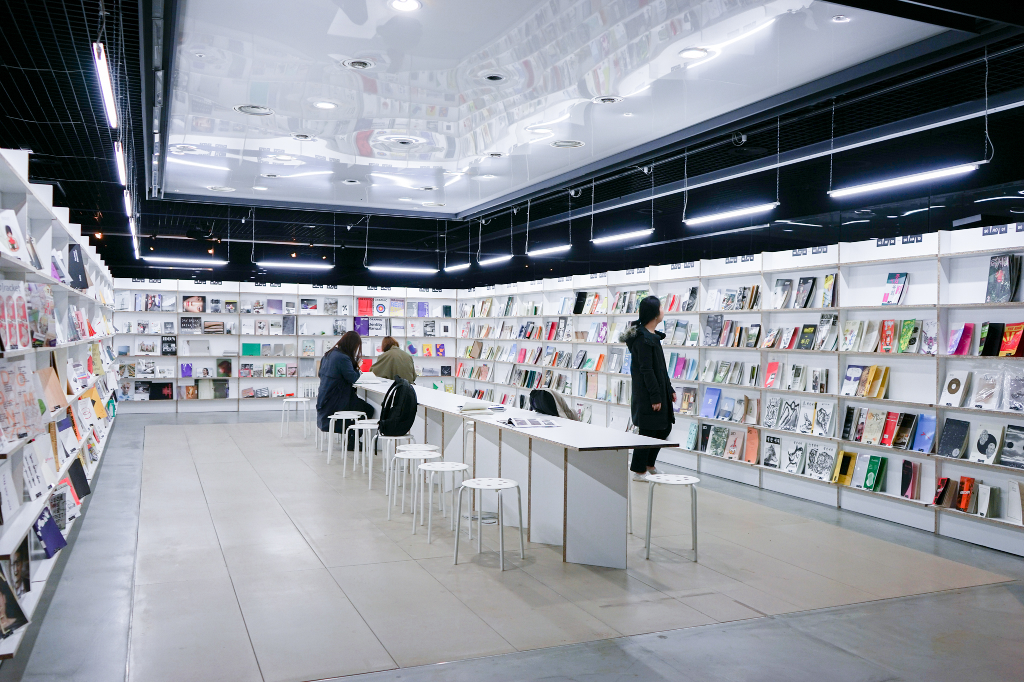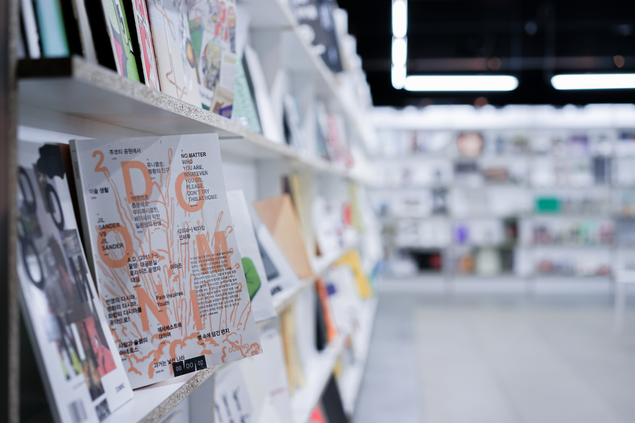 공공 도서관에 수집·보존되지 못했던 독립출판물을 모은 아카이브 전이 국립중앙도서관에서 개최된다는 점이 흥미로웠던 전시입니다. 아이덴티티 디자인을 맡은 디자이너 신덕호와 논의하면서 국립중앙도서관 안에 또 다른 열람실을 구축하는 게 상징적으로 보일 것 같다는 확신을 공유했습니다. 잘 보면, 600여 권의 도서를 진열한 책장 외에 사서의 자리와 테이블, 시계, 책장 위에 부착되어 있는 도서 분류 기호 따위가 있는데, 이곳이 열람실이라는 것을 보여주는 기호들입니다.
