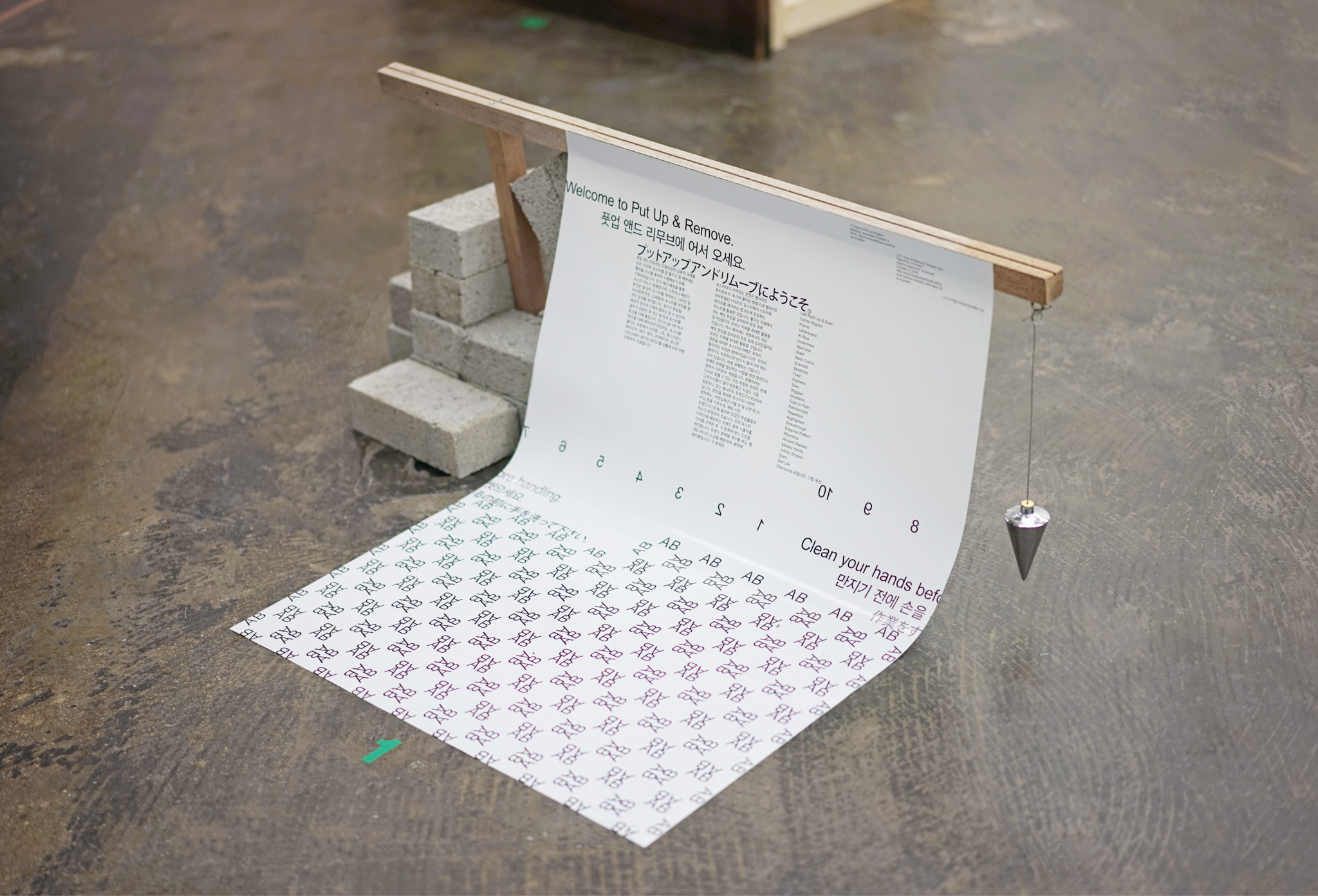 2016년 말 홍대 앞 일원에서 벌어진 포스터 전시 «포스터 이슈 2016»의 프로그램 중 하나인 배민기의 개인전 설치 작업. 전시 내용은 제목 그대로 포스터를 ‘붙이고, 떼는’ 방법을 보여주는 것. 그래픽 디자인 관련 전시의 공간 디자인에선 항상 ‘어떻게 납작한 종이를 3차원 공간에 놓을 것인가’가 문제입니다. 때론 이 고민의 결과가 과설계 디자인으로 귀결되기도 합니다. 우리는 이 전시를 기회 삼아 ‘포스터를 잘 붙이는 법’에 대한 포스터를 제작한 디자이너 배민기에게 역으로 포스터를 잘 붙여주길 요청하며 마치 난센스 퀴즈 같은 구조물 10개를 제멋대로 설계해 전시장에 설치했습니다.