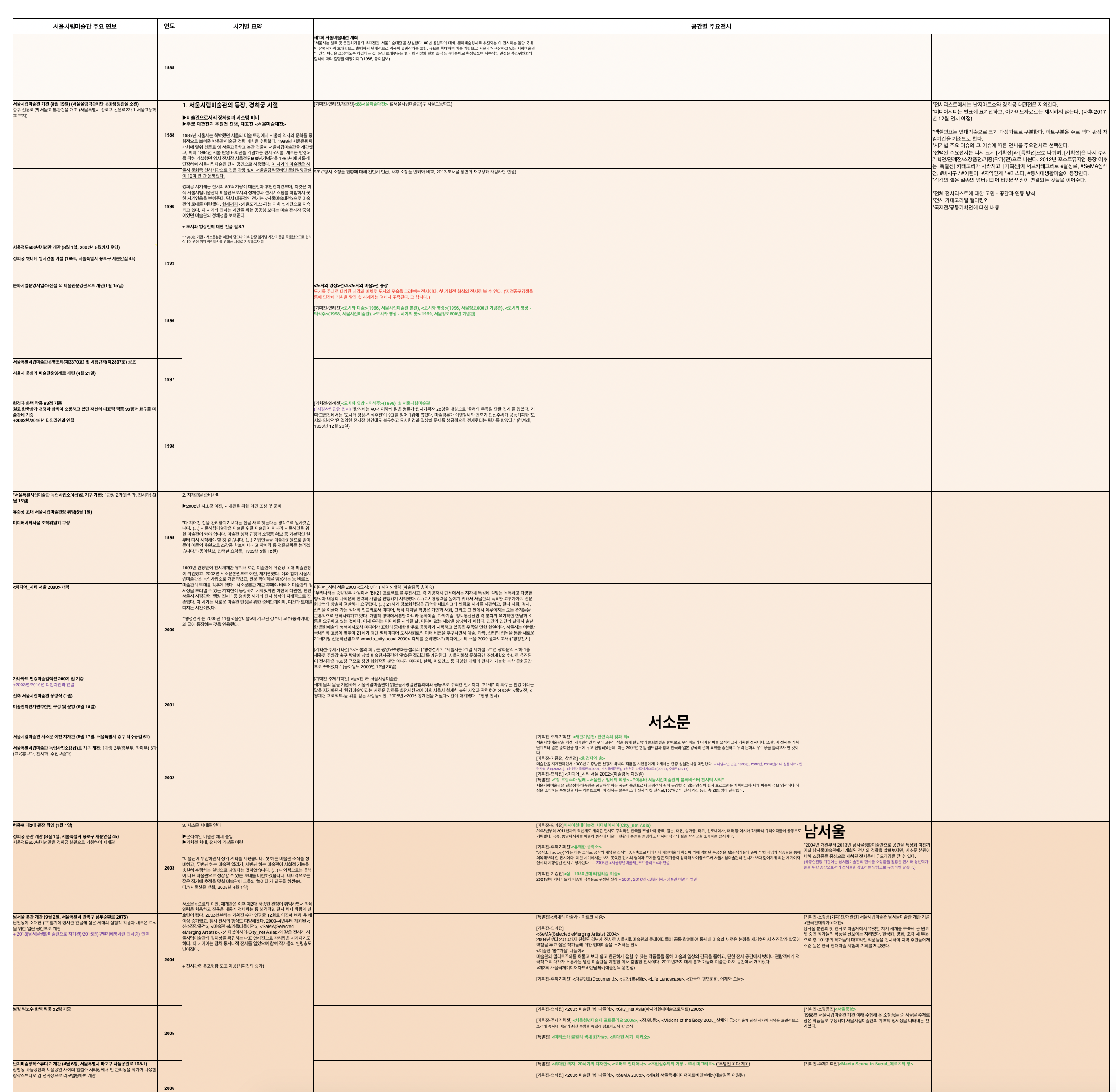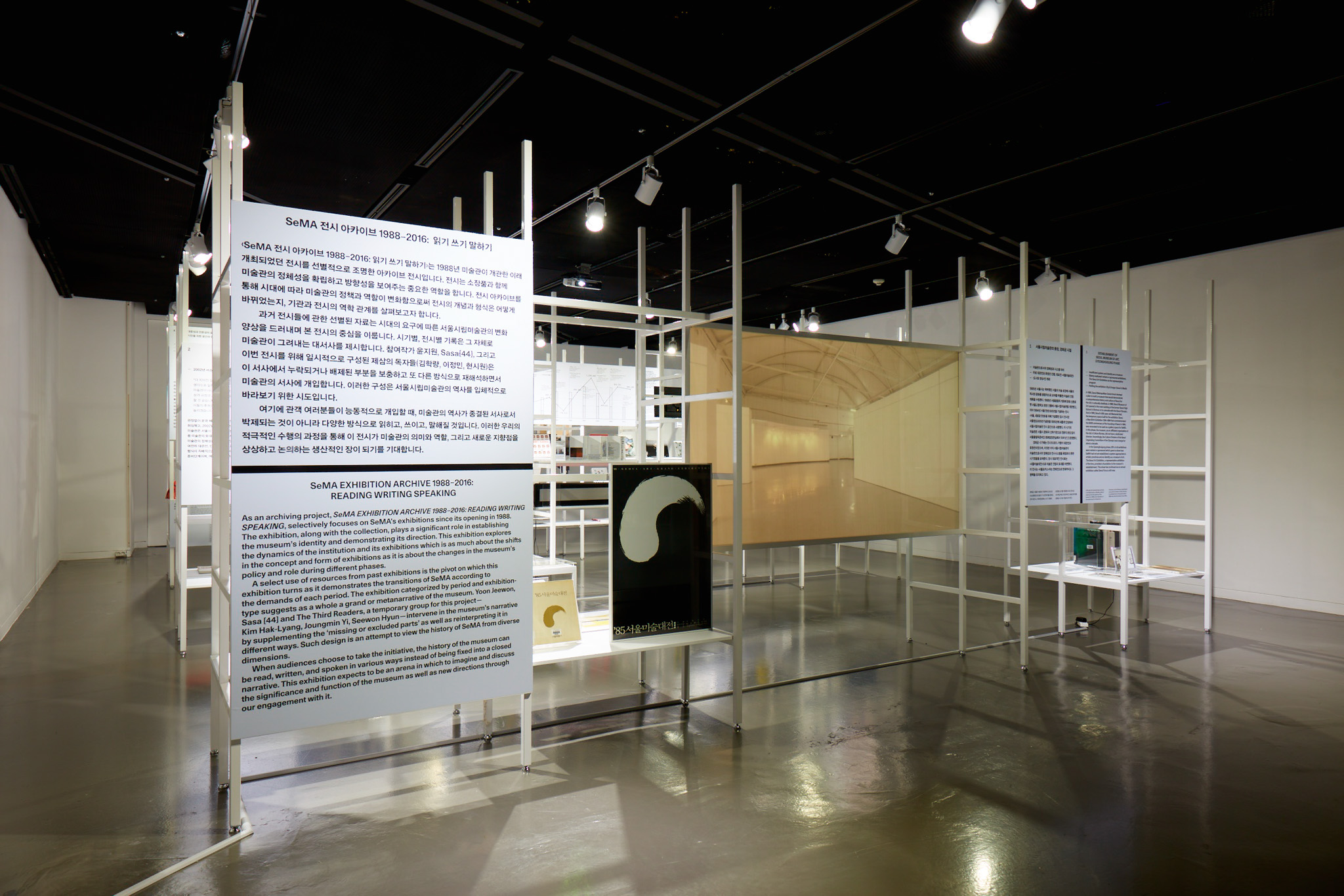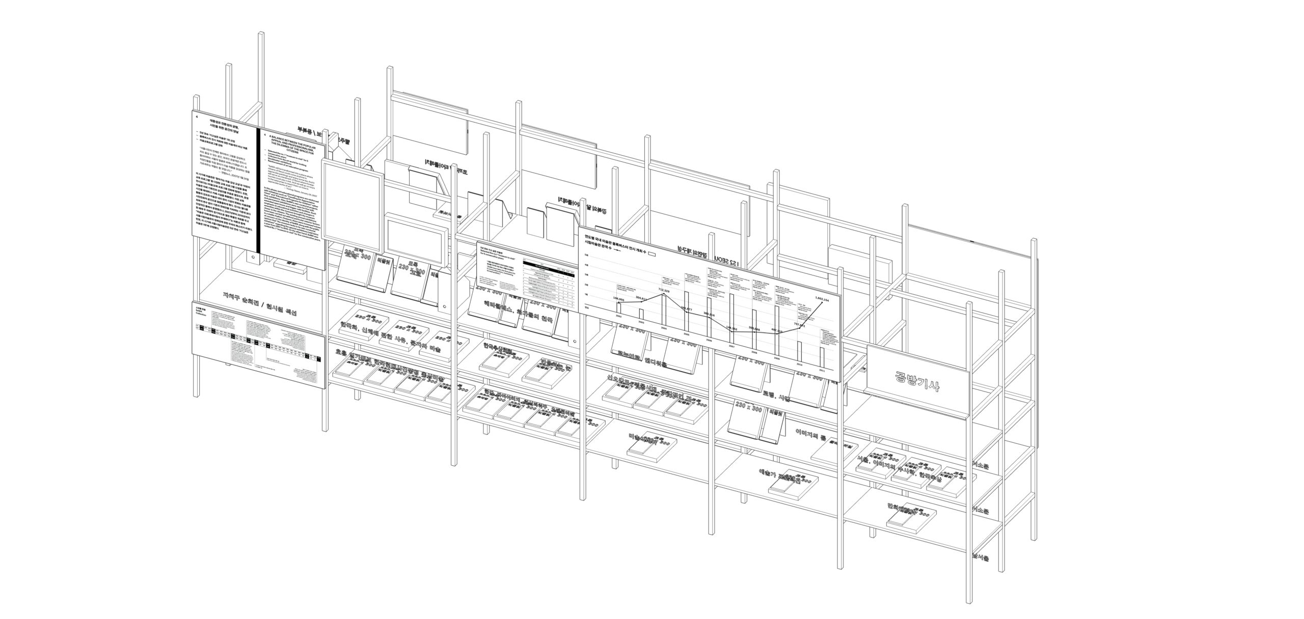 서울시립미술관이 개관 이래 개최했던 전시를 선별적으로 조명한 아카이브 전시. 1988년부터 2016년까지 긴 시간 동안 서소문 본관뿐 아니라 남서울, 북서울 전시장에서 열린 전시까지 방대한 자료를 정리하고 기록하는 것이 급선무였습니다. 큐레이터 박가희는 이 자료들을 엑셀 시트에 빼곡히 정리해 전달해줬습니다. 우리는 이 정보들이 단순히 친절한 관람을 위해 연출된 동선에서 납작하게 축약되어 보이기보다는, 관객 각자의 경험과 기준에 따라 다양하게 독해되길 원했습니다. 엑셀 시트의 선과 칸을 그대로 입면 삼아 장소를 의미하는 가로축과 시간을 의미하는 세로축을 가진 선반을 제작한 이유입니다.