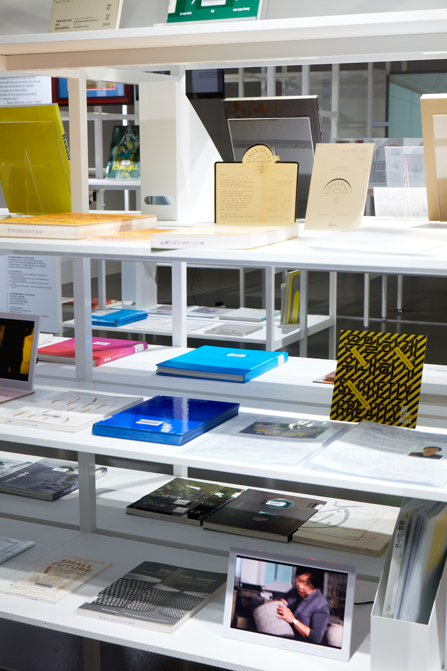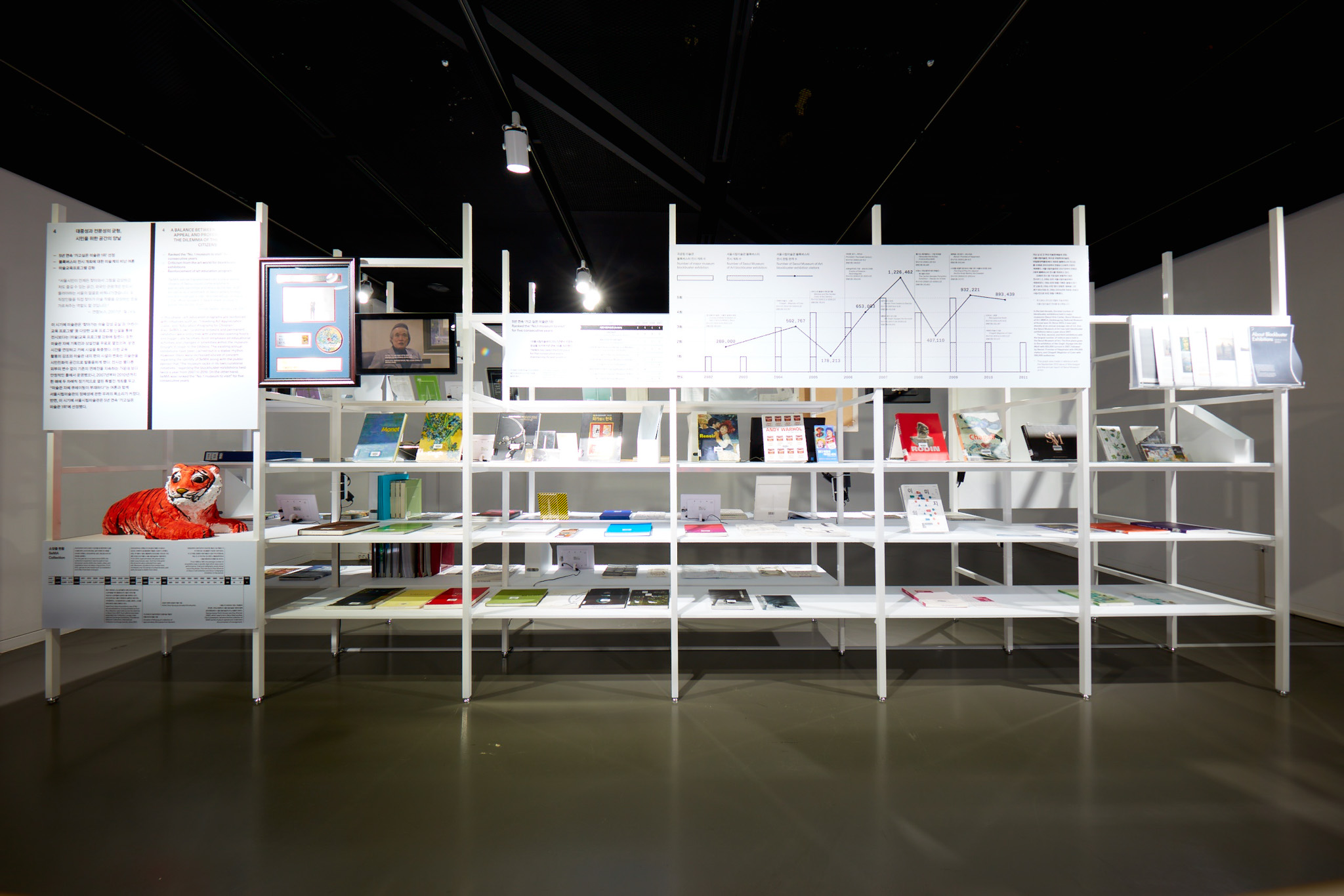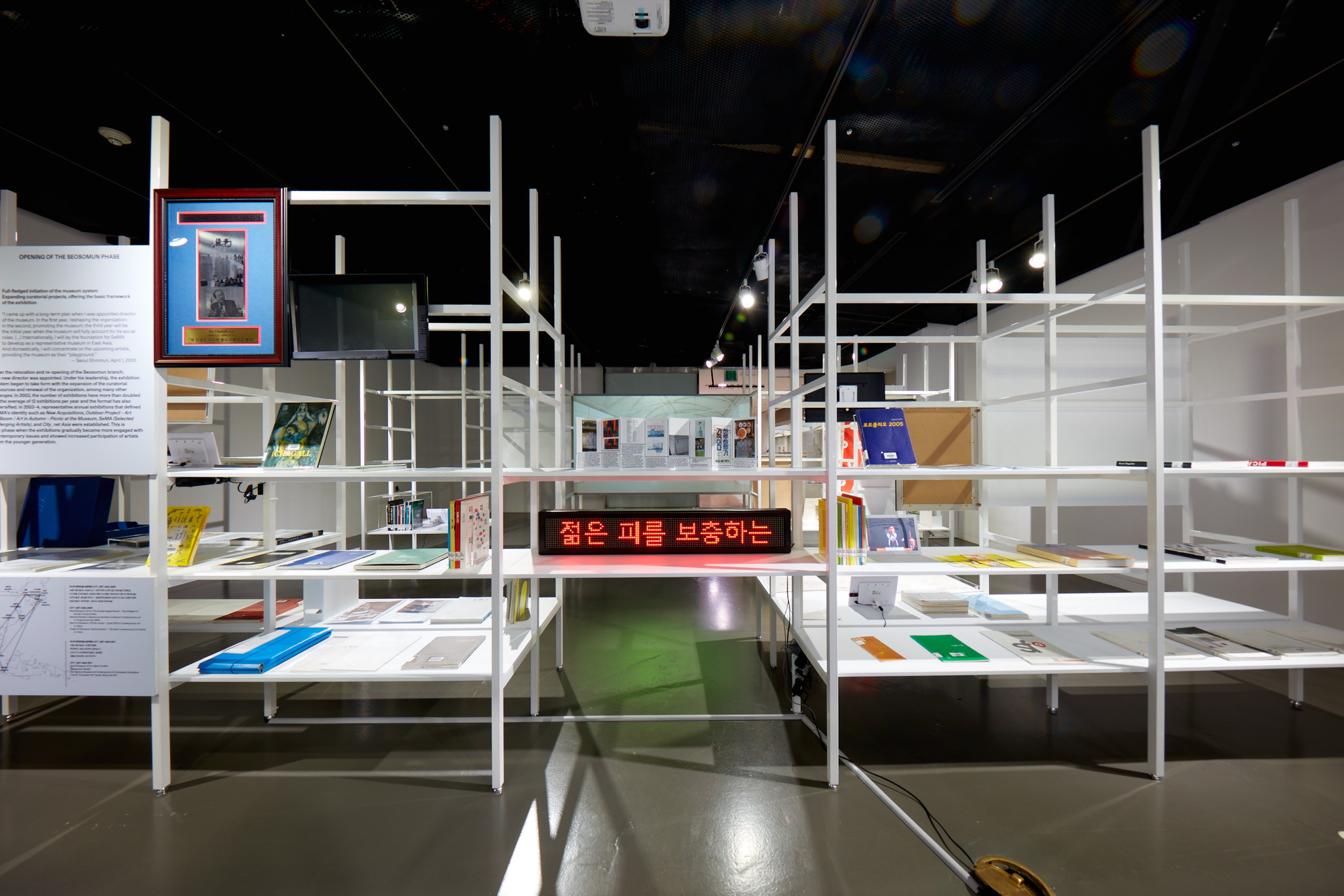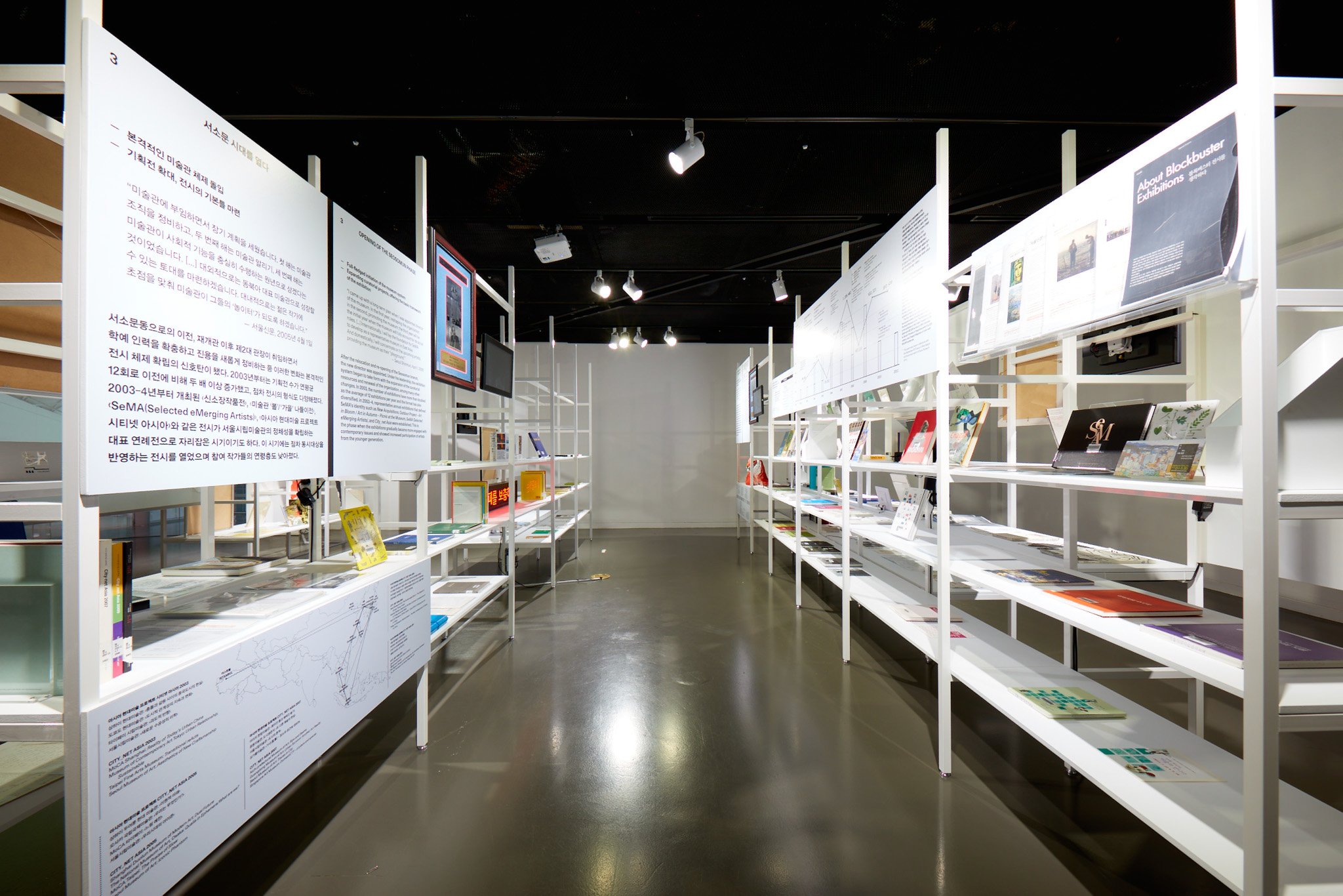 서울시립미술관이 개관 이래 개최했던 전시를 선별적으로 조명한 아카이브 전시. 1988년부터 2016년까지 긴 시간 동안 서소문 본관뿐 아니라 남서울, 북서울 전시장에서 열린 전시까지 방대한 자료를 정리하고 기록하는 것이 급선무였습니다. 큐레이터 박가희는 이 자료들을 엑셀 시트에 빼곡히 정리해 전달해줬습니다. 우리는 이 정보들이 단순히 친절한 관람을 위해 연출된 동선에서 납작하게 축약되어 보이기보다는, 관객 각자의 경험과 기준에 따라 다양하게 독해되길 원했습니다. 엑셀 시트의 선과 칸을 그대로 입면 삼아 장소를 의미하는 가로축과 시간을 의미하는 세로축을 가진 선반을 제작한 이유입니다.