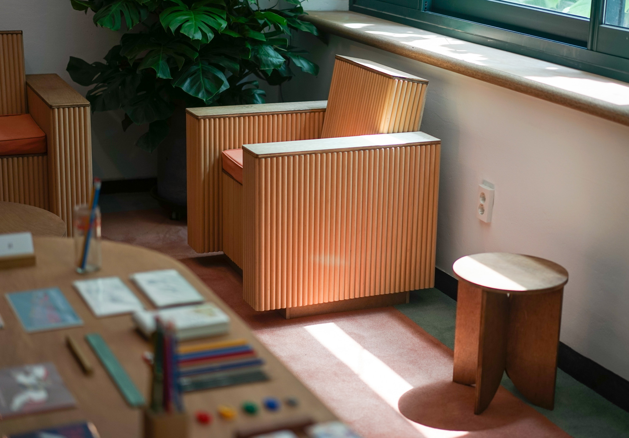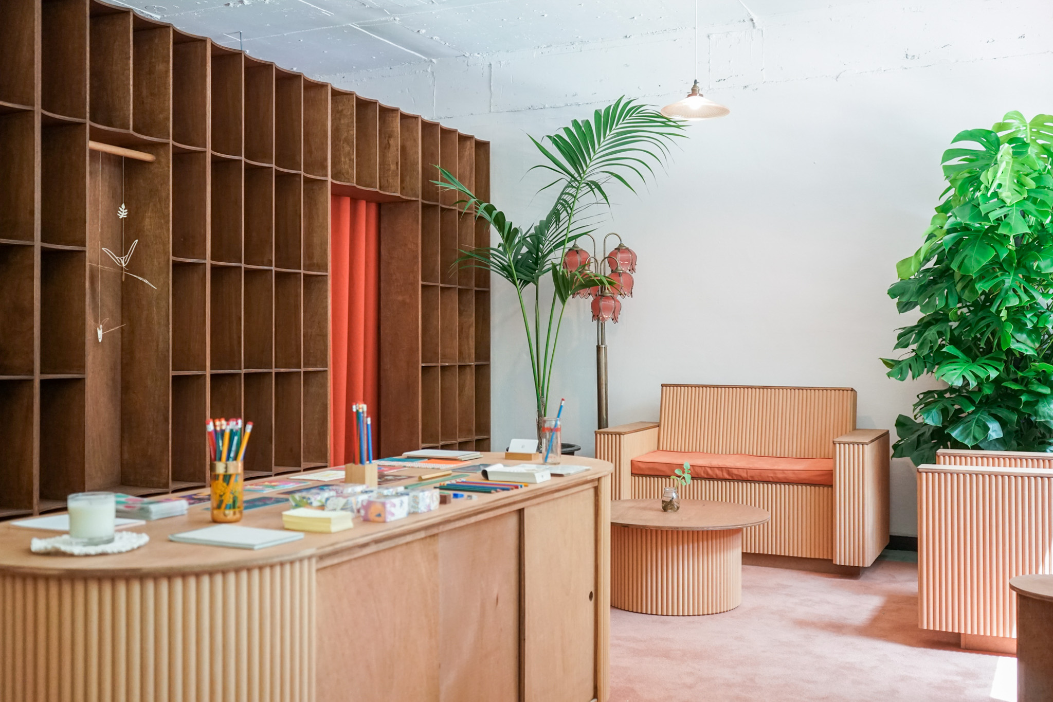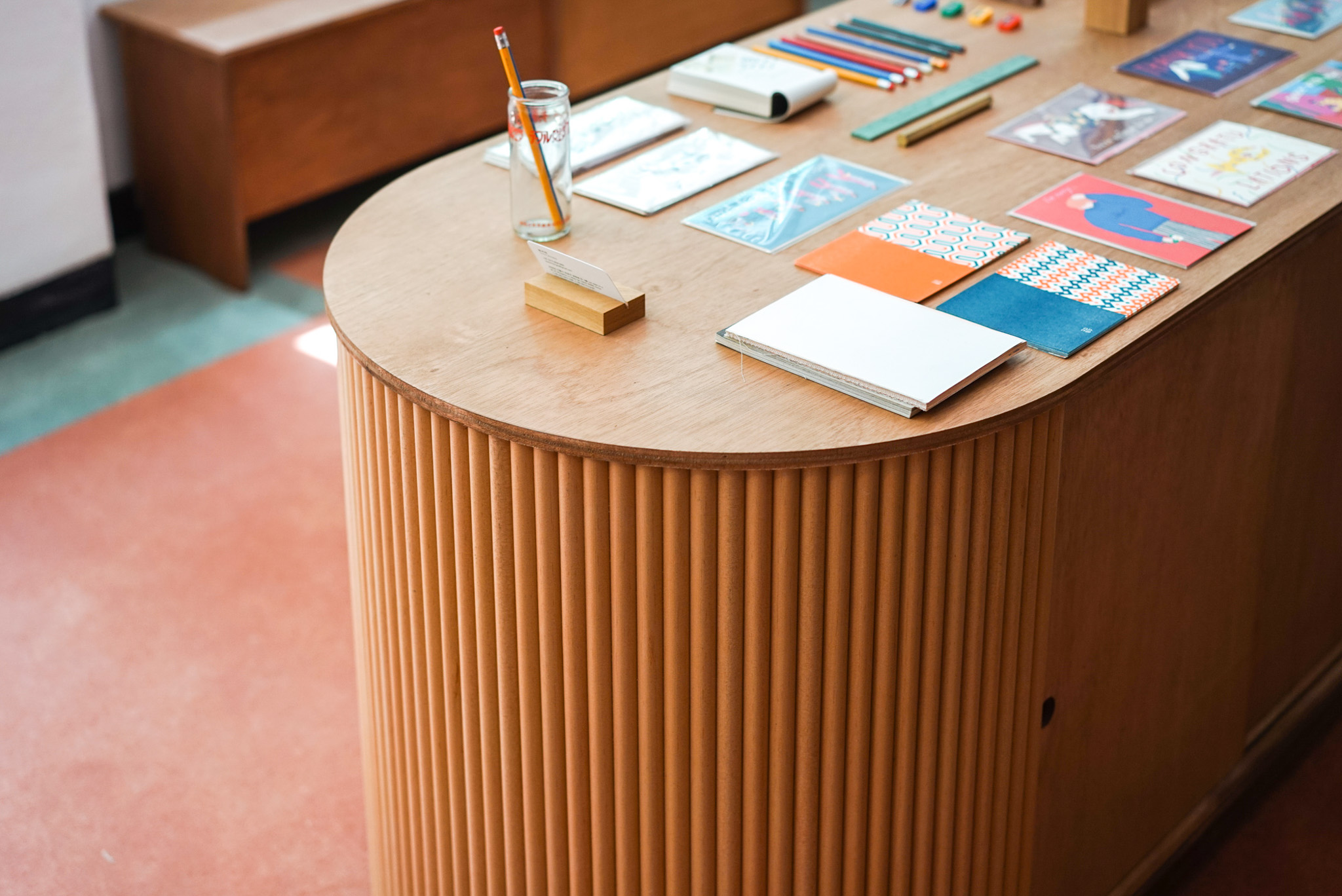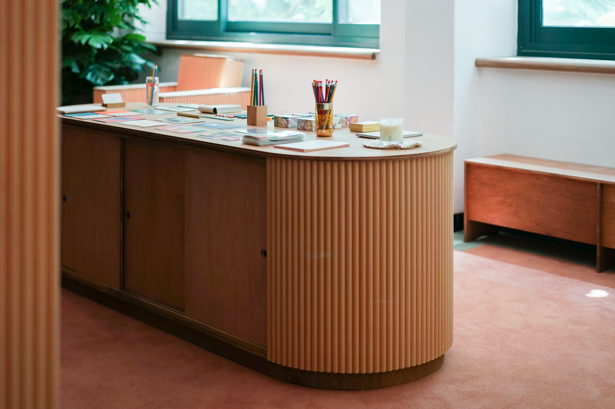 문구류를 디자인하고 판매하는 ‘소소문구’를 위한 쇼룸으로, 따뜻하고 감성적인 제품들의 특성이 잘 드러나게 공간을 구성했습니다. 특히 소소문구 노트가 가진 색감과 물성이 공간과 잘 이어지도록 목재를 활용한 가구를 만들고, 바닥에는 카펫을 깔아 질감을 강조했습니다.