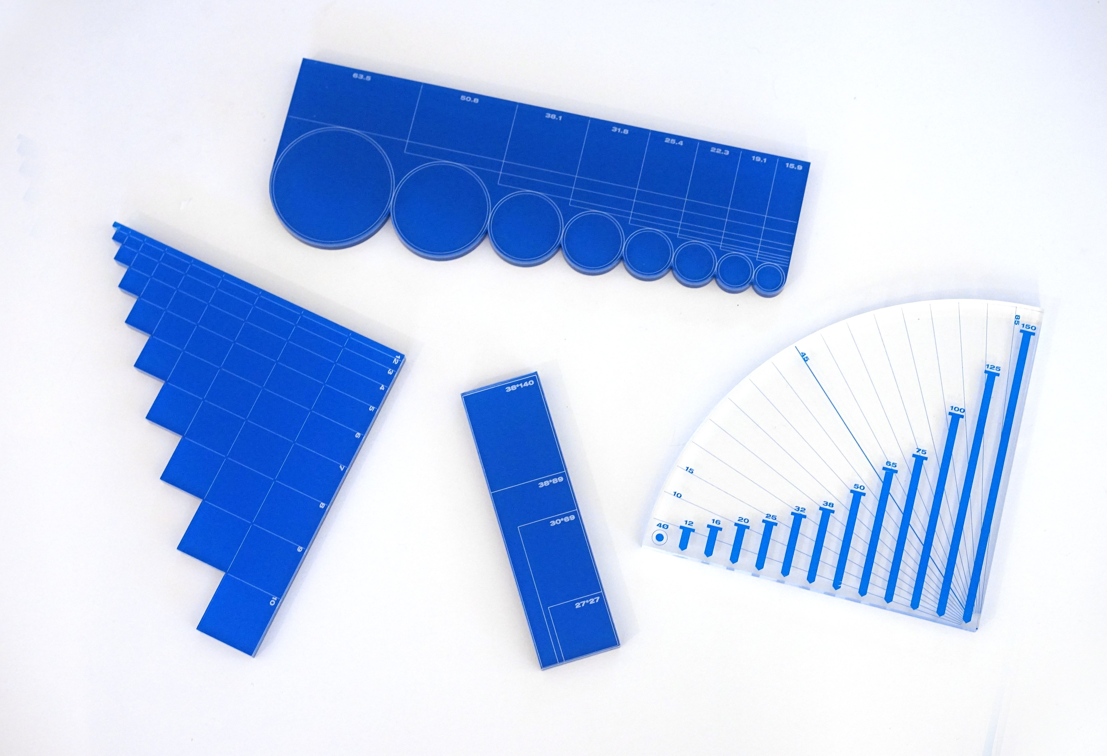 합판, 나무 각재, 나사, 금속 파이프의 규격을 1:1 크기로 가늠해볼 수 있는 템플릿. 당시 디자이너와 목수 활동을 병행하던 때라 우리 가방엔 에어타카, 원형 톱, 드릴, 나사 등 각종 공구가 들어 있었습니다. 늘상 접했던 소재들 또한 산업용 건축 자재들이었는데 이런 거친 재료들을 자르고 붙여 가구(와 집기 사이의 무언가)를 만들곤 했습니다. 어설픈 목공 기술로 재단, 조립, 마감 등 일련의 과정을 모두 직접 해야 했기에 자재들 간의 비례를 맞추는 게 무엇보다 중요했는데, 공방 설비가 없는 작은 사무실에서 톱밥 날리는 다양한 실험을 하긴 어려웠습니다(=컴퓨터 고장남). 먼지 없이 이를 가늠 하기 위해 종이에 1:1 크기로 자재 규격을 그려 넣은 가이드를 만들었고, 이것을 이곳저곳 대보며 적절한 사이즈를 찾곤 했습니다. 여기서 좀 더 나아가 아크릴과 실크스크린을 사용해 만든 것이 ‘언리미티드에디션7’에 선보였던 템플릿 룰러입니다. 첫 버전은 다양한 색상으로 만들어 모두 완판했는데, 두 번째 버전은 세련돼 보이고 싶은 마음에 당시 유행하던 이브클라인블루로 만들었다가 재고를 떠안게 되었습니다. 아직까지 사무실에서 활용하고 있습니다.