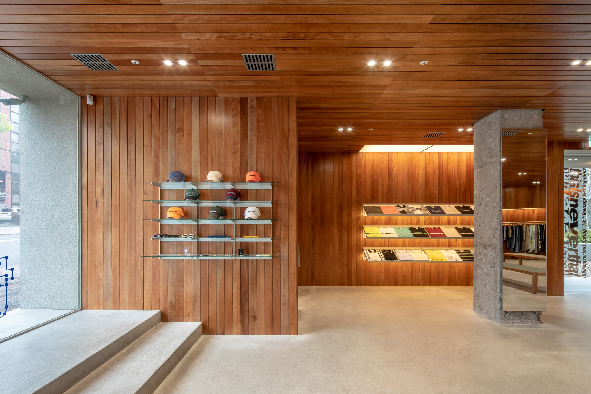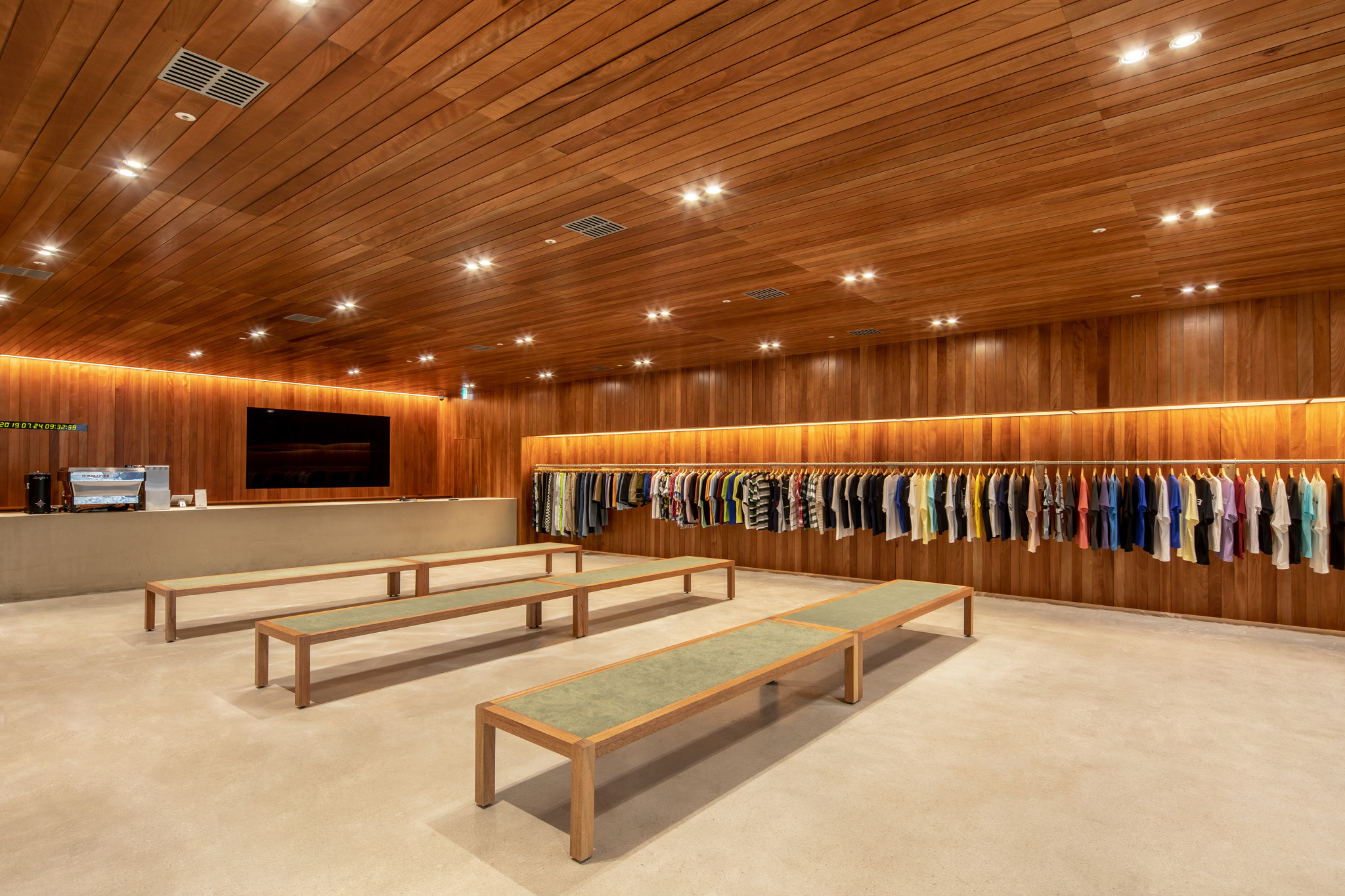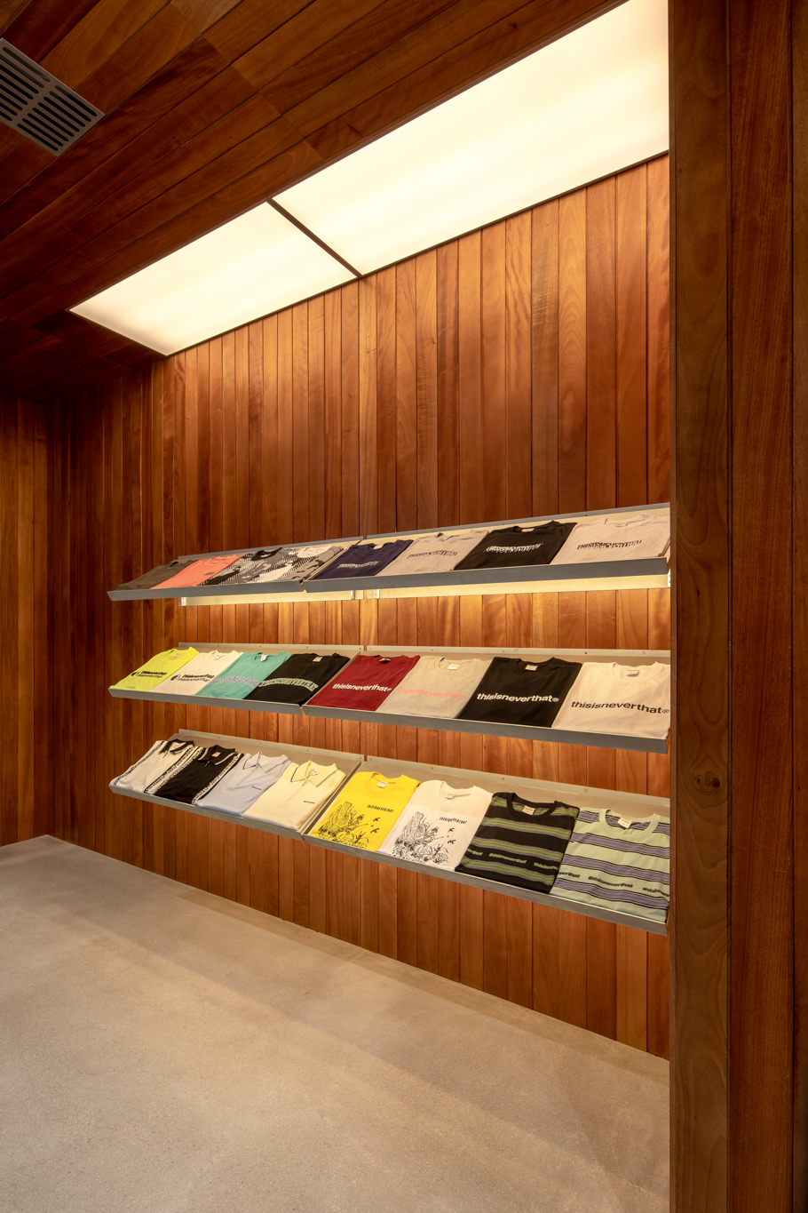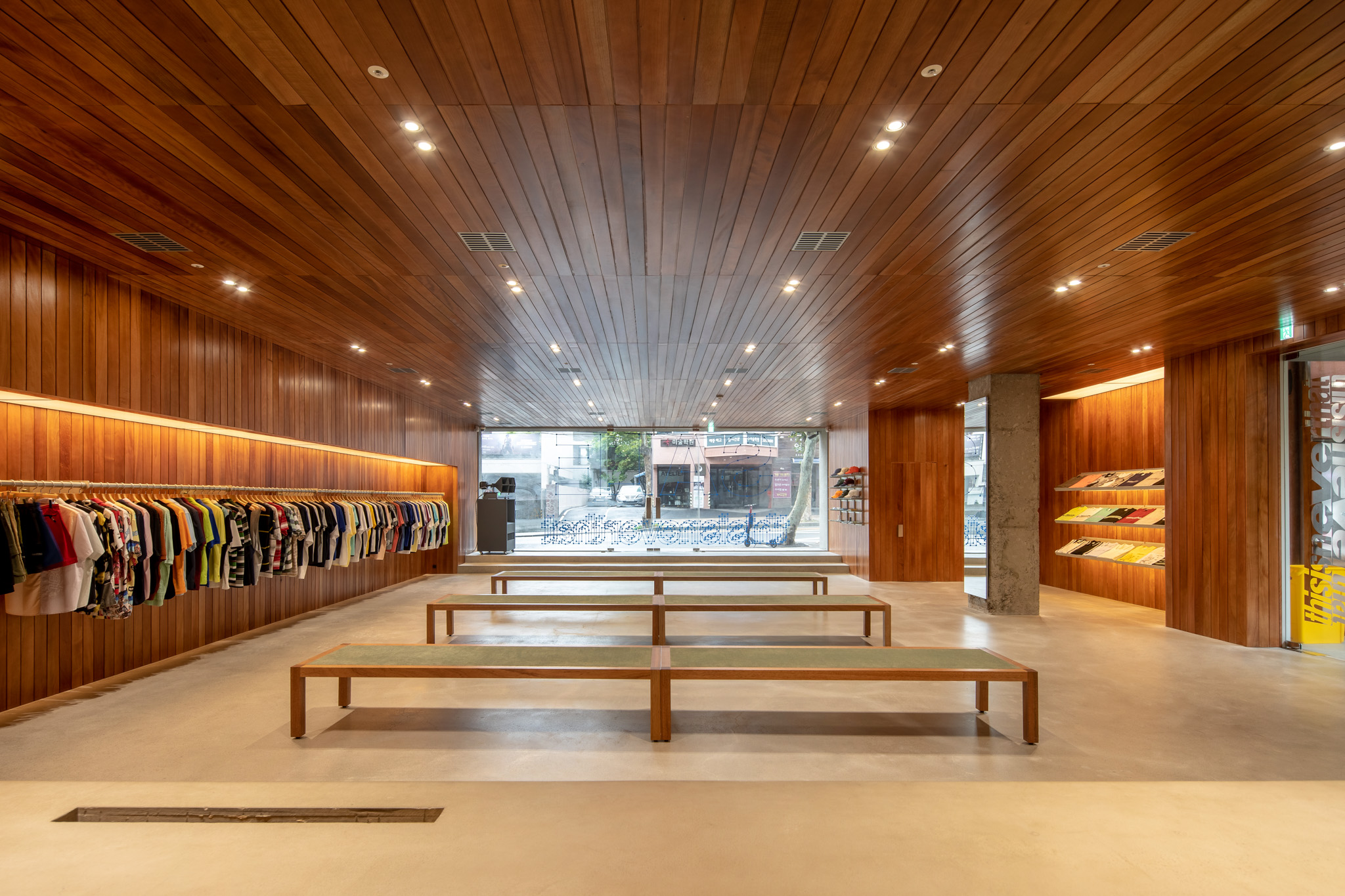 홍대에 위치한 디스이즈네버댓 플래그십 스토어. 번화가에 위치한 의류 매장 특유의 밀도 높은 제품 디스플레이에서 벗어나, 방문객과 매장 직원 모두 여유롭게 사용 가능한 공간 구성에 집중했습니다. 디자인 중요도에서 종종 후순위로 밀리곤 했던 창고를 외부에서도 볼 수 있게 넓고 쾌적하게 만들어 공간 연출의 한 요소로 삼고, 매장 가운데 벤치를 배치해 제품을 올려놓거나 방문객들이 자유롭게 쉴 수 있도록 했습니다. 자신들이 만드는 옷이 매우 쉬운 옷이라고 몇 차례 강조했던 클라이언트의 말을 떠올리며, 마찬가지로 공간도 흔히 접하는 소재인 나무와 콘크리트로 마감했습니다.