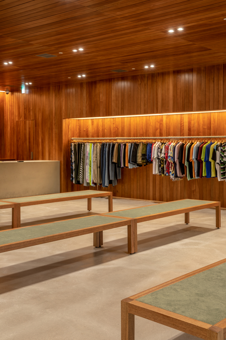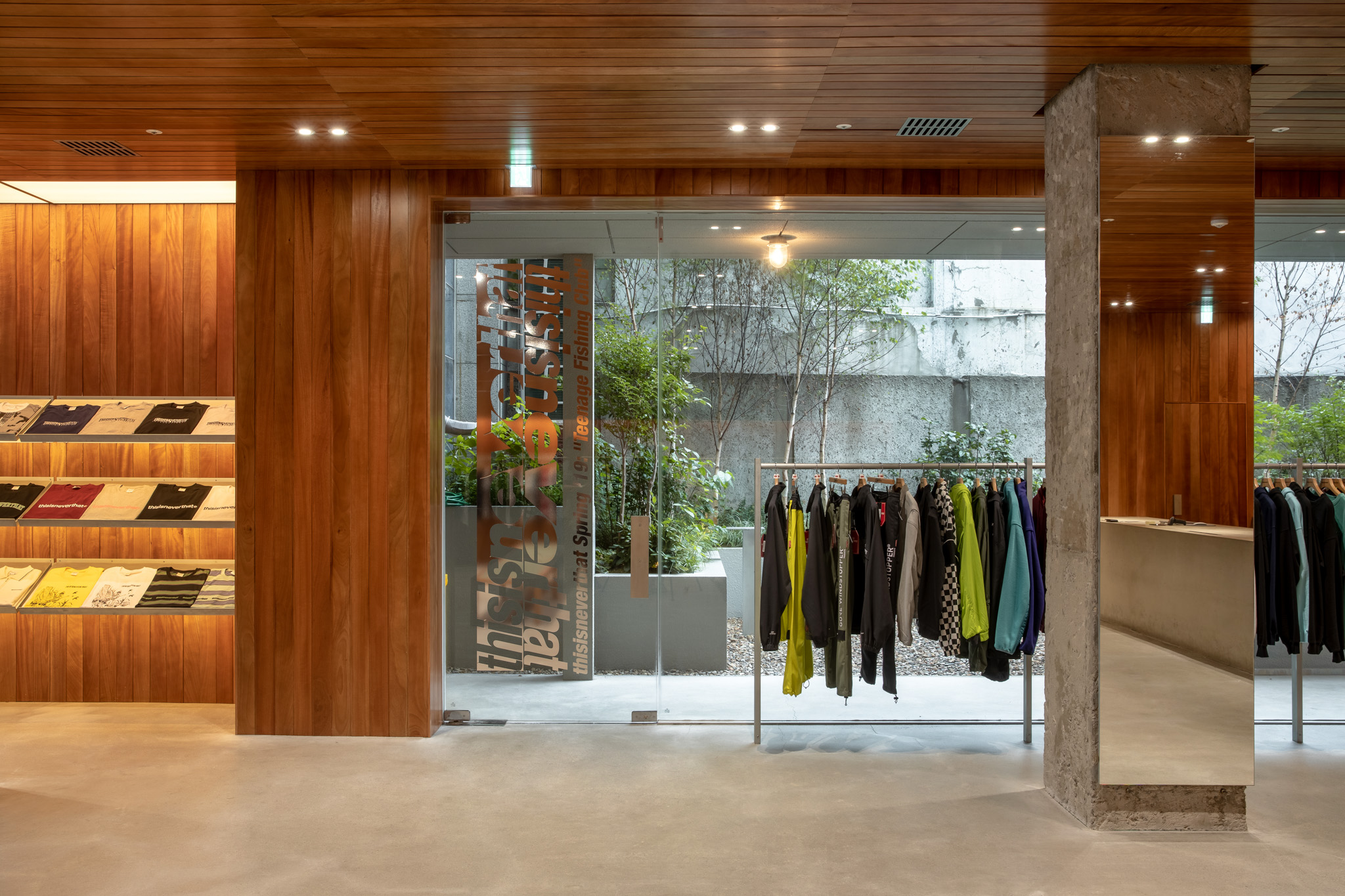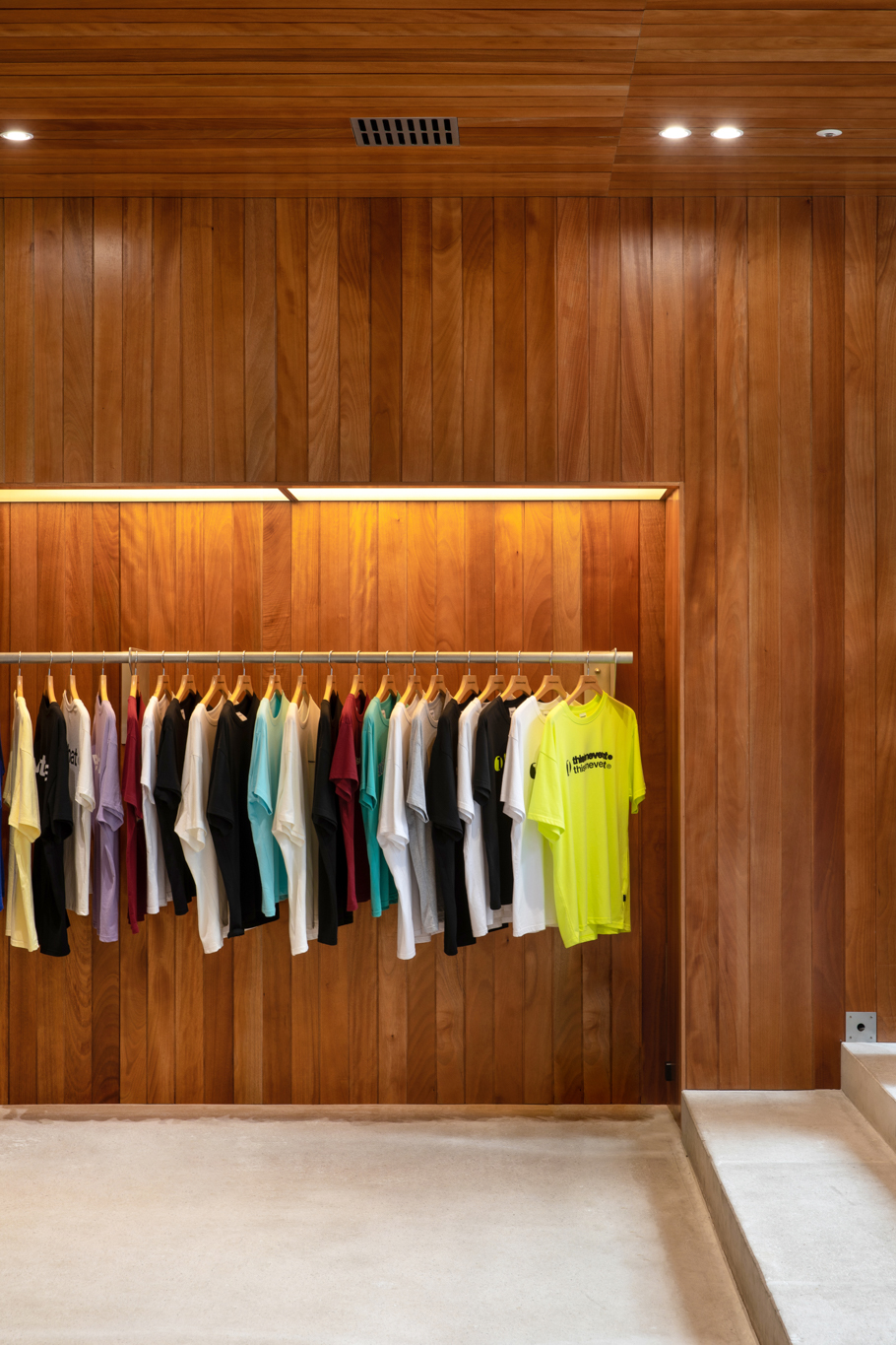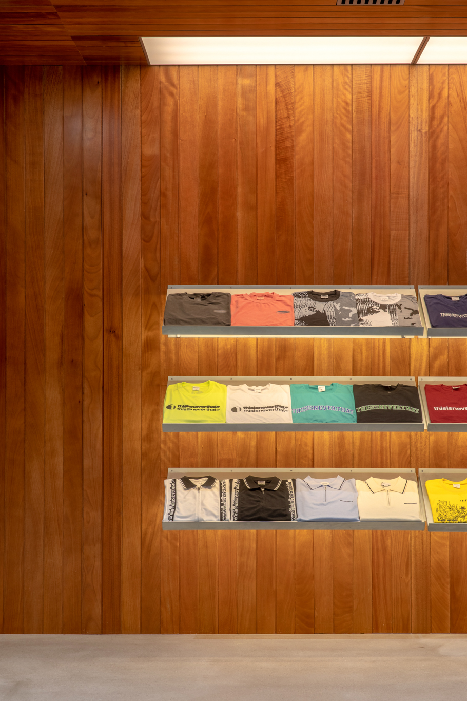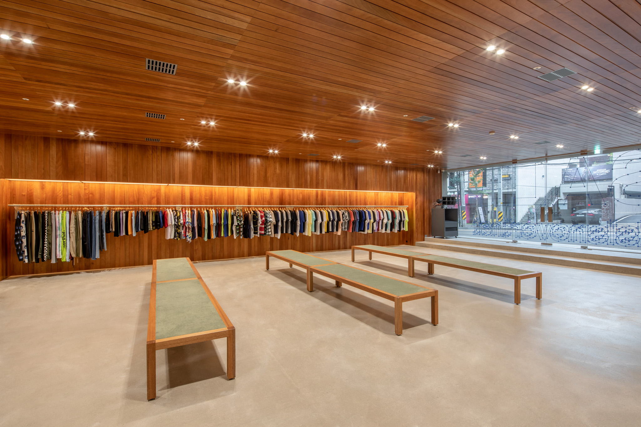 홍대에 위치한 디스이즈네버댓 플래그십 스토어. 번화가에 위치한 의류 매장 특유의 밀도 높은 제품 디스플레이에서 벗어나, 방문객과 매장 직원 모두 여유롭게 사용 가능한 공간 구성에 집중했습니다. 디자인 중요도에서 종종 후순위로 밀리곤 했던 창고를 외부에서도 볼 수 있게 넓고 쾌적하게 만들어 공간 연출의 한 요소로 삼고, 매장 가운데 벤치를 배치해 제품을 올려놓거나 방문객들이 자유롭게 쉴 수 있도록 했습니다. 자신들이 만드는 옷이 매우 쉬운 옷이라고 몇 차례 강조했던 클라이언트의 말을 떠올리며, 마찬가지로 공간도 흔히 접하는 소재인 나무와 콘크리트로 마감했습니다.